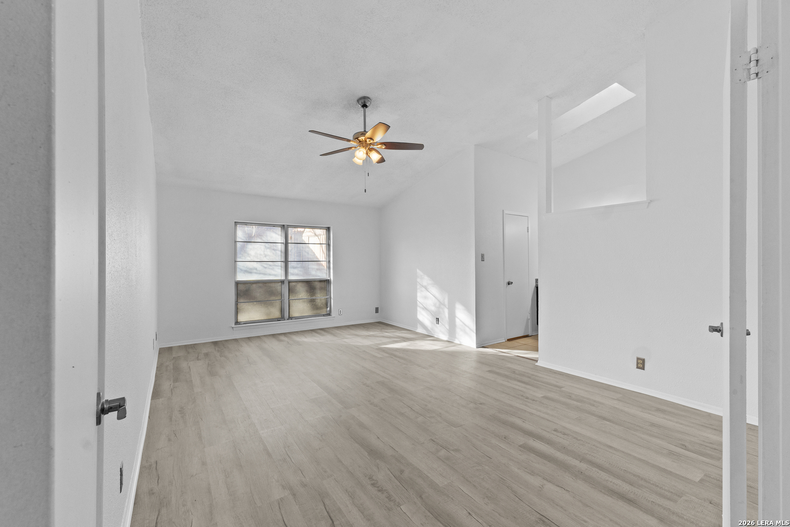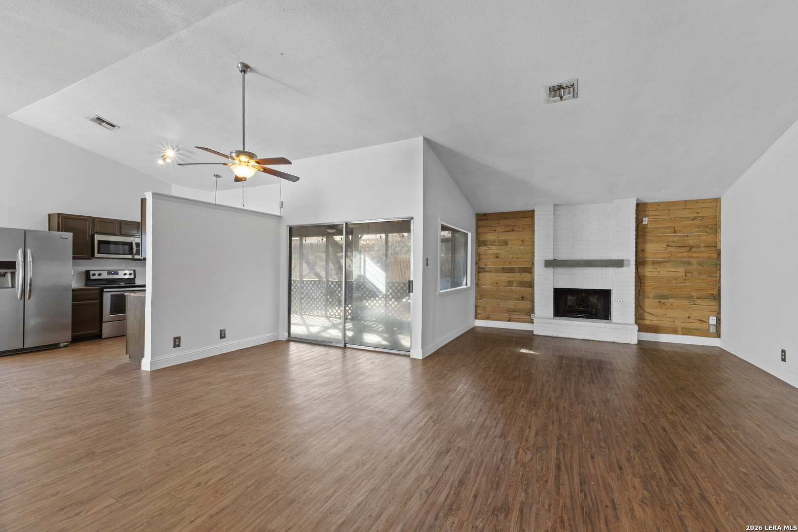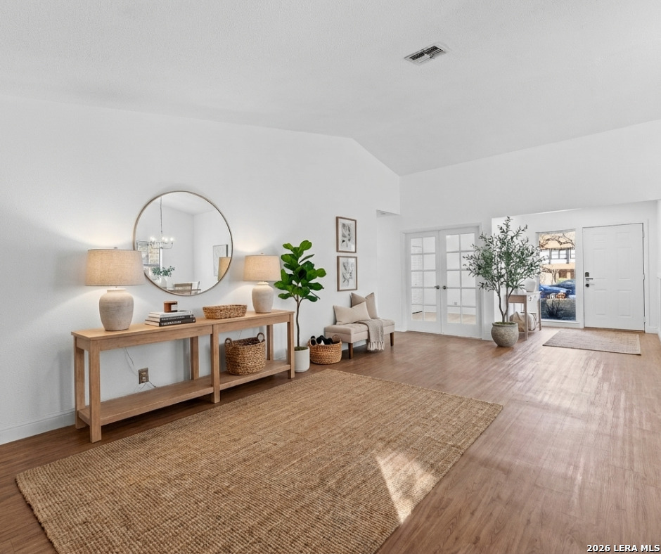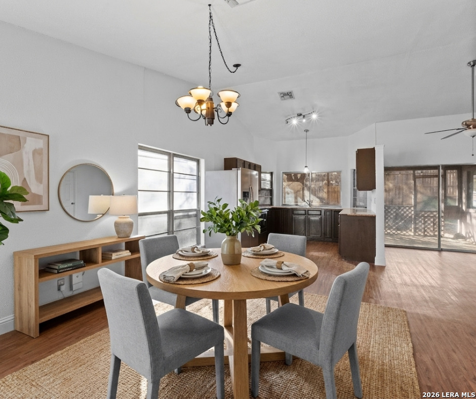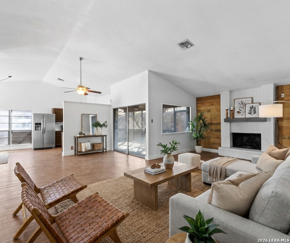 Discover this inviting single-story home featuring 4 bedrooms, 2 bathrooms, and a 2-car garage. The entry opens to a spacious living room with vaulted ceilings, a striking floor-to-ceiling brick wood-burning fireplace, and beautiful laminate wood flooring. Two oversized 8-foot sliding glass doors fill the space with natural light, creating a bright and welcoming area perfect for everyday living and entertaining. The kitchen offers a wall of windows overlooking the backyard, upgraded countertops, and stainless-steel appliances. Fresh interior paint, updated vinyl flooring in the bedrooms, and crisp white baseboards give the home a clean, refreshed feel throughout. One of the bedrooms features elegant French doors, making it a perfect flex space for a home office, guest room, or study. The spacious primary suite includes dual vanities and a skylight that brings in natural light, creating a comfortable retreat.