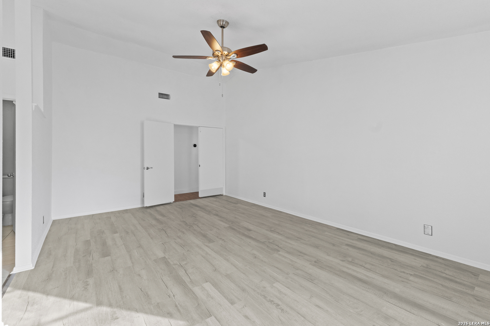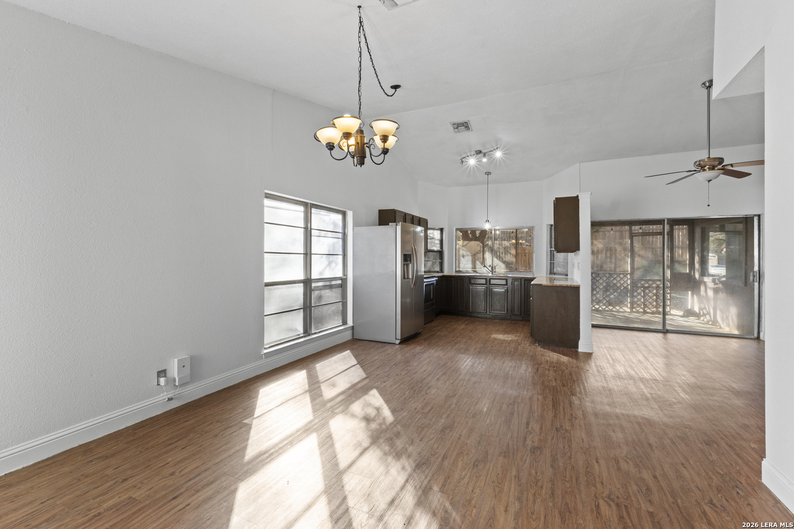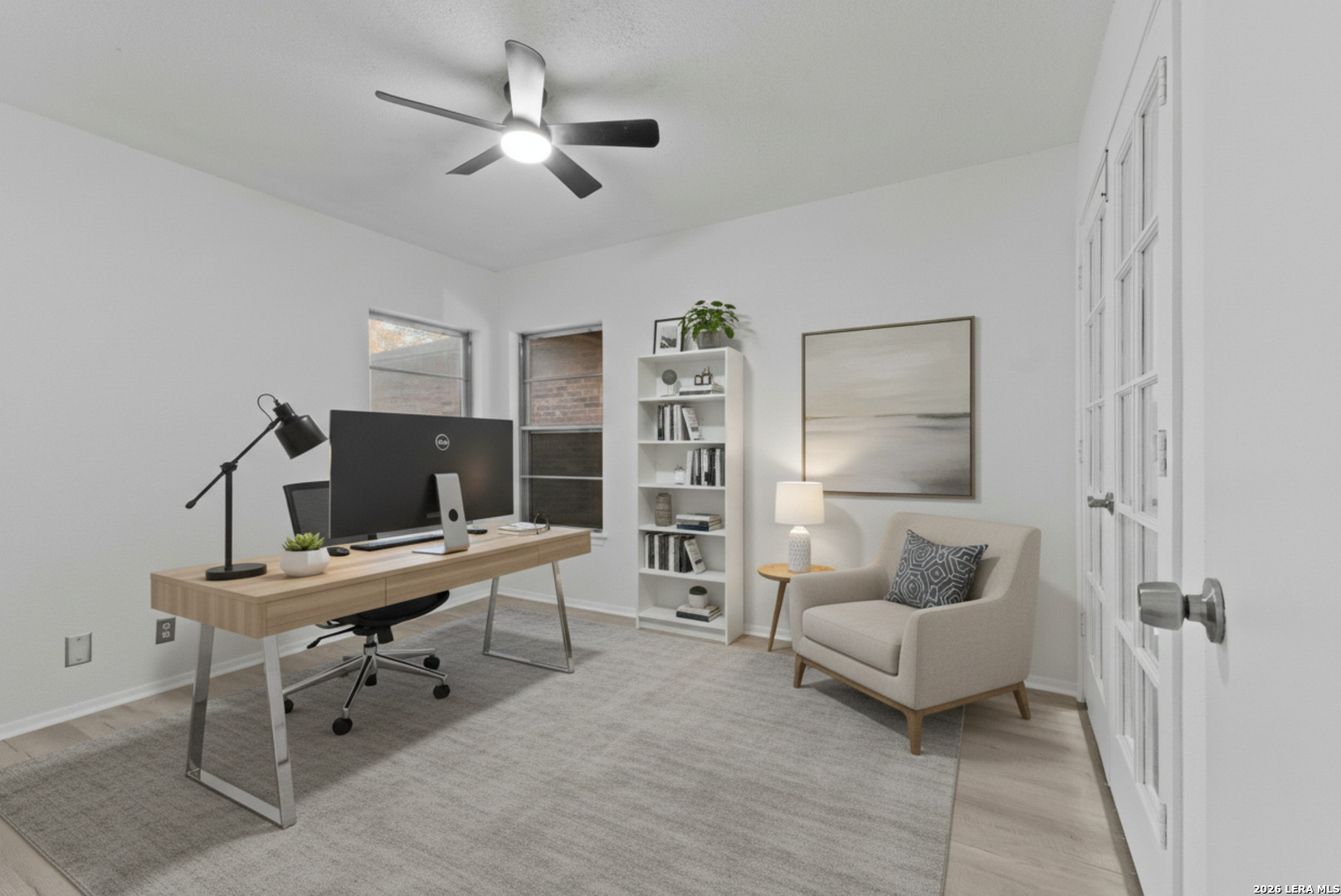 Discover this inviting single-story home featuring 4 bedrooms, 2 bathrooms, and a 2-car garage. The entry opens to a spacious living room with vaulted ceilings, a striking floor-to-ceiling brick wood-burning fireplace, and beautiful laminate wood flooring. Two oversized 8-foot sliding glass doors fill the space with natural light, creating a bright and welcoming area perfect for everyday living and entertaining. The kitchen offers a wall of windows overlooking the backyard, upgraded countertops, and stainless-steel appliances. Fresh interior paint, updated vinyl flooring in the bedrooms, and crisp white baseboards give the home a clean, refreshed feel throughout. One of the bedrooms features elegant French doors, making it a perfect flex space for a home office, guest room, or study. The spacious primary suite includes dual vanities and a skylight that brings in natural light, creating a comfortable retreat.