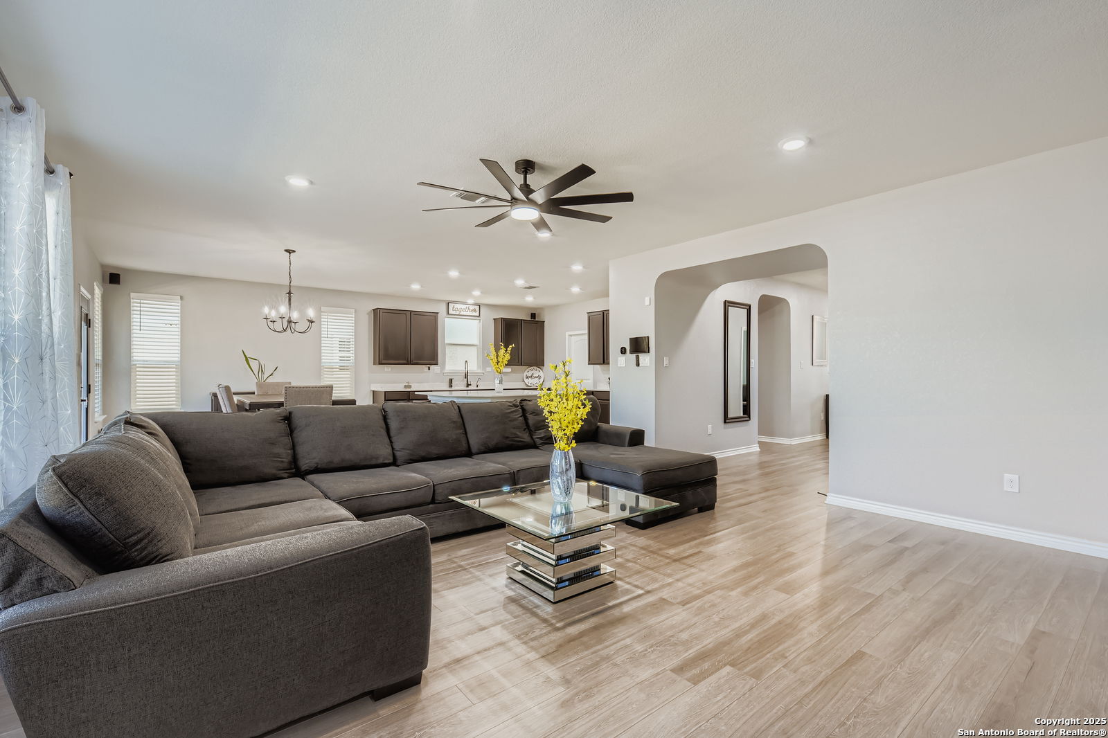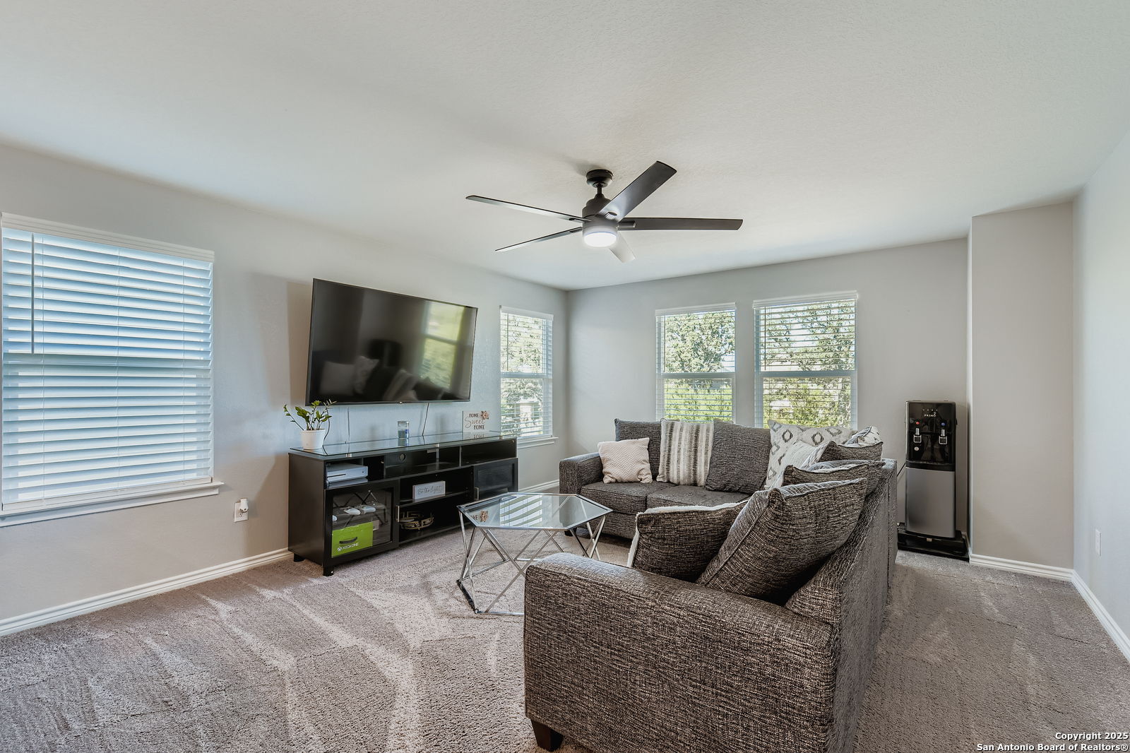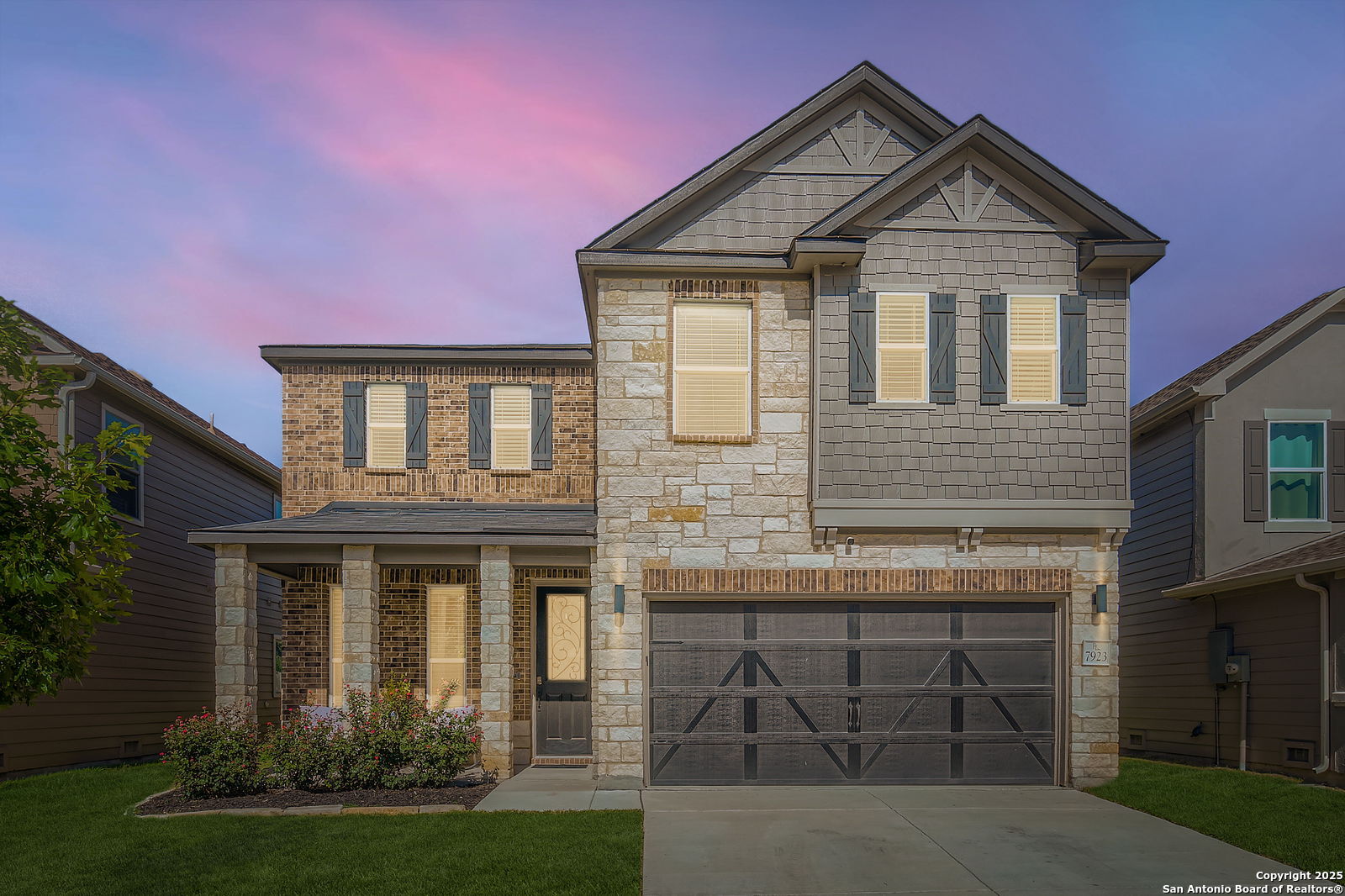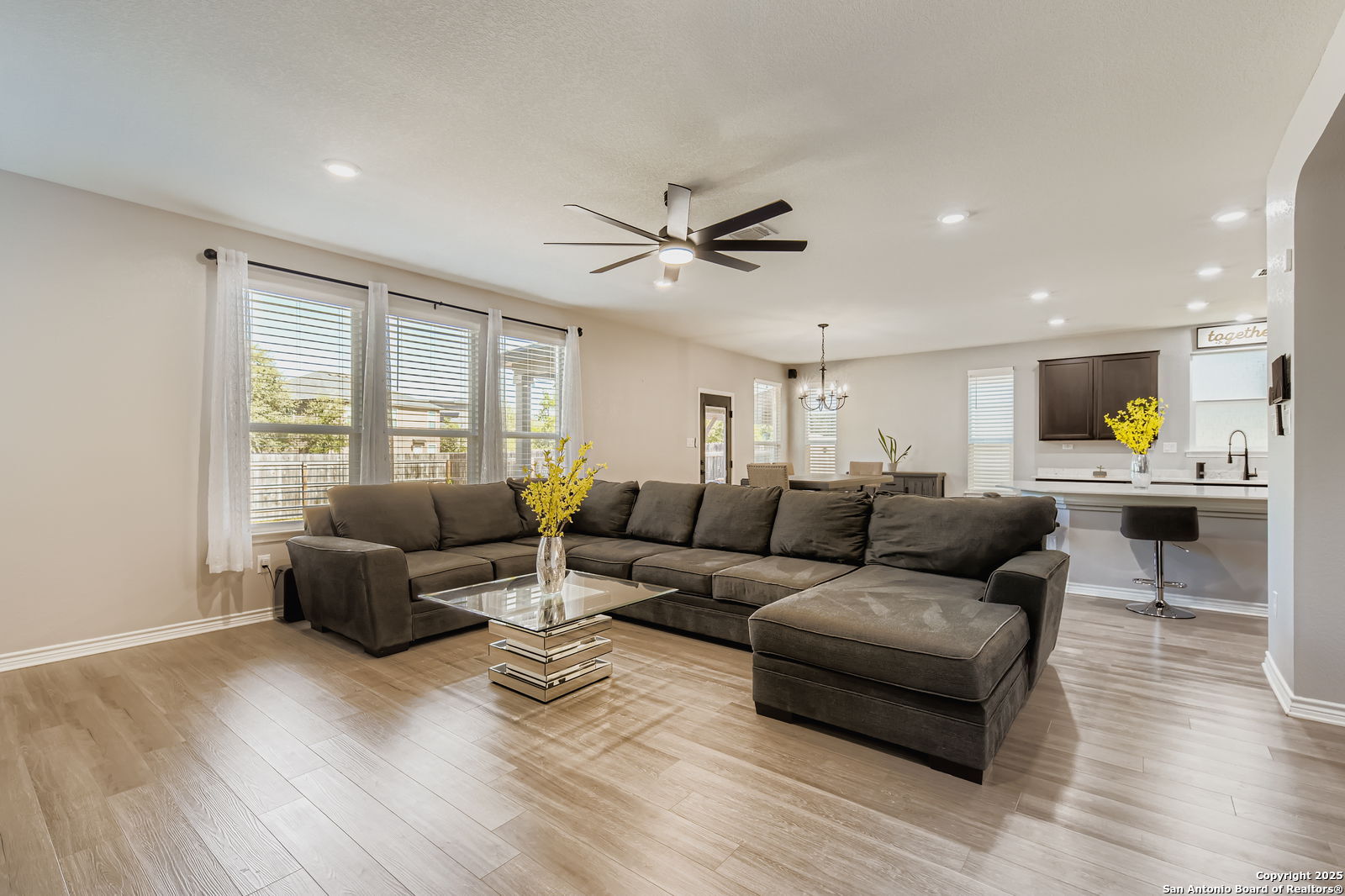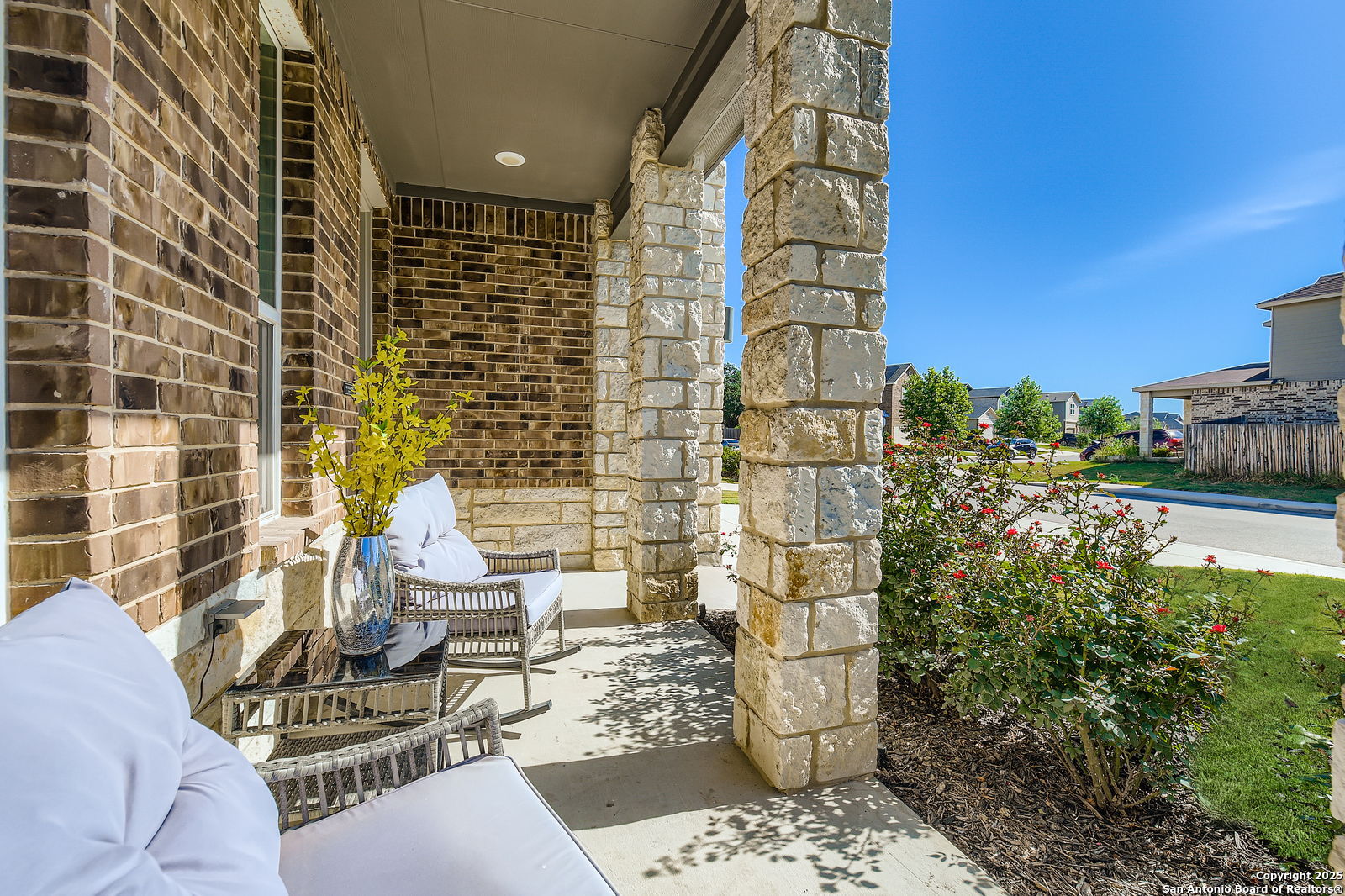 This elegant, "model-like", 4BR/2.5B /2-car garage WITH formal office has been gently lived in and sits on a greenbelt in Far West San Antonio. ***NO CITY TAXES***BUILDER'S WARRANTY*** Just shy of 2900 sf, this beauty was thoughtfully built containing high-level quality LVP throughout the first floor, a spacious study with custom glass doors, an extended island with quartz countertops, underlit 42" cabinets & a versatile under staircase storage room! Its elongated entry hallway provides privacy into the first floor living area and flows seamlessly into the custom flared steps leading to the upper level! A grand 2nd story living area is perfect for kiddos & adults alike to game, play or take in a movie! The oversized Owner's Retreat is completed by an upgraded bath containing a garden tub shower combo, dual vanities, private toilet room and a substantial closet! Additional home upgrades include: in-home water softener, security system with smart home keyless entry, stylish black cabinet kitchen faucets & door handles, SS appliances, ceiling fans in every room and much more!!! The private backyard is perfect for large parties or family get-togethers with the rear greenbelt adding additional privacy. NEIGHBORHOOD AMENITIES include pool & playground. Come out & see this "like-new" beauty!!