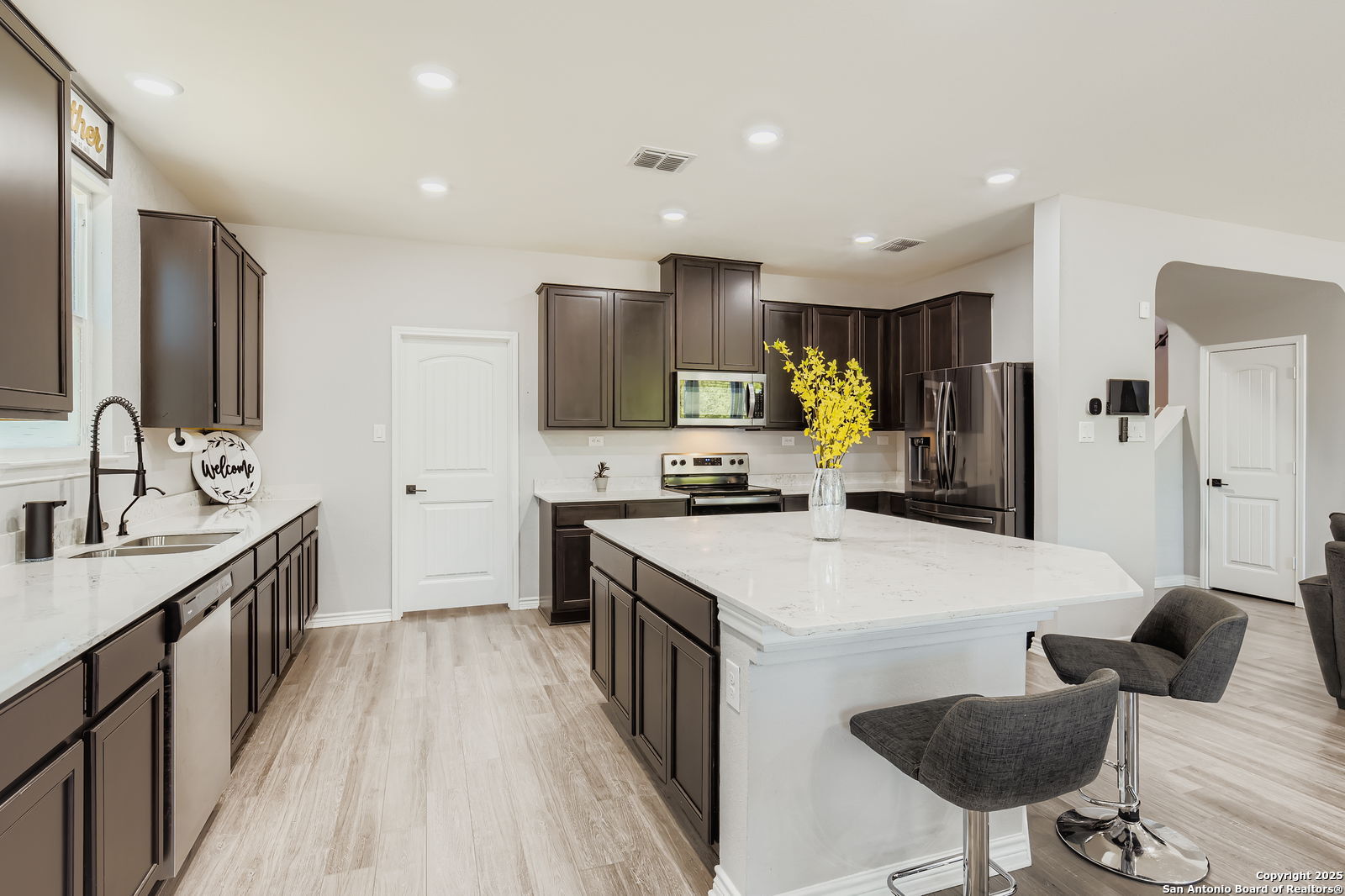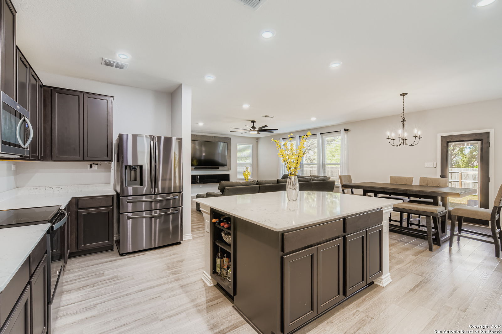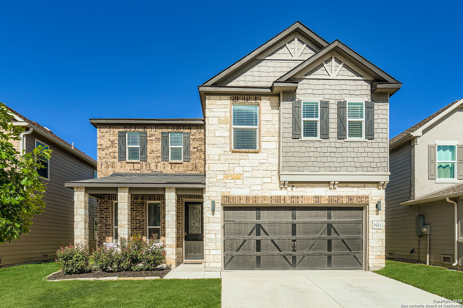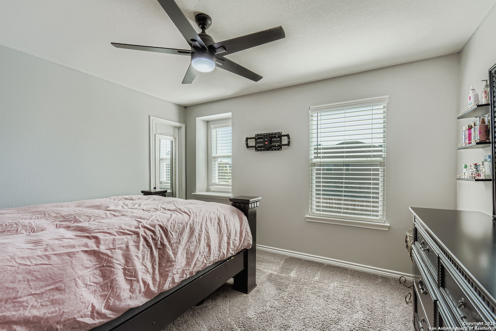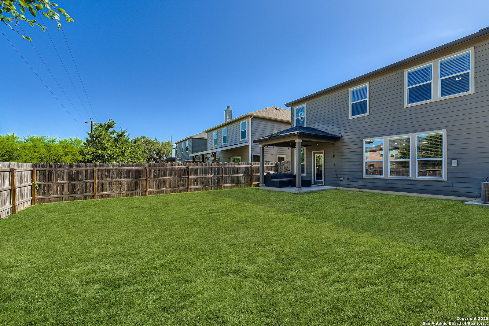 This elegant, "model-like", 4BR/2.5B /2-car garage WITH formal office has been gently lived in and sits on a greenbelt in Far West San Antonio. ***NO CITY TAXES***BUILDER'S WARRANTY*** Just shy of 2900 sf, this beauty was thoughtfully built containing high-level quality LVP throughout the first floor, a spacious study with custom glass doors, an extended island with quartz countertops, underlit 42" cabinets & a versatile under staircase storage room! Its elongated entry hallway provides privacy into the first floor living area and flows seamlessly into the custom flared steps leading to the upper level! A grand 2nd story living area is perfect for kiddos & adults alike to game, play or take in a movie! The oversized Owner's Retreat is completed by an upgraded bath containing a garden tub shower combo, dual vanities, private toilet room and a substantial closet! Additional home upgrades include: in-home water softener, security system with smart home keyless entry, stylish black cabinet kitchen faucets & door handles, SS appliances, ceiling fans in every room and much more!!! The private backyard is perfect for large parties or family get-togethers with the rear greenbelt adding additional privacy. NEIGHBORHOOD AMENITIES include pool & playground. Come out & see this "like-new" beauty!!