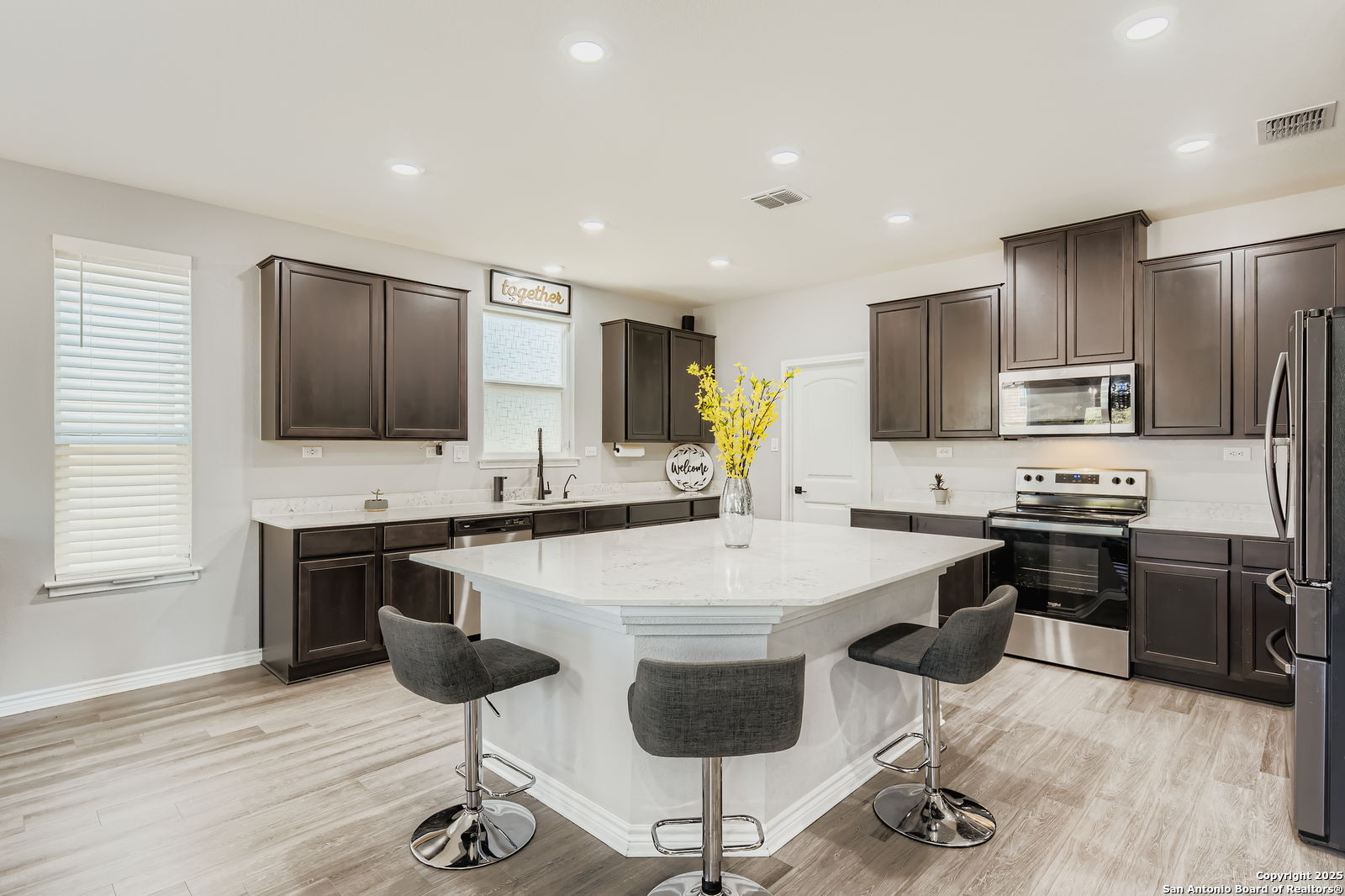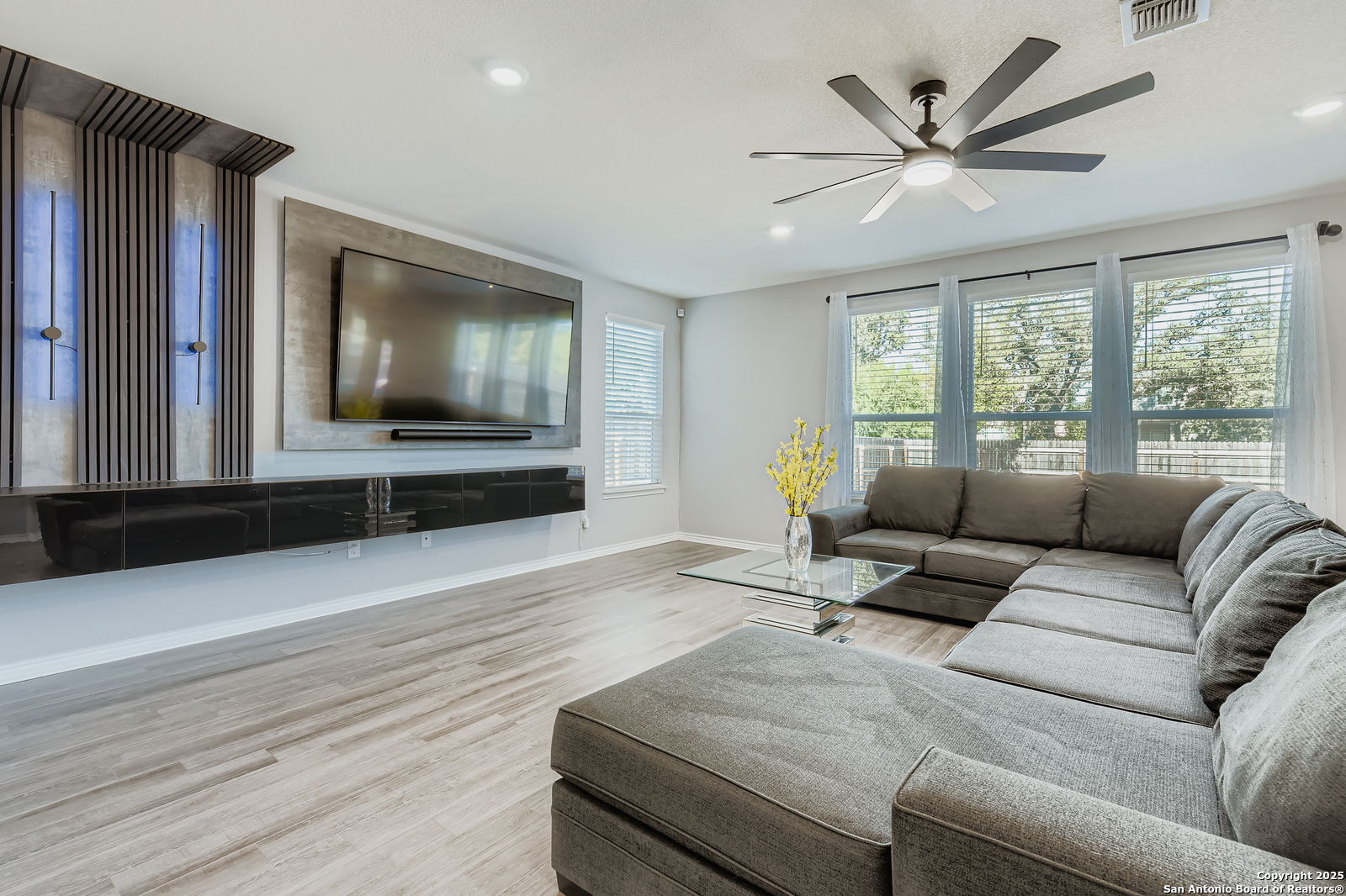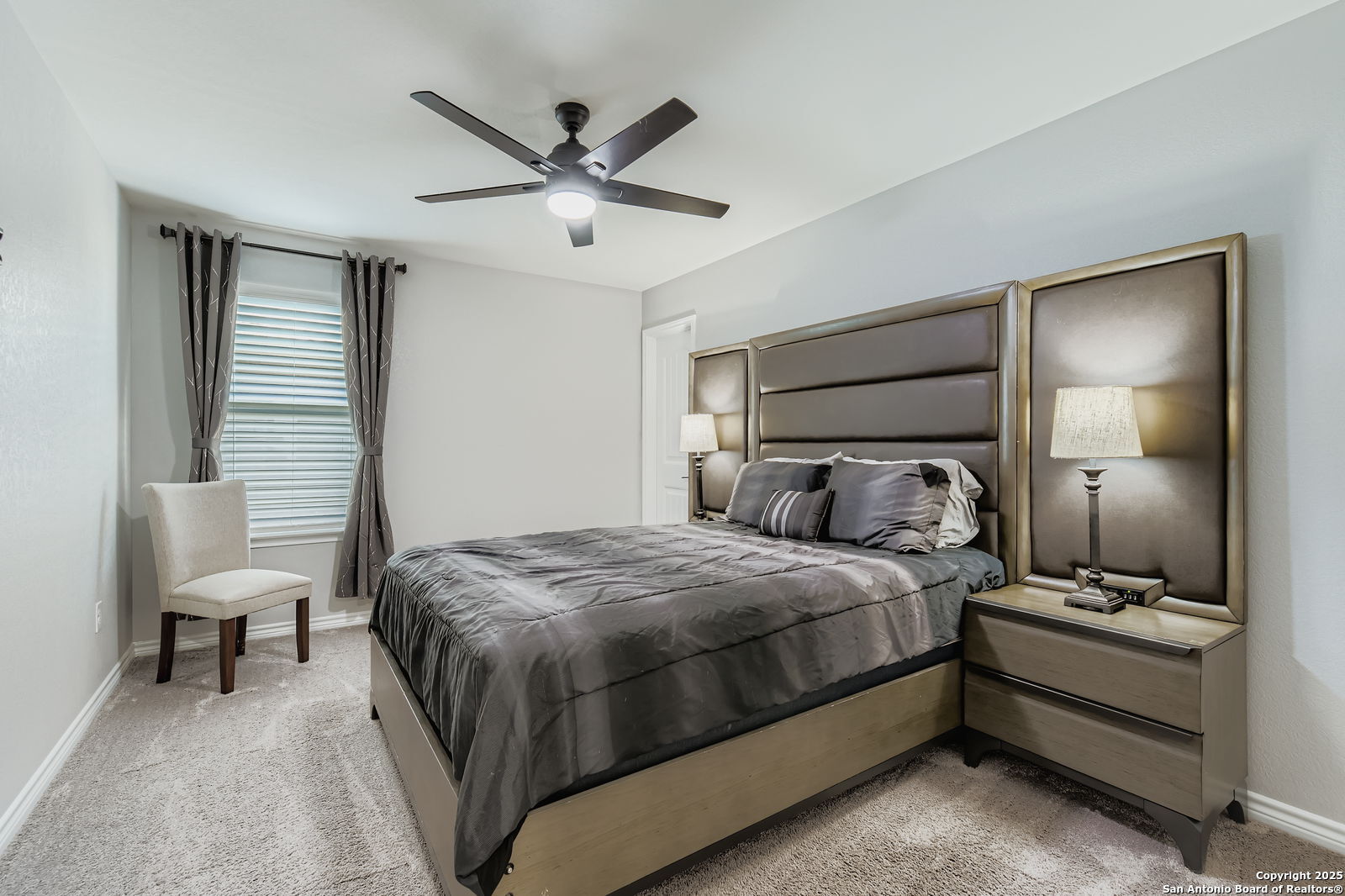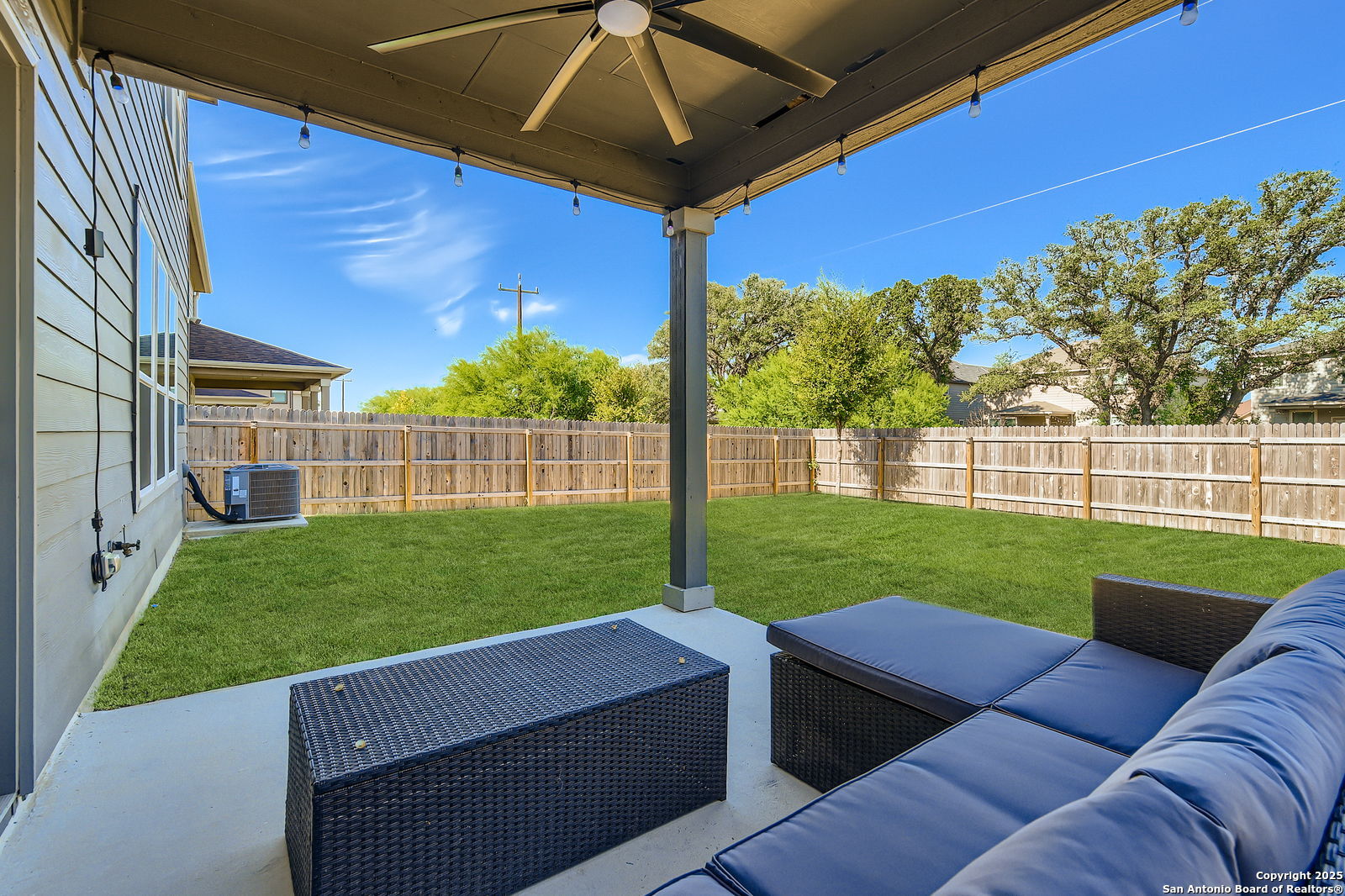 This elegant, "model-like", 4BR/2.5B /2-car garage WITH formal office has been gently lived in and sits on a greenbelt in Far West San Antonio. ***NO CITY TAXES***BUILDER'S WARRANTY*** Just shy of 2900 sf, this beauty was thoughtfully built containing high-level quality LVP throughout the first floor, a spacious study with custom glass doors, an extended island with quartz countertops, underlit 42" cabinets & a versatile under staircase storage room! Its elongated entry hallway provides privacy into the first floor living area and flows seamlessly into the custom flared steps leading to the upper level! A grand 2nd story living area is perfect for kiddos & adults alike to game, play or take in a movie! The oversized Owner's Retreat is completed by an upgraded bath containing a garden tub shower combo, dual vanities, private toilet room and a substantial closet! Additional home upgrades include: in-home water softener, security system with smart home keyless entry, stylish black cabinet kitchen faucets & door handles, SS appliances, ceiling fans in every room and much more!!! The private backyard is perfect for large parties or family get-togethers with the rear greenbelt adding additional privacy. NEIGHBORHOOD AMENITIES include pool & playground. Come out & see this "like-new" beauty!!