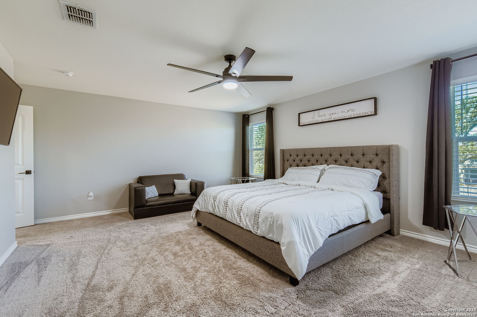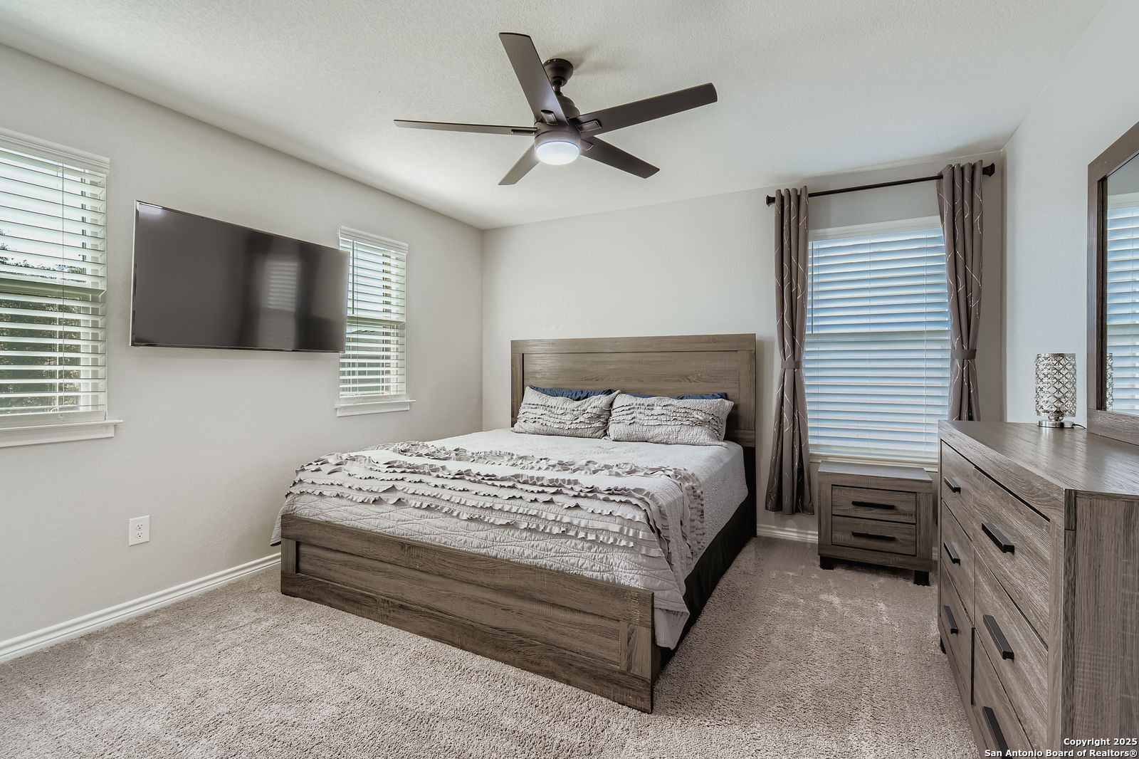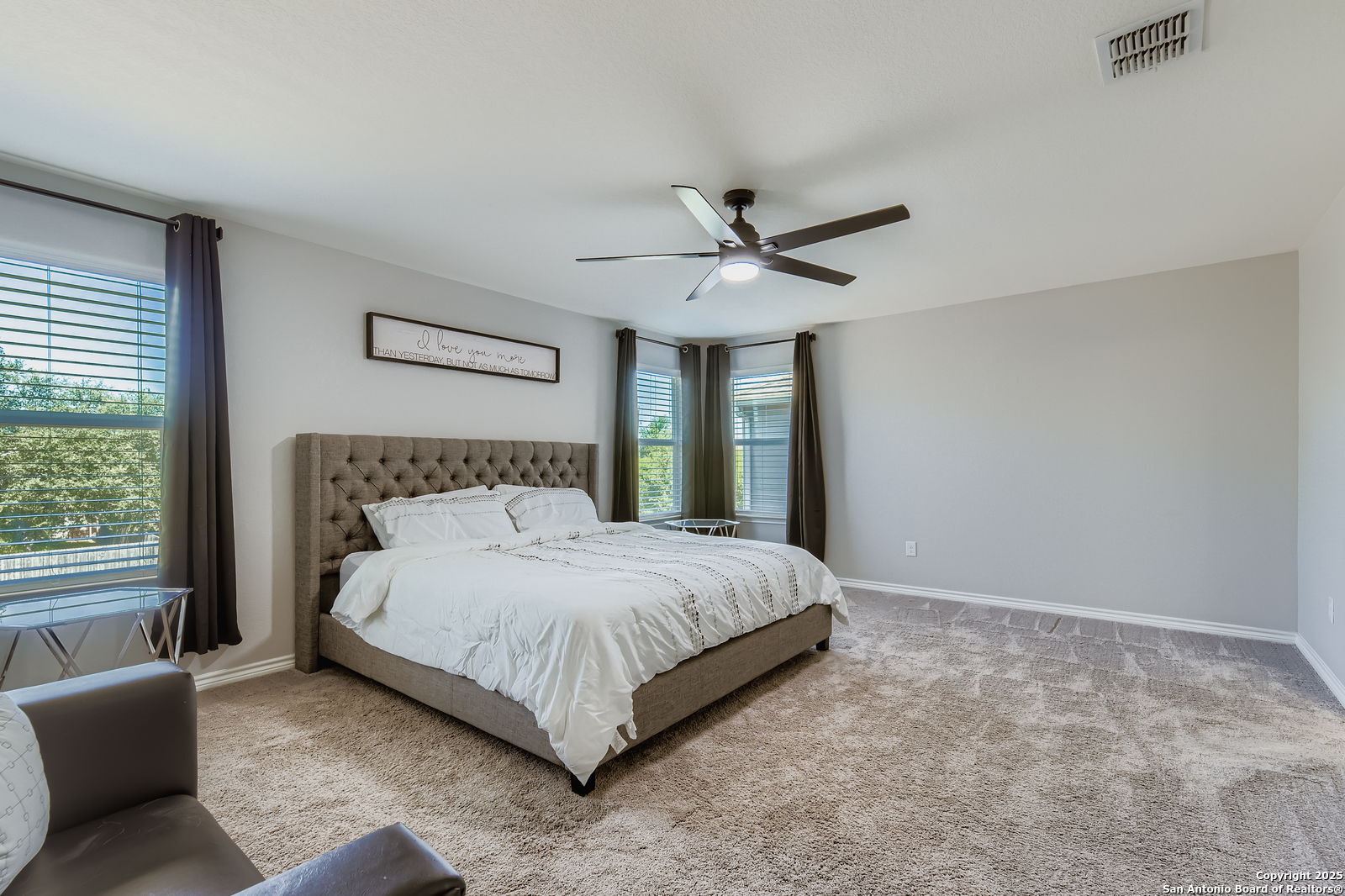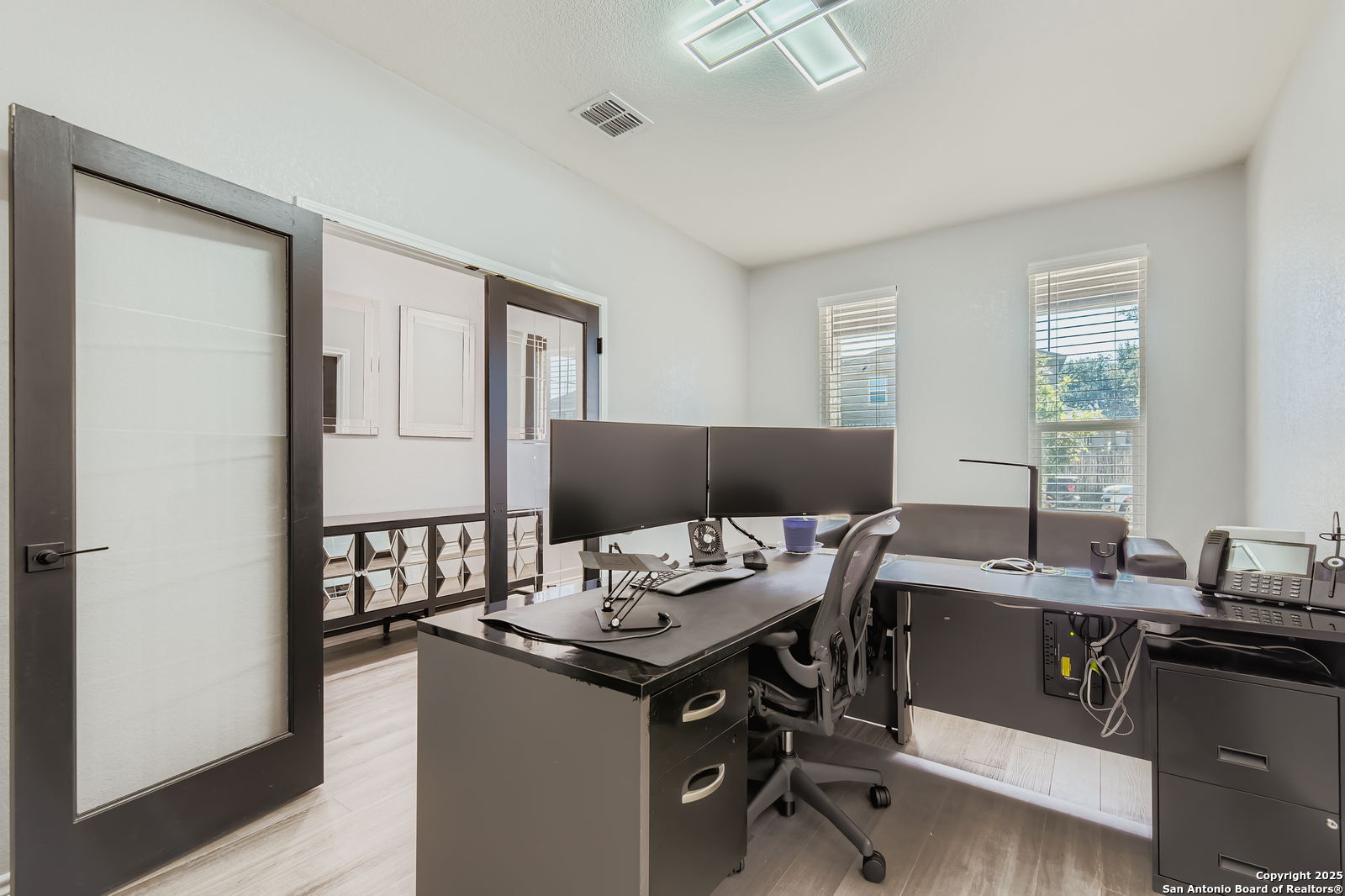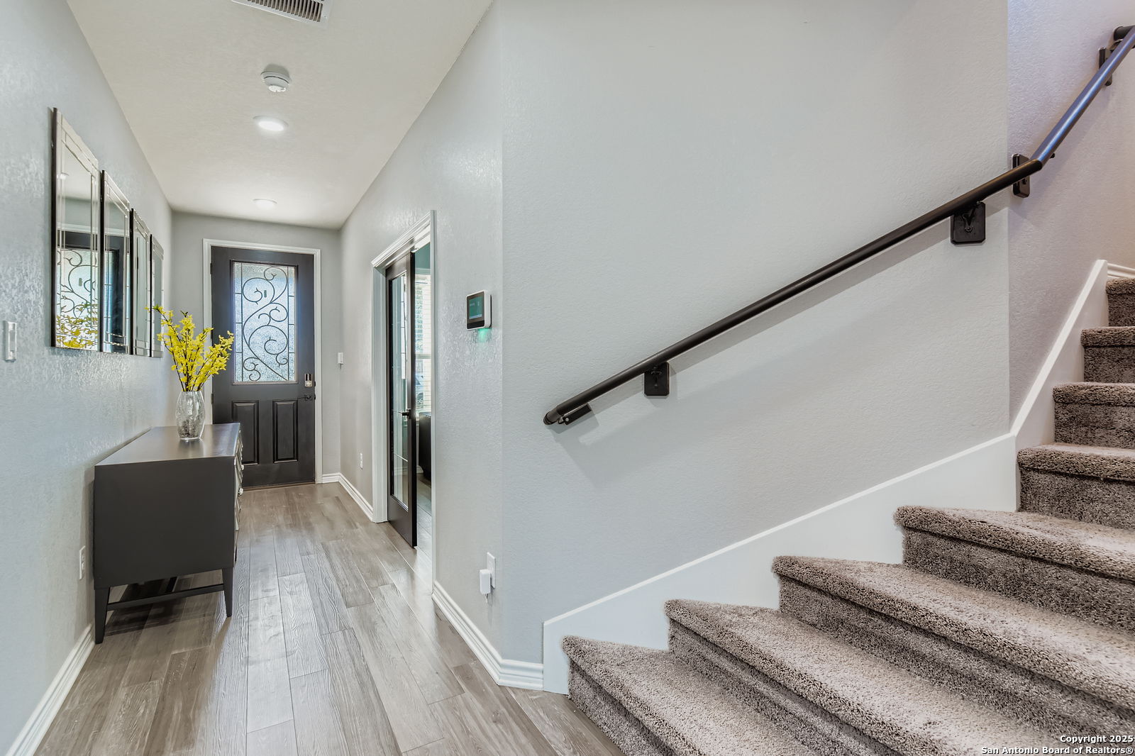 This elegant, "model-like", 4BR/2.5B /2-car garage WITH formal office has been gently lived in and sits on a greenbelt in Far West San Antonio. ***NO CITY TAXES***BUILDER'S WARRANTY*** Just shy of 2900 sf, this beauty was thoughtfully built containing high-level quality LVP throughout the first floor, a spacious study with custom glass doors, an extended island with quartz countertops, underlit 42" cabinets & a versatile under staircase storage room! Its elongated entry hallway provides privacy into the first floor living area and flows seamlessly into the custom flared steps leading to the upper level! A grand 2nd story living area is perfect for kiddos & adults alike to game, play or take in a movie! The oversized Owner's Retreat is completed by an upgraded bath containing a garden tub shower combo, dual vanities, private toilet room and a substantial closet! Additional home upgrades include: in-home water softener, security system with smart home keyless entry, stylish black cabinet kitchen faucets & door handles, SS appliances, ceiling fans in every room and much more!!! The private backyard is perfect for large parties or family get-togethers with the rear greenbelt adding additional privacy. NEIGHBORHOOD AMENITIES include pool & playground. Come out & see this "like-new" beauty!!