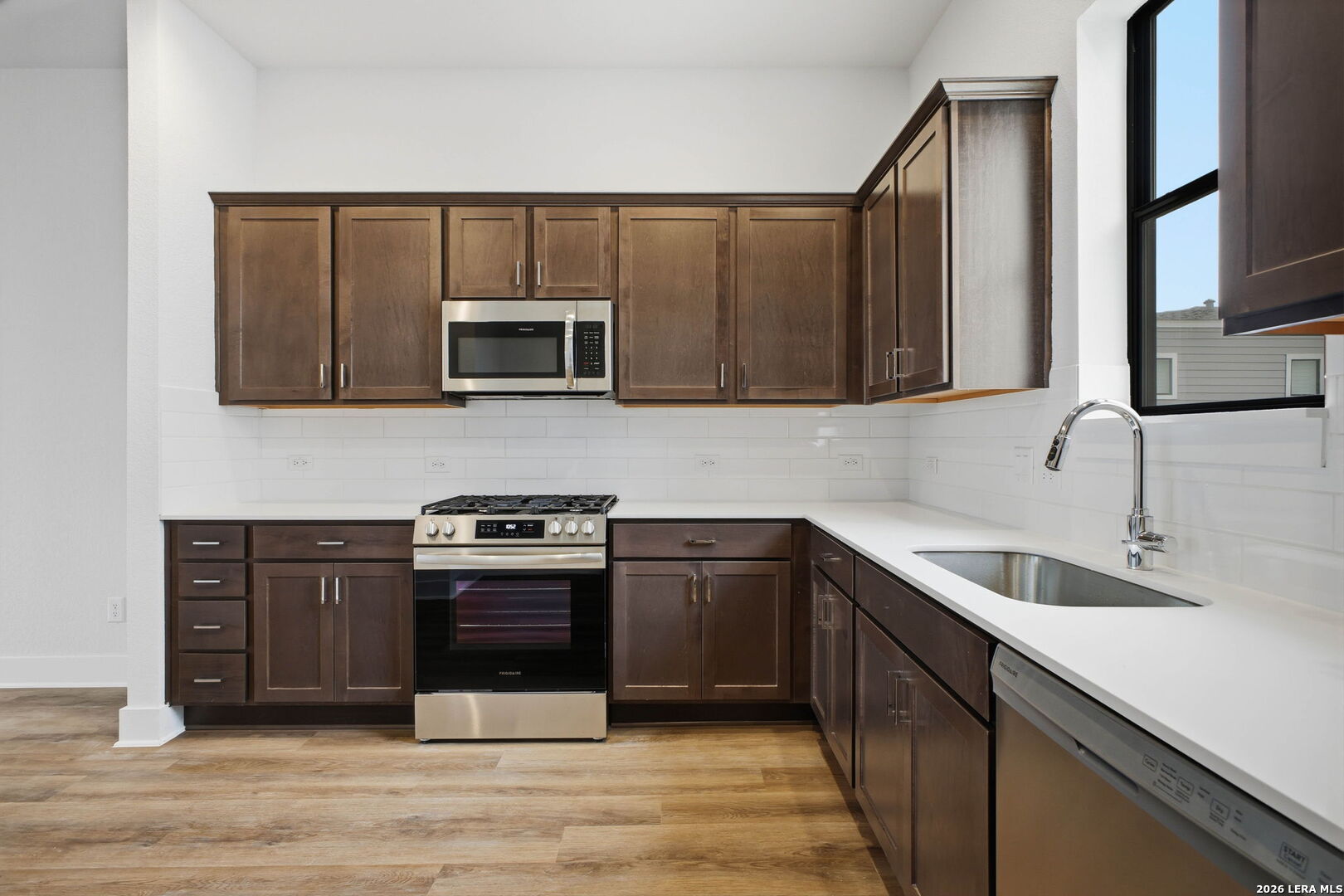 OPEN HOUSE: Sunday, 02/15 11 AM - 3 PM! ROOFTOP Living at Brooks City Base! Experience elevated urban living at Southlake at Brooks, an exciting new townhome community overlooking the Greenline Park and waterfront. This modern 2-bedroom townhome features an open-concept layouts, designer kitchens with stainless steel gas appliances, and spacious bedrooms with en-suite baths. This 1,532 sq ft floor plan offers two bedrooms, two full en-suite bathrooms, a half bath, and an attached two-car garage. The first floor has the 2 car garage and stairs going to the second floor. The second floor is designed for entertaining, showcasing a large living and dining area, a massive kitchen, and a convenient half bath for guests. The third floor features a full-sized owner's suite with beautiful windows overlooking downtown, along with an additional secondary bedroom and bath. Enjoy a private rooftop terrace with scenic views of Greenline Park, perfect for relaxing or entertaining at sunset. Located within the rapidly growing Brooks community just south of downtown San Antonio, Southlake is the first for-sale residential offering on the campus, spanning over five acres with 60 homes. Minutes from dining, shopping, and future retail and entertainment developments, this low-maintenance home blends modern style, comfort, and convenience.