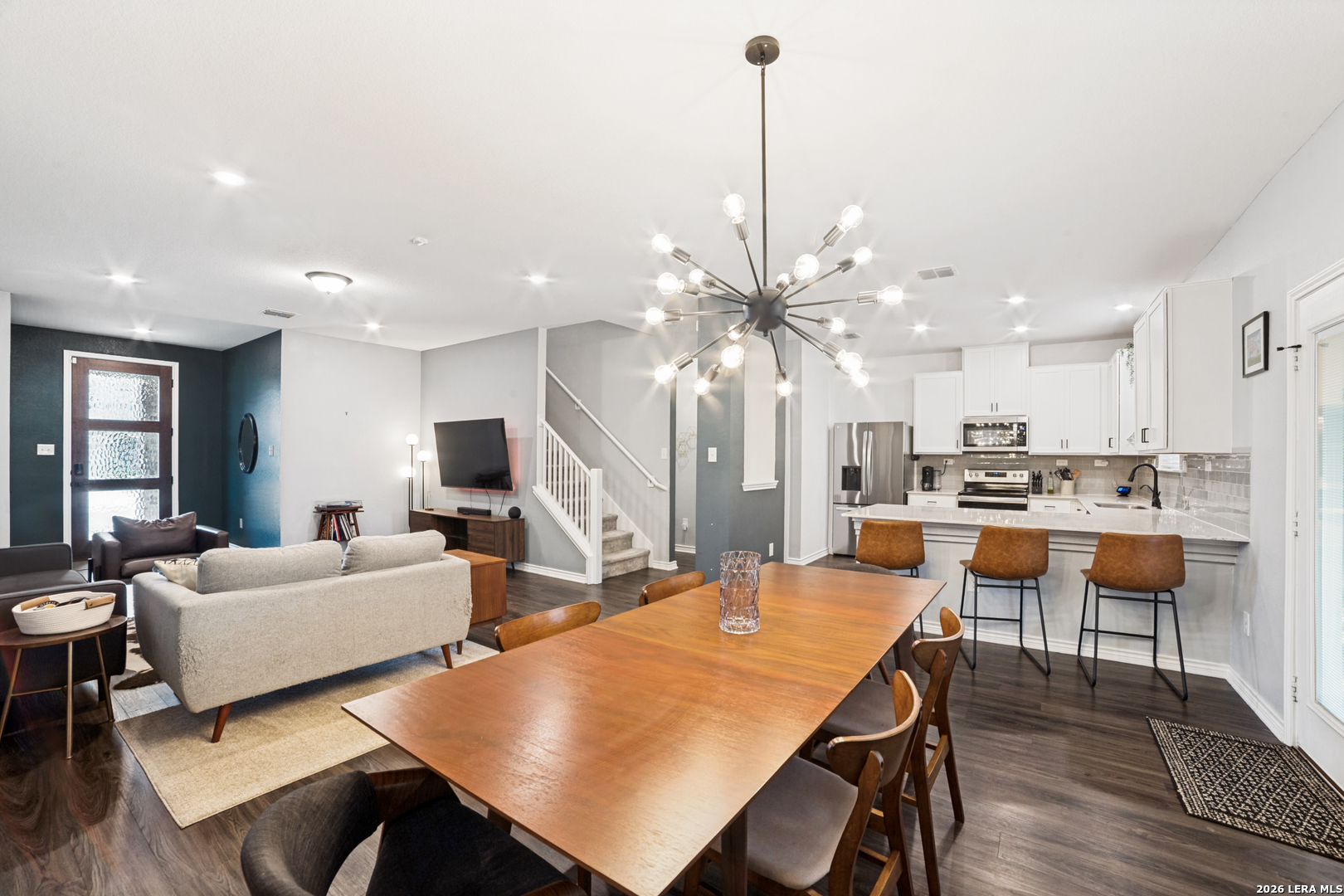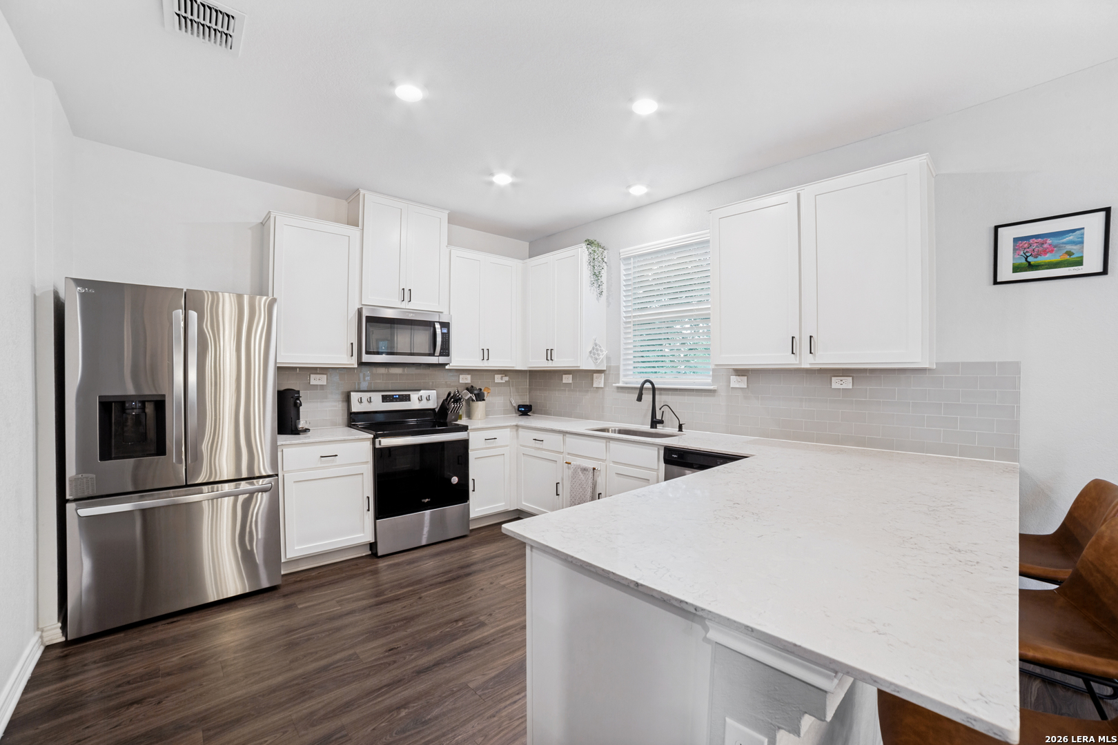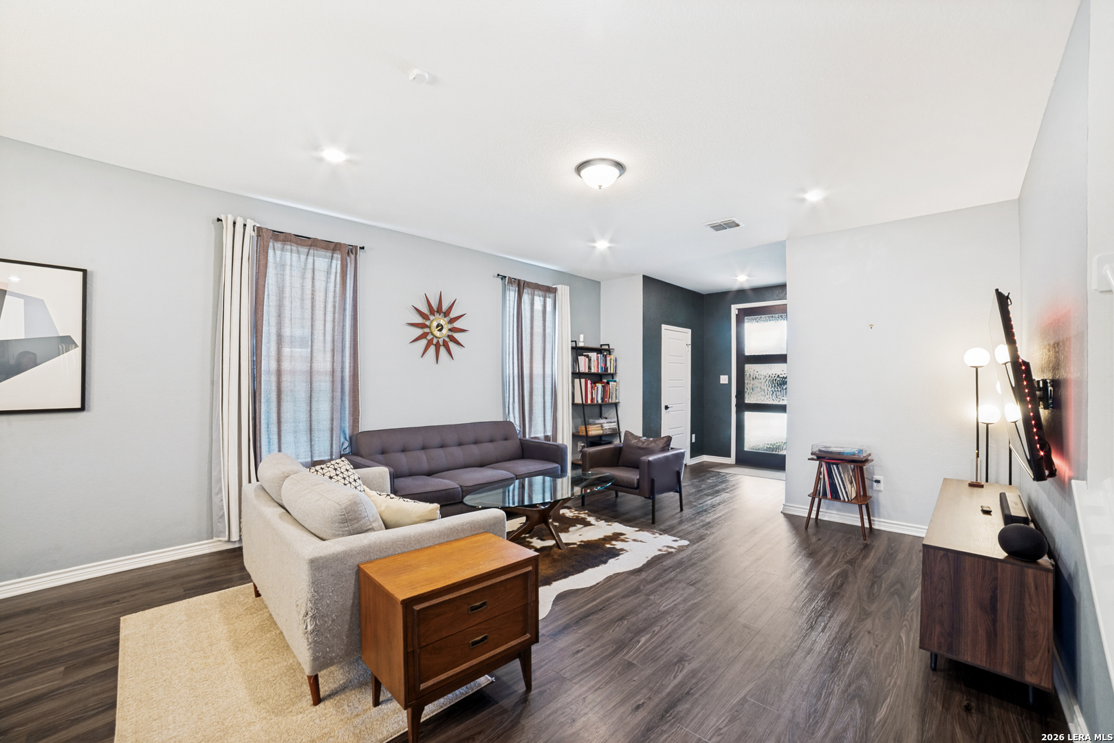 Welcome to this meticulously kept 3-bedroom, 2.5-bathroom home, perfectly designed for modern living. Upon entering, you are greeted by impressive 9-foot ceilings. The entire downstairs features no carpet, boasting upgraded laminate vinyl plank flooring for a clean, stylish, and low-maintenance look. The kitchen is a chef's delight with elegant stone countertops, a deep basin sink, plenty of cabinet space and a spacious walk-in pantry. The home offers valuable upgrades, including a full water softener system and a garage with a durable, epoxied floor. Step outside to a peaceful covered patio, perfect for entertaining or relaxing, surrounded by mature trees. As for location, this very well-kept neighborhood is situated directly across from a brand new HEB grocery store and you can enjoy quick access to major highways, making your commute and errands a breeze. Experience the perfect blend of luxury, convenience, and functional upgrades in a truly turn-key property.