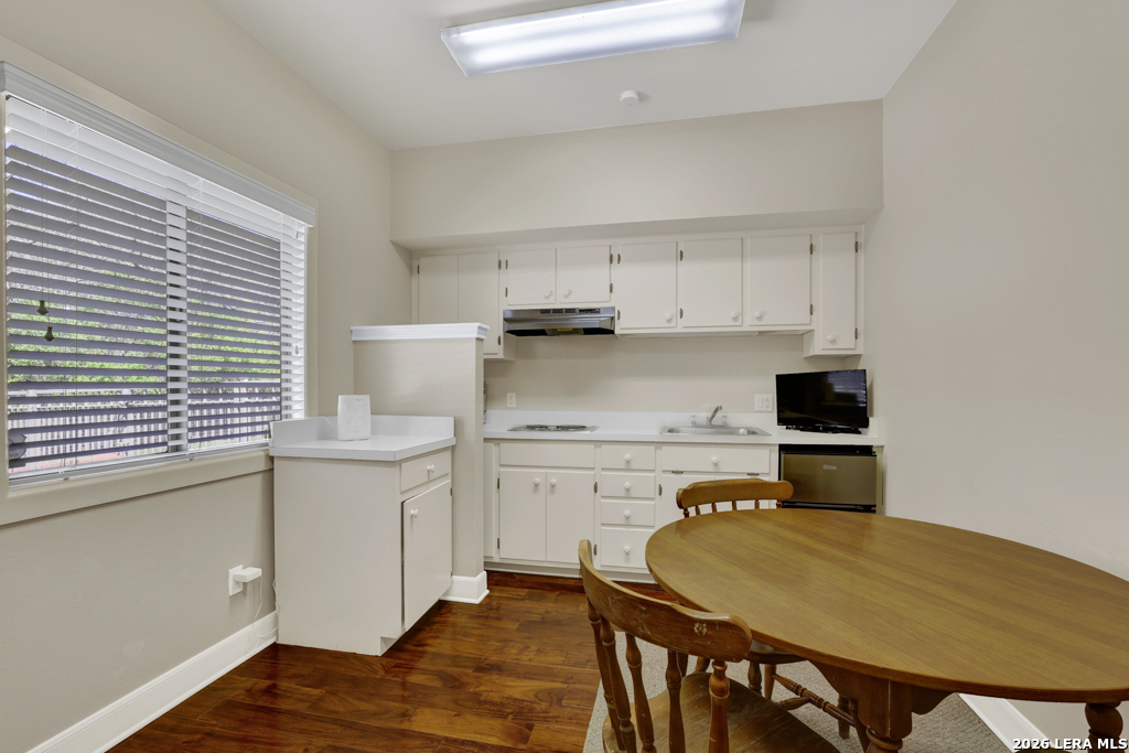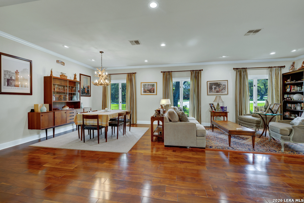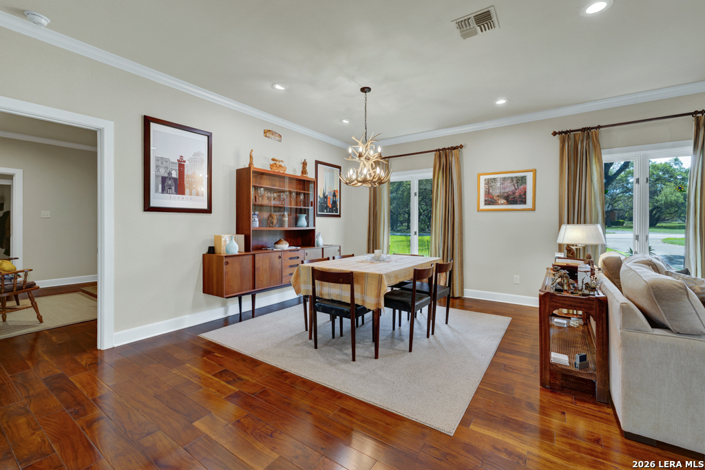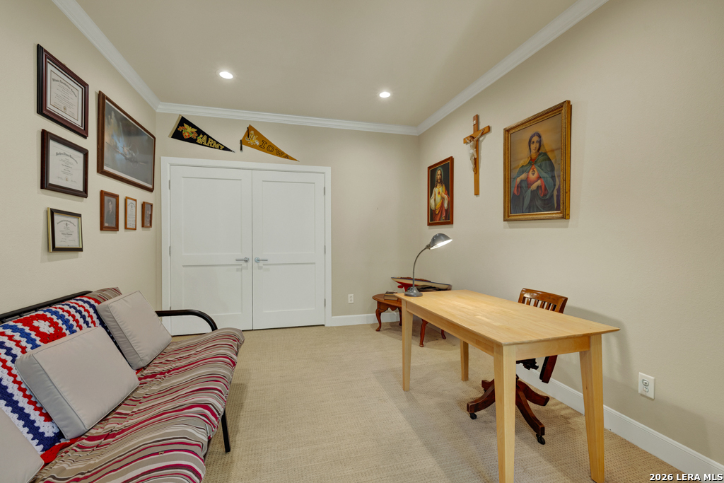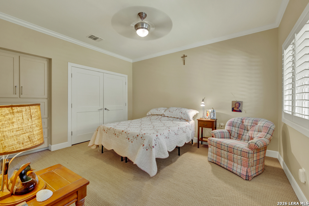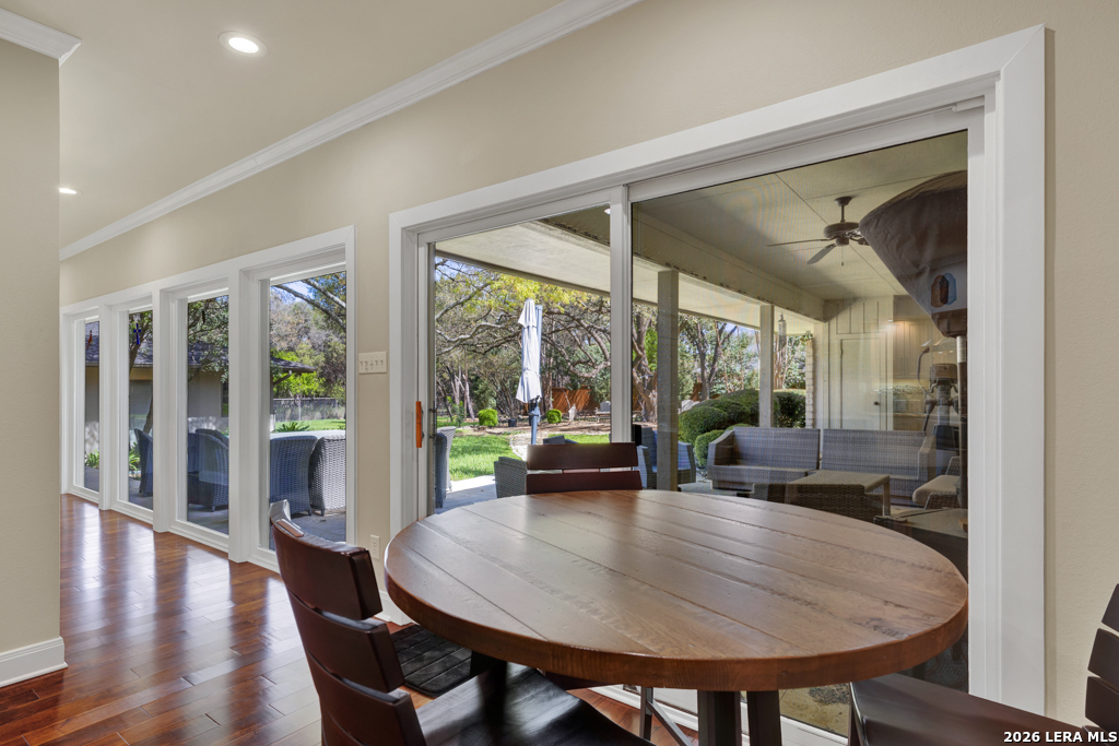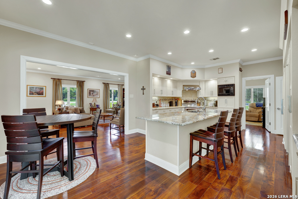 Welcome to 8 Trophy Lane, a truly custom-built home designed and built by one of New Braunfels premier custom home builders. The builder, John Lovett designed and crafted this home for he and his family. This 2,868 square foot home sits on a corner 1.05-acre lot. This unique design offers a detached guest home, in addition to the primary home. The entire home has a total of 4 bedrooms and 3 bathrooms. These are divided up with the primary residence offering 3 bedrooms and 2 bathrooms. The guest home offers a bedroom and a bathroom with a small kitchenette. Located in the highly sought after community of the T Bar M Ranch Estates. This is currently the only home for sale within this beloved community, that offers gated entry and resort style living, close to private amenities such as several swimming pools and professional grade tennis and pickleball courts. Masterfully located between Highway 46 and FM 1863, just a short drive to shopping, entertainment and the excitement of the New Braunfels downtown area. You will notice access to the front door from either street passing under a porte-cochere. The home also has a driveway entrance to access the two separate garages. The entire house is complimented with abundant natural light from several custom 6 foot French county style windows, crown molding, 6-inch baseboards, and hard wood flooring throughout the main areas of the home. Entering the home, you are immediately welcomed by natural light from a skylight in the foyer. This entry allows you to move into either the TV room to the left of the foyer or formal living room/dining room to the right of the foyer. The TV room has built-in cabinets, drawers and showcasing shelves. The formal living room has an open floorplan with recess lighting and flows into the formal dining area. Both TV room and Living/Dining rooms are adjacent to the large kitchen. The kitchen is designed with an abundance of custom cabinets. Centered in the kitchen is a large 4'x9'island with a deep sink and reverse osmosis system. Blending in with the cabinets are the subzero refrigerator and subzero freezer. Between the kitchen and the access to the garage is the laundry room with a sink, additional cabinets, ice machine, large storage room. The kitchen offers a great view and access to the backyard through windows that line across almost the entire exterior wall, with French doors that open onto the large, covered patio.