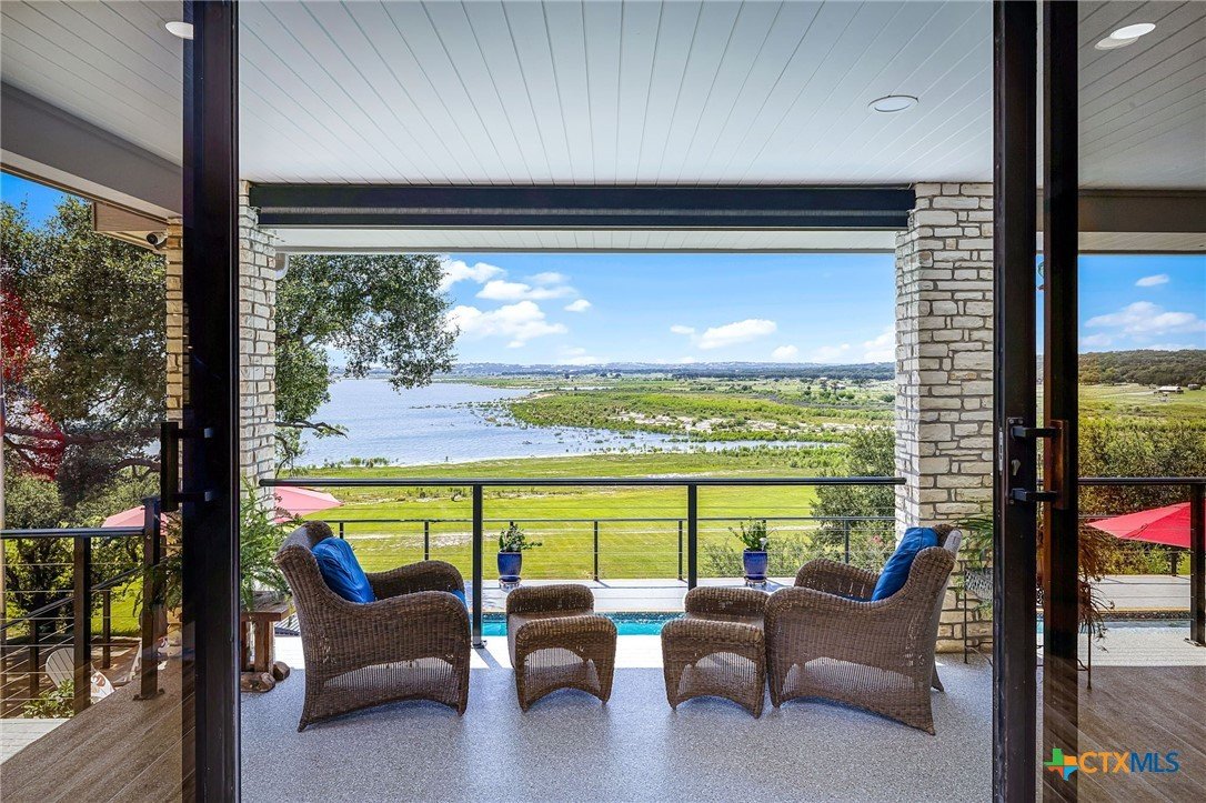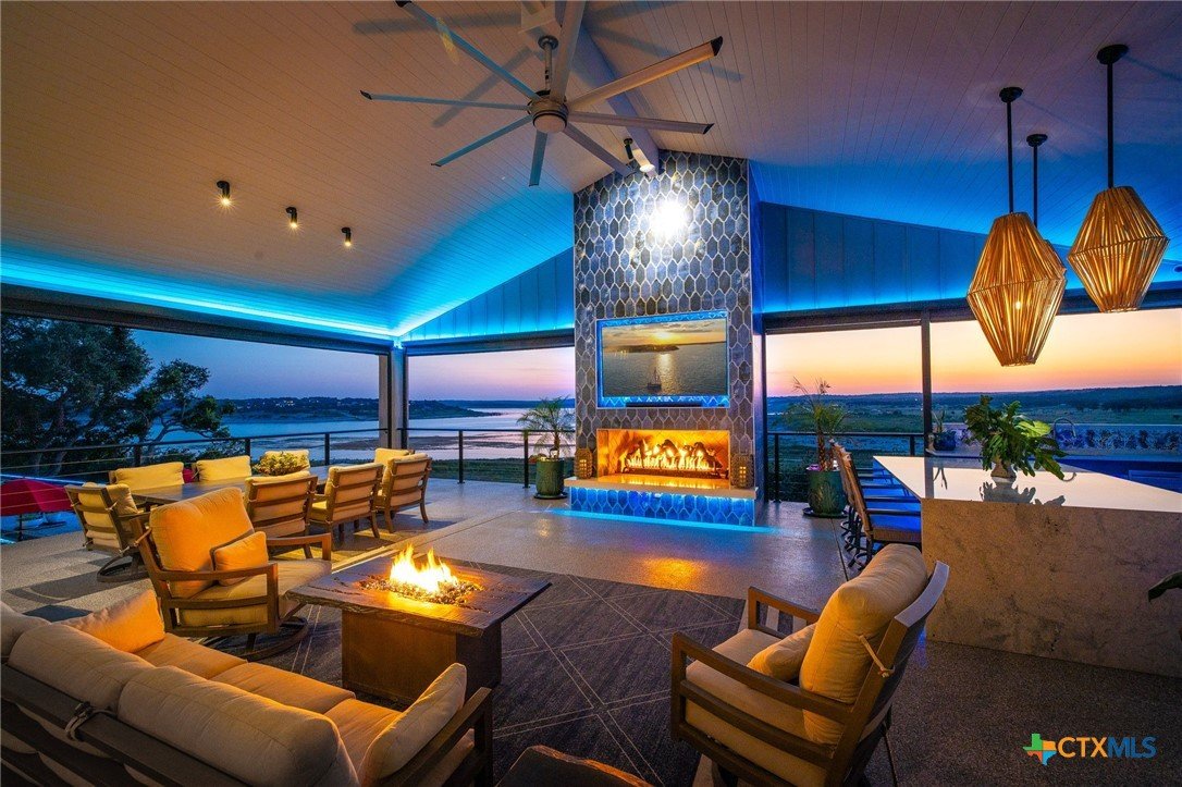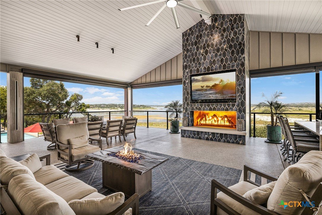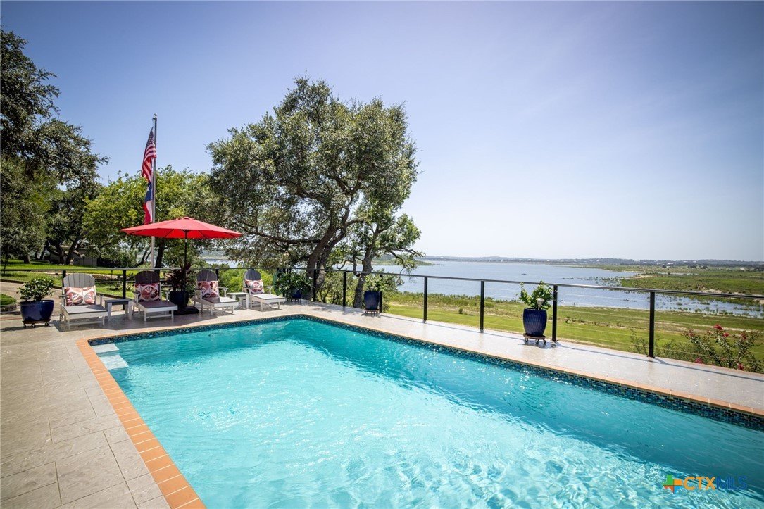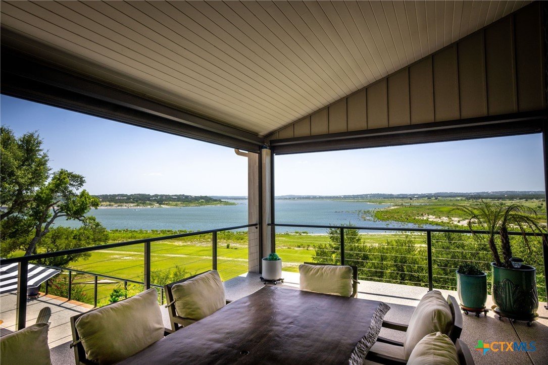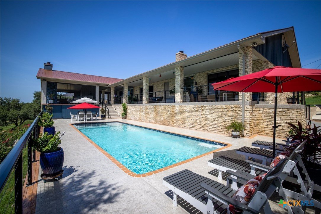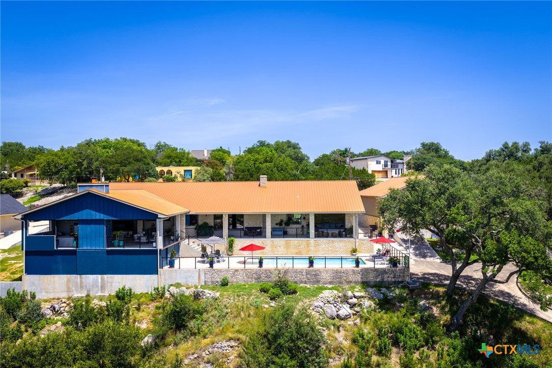 Situated on two acres with 296 feet of Canyon Lake frontage, this rare gem blends luxury living with vibrant lakeside energy. This reimagined mid-century modern home is a masterclass in design and craftsmanship, curated with dramatic architectural features and high-end finishes throughout. Cinematic lake and hill country views greet you through the custom wrought iron pivot door and continue throughout the home. Soaring cathedral ceilings, hammered porcelain floors, and expansive windows create a seamless indoor-outdoor experience. The chef-inspired kitchen stuns with Thermador appliances, a large pantry, and a dramatic 9' x 5.5' Cambria quartz waterfall island. It opens to a spacious living room anchored by a bold chiseled granite fireplace. Step outside to a covered patio and veranda with an outdoor kitchen, perfect for al fresco dining. Enjoy the tiled pool with sweeping lake views or head down to your private shoreline for boating, fishing, or relaxing. A custom pool bathroom adds convenience after lake days. The owner's wing offers serene lake views, private patio access, and spacious walk-in closets. The newly designed en-suite bath is a spa-like retreat with a soaking tub and walk-in shower that overlooks the lake. An attached 4-car garage and 2,000 sq. ft. workshop with three bays provide ample room for auto collections, watercraft, or UTVs. Ask your agent for the full brochure and photo gallery. And on a personal note… As a close friend of the owners, I’ve had the joy of watching this remarkable transformation unfold. This home has been the heart of countless gatherings full of laughter and love. It’s not just a house—it’s a vibe, a feeling, and a place where memories are made. You won’t just want to be here—you’ll feel like you already belong.