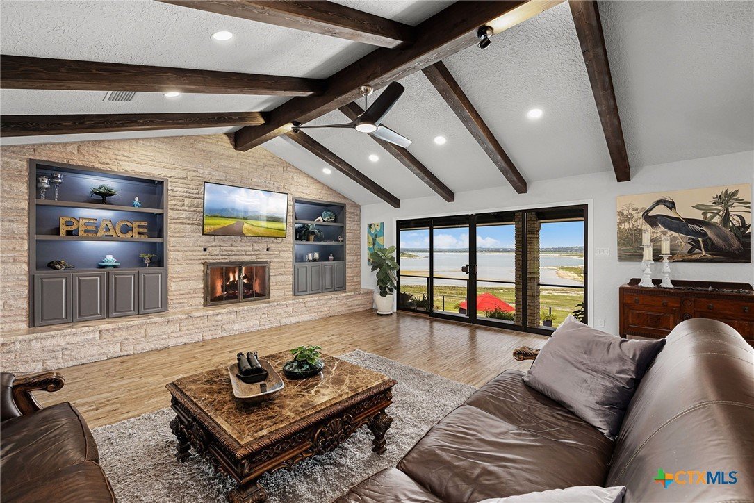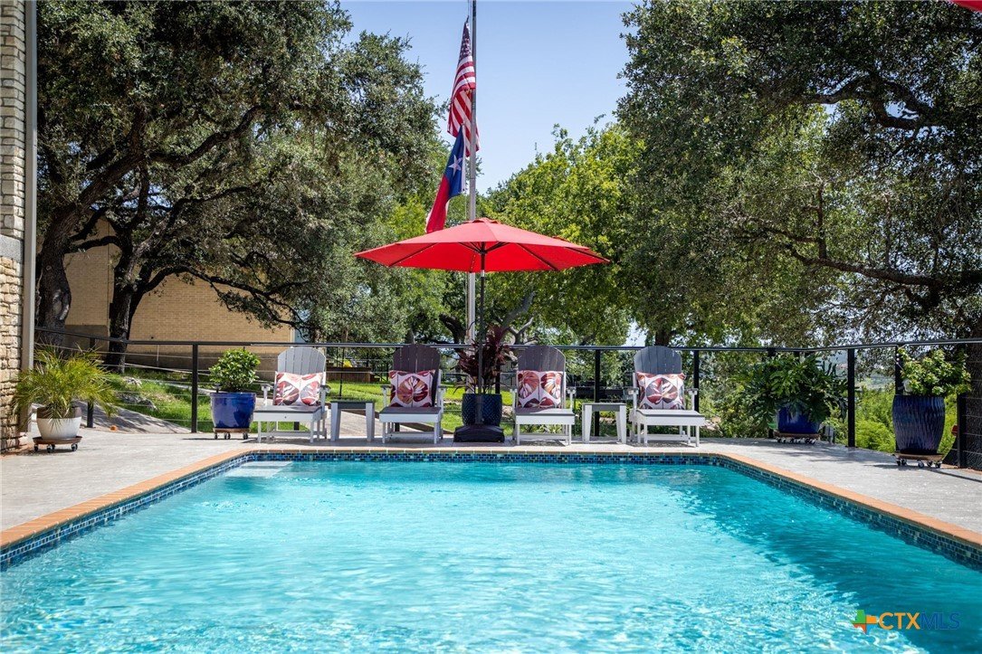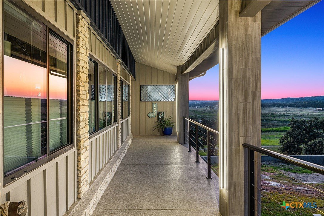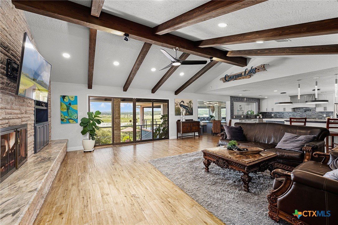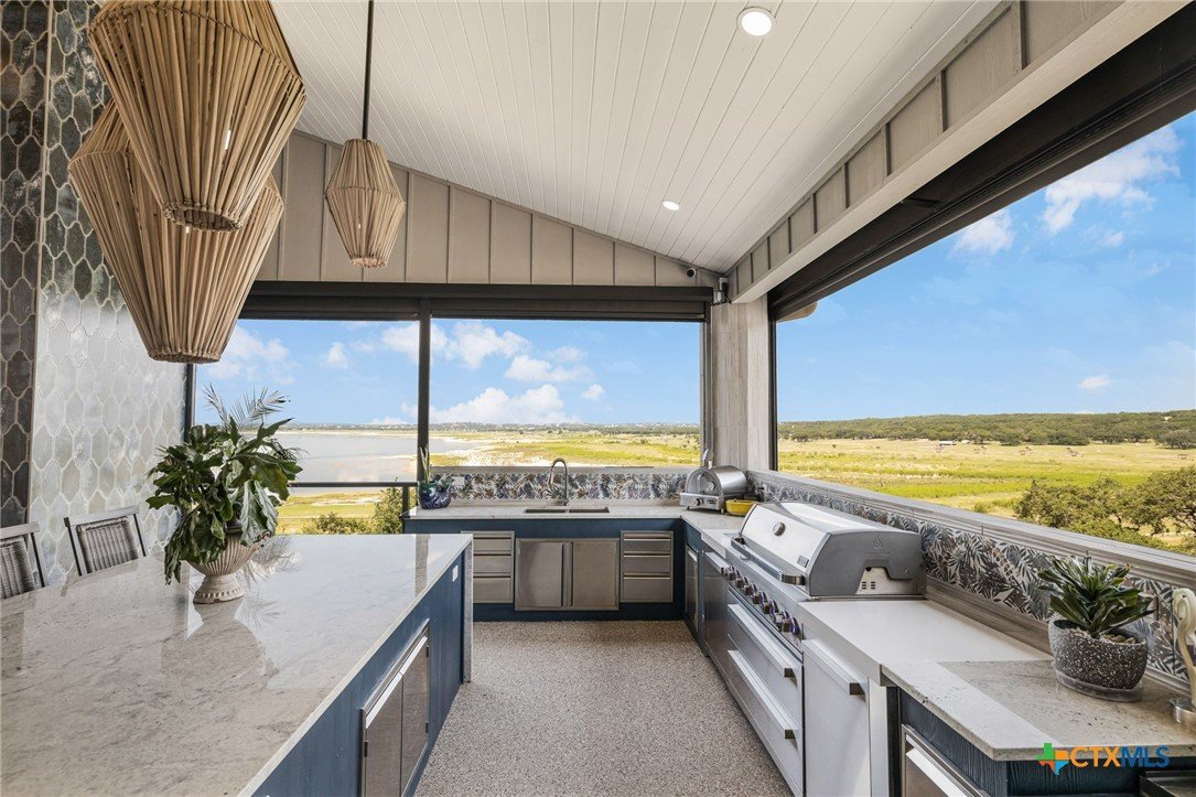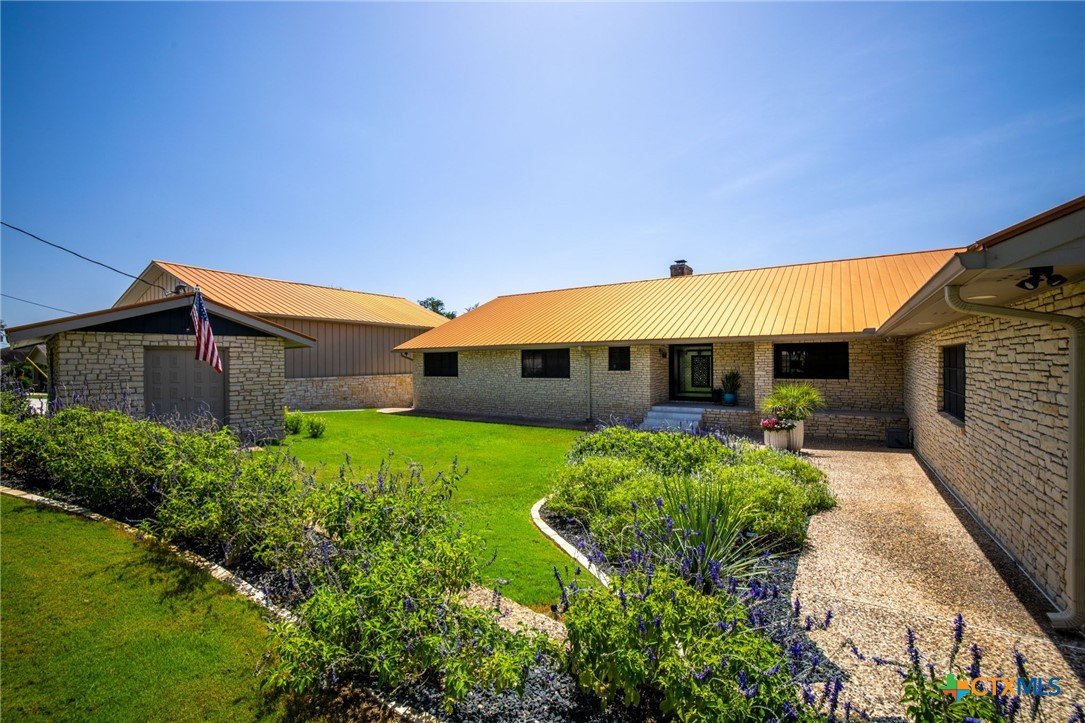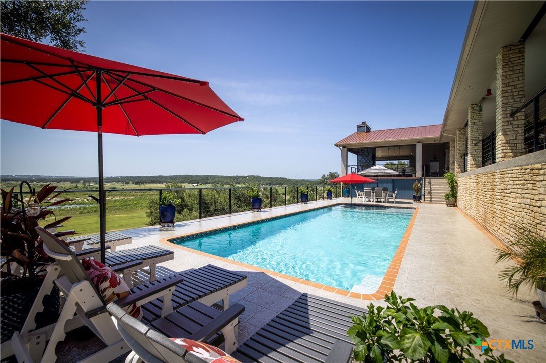 Situated on two acres with 296 feet of Canyon Lake frontage, this rare gem blends luxury living with vibrant lakeside energy. This reimagined mid-century modern home is a masterclass in design and craftsmanship, curated with dramatic architectural features and high-end finishes throughout. Cinematic lake and hill country views greet you through the custom wrought iron pivot door and continue throughout the home. Soaring cathedral ceilings, hammered porcelain floors, and expansive windows create a seamless indoor-outdoor experience. The chef-inspired kitchen stuns with Thermador appliances, a large pantry, and a dramatic 9' x 5.5' Cambria quartz waterfall island. It opens to a spacious living room anchored by a bold chiseled granite fireplace. Step outside to a covered patio and veranda with an outdoor kitchen, perfect for al fresco dining. Enjoy the tiled pool with sweeping lake views or head down to your private shoreline for boating, fishing, or relaxing. A custom pool bathroom adds convenience after lake days. The owner's wing offers serene lake views, private patio access, and spacious walk-in closets. The newly designed en-suite bath is a spa-like retreat with a soaking tub and walk-in shower that overlooks the lake. An attached 4-car garage and 2,000 sq. ft. workshop with three bays provide ample room for auto collections, watercraft, or UTVs. Ask your agent for the full brochure and photo gallery. And on a personal note… As a close friend of the owners, I’ve had the joy of watching this remarkable transformation unfold. This home has been the heart of countless gatherings full of laughter and love. It’s not just a house—it’s a vibe, a feeling, and a place where memories are made. You won’t just want to be here—you’ll feel like you already belong.