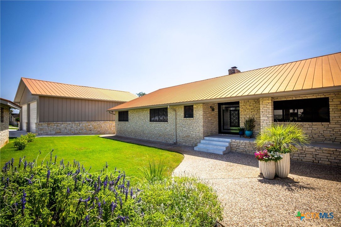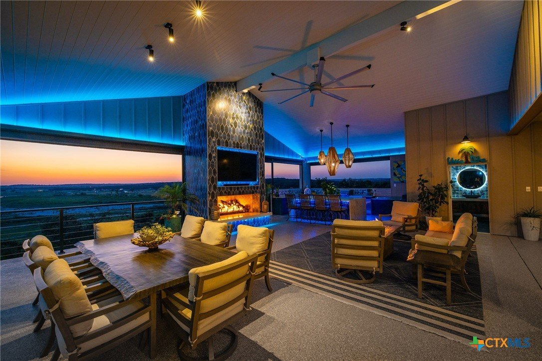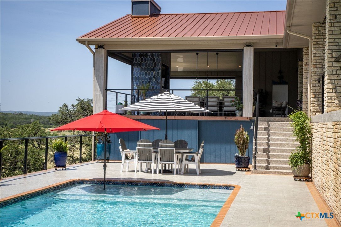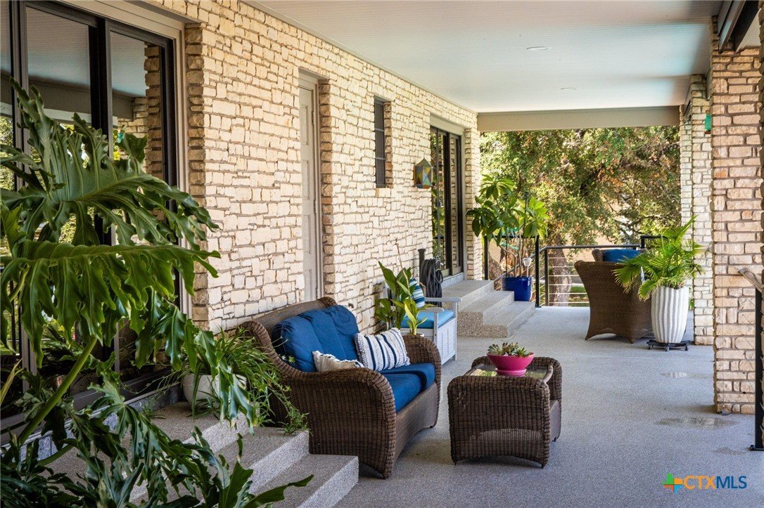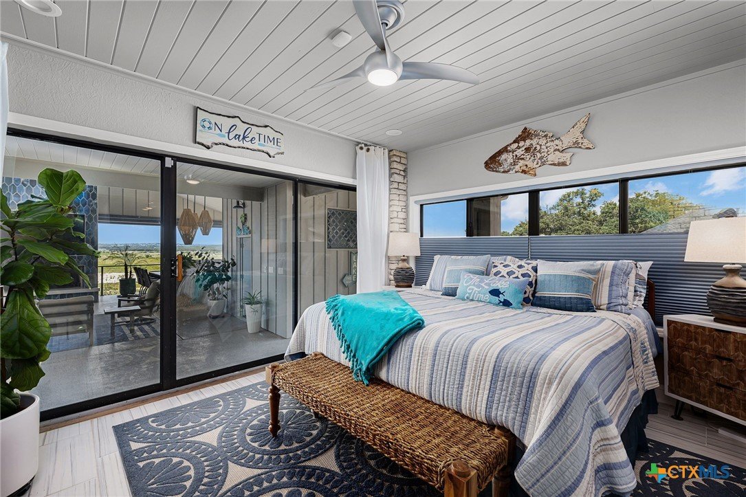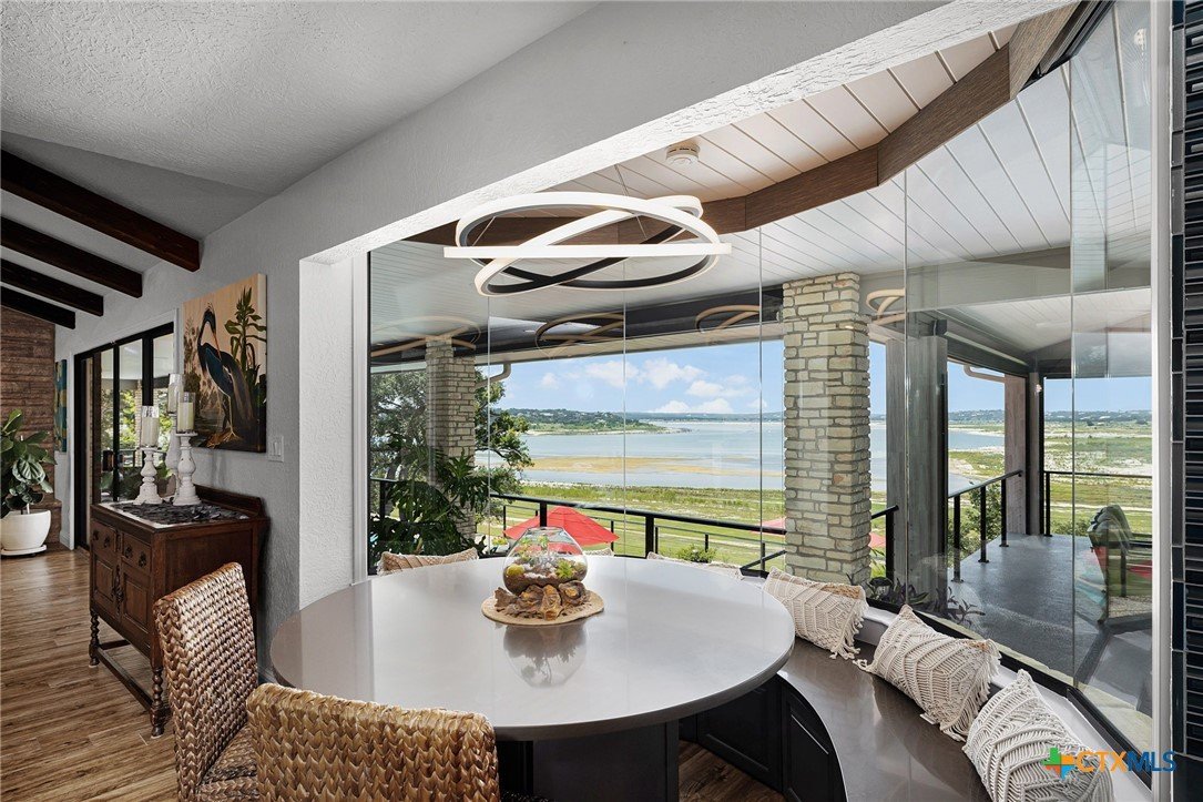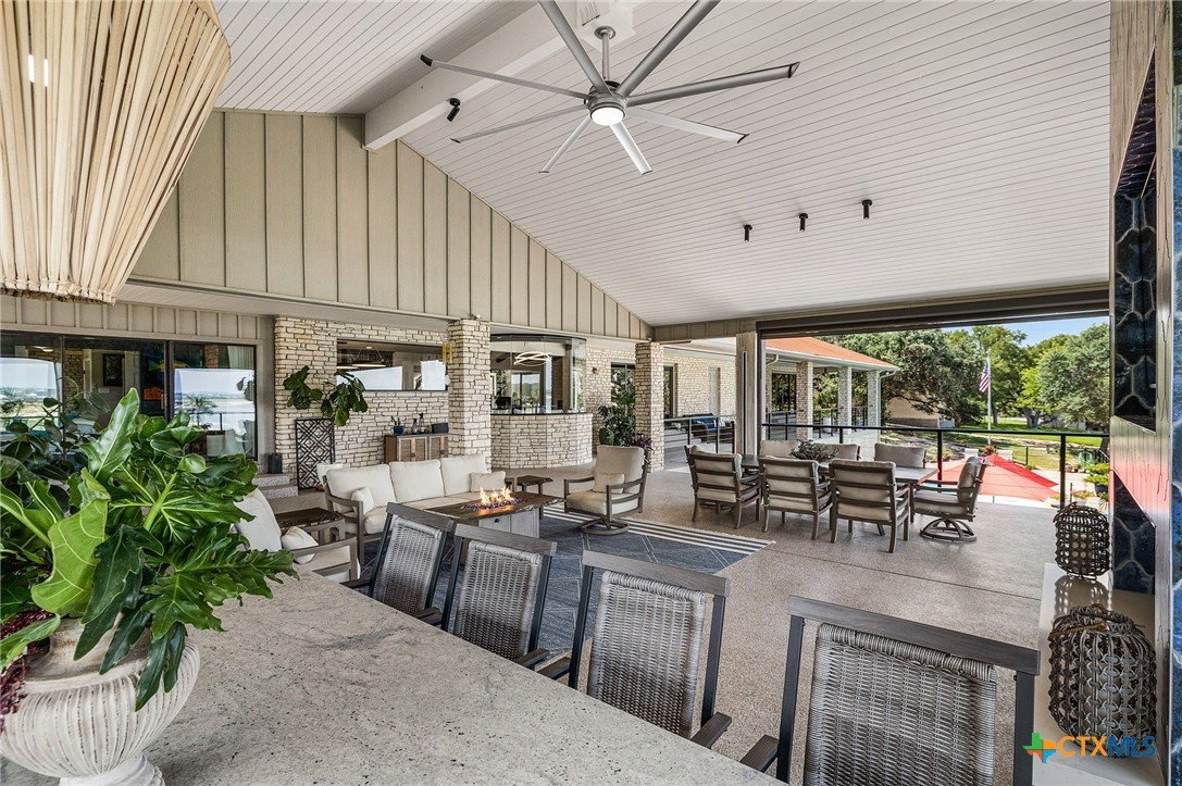 Situated on two acres with 296 feet of Canyon Lake frontage, this rare gem blends luxury living with vibrant lakeside energy. This reimagined mid-century modern home is a masterclass in design and craftsmanship, curated with dramatic architectural features and high-end finishes throughout. Cinematic lake and hill country views greet you through the custom wrought iron pivot door and continue throughout the home. Soaring cathedral ceilings, hammered porcelain floors, and expansive windows create a seamless indoor-outdoor experience. The chef-inspired kitchen stuns with Thermador appliances, a large pantry, and a dramatic 9' x 5.5' Cambria quartz waterfall island. It opens to a spacious living room anchored by a bold chiseled granite fireplace. Step outside to a covered patio and veranda with an outdoor kitchen, perfect for al fresco dining. Enjoy the tiled pool with sweeping lake views or head down to your private shoreline for boating, fishing, or relaxing. A custom pool bathroom adds convenience after lake days. The owner's wing offers serene lake views, private patio access, and spacious walk-in closets. The newly designed en-suite bath is a spa-like retreat with a soaking tub and walk-in shower that overlooks the lake. An attached 4-car garage and 2,000 sq. ft. workshop with three bays provide ample room for auto collections, watercraft, or UTVs. Ask your agent for the full brochure and photo gallery. And on a personal note… As a close friend of the owners, I’ve had the joy of watching this remarkable transformation unfold. This home has been the heart of countless gatherings full of laughter and love. It’s not just a house—it’s a vibe, a feeling, and a place where memories are made. You won’t just want to be here—you’ll feel like you already belong.