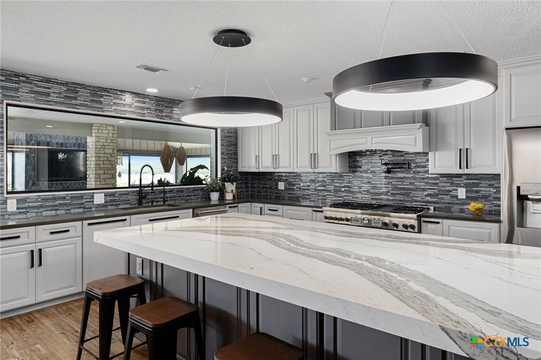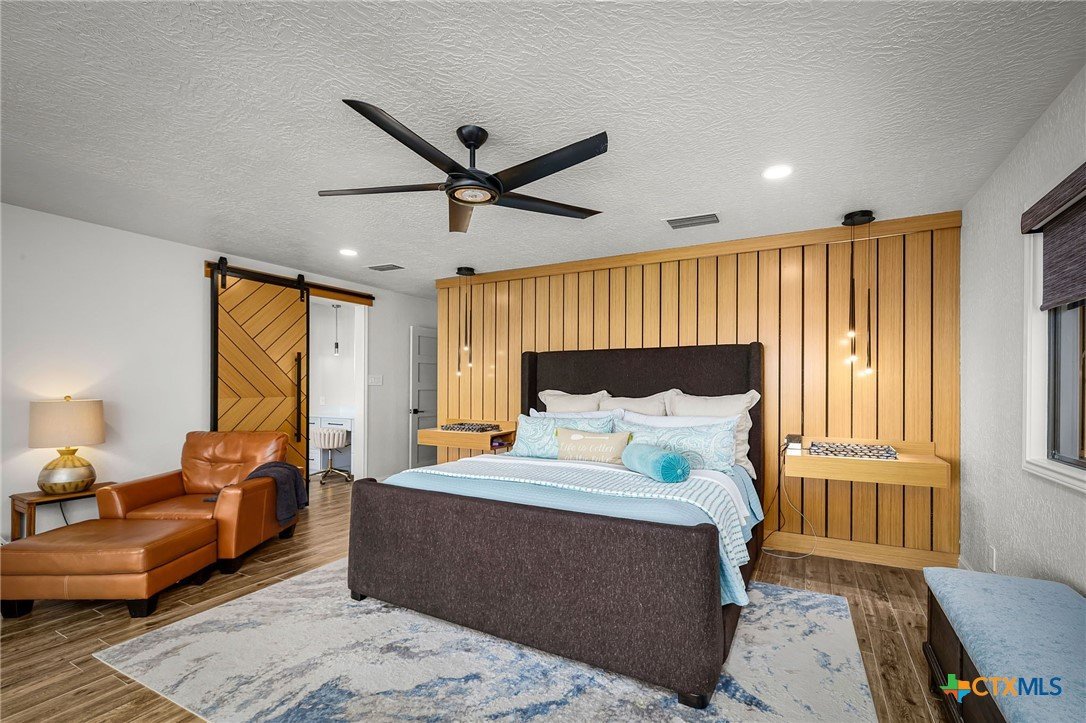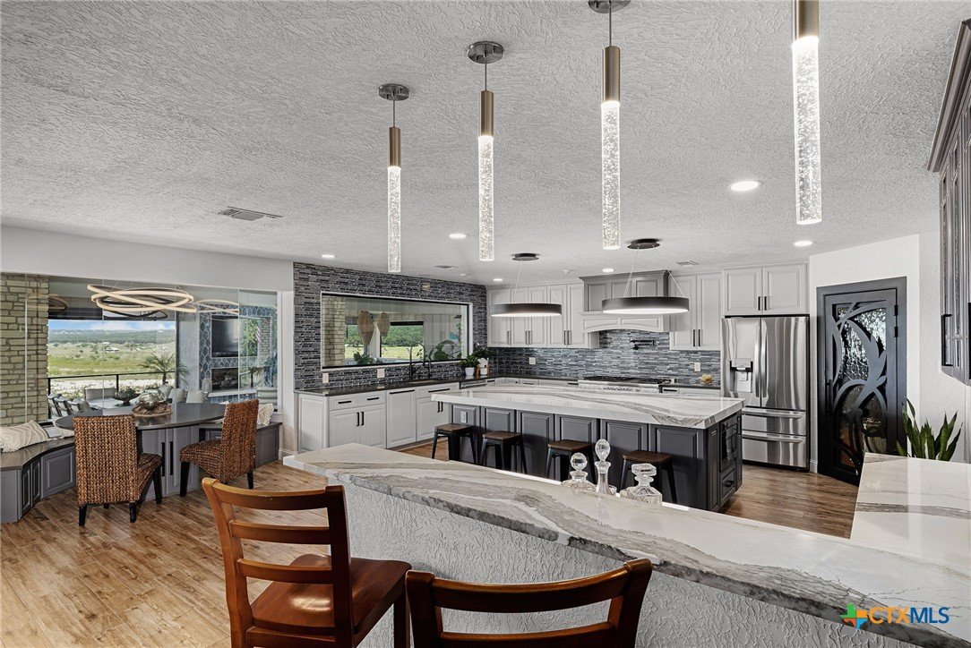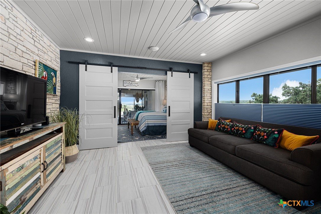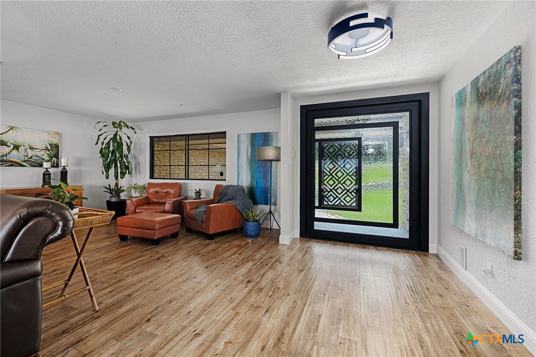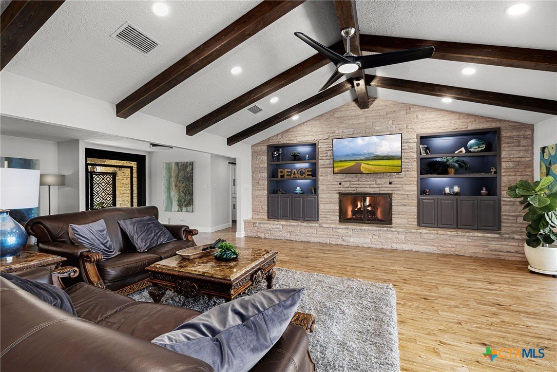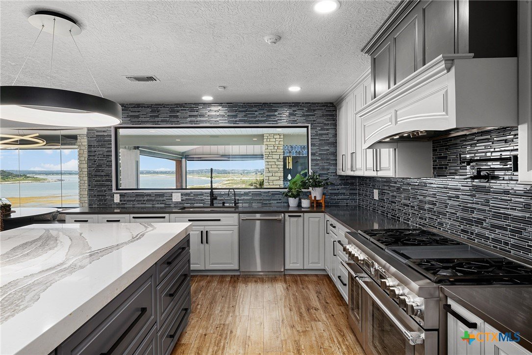 Situated on two acres with 296 feet of Canyon Lake frontage, this rare gem blends luxury living with vibrant lakeside energy. This reimagined mid-century modern home is a masterclass in design and craftsmanship, curated with dramatic architectural features and high-end finishes throughout. Cinematic lake and hill country views greet you through the custom wrought iron pivot door and continue throughout the home. Soaring cathedral ceilings, hammered porcelain floors, and expansive windows create a seamless indoor-outdoor experience. The chef-inspired kitchen stuns with Thermador appliances, a large pantry, and a dramatic 9' x 5.5' Cambria quartz waterfall island. It opens to a spacious living room anchored by a bold chiseled granite fireplace. Step outside to a covered patio and veranda with an outdoor kitchen, perfect for al fresco dining. Enjoy the tiled pool with sweeping lake views or head down to your private shoreline for boating, fishing, or relaxing. A custom pool bathroom adds convenience after lake days. The owner's wing offers serene lake views, private patio access, and spacious walk-in closets. The newly designed en-suite bath is a spa-like retreat with a soaking tub and walk-in shower that overlooks the lake. An attached 4-car garage and 2,000 sq. ft. workshop with three bays provide ample room for auto collections, watercraft, or UTVs. Ask your agent for the full brochure and photo gallery. And on a personal note… As a close friend of the owners, I’ve had the joy of watching this remarkable transformation unfold. This home has been the heart of countless gatherings full of laughter and love. It’s not just a house—it’s a vibe, a feeling, and a place where memories are made. You won’t just want to be here—you’ll feel like you already belong.