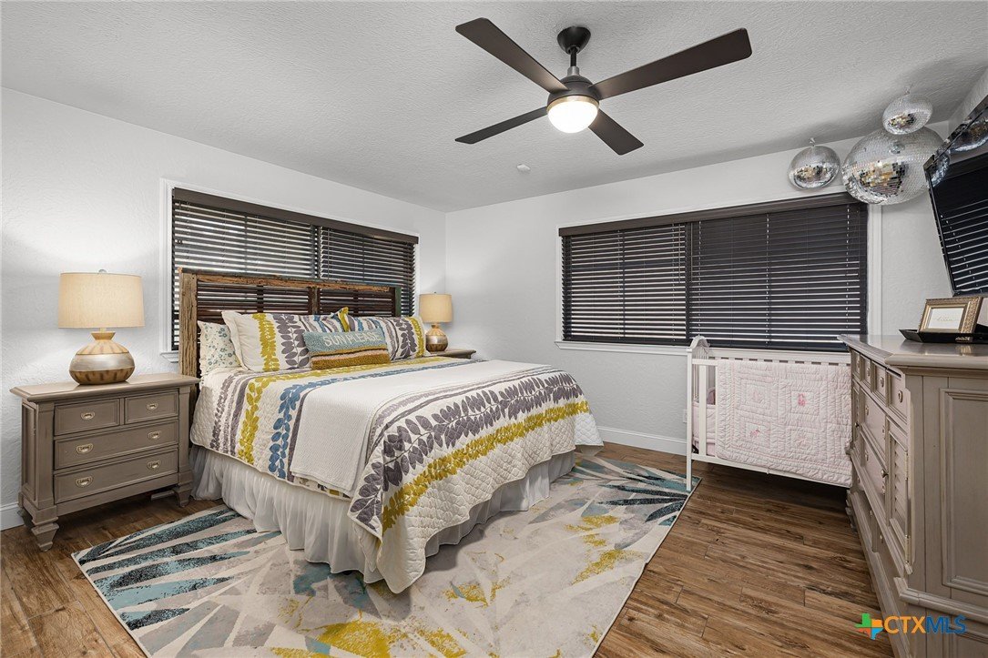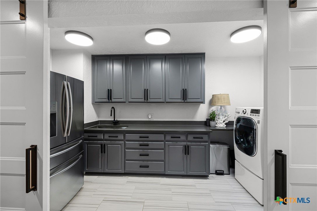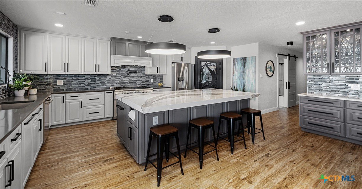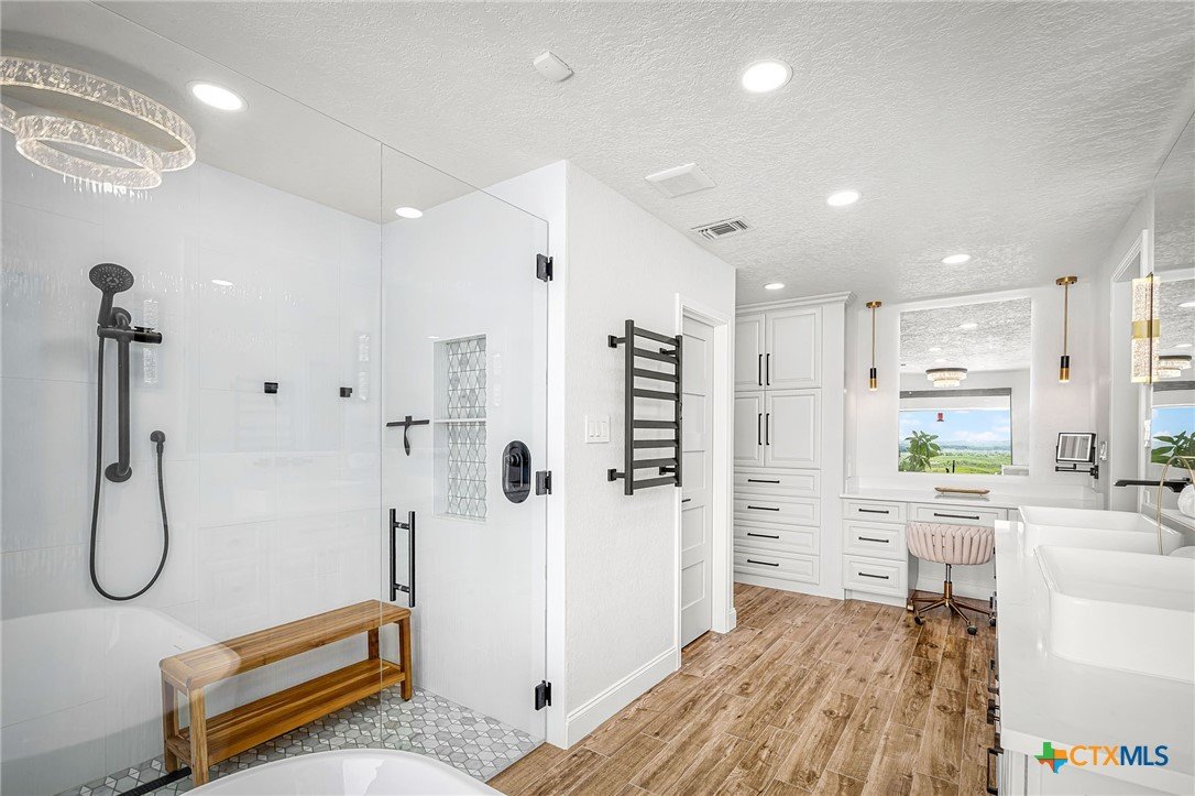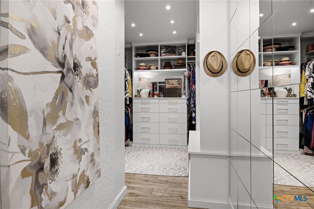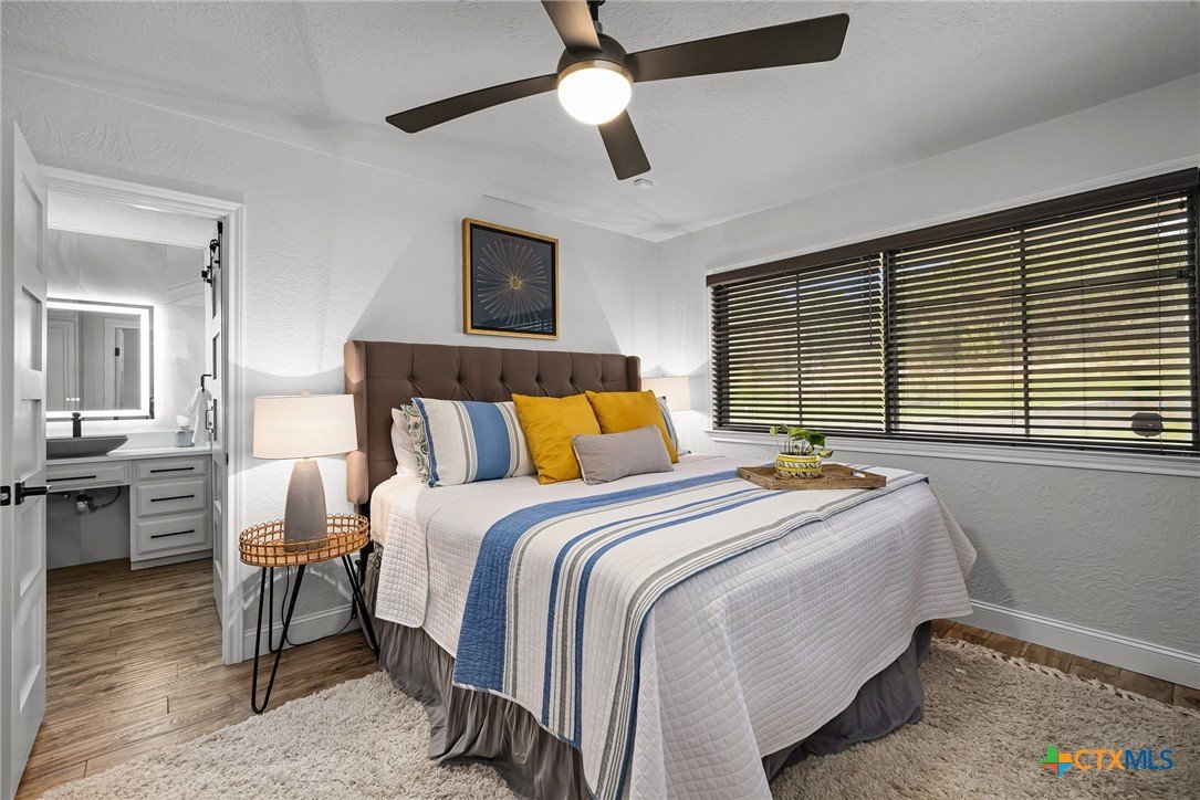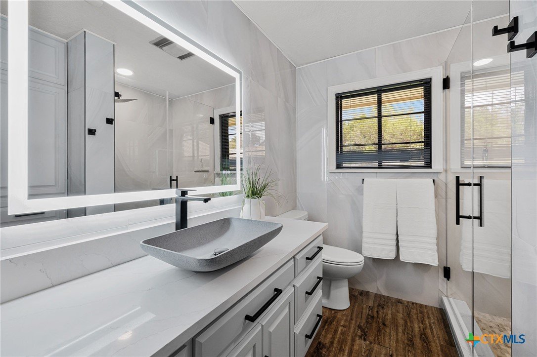 Situated on two acres with 296 feet of Canyon Lake frontage, this rare gem blends luxury living with vibrant lakeside energy. This reimagined mid-century modern home is a masterclass in design and craftsmanship, curated with dramatic architectural features and high-end finishes throughout. Cinematic lake and hill country views greet you through the custom wrought iron pivot door and continue throughout the home. Soaring cathedral ceilings, hammered porcelain floors, and expansive windows create a seamless indoor-outdoor experience. The chef-inspired kitchen stuns with Thermador appliances, a large pantry, and a dramatic 9' x 5.5' Cambria quartz waterfall island. It opens to a spacious living room anchored by a bold chiseled granite fireplace. Step outside to a covered patio and veranda with an outdoor kitchen, perfect for al fresco dining. Enjoy the tiled pool with sweeping lake views or head down to your private shoreline for boating, fishing, or relaxing. A custom pool bathroom adds convenience after lake days. The owner's wing offers serene lake views, private patio access, and spacious walk-in closets. The newly designed en-suite bath is a spa-like retreat with a soaking tub and walk-in shower that overlooks the lake. An attached 4-car garage and 2,000 sq. ft. workshop with three bays provide ample room for auto collections, watercraft, or UTVs. Ask your agent for the full brochure and photo gallery. And on a personal note… As a close friend of the owners, I’ve had the joy of watching this remarkable transformation unfold. This home has been the heart of countless gatherings full of laughter and love. It’s not just a house—it’s a vibe, a feeling, and a place where memories are made. You won’t just want to be here—you’ll feel like you already belong.