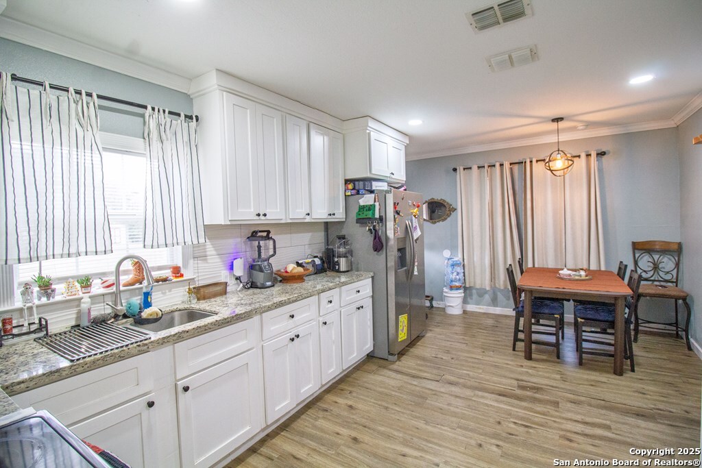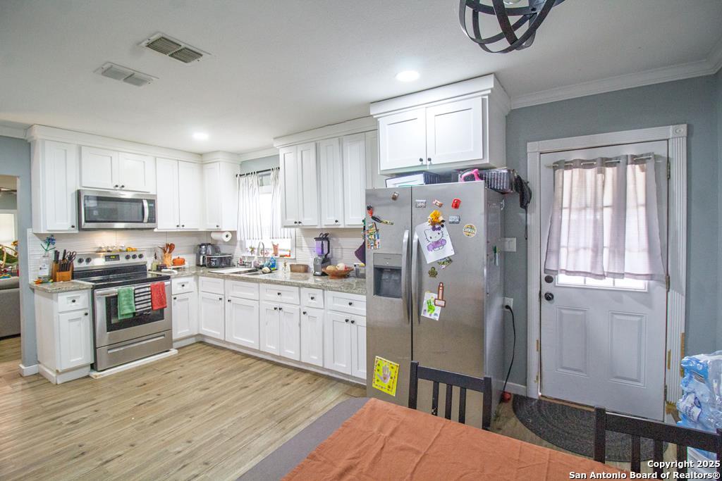 Welcome to 801 E Fannin in Beeville! This charming 3-bedroom, 2-bath cottage-style home is perfectly situated on a desirable corner lot and has been thoughtfully updated throughout, making it completely ready for a new homeowner. The exterior features durable cement fiber siding, a newer roof, and updated windows for long-lasting peace of mind. Step inside to find beautifully appointed interiors with luxury vinyl plank flooring, decorator colors, and a warm modern feel. The home offers three generously sized bedrooms and two updated bathrooms, one of which is designed in a convenient Jack & Jill style. The kitchen is a true showstopper, showcasing white cabinetry, granite countertops, and a stainless steel double sink with disposal. It also comes fully equipped with a stainless steel refrigerator with ice-maker, free-standing range, and microwave, and to make the move-in even easier, the sellers are including a washer and dryer. All of this sits on an expansive 100x140 lot, providing ample space for entertaining, gardening, or enjoying outdoor fun with family and friends. With major updates already completed and modern finishes throughout, this cozy yet stylish home offers both charm and functionality. Don't miss your chance to call this delightful Beeville home yours-schedule your private showing today!; Original MLS#: 113491; Deed Restrictions: ; Features: Porch-Front; Gas Co: None; Home Warranty: No; Land Dimensions: 100X140; Property Condition: Excellent; Roof: Shingle; Room List: Kitchen/Dining; Showing: Appointment Needed; Water District: Yes; Water Heater: Electric; Windows: Thermal, Vinyl; Zoning: Residential