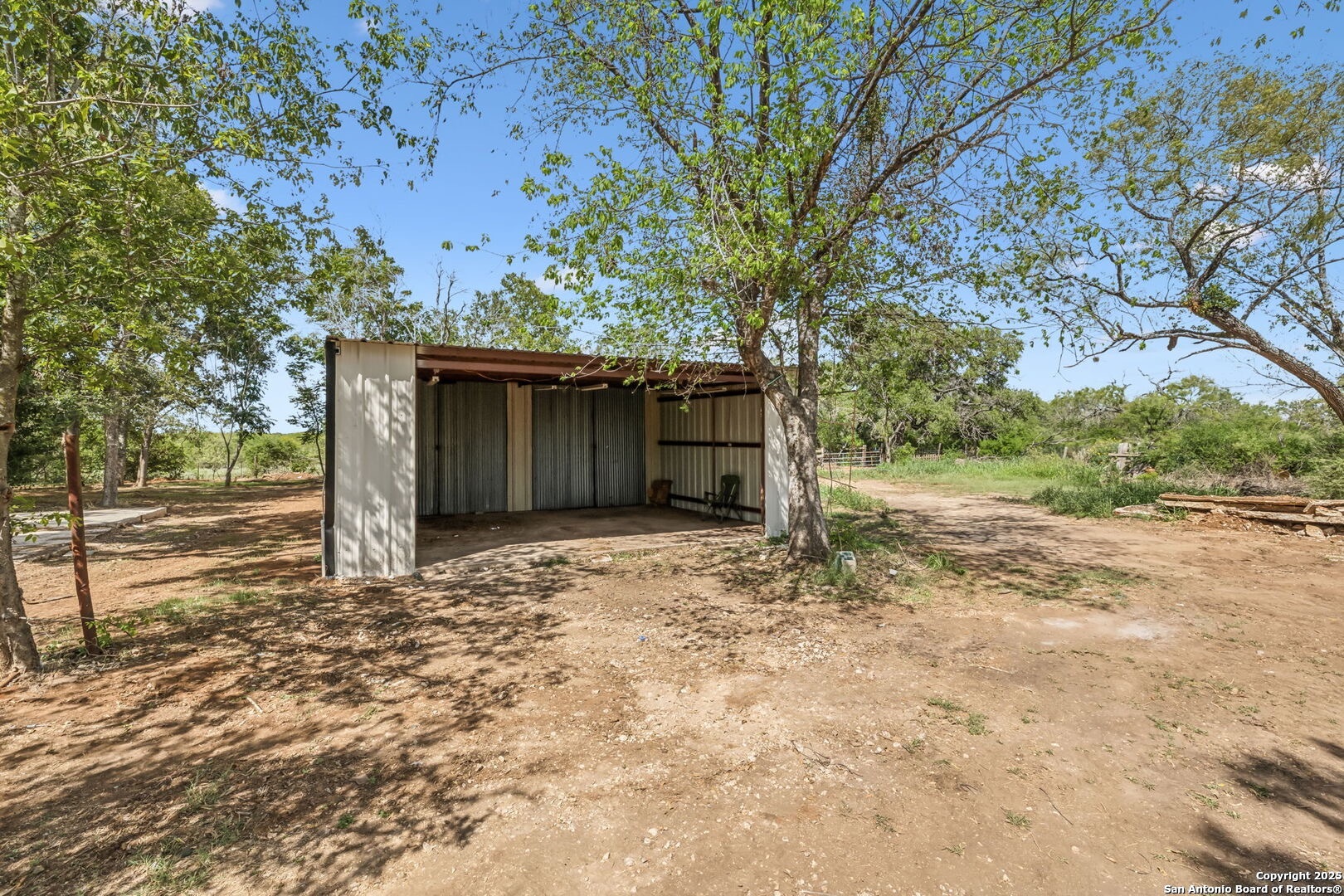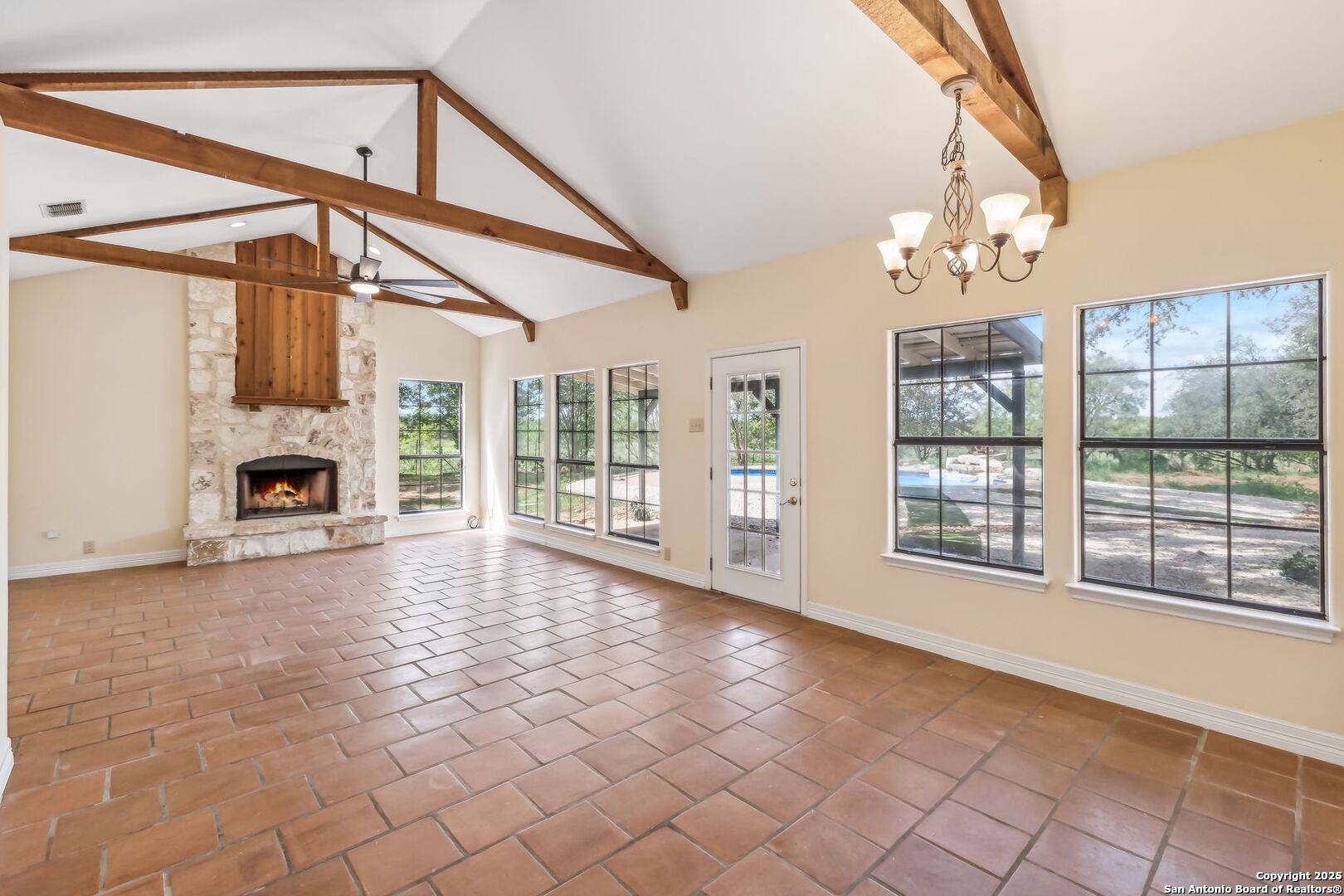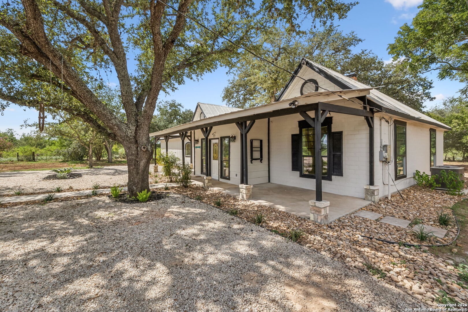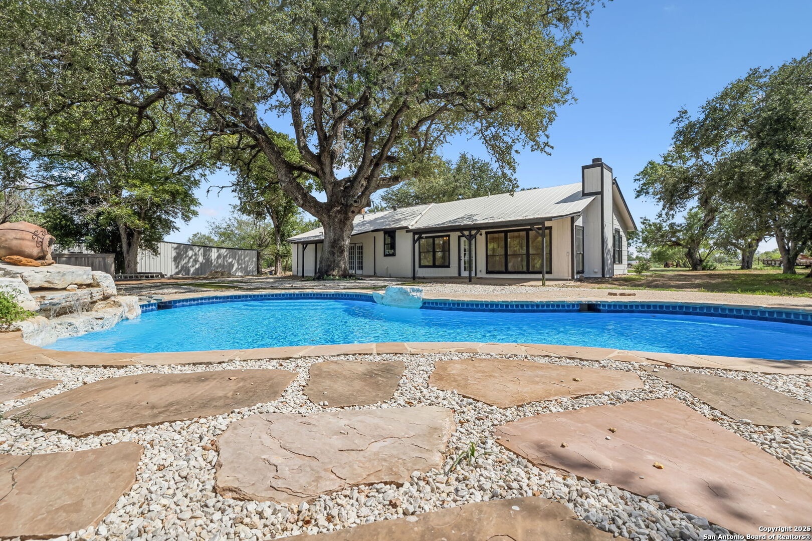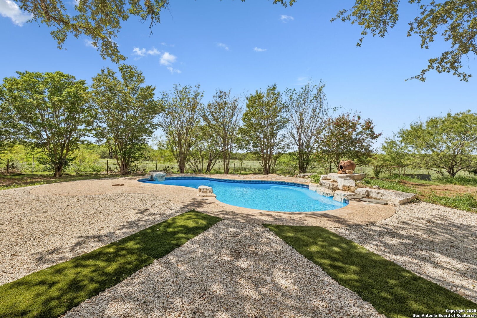 Spread across 13.14 acres, this property provides an expansive countryside setting with mature trees offering shade and privacy. The exterior of the home features a welcoming front porch and ample space to enjoy the surrounding views. Inside, you are greeted by a spacious living room highlighted by vaulted ceilings with exposed beams, a wood-burning fireplace, and convenient outdoor access. Throughout the home, Saltillo and ceramic tile flooring add a classic touch. The kitchen is outfitted with granite countertops, white cabinetry, and space for a sunny dining area. The primary bedroom offers a trey ceiling, fresh carpeting, and a private bath complete with dual granite vanities and a large shower. Step outside to a covered patio that overlooks a pool, perfect for entertaining or relaxing while enjoying the tranquil views. The property also includes an oversized detached 2-car garage, and a separate storage shed, providing ample space for parking and projects. This property invites the opportunity to create your own private retreat in a natural, serene setting.