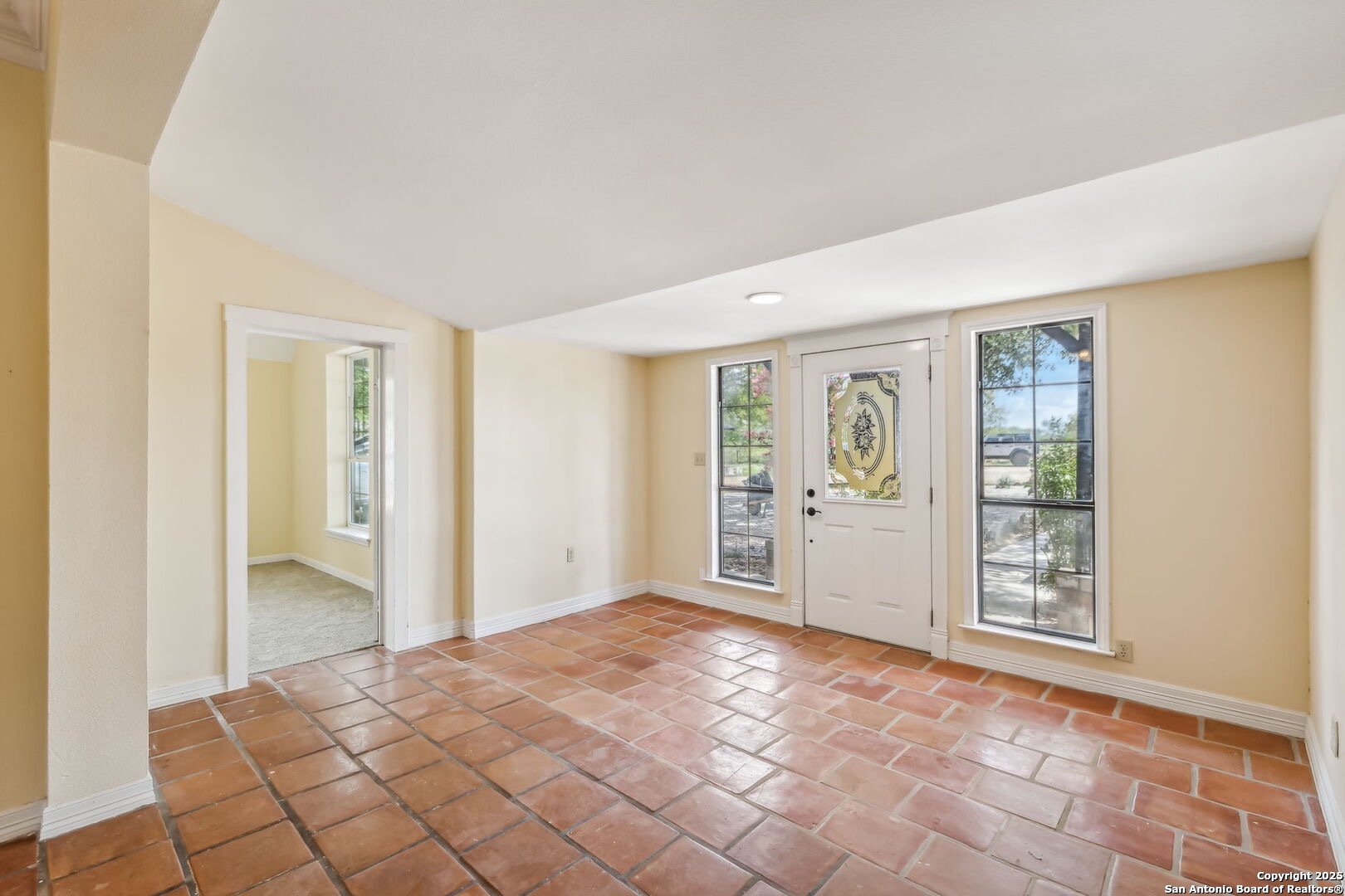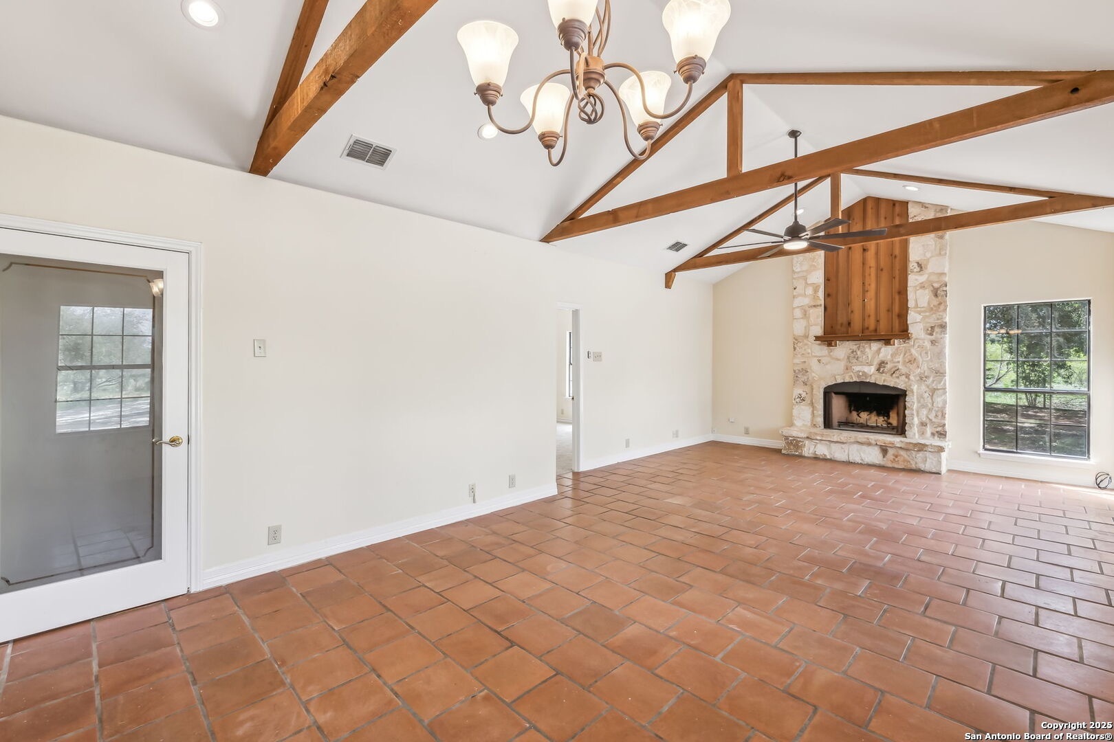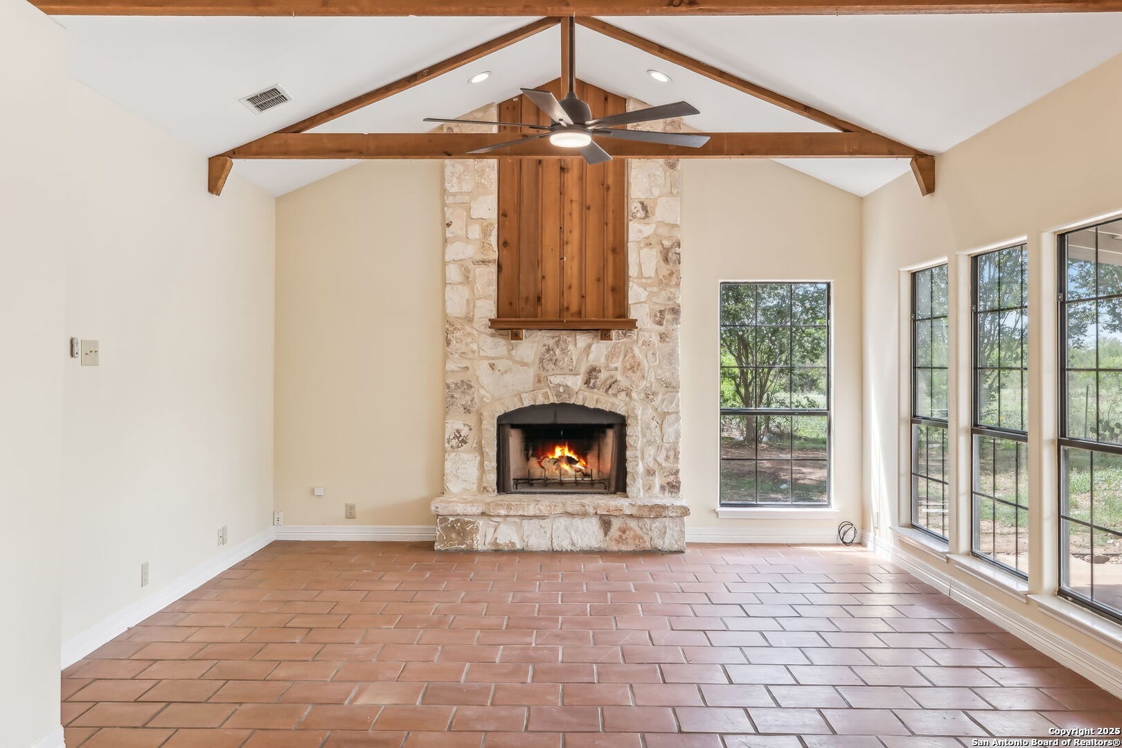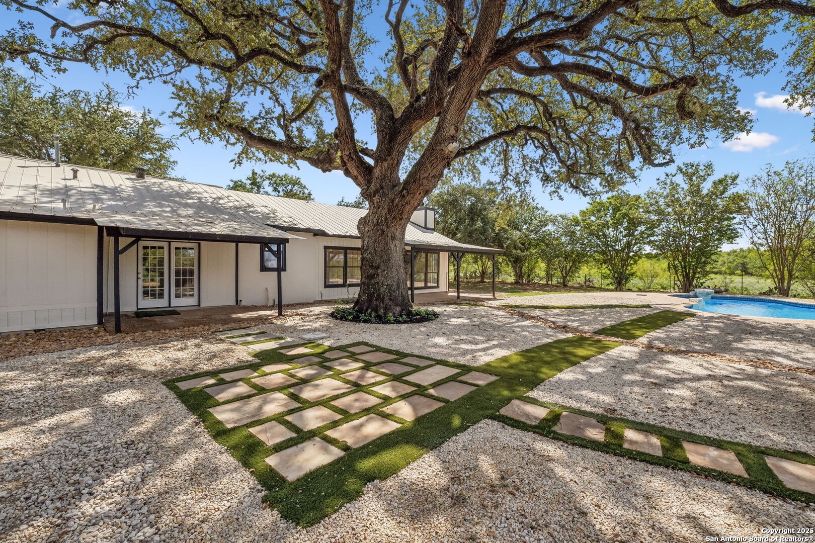 Spread across 13.14 acres, this property provides an expansive countryside setting with mature trees offering shade and privacy. The exterior of the home features a welcoming front porch and ample space to enjoy the surrounding views. Inside, you are greeted by a spacious living room highlighted by vaulted ceilings with exposed beams, a wood-burning fireplace, and convenient outdoor access. Throughout the home, Saltillo and ceramic tile flooring add a classic touch. The kitchen is outfitted with granite countertops, white cabinetry, and space for a sunny dining area. The primary bedroom offers a trey ceiling, fresh carpeting, and a private bath complete with dual granite vanities and a large shower. Step outside to a covered patio that overlooks a pool, perfect for entertaining or relaxing while enjoying the tranquil views. The property also includes an oversized detached 2-car garage, and a separate storage shed, providing ample space for parking and projects. This property invites the opportunity to create your own private retreat in a natural, serene setting.