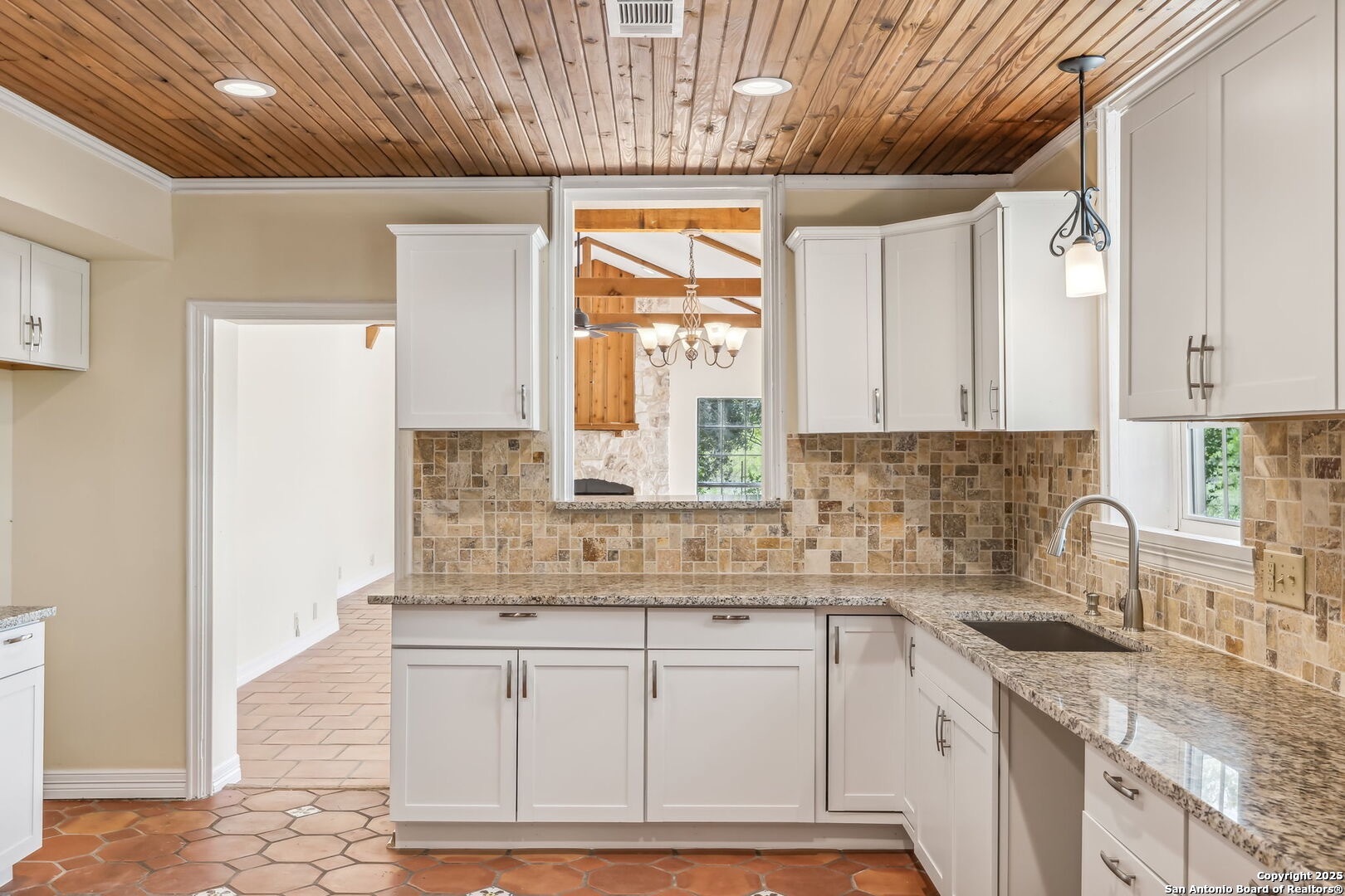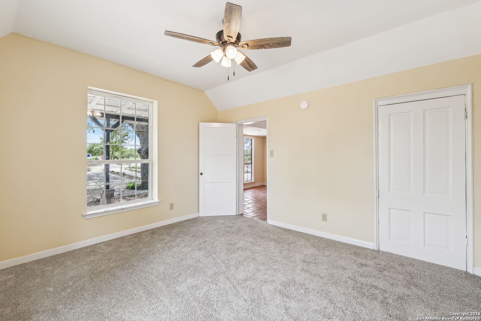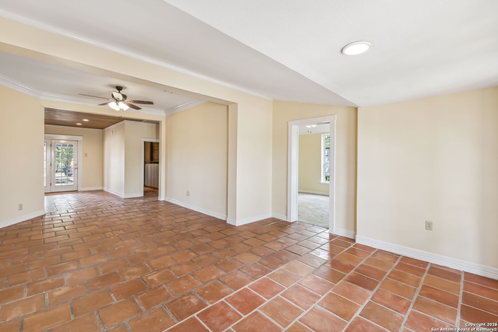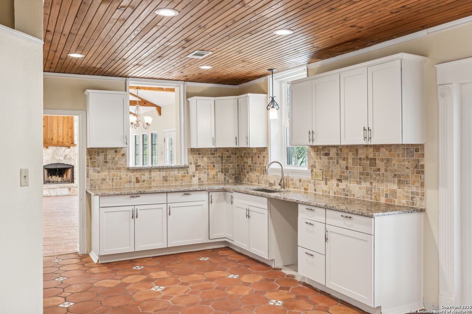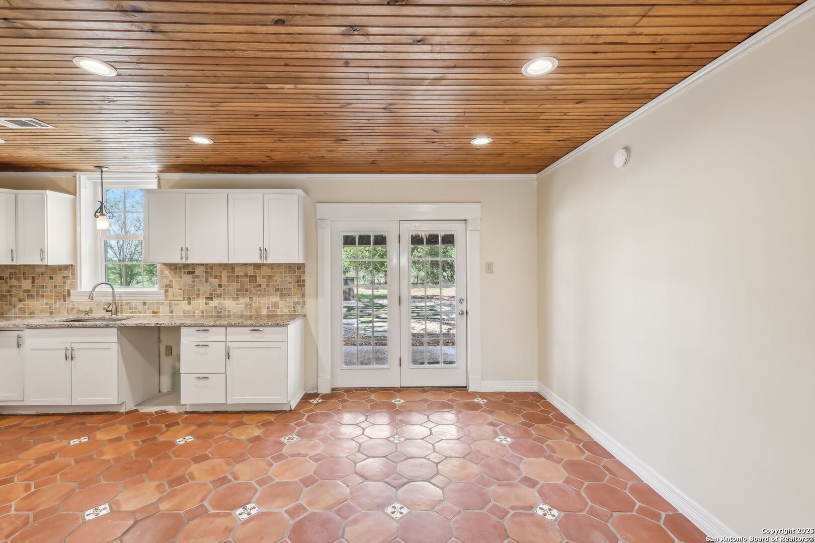 Spread across 13.14 acres, this property provides an expansive countryside setting with mature trees offering shade and privacy. The exterior of the home features a welcoming front porch and ample space to enjoy the surrounding views. Inside, you are greeted by a spacious living room highlighted by vaulted ceilings with exposed beams, a wood-burning fireplace, and convenient outdoor access. Throughout the home, Saltillo and ceramic tile flooring add a classic touch. The kitchen is outfitted with granite countertops, white cabinetry, and space for a sunny dining area. The primary bedroom offers a trey ceiling, fresh carpeting, and a private bath complete with dual granite vanities and a large shower. Step outside to a covered patio that overlooks a pool, perfect for entertaining or relaxing while enjoying the tranquil views. The property also includes an oversized detached 2-car garage, and a separate storage shed, providing ample space for parking and projects. This property invites the opportunity to create your own private retreat in a natural, serene setting.