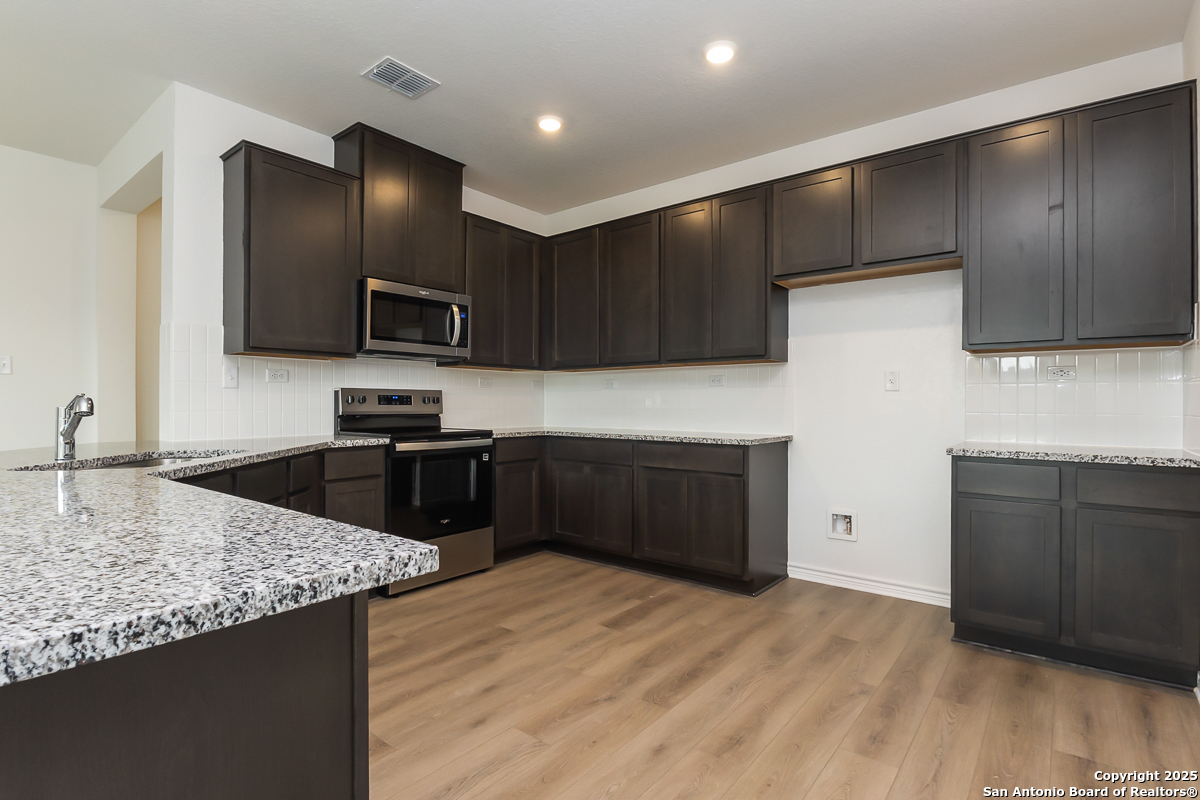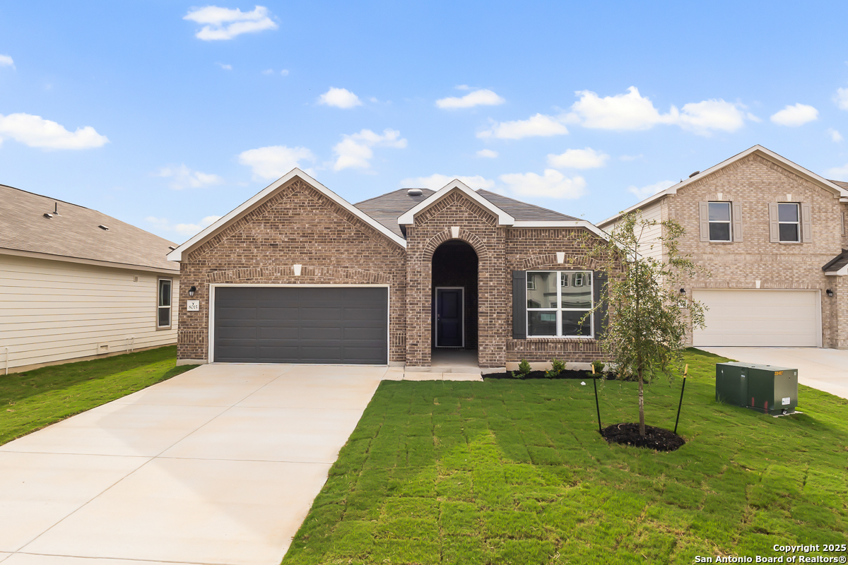 This inviting home boasts 9-ft. first-floor ceilings, creating a bright and open atmosphere. The stylish kitchen features Whirlpool stainless steel appliances, Woodmont Dakota Shaker panel 42-in. upper cabinets, a Daltile tile backsplash, and an extended breakfast bar. The primary bath offers a raised vanity, upgraded cabinets, and a 42-in. garden tub/shower with a Daltile tile surround. Elegant touches include GenerationsTM lighting fixtures, a Carrara-style entry door, Kwikset Polo knob interior hardware, and durable vinyl plank flooring in the kitchen, great room, and bathrooms. Additional highlights include a wireless security system, an automatic sprinkler system, and a fully sodded yard for easy outdoor maintenance.