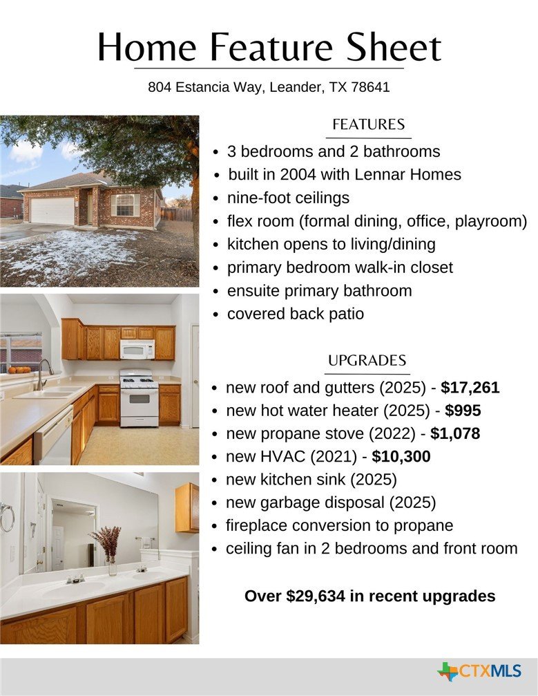 Welcome to 804 Estancia Way, a well-cared-for home in the heart of Leander that offers an easy, walkable lifestyle and long-term value. This 3-bedroom, 2-bath home features 1,519 square feet of comfortable living space in a neighborhood with no HOA and a low tax rate just over 2%, helping keep monthly payments more manageable than many nearby communities. One of the best parts of this location is how much is close by, an elementary school, multiple playgrounds, shopping, dining, and some of Leander’s most loved outdoor spaces are all within walking distance. Benbrook Ranch Park and Devine Lake Park nearby offer trails, little league and adult baseball fields, a skate park, disc golf, fishing, and walking trails. Inside, the layout is practical and flexible. The formal dining area works well as a home office, playroom, or homeschool space. The living area features a cozy gas fireplace, perfect for cool evenings and especially appreciated after the recent ice storm, creating a warm, inviting place to gather and unwind. The kitchen includes an open layout, gas stove, and the refrigerator, washer, and dryer will stay with the home. Out back, a covered patio and fenced yard with mature shade trees offer a comfortable place to relax, entertain, or enjoy a quiet morning coffee. The home has been thoughtfully maintained, with major system updates already completed, including a new roof and gutters (2025), new hot water heater (2025), HVAC approximately 5 years old, and newer gas appliances. With these larger items already taken care of, the next owner has the opportunity to update cosmetic finishes over time and truly make the home their own. Located just minutes from shopping, dining, and the 183 Toll Road, this home offers a convenient commute to Austin while still enjoying a strong sense of community. Whether you’re buying your first home, downsizing, or looking for a smart investment, 804 Estancia Way is a solid opportunity in a great Leander location.