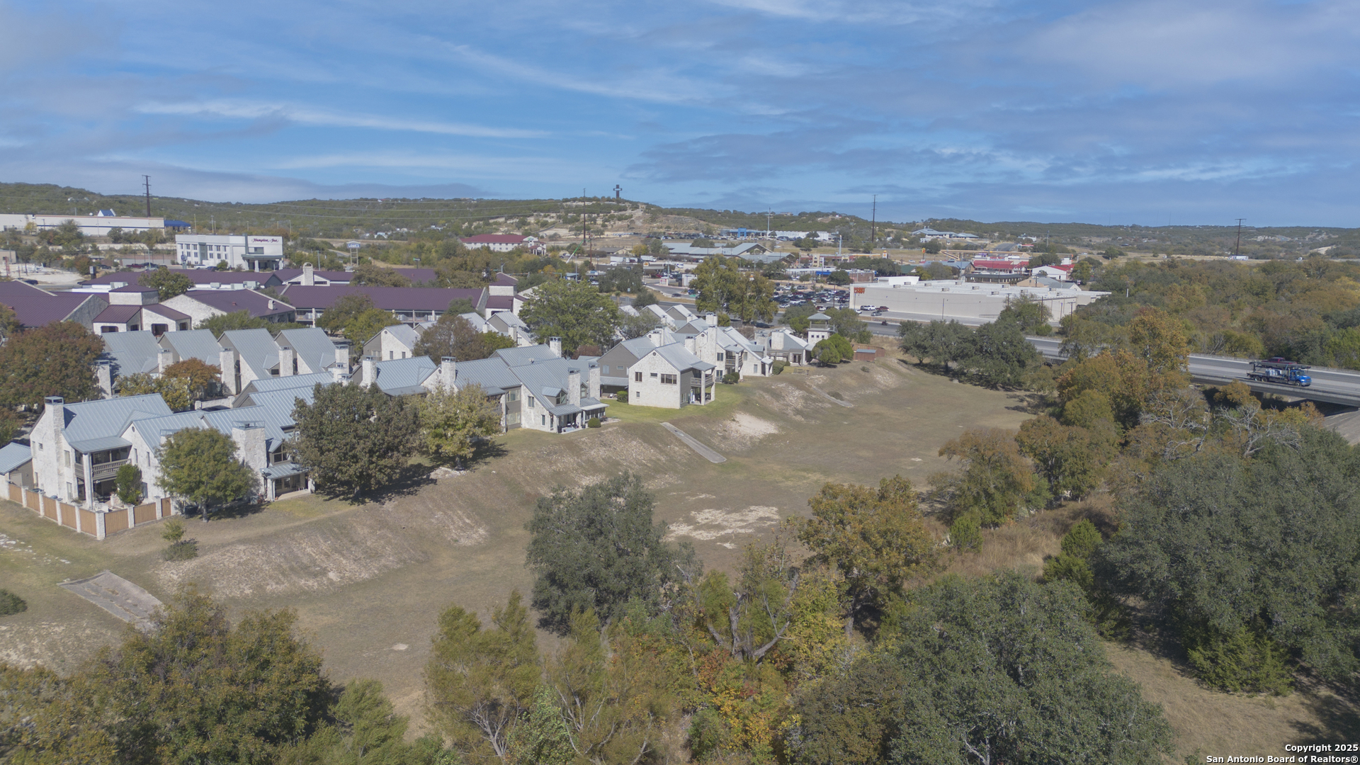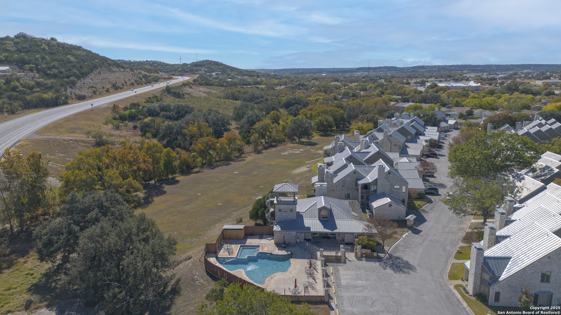 Welcome to this inviting 2-bedroom, 2.5-bath condo in the desirable Quinlan Crossing community, offering an additional office that can easily function as a third bedroom, plus a convenient two-car garage. Its prime location places you just minutes from I-10, Schreiner University, the Guadalupe River, and numerous dining and shopping options. The interior layout is warm and welcoming, featuring a kitchen that flows into the dining space and a spacious living room. Step outside to enjoy views of the greenspace and creek from the covered patio, or unwind on the private deck off the primary suite. Recent improvements include a new upstairs AC installed in 2024 and a new metal roof scheduled for installation in December 2025, adding comfort and long-term value. The monthly HOA covers water, sewer, trash service, exterior upkeep, pool and clubhouse maintenance, and exterior insurance-providing a low-maintenance, lock-and-leave lifestyle. Don't miss this rare opportunity.