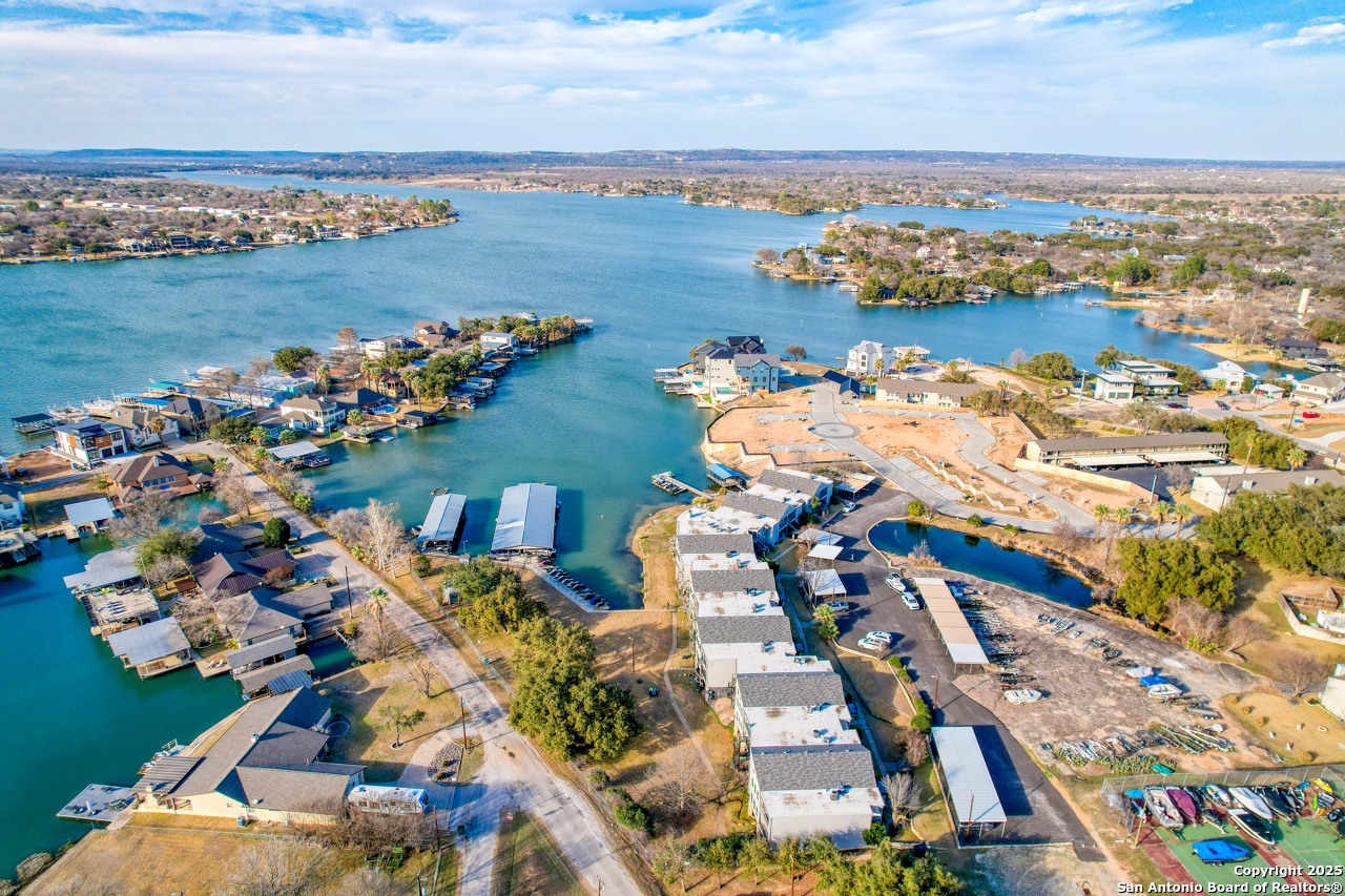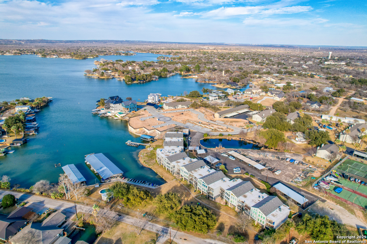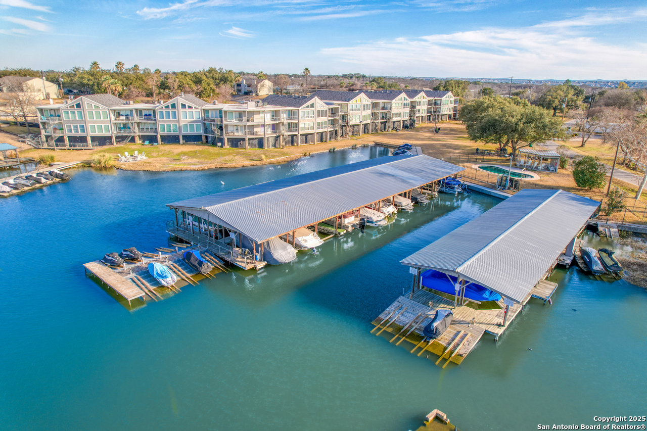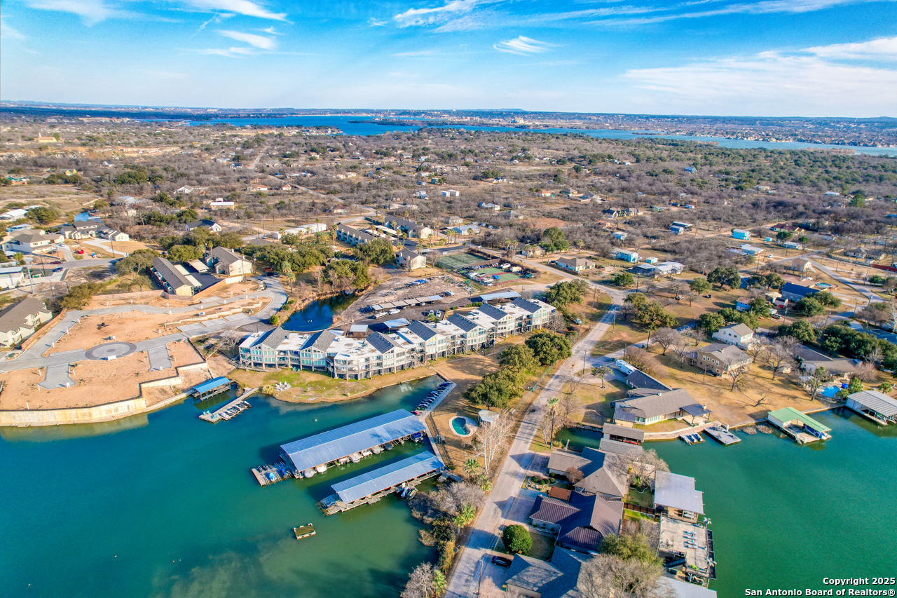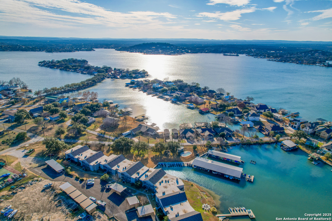 Welcome to low maintenance Lake Life on Lake LBJ! This beautiful unit has 3 bedrooms, 2 bathrooms, laundry/mud room with 2nd Fridge/Freezer, kitchen with a breakfast bar, and an open dining and living space. The vaulted ceilings give added charm and make the space feel open and airy. There is a reverse osmosis water system installed at the sink & ice maker. 2 sets of doors open to a lovely balcony and the spiral staircase leads directly below to an additional storage space for kayaks, lake toys, fishing gear and tools. Across the lawn, you'll find the refreshing pool as well as the dock and marina.There is also a wonderful smoker and grilling area for community use. This unit is completely move in ready and is being sold fully furnished minus a few of items. All appliances convey. This is the best deal on the lake for a turn-key fully furnished property that includes a deeded boat slip/lift and PWC ramp. This boutique condo community is a rare gem and the set up can't be beat!