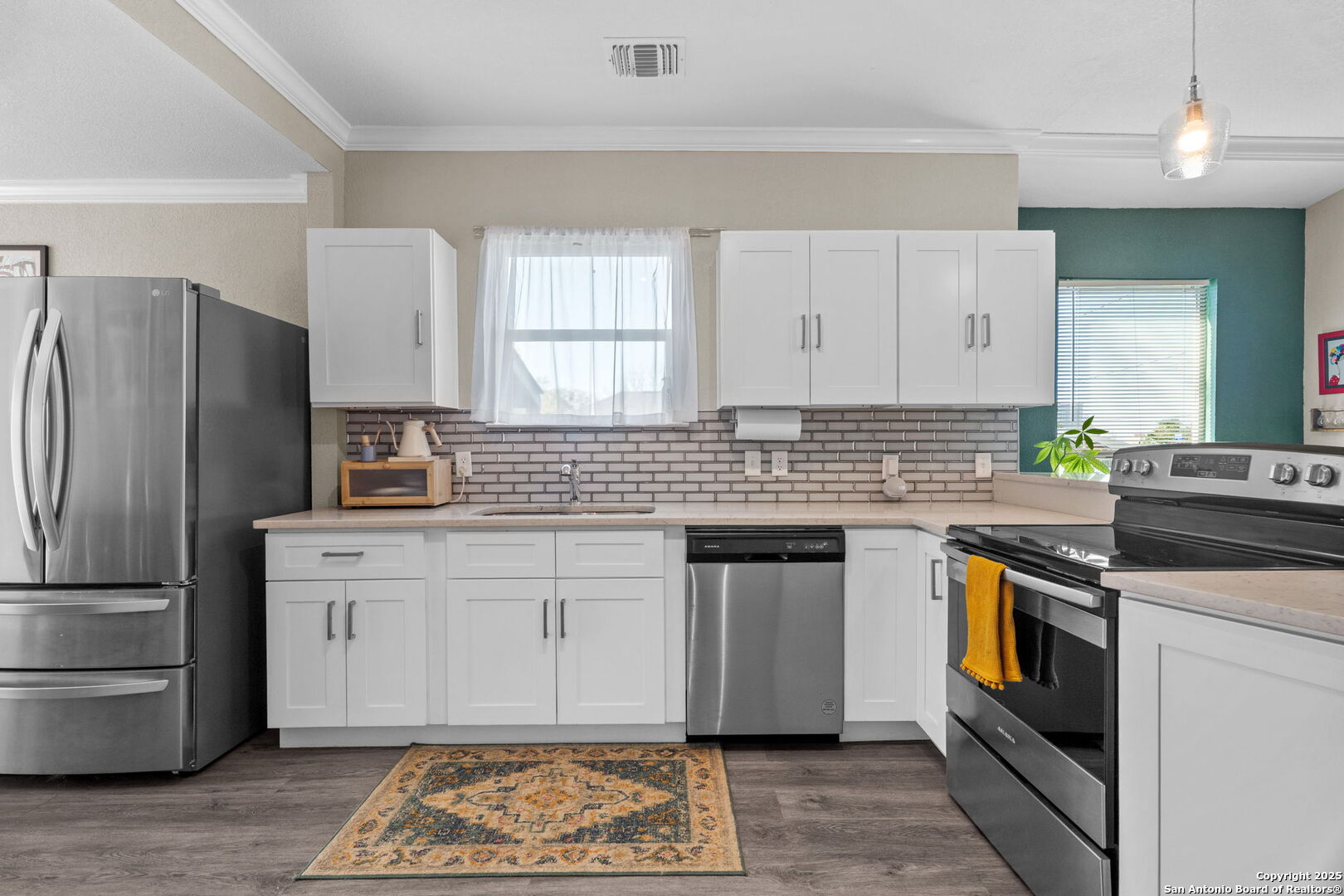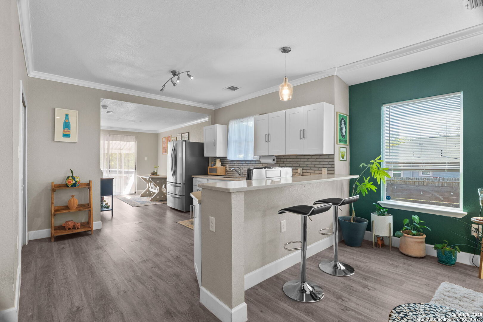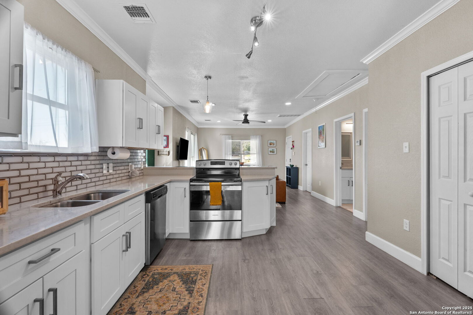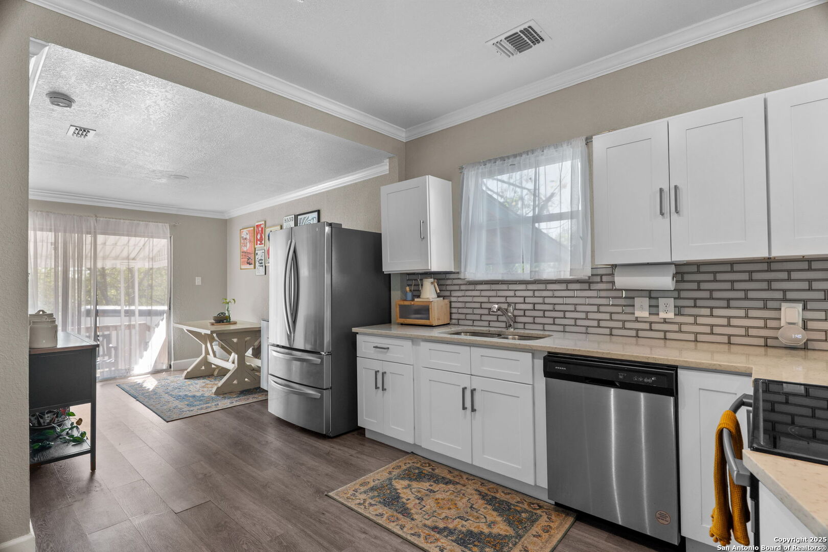 Close to Riverwalk and the Alamodome. This charming home has a lot to offer and is a must see! The exterior and interior has an added modern touch. This open floorplan is nice for entertaining and equipped with stainless steel appliances. The main bathroom as a walk-in shower with a glass door. Enjoy the peaceful view of the city lights and Alamodome from the living room.