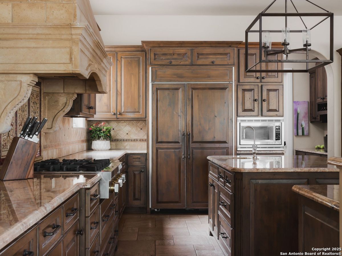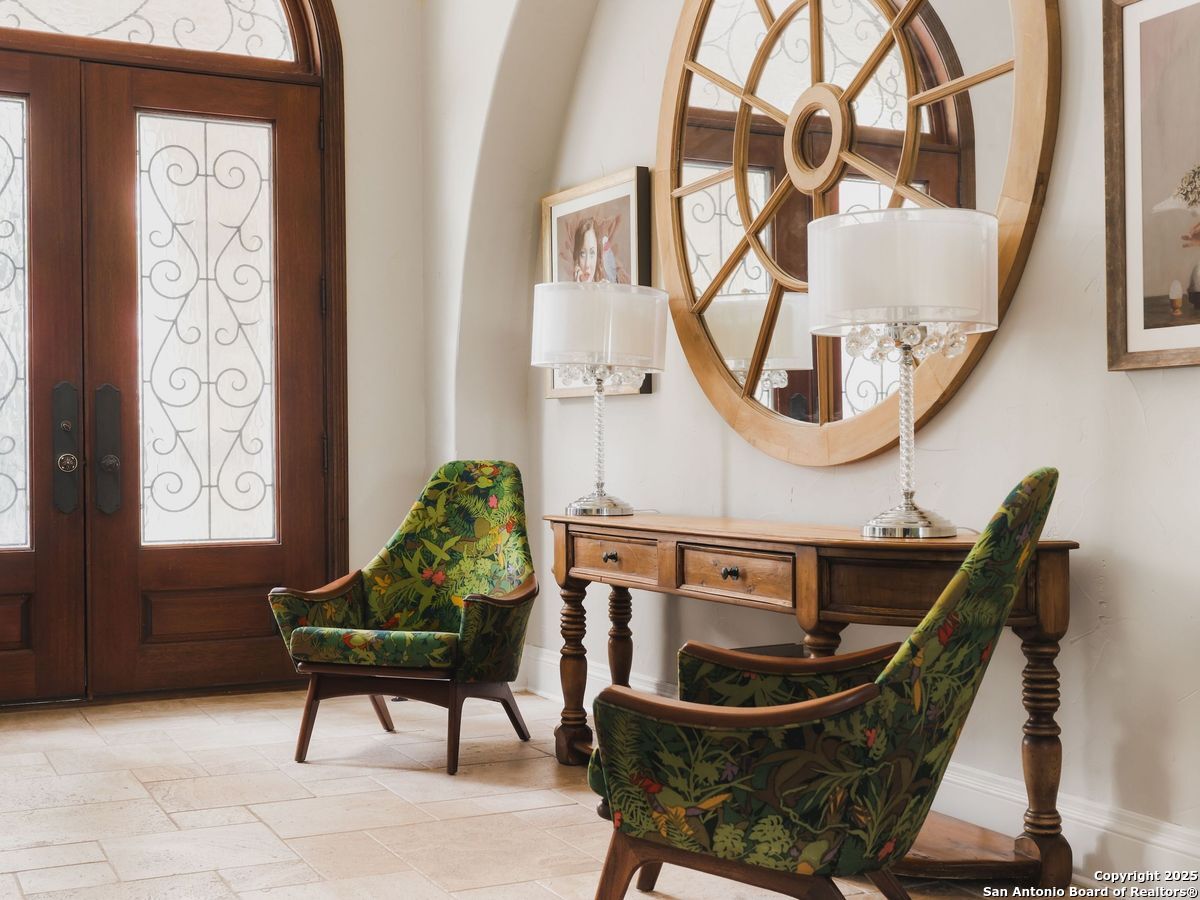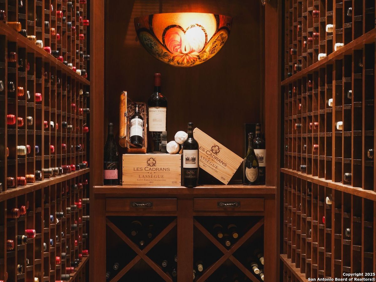 Set amidst nearly half an acre of lush, park-like grounds, this Terrell Hills estate is a masterpiece of timeless elegance and sophistication. Every element of this residence has been meticulously curated to exude style and luxury, creating an ambiance of truly refined living. Upon entry, the home's grandeur immediately unfolds. Lavish travertine and rich hardwood floors are complemented by exquisite custom millwork, establishing a foundation for an unparalleled lifestyle. The gourmet kitchen is outfitted with top-of-the-line appliances and seamlessly flows into inviting living areas defined by soaring ceilings and lush, verdant views. The main level showcases exceptional amenities, including a well-appointed guest suite with a full bath, a phenomenal media room complete with wet bar and outdoor access, an elevator, a climate-controlled 1,000-bottle wine cellar, and a spacious mudroom. In addition, the downstairs level features a fully equipped guest apartment with its own living room, bedroom, full bathroom, and kitchen-ideal for long-term guests or extended family. Upstairs, the elegant primary suite serves as a private sanctuary, boasting dual walk-in closets, a dedicated office, a private living space with a fireplace, and an expansive patio overlooking the breathtaking grounds. A spa-inspired bath completes the suite, offering the ultimate retreat for relaxation and rejuvenation. In addition, the upstairs features another spacious living room plus three generously sized bedrooms with ensuite bathrooms, ensuring comfort and privacy. Outdoors, the resort-style grounds feature a covered patio, a fully equipped outdoor kitchen, and a pool accented by captivating water features. A gated entrance and parking court provide both security and convenience, while a separate, secondary structure further enhances the property, ideal for an exercise studio, hobby space, or additional storage, tailored to suit the most discerning needs. In every respect, this Mediterranean-style estate represents the pinnacle of refined living, blending timeless architecture, luxurious amenities, and an incomparable location to deliver an extraordinary lifestyle experience.