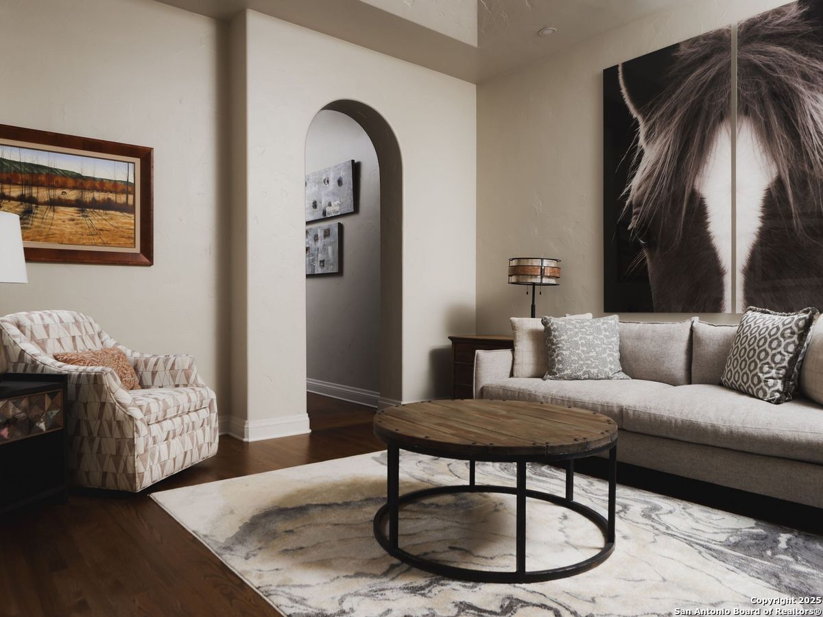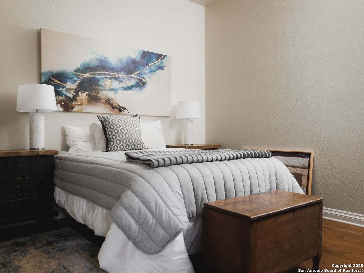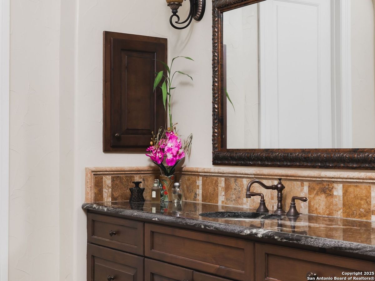 Set amidst nearly half an acre of lush, park-like grounds, this Terrell Hills estate is a masterpiece of timeless elegance and sophistication. Every element of this residence has been meticulously curated to exude style and luxury, creating an ambiance of truly refined living. Upon entry, the home's grandeur immediately unfolds. Lavish travertine and rich hardwood floors are complemented by exquisite custom millwork, establishing a foundation for an unparalleled lifestyle. The gourmet kitchen is outfitted with top-of-the-line appliances and seamlessly flows into inviting living areas defined by soaring ceilings and lush, verdant views. The main level showcases exceptional amenities, including a well-appointed guest suite with a full bath, a phenomenal media room complete with wet bar and outdoor access, an elevator, a climate-controlled 1,000-bottle wine cellar, and a spacious mudroom. In addition, the downstairs level features a fully equipped guest apartment with its own living room, bedroom, full bathroom, and kitchen-ideal for long-term guests or extended family. Upstairs, the elegant primary suite serves as a private sanctuary, boasting dual walk-in closets, a dedicated office, a private living space with a fireplace, and an expansive patio overlooking the breathtaking grounds. A spa-inspired bath completes the suite, offering the ultimate retreat for relaxation and rejuvenation. In addition, the upstairs features another spacious living room plus three generously sized bedrooms with ensuite bathrooms, ensuring comfort and privacy. Outdoors, the resort-style grounds feature a covered patio, a fully equipped outdoor kitchen, and a pool accented by captivating water features. A gated entrance and parking court provide both security and convenience, while a separate, secondary structure further enhances the property, ideal for an exercise studio, hobby space, or additional storage, tailored to suit the most discerning needs. In every respect, this Mediterranean-style estate represents the pinnacle of refined living, blending timeless architecture, luxurious amenities, and an incomparable location to deliver an extraordinary lifestyle experience.