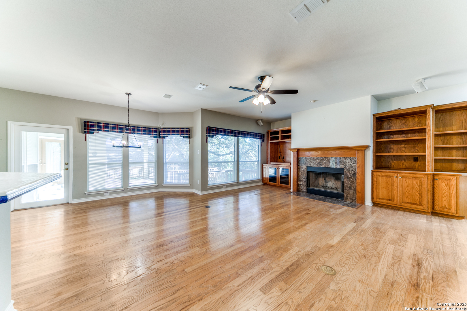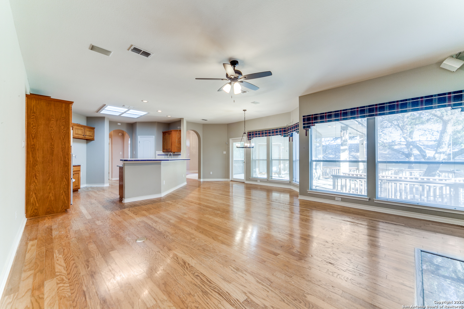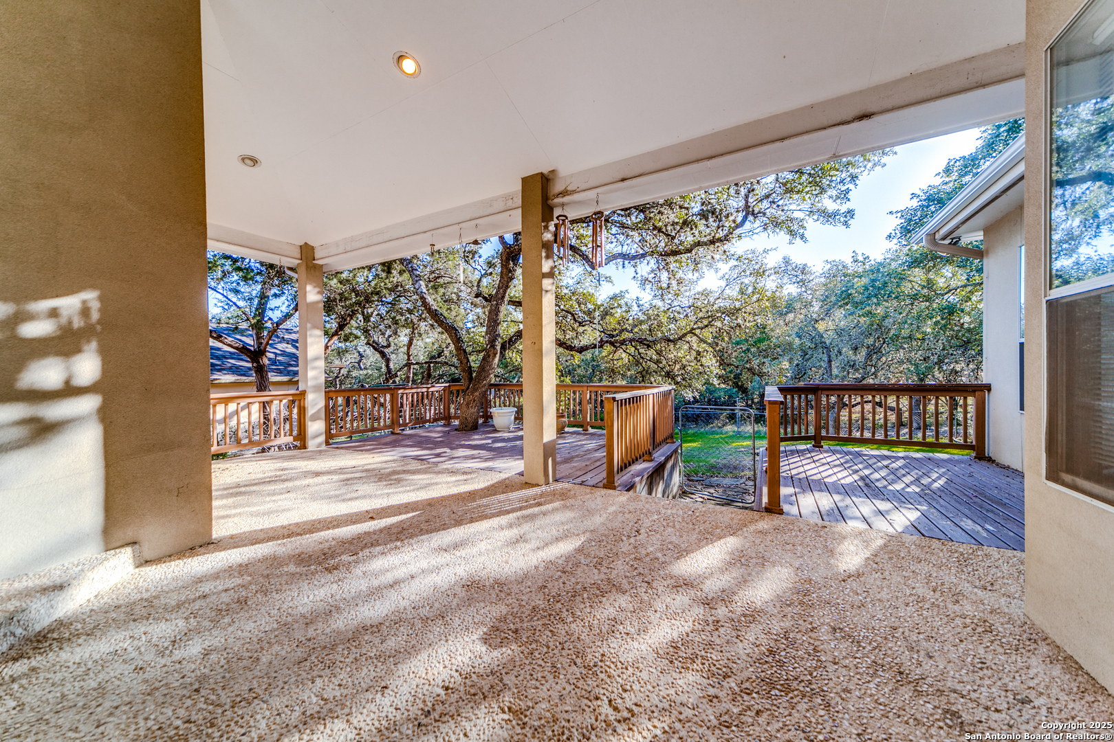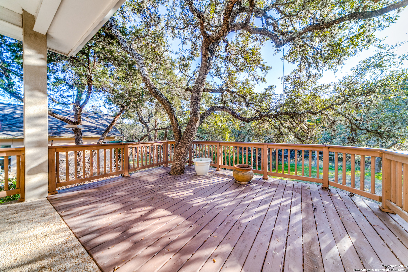 Welcome to this 1-story home located in the highly sought-after Timberwood Park neighborhood. Boasting 4 spacious bedrooms and 3 full bathrooms, this home offers an ideal layout for both family living and entertaining. As you enter, you're greeted by a cozy sitting area and a formal dining room. The heart of the home is the open-concept kitchen, which features double ovens, a walk-in pantry, and granite countertops. The adjacent breakfast room offers a casual dining space, seamlessly connecting to the kitchen. The expansive living room, with its wood-burning fireplace, serves as a focal point of the home, providing a comfortable and relaxing space for family gatherings or quiet evenings. The private primary suite is complete with direct access to the back patio, an en-suite bathroom with a separate tub and walk-in shower, dual vanities, and a large walk-in closet. The second bedroom features its own full bathroom, while the 3rd and 4th bedrooms share a well-appointed bathroom. Step outside to enjoy the covered patio and additional decking, perfect for outdoor dining, relaxation, or entertaining. This home has been thoughtfully updated with a brand new HVAC system, roof, gutters, water heater, and carpeting, all replaced at the end of 2023 or in 2024. In addition, there is a separate laundry room and an attached 2-car garage. This home combines comfort, style, and functionality in one of the most desirable areas of Timberwood Park.