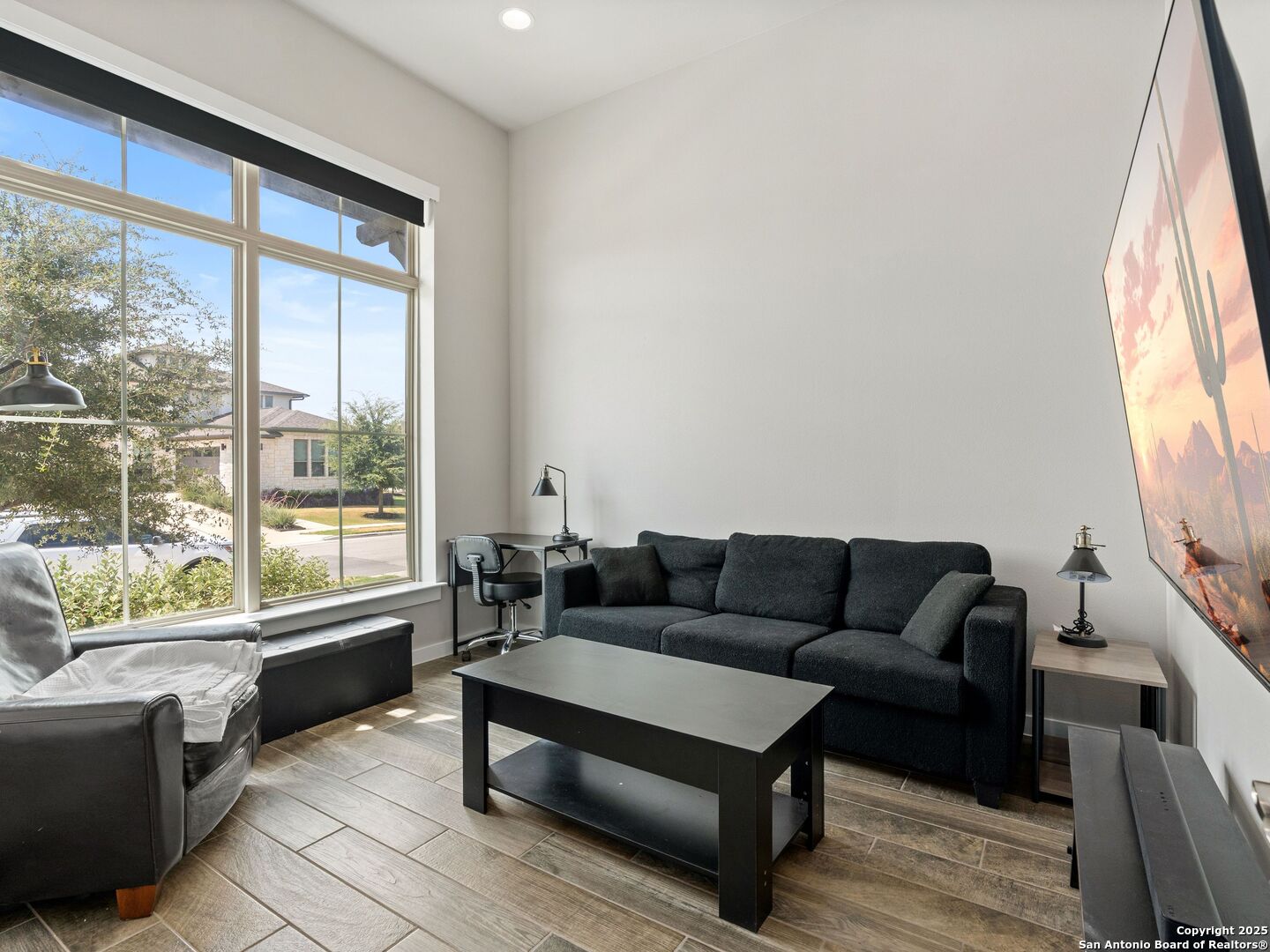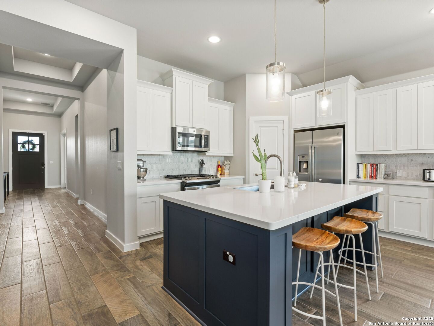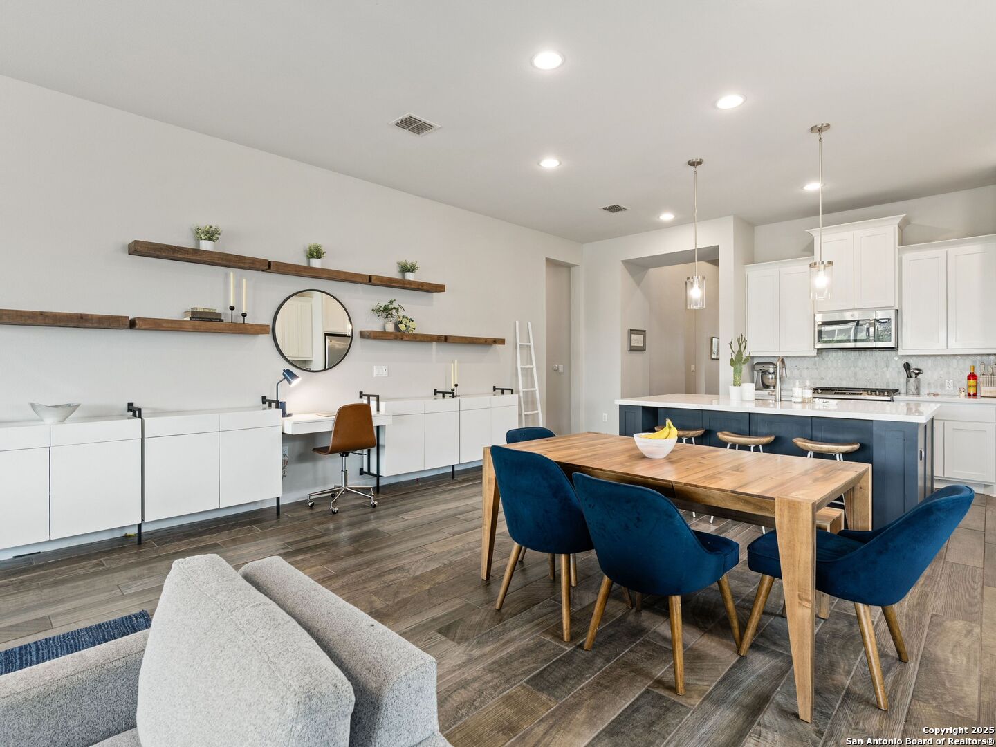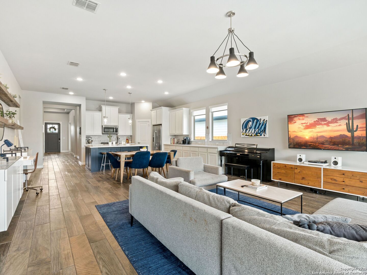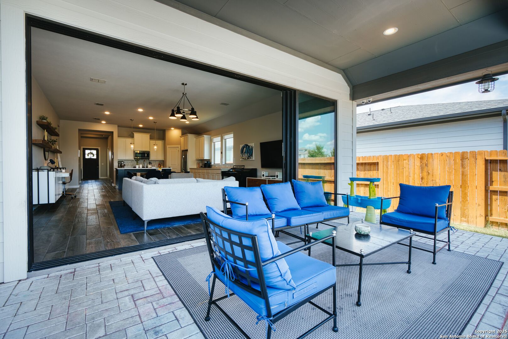 Welcome to 8104 Silhouette St in Easton Park, a vibrant master planned community approximately 12.0 miles southeast of Downtown Austin. This thoughtfully designed two story home, built in 2020, provides four bedrooms, three full baths and approximately 2,427 sq ft of living space on a generous lot. A dedicated office with French doors and a soaring twelve foot entry ceiling greet guests; the open concept island kitchen includes a corner walk-in pantry and overlooks the dining area and family room, all illuminated by an eye-catching folding glass door to the covered patio. The primary suite features a wall of windows, dual vanities, a garden tub, a separate glass enclosed shower, and two walk-in closets. A guest suite with private bath, a mud room off the two car garage, and ample storage complete the practical layout. Community amenities place residents steps from The Union community center with resort style pool, fitness center, event lawn, and over 13 miles of walking trails. This home blends stylish design with everyday function, offering the best of Austin living in a connected and welcoming neighborhood.
