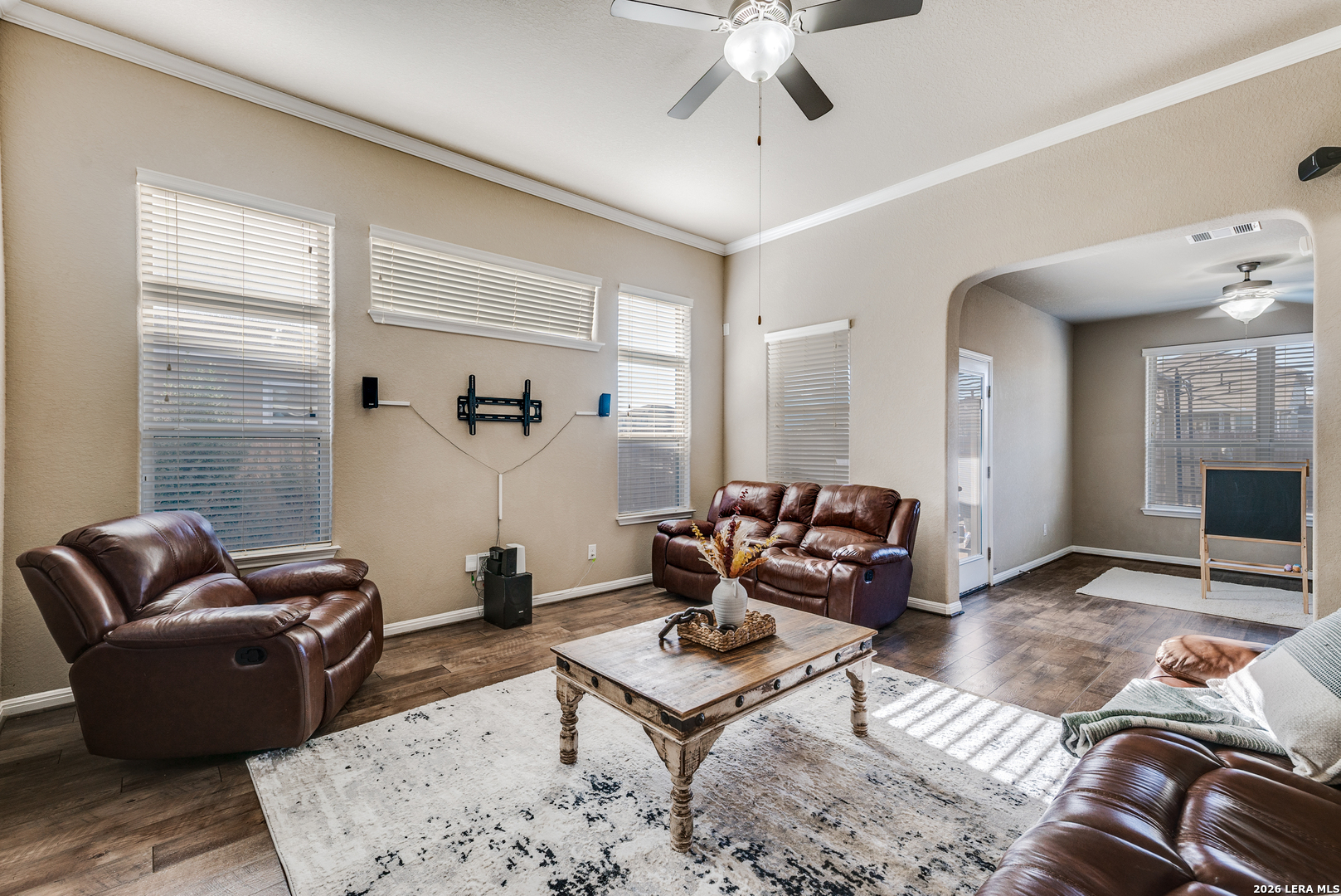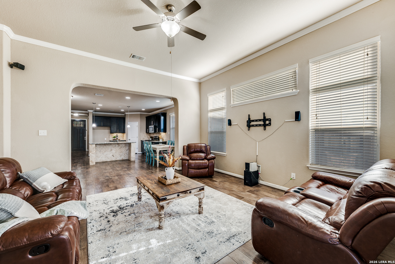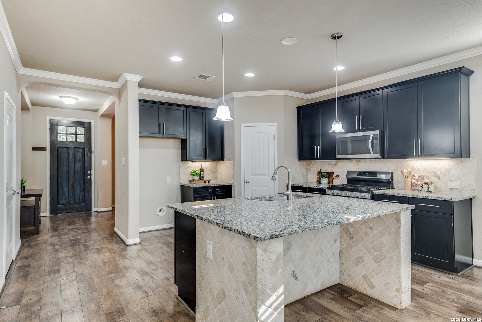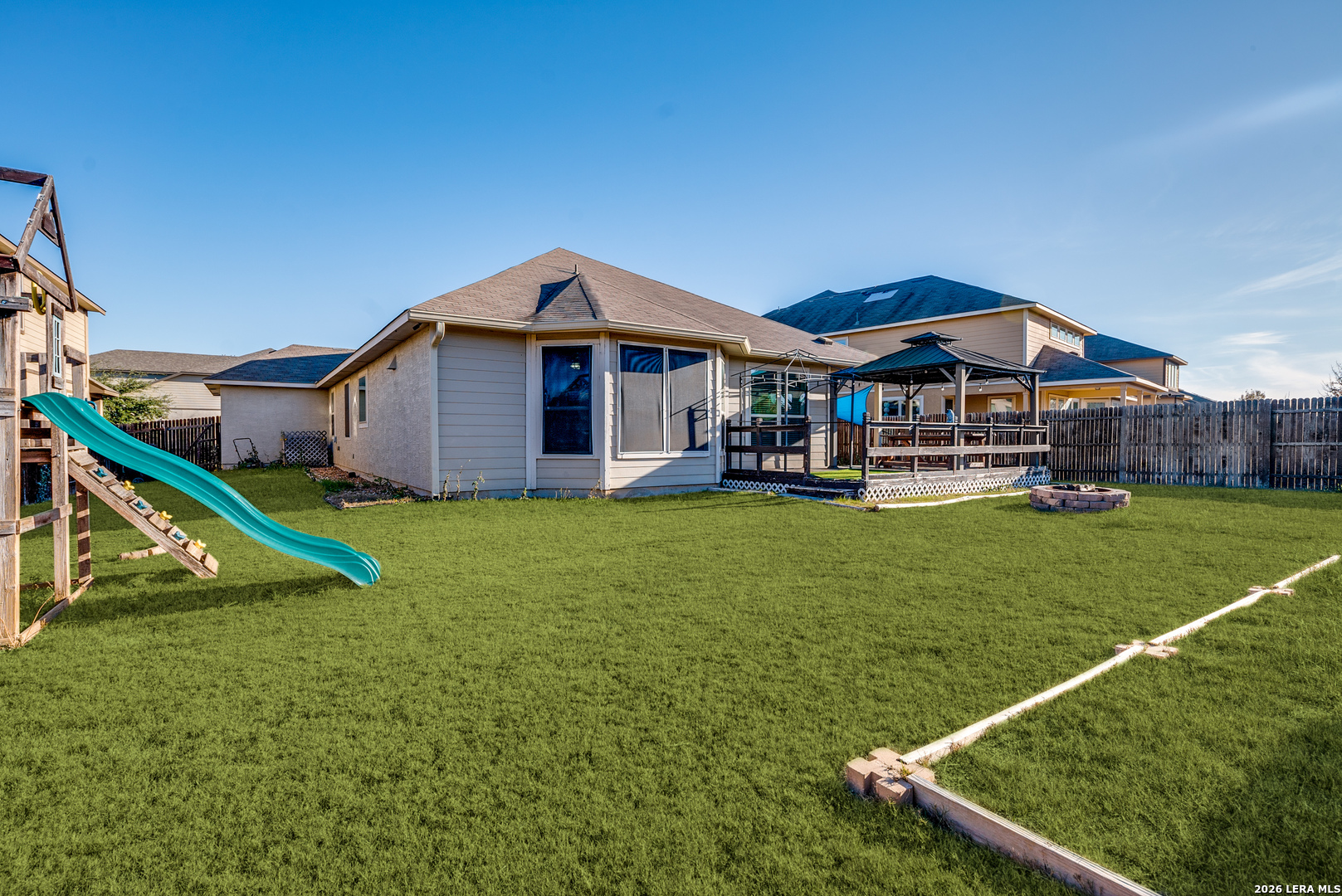 Welcome to 8127 Lovela Bend, a beautiful single-level home with a three-car finished garage and greenbelt views! Inside, a welcoming foyer opens to a flexible room near the entrance-perfect for a study, formal dining area, or multi-purpose space. Attractive hard-surface flooring extends through the main living areas, complemented by architectural niches and thoughtful design touches throughout. The kitchen serves as the heart of the home and includes a center island, granite countertops, abundant cabinetry, pendant lighting, stainless steel appliances, and a breakfast bar accented with stone detailing. A sunny breakfast area sits adjacent to the kitchen, creating an inviting space for everyday meals. The expansive main living room features tall ceilings and upper windows that allow natural light to pour in. An additional living or game room overlooks the backyard, offering endless possibilities for recreation, fitness, or relaxation. The primary bedroom is privately situated and includes a bay window, dual walk-in closets, and an en-suite bath with a walk-in shower, soaking tub, and ample room for a spa-style escape. Secondary bedrooms and a full bath are positioned on the opposite side of the home, creating a desirable split-bedroom layout. Enjoy outdoor living from the covered rear deck, ideal for entertaining or unwinding while overlooking the open green space beyond the yard. Additional highlights include an interior utility room, excellent flow throughout the home, and a layout designed for comfort and versatility. The garage features completed walls and durable flooring, offering a clean and functional space ideal for storage, projects, or additional workspace. Conveniently located near top-rated schools, community amenities, and nearby shopping and dining, this home offers space, functionality, and a setting that's hard to find.