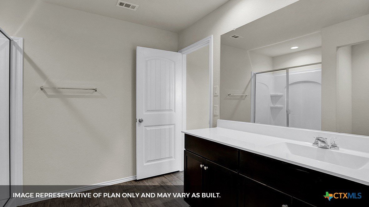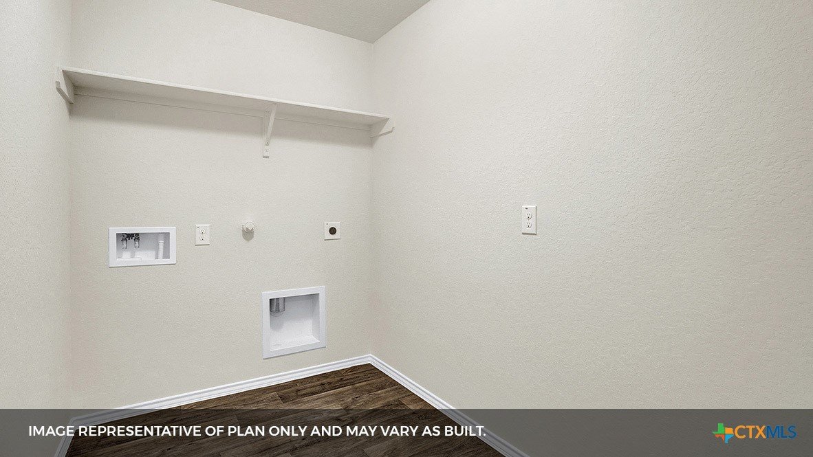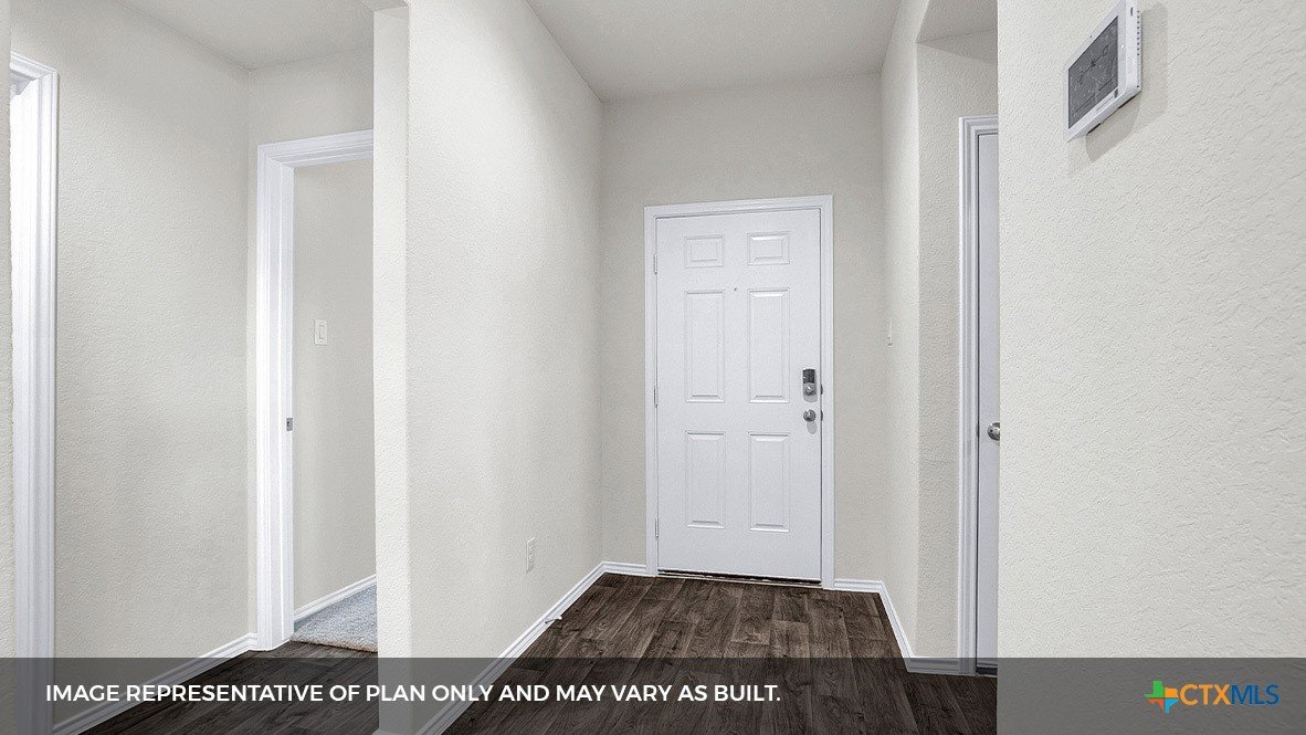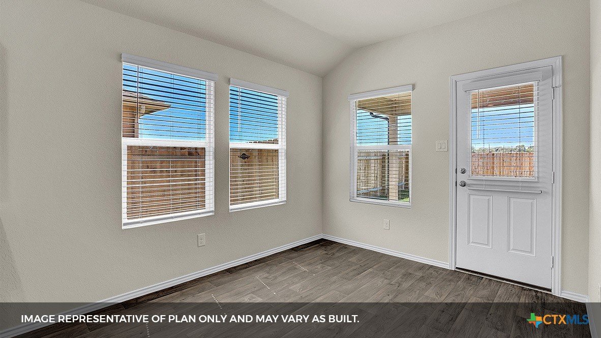 MOVE IN READY. Step into the Baxtor at Arroyo Ranch, one of our communities in Seguin, Texas. This one-story home is perfect for small families or homeowners looking to downsize. Inside this 1,409 square foot home, you will find 3 bedrooms, 2 bathrooms and a 2-car garage. Our homes in Arroyo Ranch feature brick or brick and stone exteriors and the Baxtor plan is available with 2 exterior elevations to choose from. Coming into the home from the covered front porch, you’ll find a foyer that leads you to the heart of the house, the living area. The open concept design of kitchen, dining and family room allows for easy entertaining and everyday living. The kitchen includes granite countertops, a large island with an undermount sink, a corner pantry closet, stainless-steel appliances and 36’’ upper cabinets. The primary bedroom is off the dining room and includes its own attached bathroom, making the start of your day a seamless step from sleep to your morning routine. Enjoy the 5’ walk in shower, double vanity, and separate door to the toilet for privacy. A walk-in closet with generous shelving is connected to the bathroom. The secondary bedrooms are off the foyer at the front of the home. In the hall between the bedrooms is the secondary bathroom, which includes a shower/tub combination. Each bedroom includes a closet with shelving. The utility room is tucked away between the foyer and kitchen, convenient to all bedrooms once the clothes are cleaned. The Baxtor includes vinyl flooring throughout the common areas of the home, and carpet in the bedrooms. All our new homes feature a covered back patio, full sod, an irrigation system in the front and back yard, and a 6’ privacy fence around the back yard. This home includes our America’s Smart Home base package, which includes the Amazon Echo Pop, Front Doorbell, Front Door Deadbolt Lock, Home Hub, Thermostat, and Deako® Smart Switches.