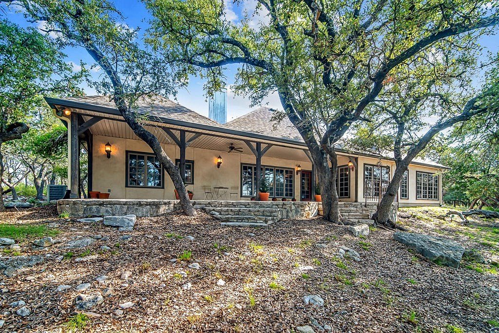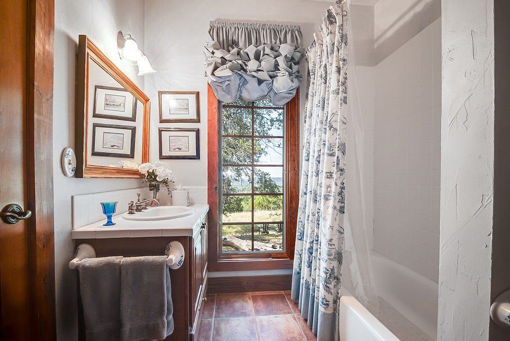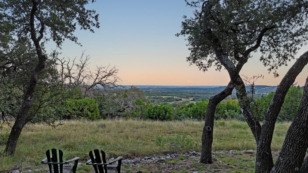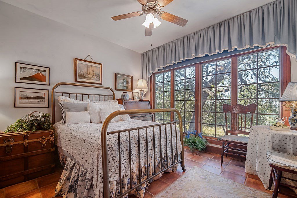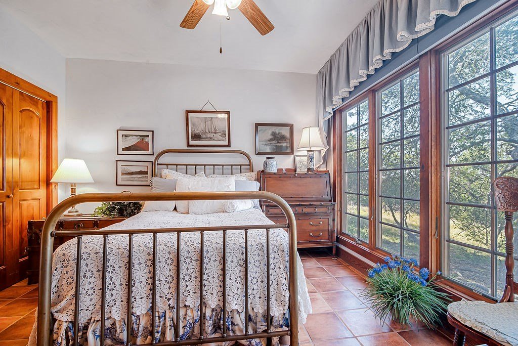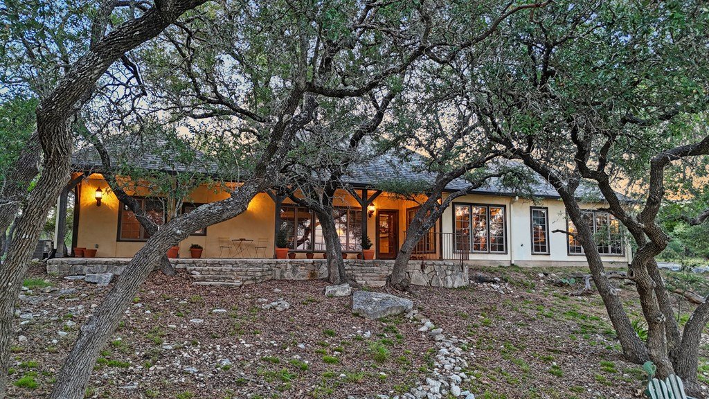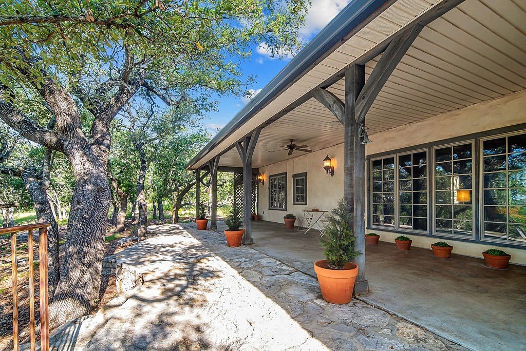 Nestled among mature oaks on a scenic bluff, this classic Hill Country residence offers sweeping views of the of the Texas Hill Country and beyond. The home features timeless architectural details including stone accents, exposed wood beams, and expansive windows that flood the interior with natural light. Inside, the spacious living room centers around a rustic wood-burning fireplace, while the kitchen offers custom cabinetry, tile counters, and warm wood finishes. Multiple dining and gathering spaces make entertaining effortless. The primary suite boasts a generous bath with dual vanities, a soaking tub, and serene hillside views. Additional bedrooms are bright and welcoming, with oversized windows and tile floors. Outdoors, covered porches extend the living space, ideal for enjoying coffee at sunrise or sunsets over the Hill Country. With its blend of charm, privacy, and breathtaking vistas, this property is a rare opportunity for those seeking a Fredericksburg retreat or full-time residence.