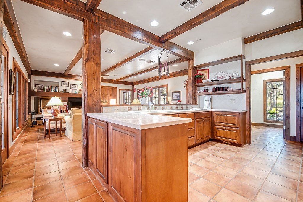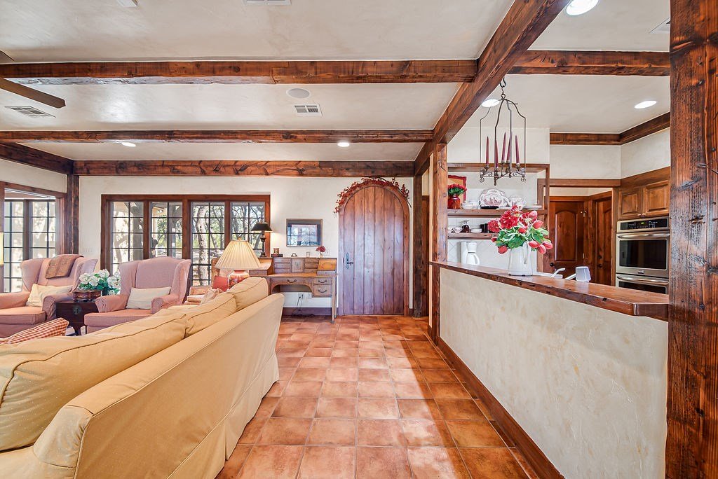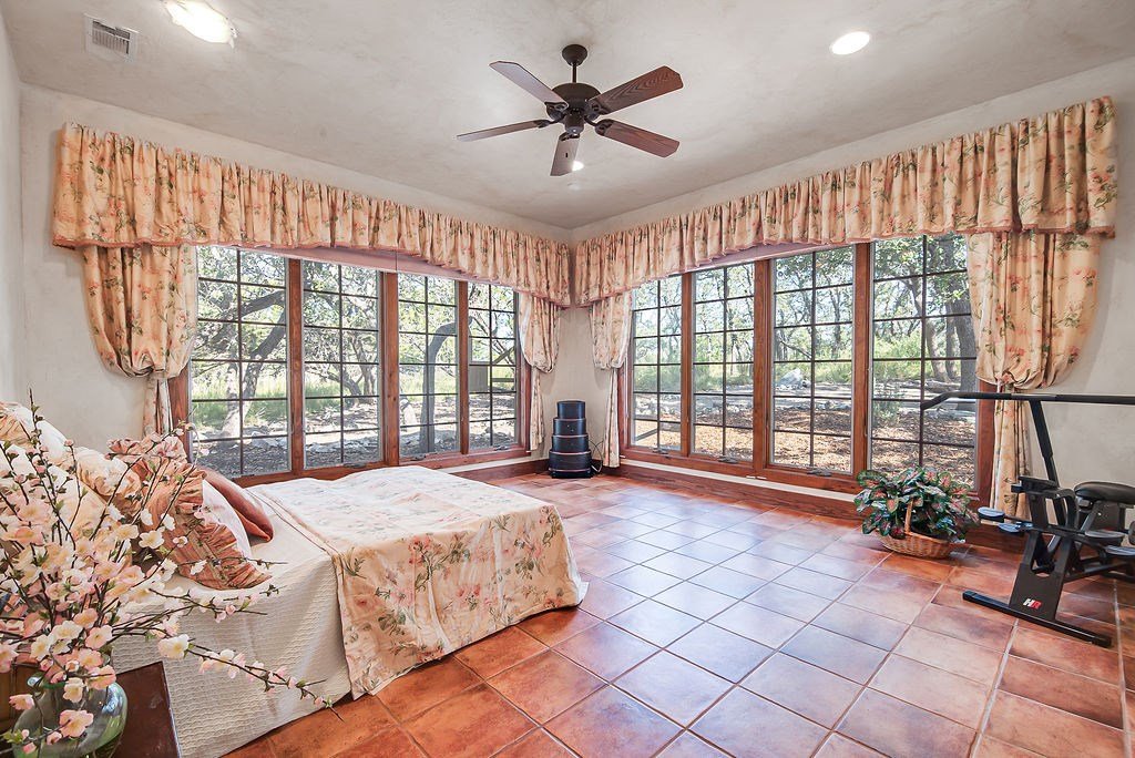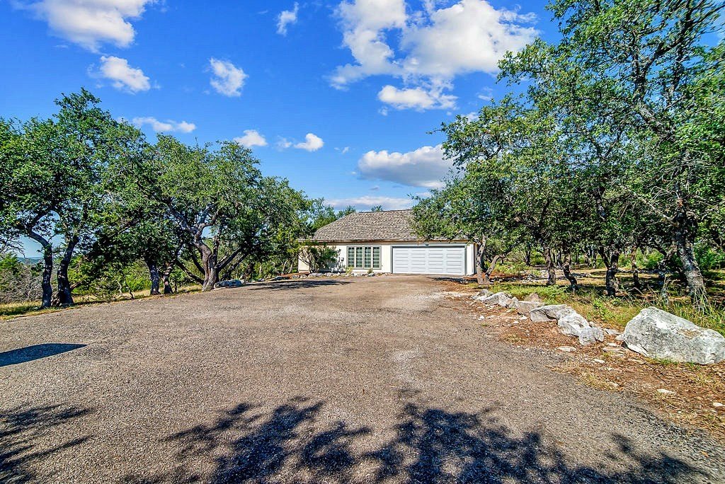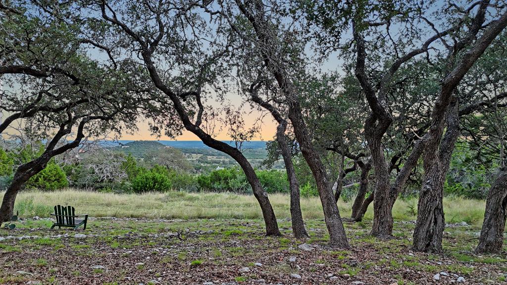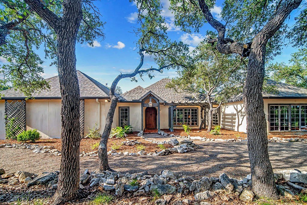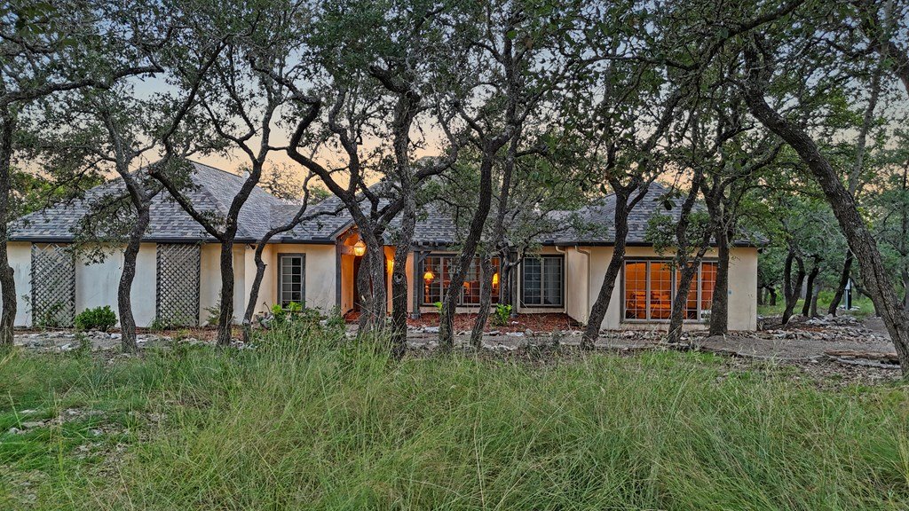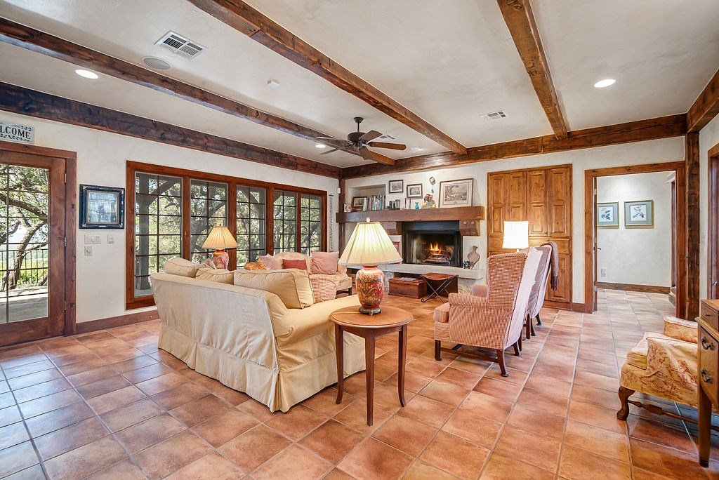 Nestled among mature oaks on a scenic bluff, this classic Hill Country residence offers sweeping views of the of the Texas Hill Country and beyond. The home features timeless architectural details including stone accents, exposed wood beams, and expansive windows that flood the interior with natural light. Inside, the spacious living room centers around a rustic wood-burning fireplace, while the kitchen offers custom cabinetry, tile counters, and warm wood finishes. Multiple dining and gathering spaces make entertaining effortless. The primary suite boasts a generous bath with dual vanities, a soaking tub, and serene hillside views. Additional bedrooms are bright and welcoming, with oversized windows and tile floors. Outdoors, covered porches extend the living space, ideal for enjoying coffee at sunrise or sunsets over the Hill Country. With its blend of charm, privacy, and breathtaking vistas, this property is a rare opportunity for those seeking a Fredericksburg retreat or full-time residence.