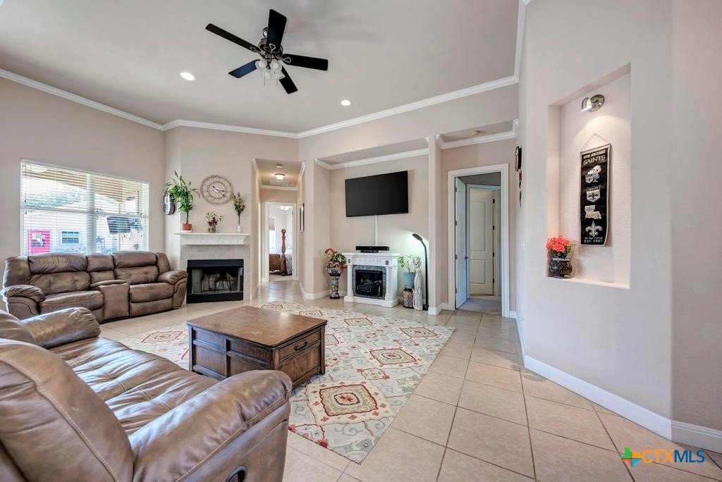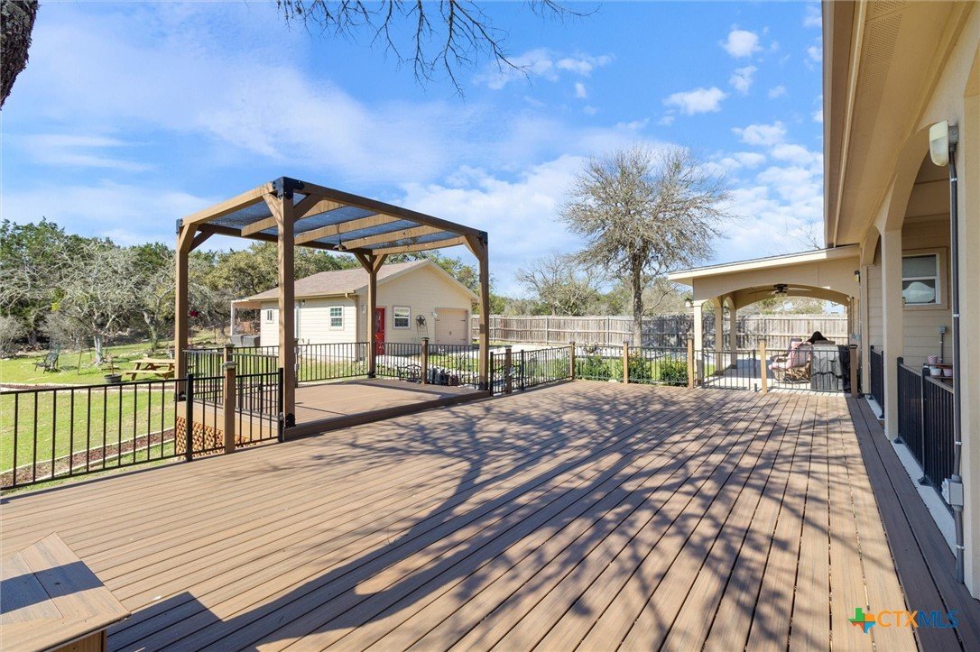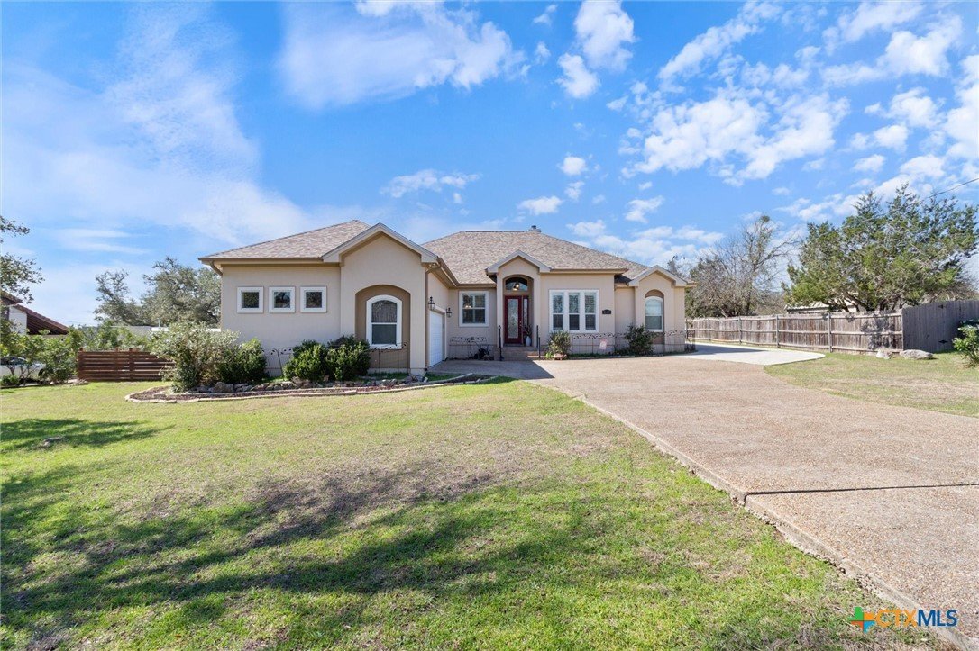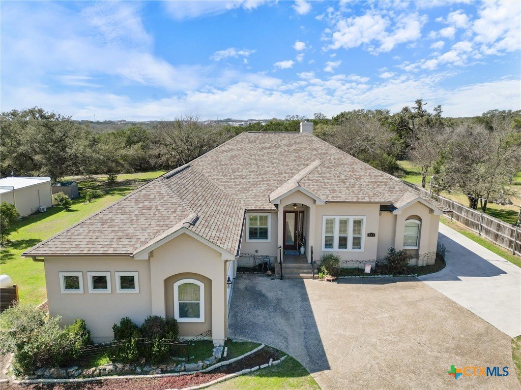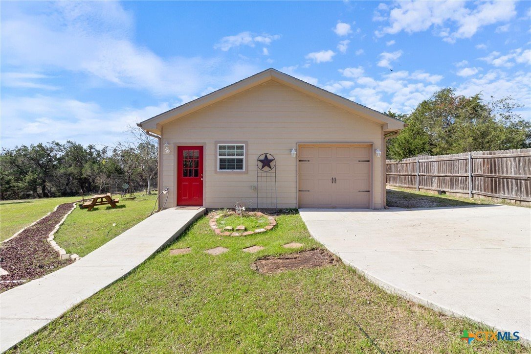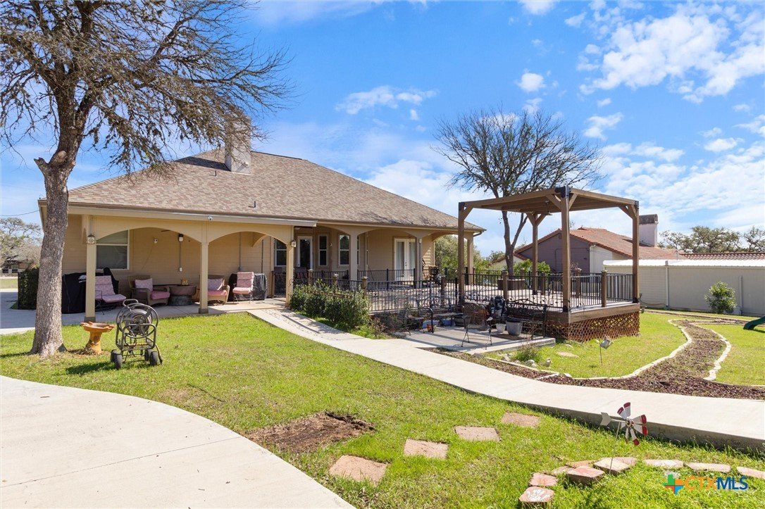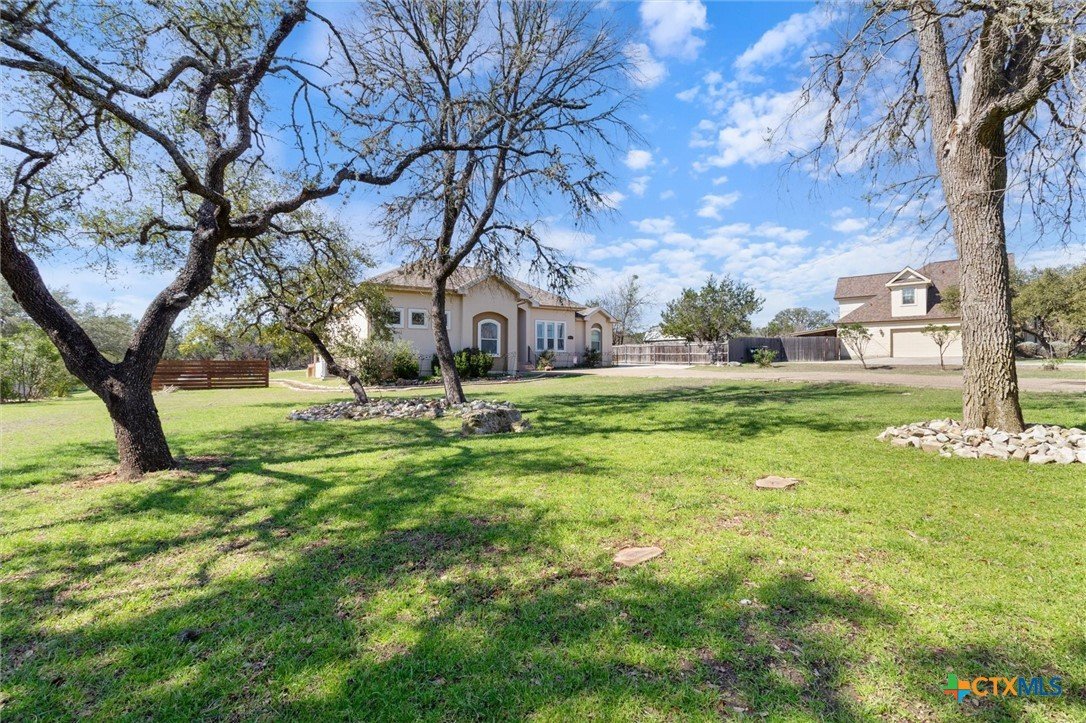This beautifully crafted, single-story home sits on a generous 1-acre lot, offering a perfect blend of style, comfort, and functionality. As you step inside, you are greeted by soaring ceilings, elegant crown molding, and expansive windows that flood the space with natural light. The formal dining room and study are thoughtfully placed on either side of the foyer, creating an inviting atmosphere as you enter. The heart of the home is the open-concept kitchen and living room, designed for both entertaining and everyday living. The kitchen boasts a breakfast bar, cozy nook, custom tile backsplash, and ZLINE gas stove. With ample counter space, abundant storage, and a charming fireplace, this space is perfect for creating memories. Just off the kitchen, you’ll find the luxurious master suite, a true retreat. The spacious room features a tray ceiling with a fan and French doors that lead out to the serene patio. The ensuite bathroom offers a spa-like experience with an oversized dual vanity, a garden tub, and a separate shower—ideal for unwinding after a long day. Across the home, you'll discover three additional well-sized bedrooms and two full baths, one with ADA features, providing comfort and privacy for family or guests. The expansive backyard is a private oasis, featuring a full covered patio with ceiling fans, a massive custom Trex deck, and pergola perfect for enjoying tranquil mornings and evenings. For added convenience, the third garage/workshop includes an enclosed space complete with a half bath, heating, air conditioning, and plenty of room for projects or storage. Additional updates include a new roof, full HVAC system installed in 2021 & 2024, water softener as well as solar panels and a propane tank for added energy efficiency. The property also features fruit-bearing trees, including peach, lime, plum, and pecan, enhancing the outdoor charm.