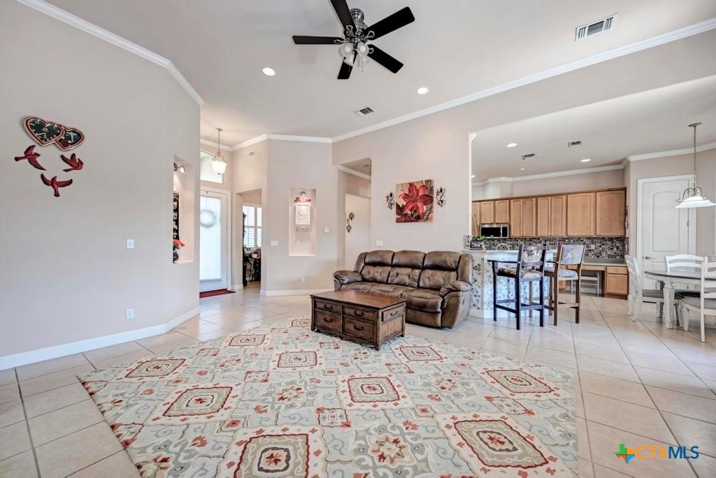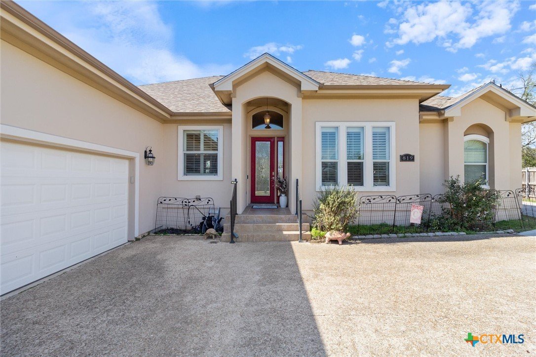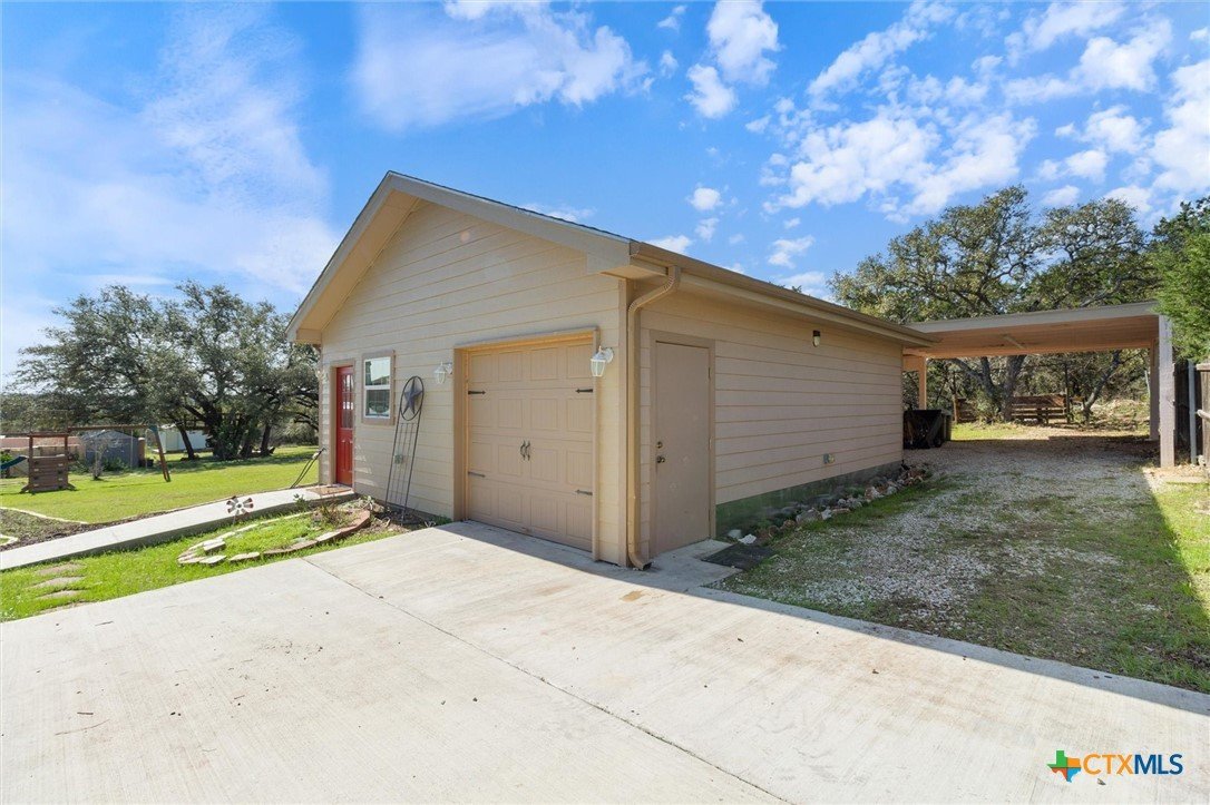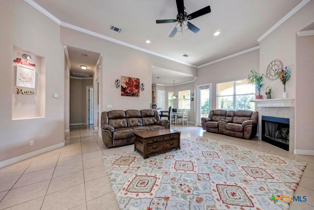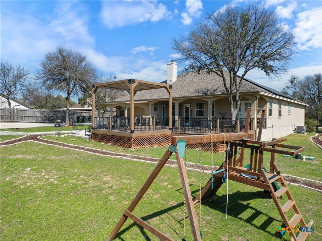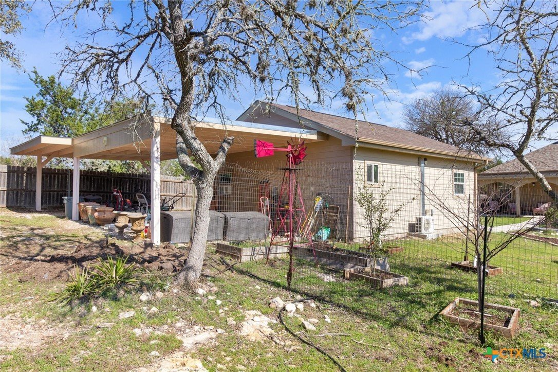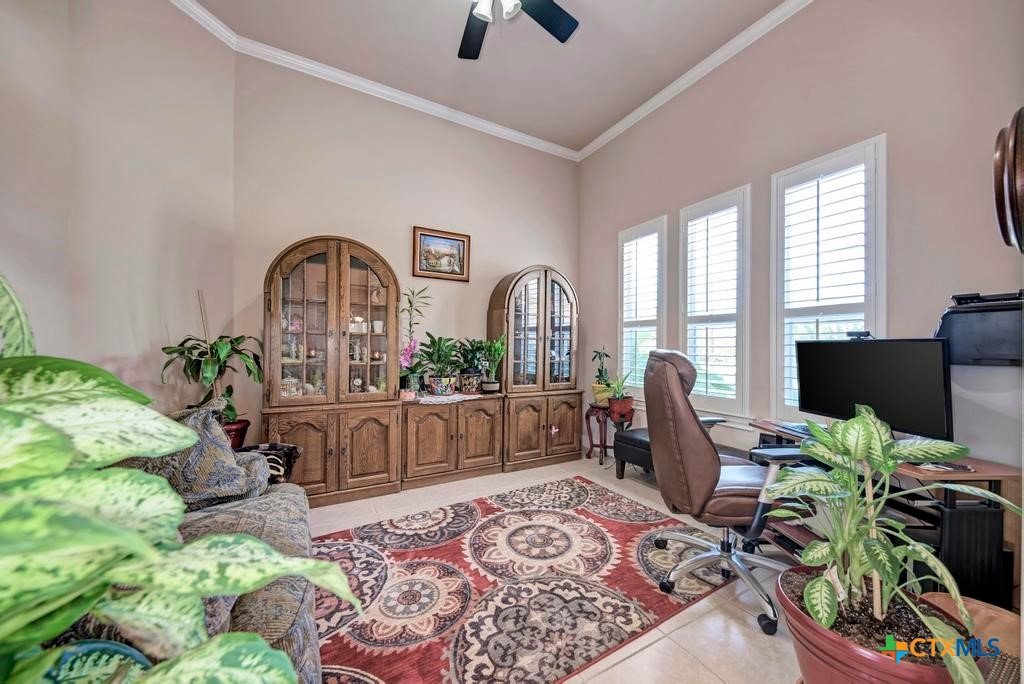 This beautifully crafted, single-story home sits on a generous 1-acre lot, offering a perfect blend of style, comfort, and functionality. As you step inside, you are greeted by soaring ceilings, elegant crown molding, and expansive windows that flood the space with natural light. The formal dining room and study are thoughtfully placed on either side of the foyer, creating an inviting atmosphere as you enter. The heart of the home is the open-concept kitchen and living room, designed for both entertaining and everyday living. The kitchen boasts a breakfast bar, cozy nook, custom tile backsplash, and ZLINE gas stove. With ample counter space, abundant storage, and a charming fireplace, this space is perfect for creating memories. Just off the kitchen, you’ll find the luxurious master suite, a true retreat. The spacious room features a tray ceiling with a fan and French doors that lead out to the serene patio. The ensuite bathroom offers a spa-like experience with an oversized dual vanity, a garden tub, and a separate shower—ideal for unwinding after a long day. Across the home, you'll discover three additional well-sized bedrooms and two full baths, one with ADA features, providing comfort and privacy for family or guests. The expansive backyard is a private oasis, featuring a full covered patio with ceiling fans, a massive custom Trex deck, and pergola perfect for enjoying tranquil mornings and evenings. For added convenience, the third garage/workshop includes an enclosed space complete with a half bath, heating, air conditioning, and plenty of room for projects or storage. Additional updates include a new roof, full HVAC system installed in 2021 & 2024, water softener as well as solar panels and a propane tank for added energy efficiency. The property also features fruit-bearing trees, including peach, lime, plum, and pecan, enhancing the outdoor charm.