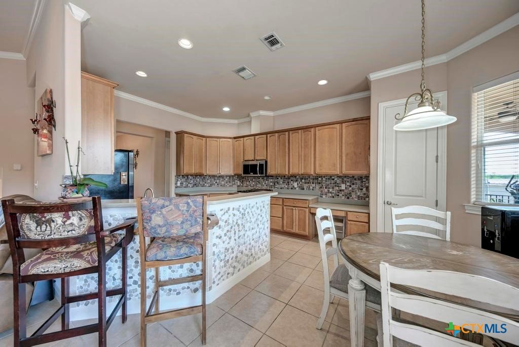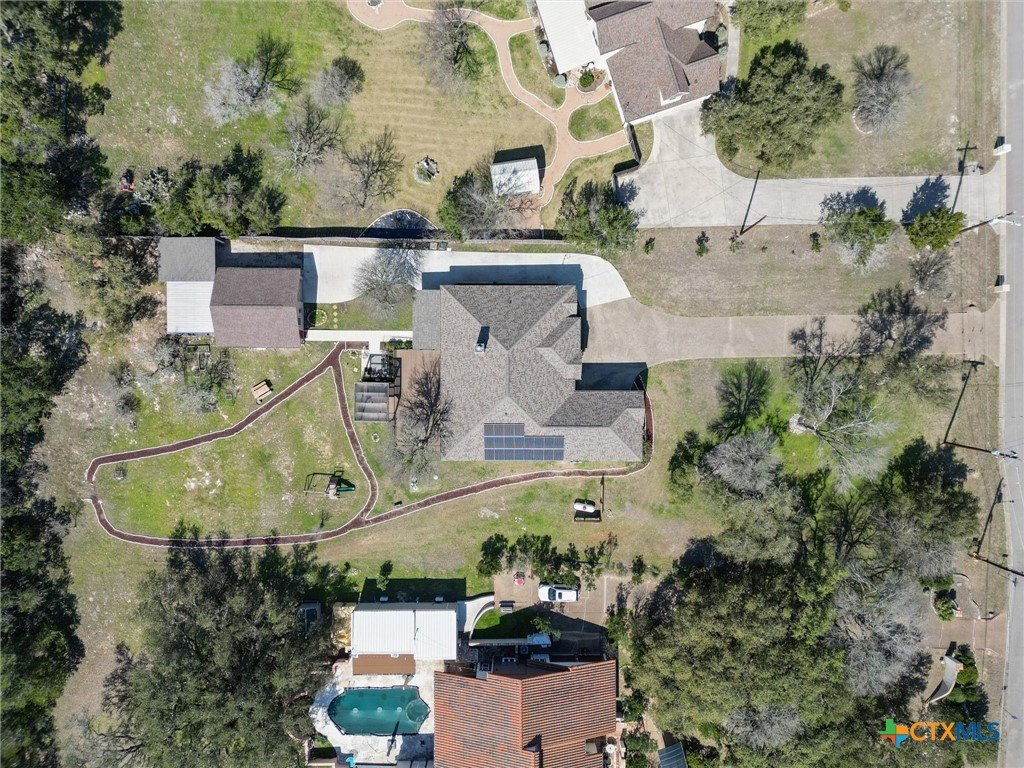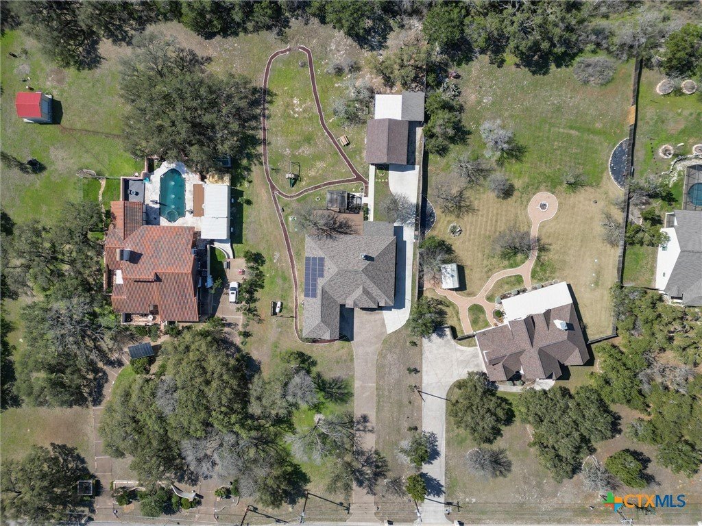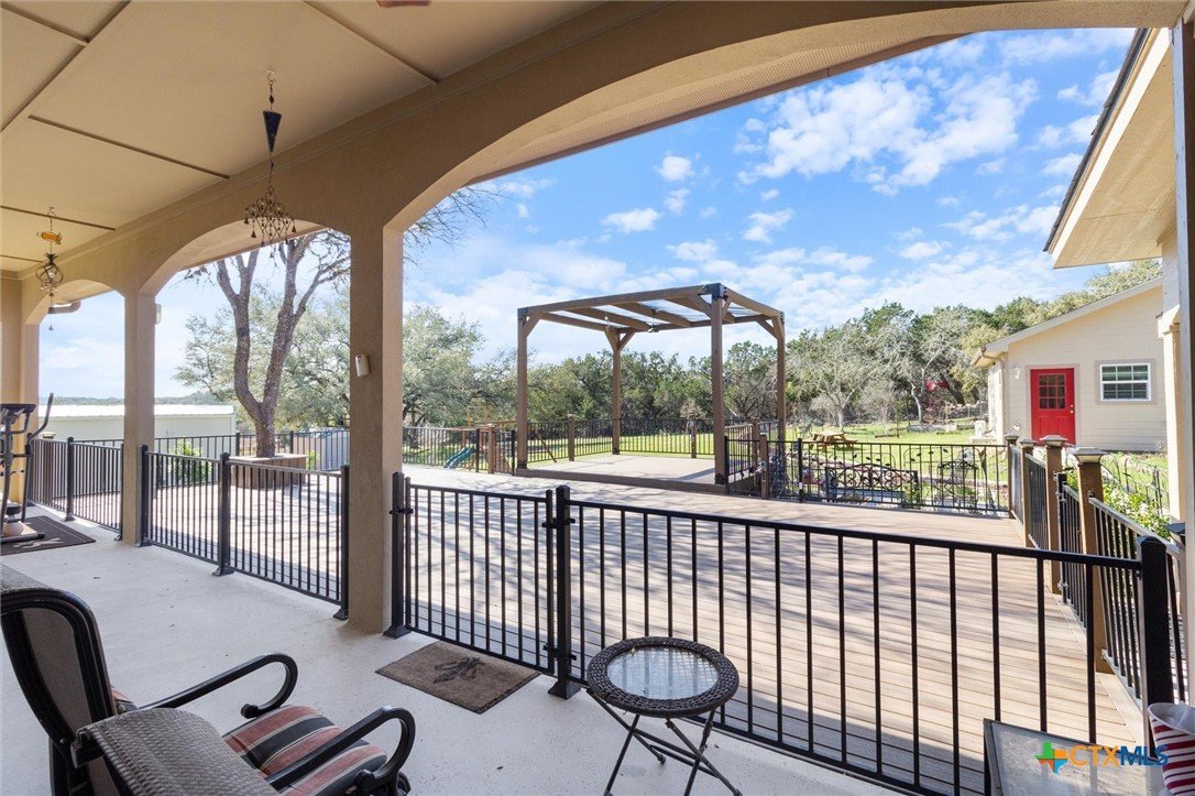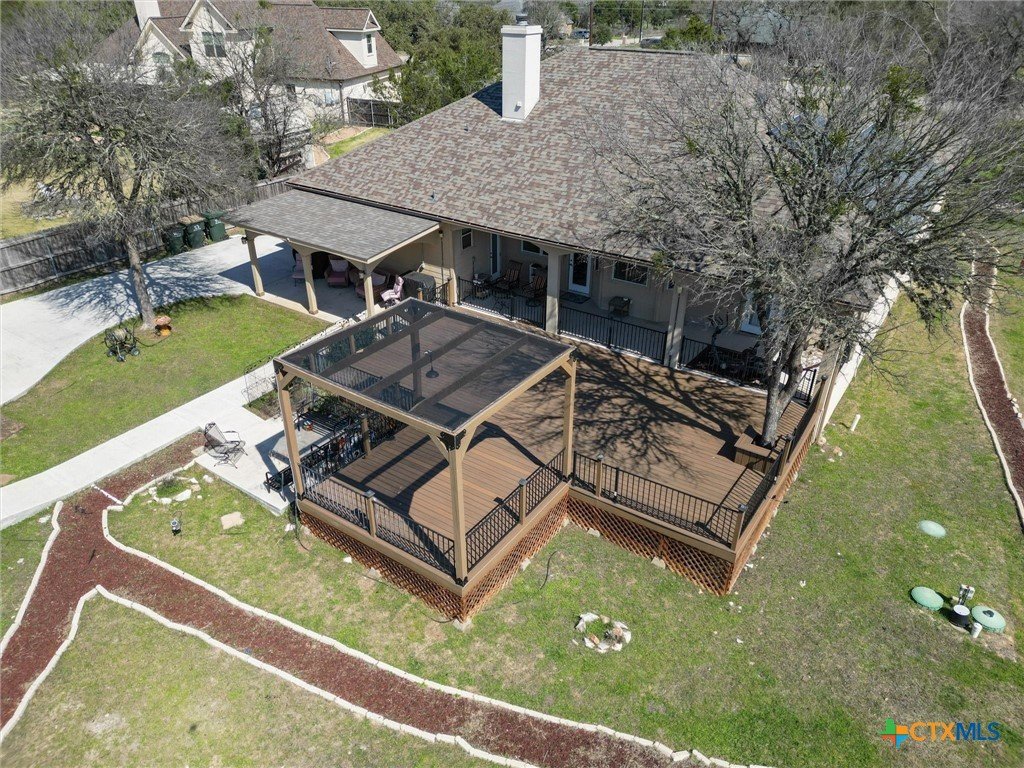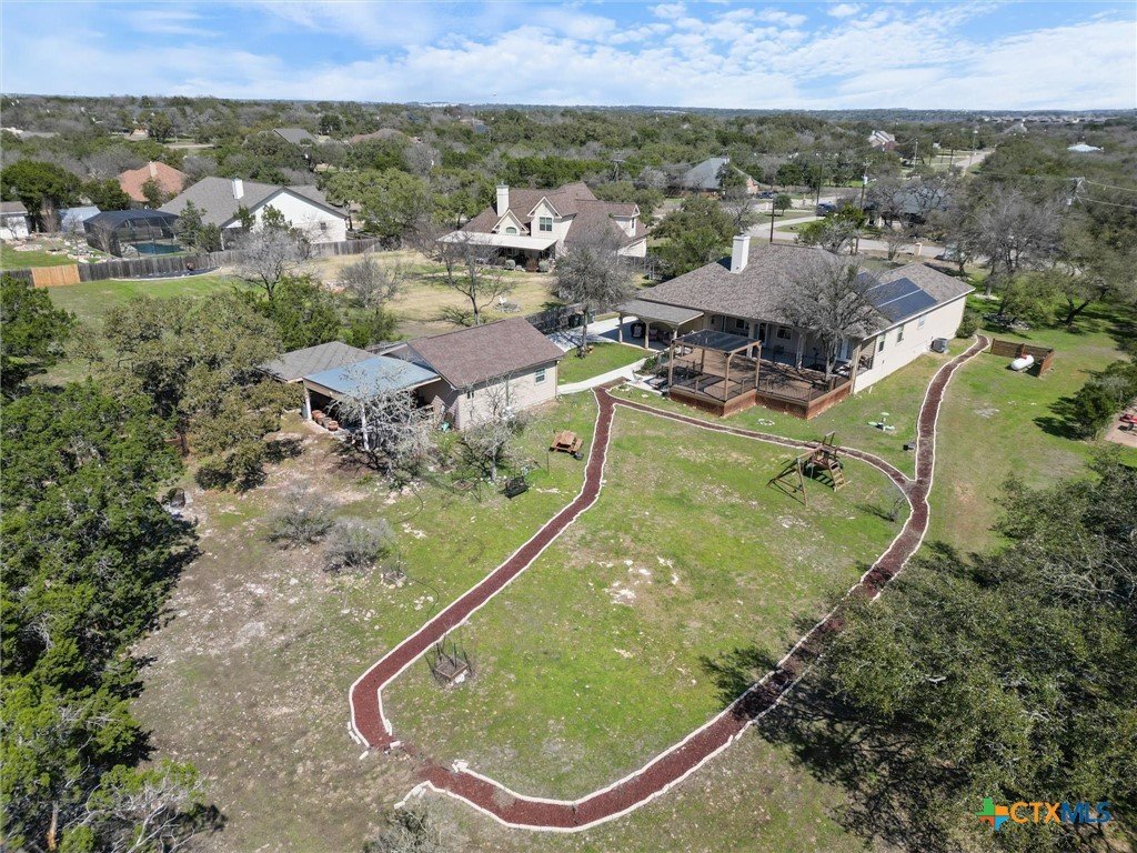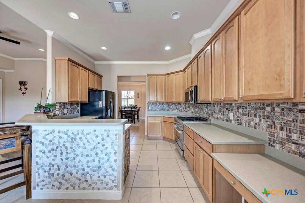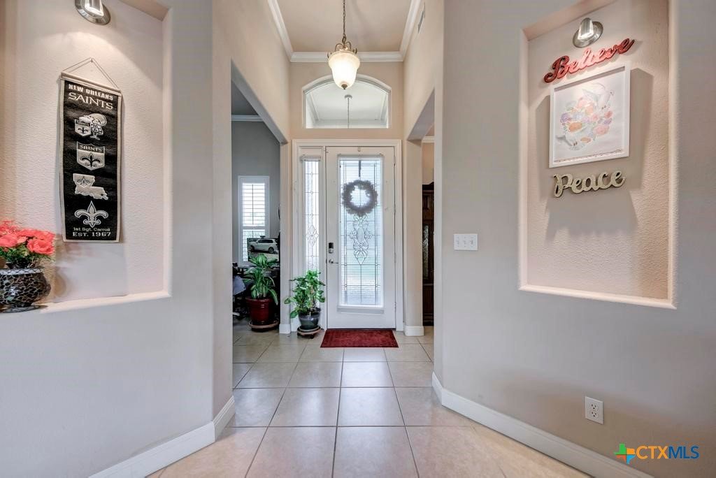 This beautifully crafted, single-story home sits on a generous 1-acre lot, offering a perfect blend of style, comfort, and functionality. As you step inside, you are greeted by soaring ceilings, elegant crown molding, and expansive windows that flood the space with natural light. The formal dining room and study are thoughtfully placed on either side of the foyer, creating an inviting atmosphere as you enter. The heart of the home is the open-concept kitchen and living room, designed for both entertaining and everyday living. The kitchen boasts a breakfast bar, cozy nook, custom tile backsplash, and ZLINE gas stove. With ample counter space, abundant storage, and a charming fireplace, this space is perfect for creating memories. Just off the kitchen, you’ll find the luxurious master suite, a true retreat. The spacious room features a tray ceiling with a fan and French doors that lead out to the serene patio. The ensuite bathroom offers a spa-like experience with an oversized dual vanity, a garden tub, and a separate shower—ideal for unwinding after a long day. Across the home, you'll discover three additional well-sized bedrooms and two full baths, one with ADA features, providing comfort and privacy for family or guests. The expansive backyard is a private oasis, featuring a full covered patio with ceiling fans, a massive custom Trex deck, and pergola perfect for enjoying tranquil mornings and evenings. For added convenience, the third garage/workshop includes an enclosed space complete with a half bath, heating, air conditioning, and plenty of room for projects or storage. Additional updates include a new roof, full HVAC system installed in 2021 & 2024, water softener as well as solar panels and a propane tank for added energy efficiency. The property also features fruit-bearing trees, including peach, lime, plum, and pecan, enhancing the outdoor charm.