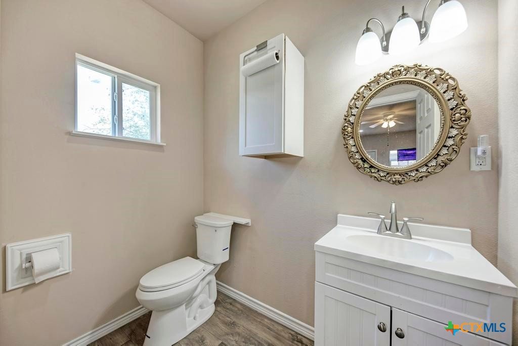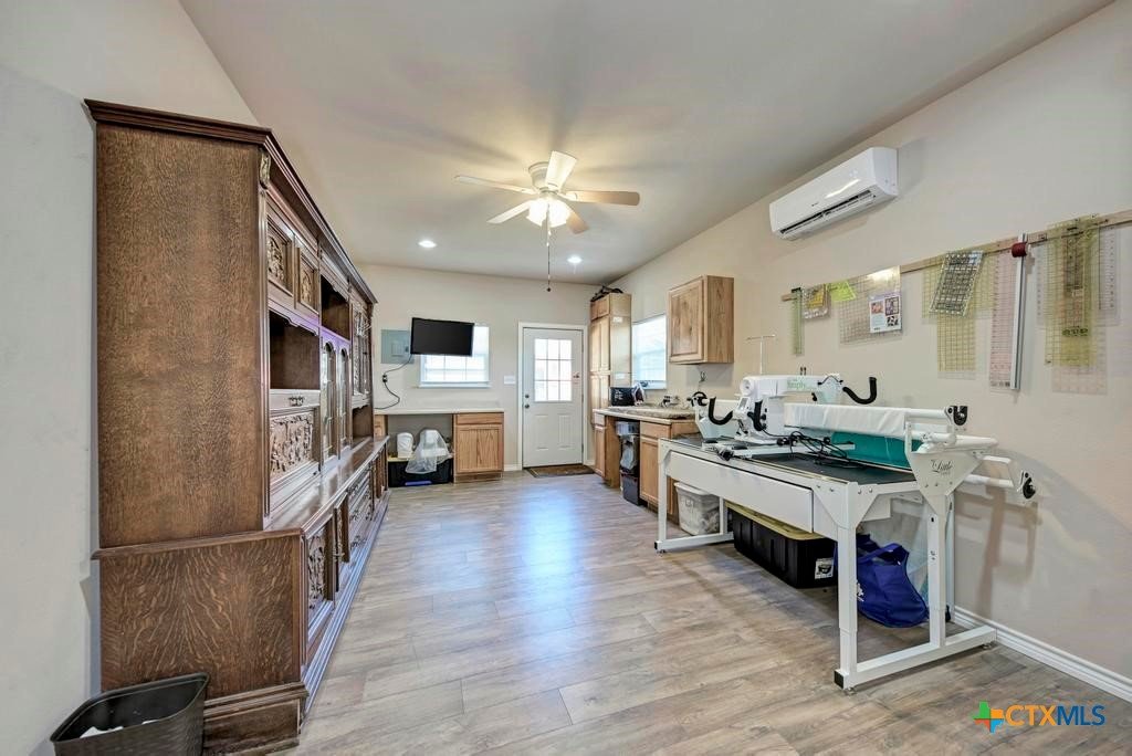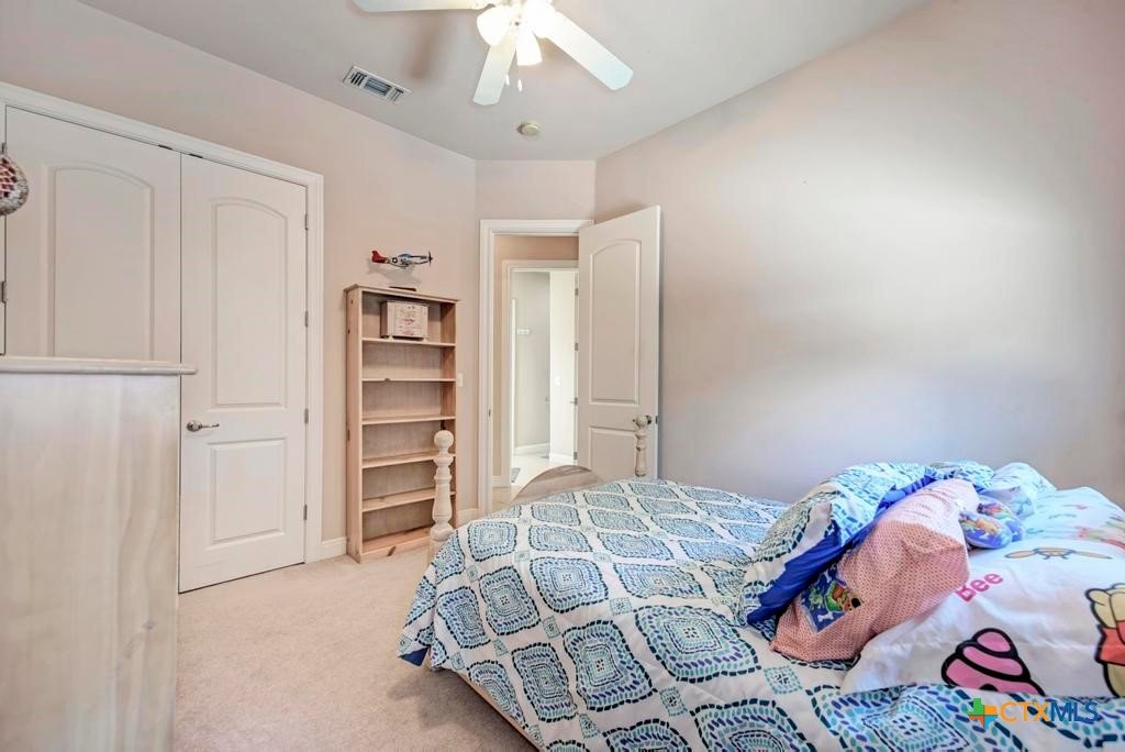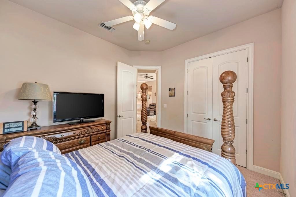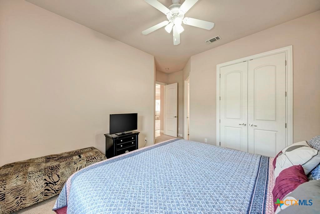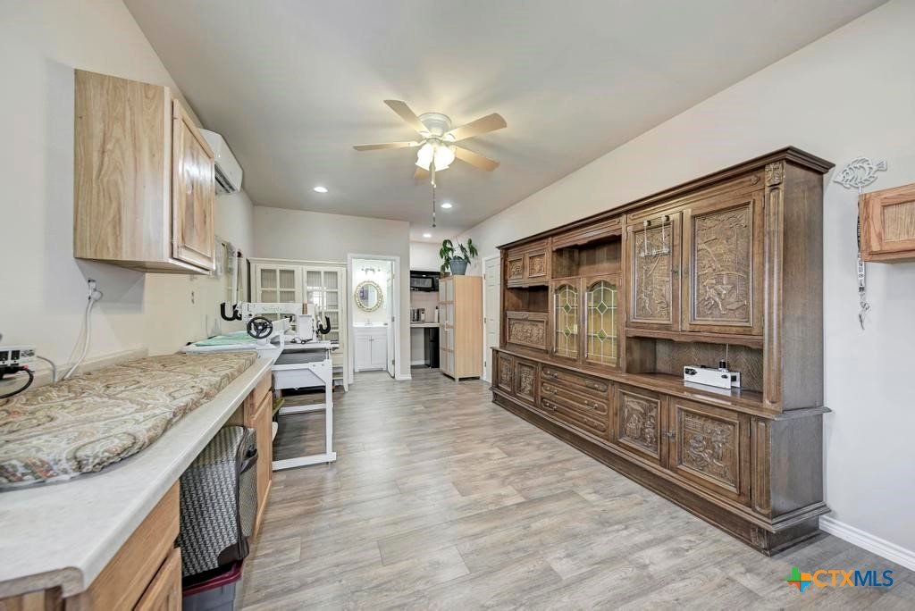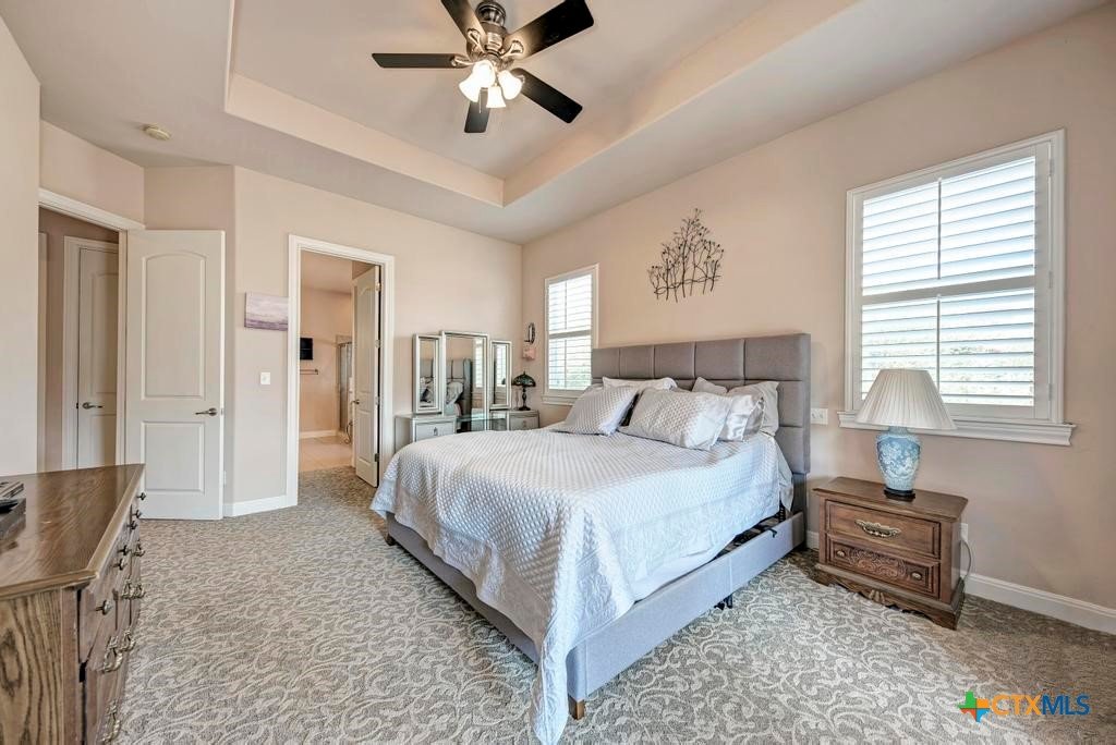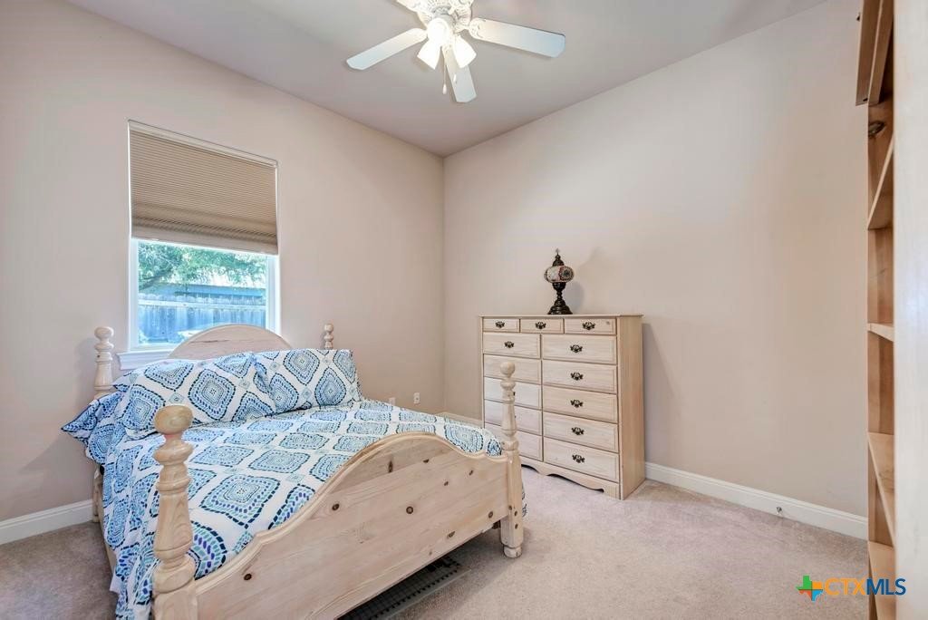 This beautifully crafted, single-story home sits on a generous 1-acre lot, offering a perfect blend of style, comfort, and functionality. As you step inside, you are greeted by soaring ceilings, elegant crown molding, and expansive windows that flood the space with natural light. The formal dining room and study are thoughtfully placed on either side of the foyer, creating an inviting atmosphere as you enter. The heart of the home is the open-concept kitchen and living room, designed for both entertaining and everyday living. The kitchen boasts a breakfast bar, cozy nook, custom tile backsplash, and ZLINE gas stove. With ample counter space, abundant storage, and a charming fireplace, this space is perfect for creating memories. Just off the kitchen, you’ll find the luxurious master suite, a true retreat. The spacious room features a tray ceiling with a fan and French doors that lead out to the serene patio. The ensuite bathroom offers a spa-like experience with an oversized dual vanity, a garden tub, and a separate shower—ideal for unwinding after a long day. Across the home, you'll discover three additional well-sized bedrooms and two full baths, one with ADA features, providing comfort and privacy for family or guests. The expansive backyard is a private oasis, featuring a full covered patio with ceiling fans, a massive custom Trex deck, and pergola perfect for enjoying tranquil mornings and evenings. For added convenience, the third garage/workshop includes an enclosed space complete with a half bath, heating, air conditioning, and plenty of room for projects or storage. Additional updates include a new roof, full HVAC system installed in 2021 & 2024, water softener as well as solar panels and a propane tank for added energy efficiency. The property also features fruit-bearing trees, including peach, lime, plum, and pecan, enhancing the outdoor charm.