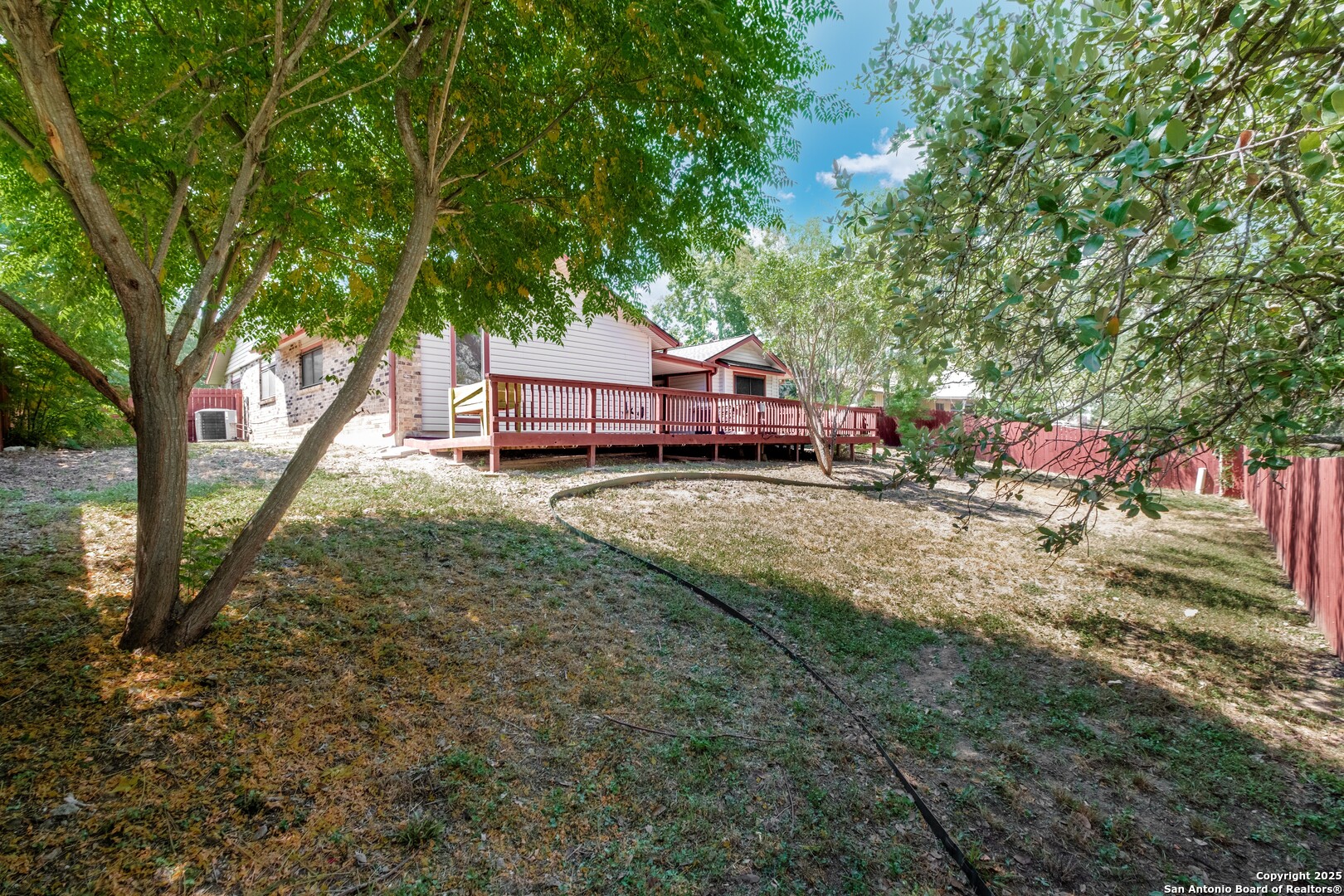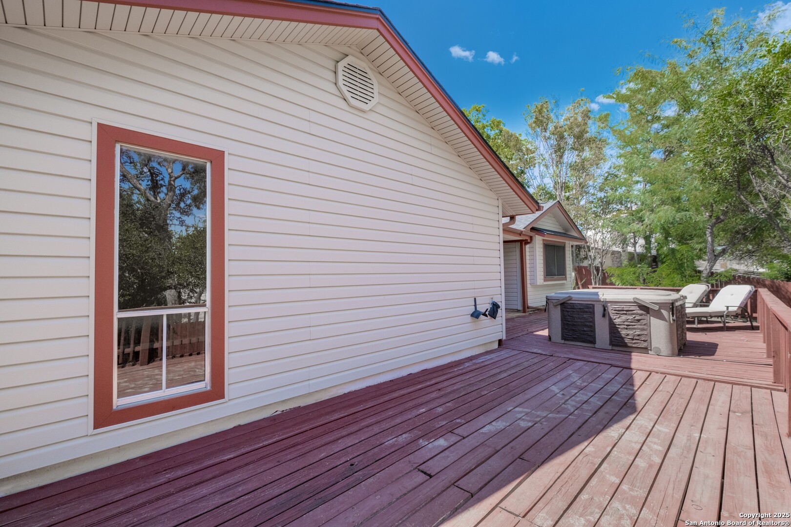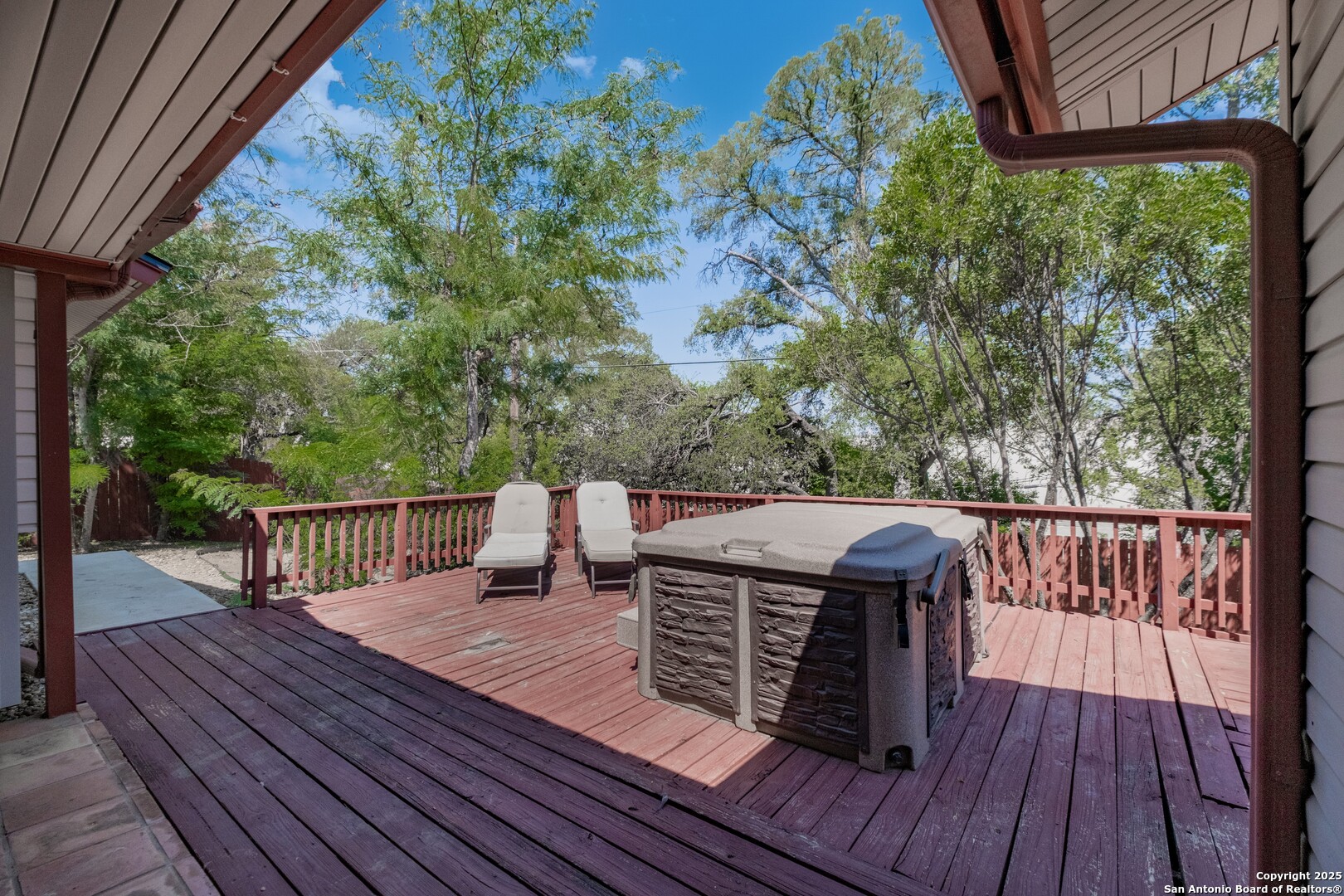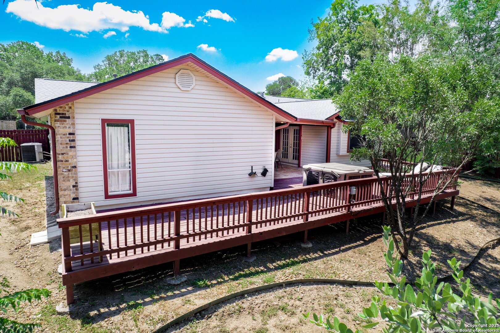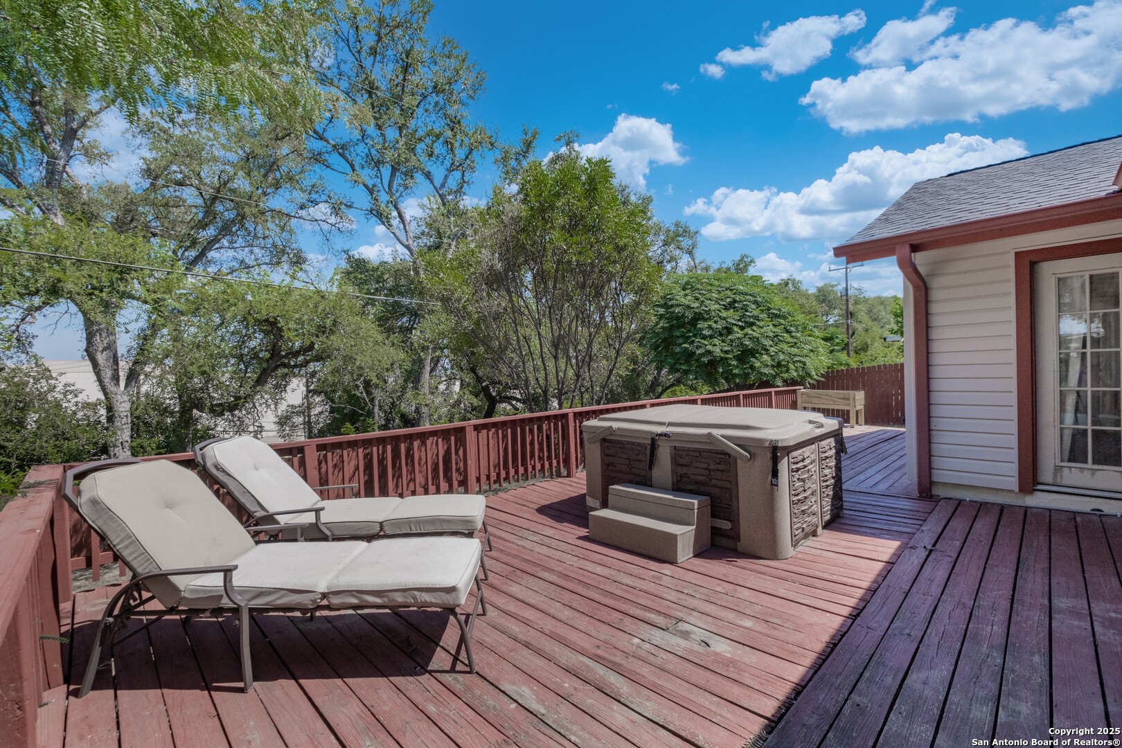 Prime Location! Just minutes from The Forum at Olympia Parkway and Triangle Shopping Center, this vacant 1-story, 4-bedroom, 2-bath home offers exceptional convenience to major retailers including Target, Best Buy, TJ Maxx, Costco, Ulta, Michaels, and more. Situated on a 0.24-acre lot and offering 1,836 sq ft of living space, the beautiful home features an open floor plan with high ceilings, wood flooring throughout, and two living areas that create comfortable spaces for both gathering and relaxing. The living areas offer access to the patio, adding to the home's indoor-outdoor flow. The dining area connects to the updated kitchen, completed in 2020, with granite counters and abundant cabinetry. The primary bedroom is located on the rear side of the home for privacy and features beamed ceilings, a two-door closet, an ensuite bath with a walk-in shower and single vanity, and access to the patio. Three additional spacious bedrooms complete the layout. The attached oversized two-car garage with double doors provides convenience, while the covered slab patio and extended wooden deck overlook a large fenced backyard ideal for entertaining. Additional highlights include a new roof in 2024, AC system replaced in 2021, sprinkler system in the front yard, a hot tub on the back deck that remains with the property, and all appliances including washer and dryer conveying with the sale. This home is vacant, move-in ready, and perfectly positioned in a beautiful neighborhood with unbeatable access to shopping, dining, commuter routes, and Randolph Air Force Base.