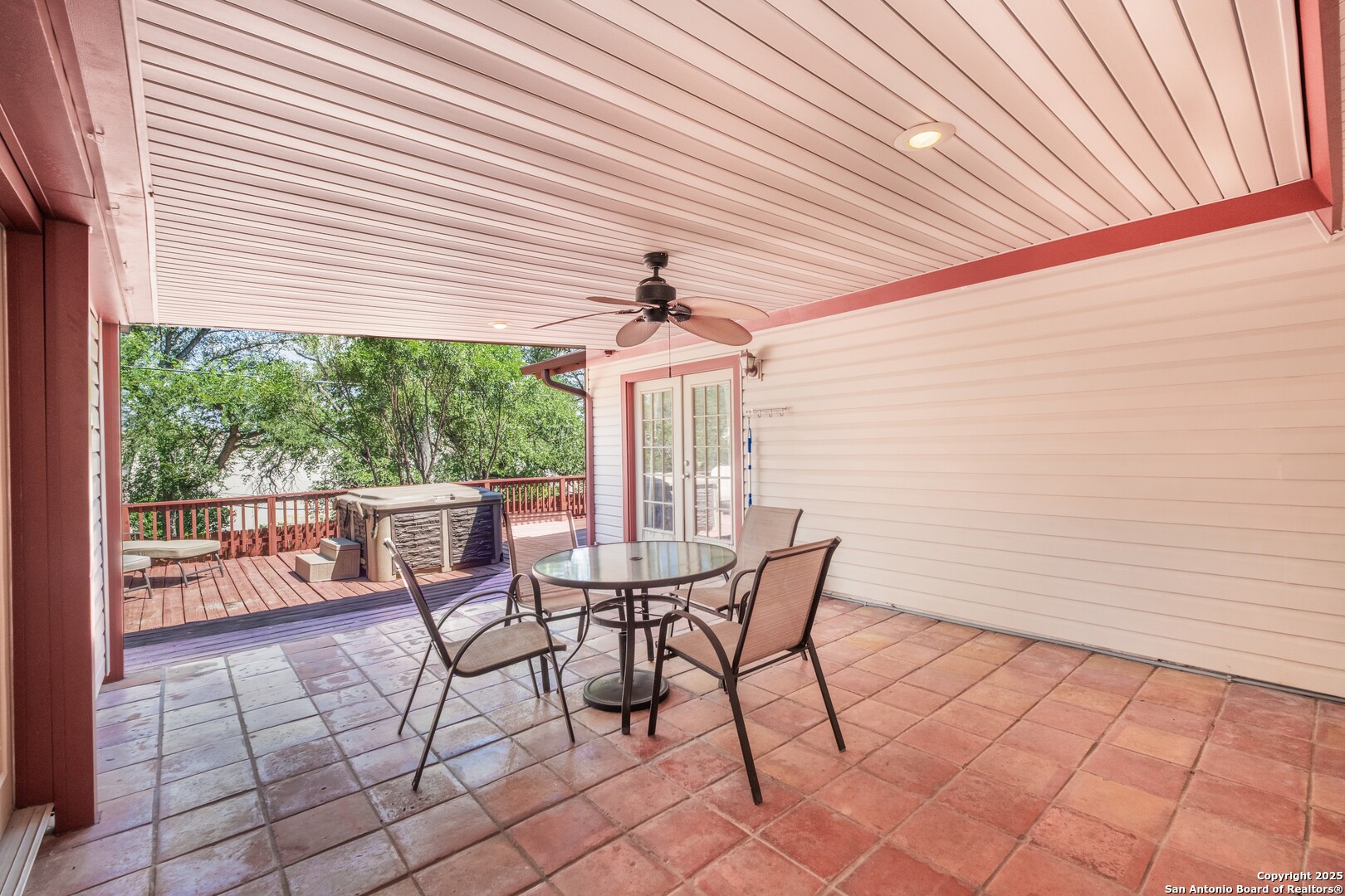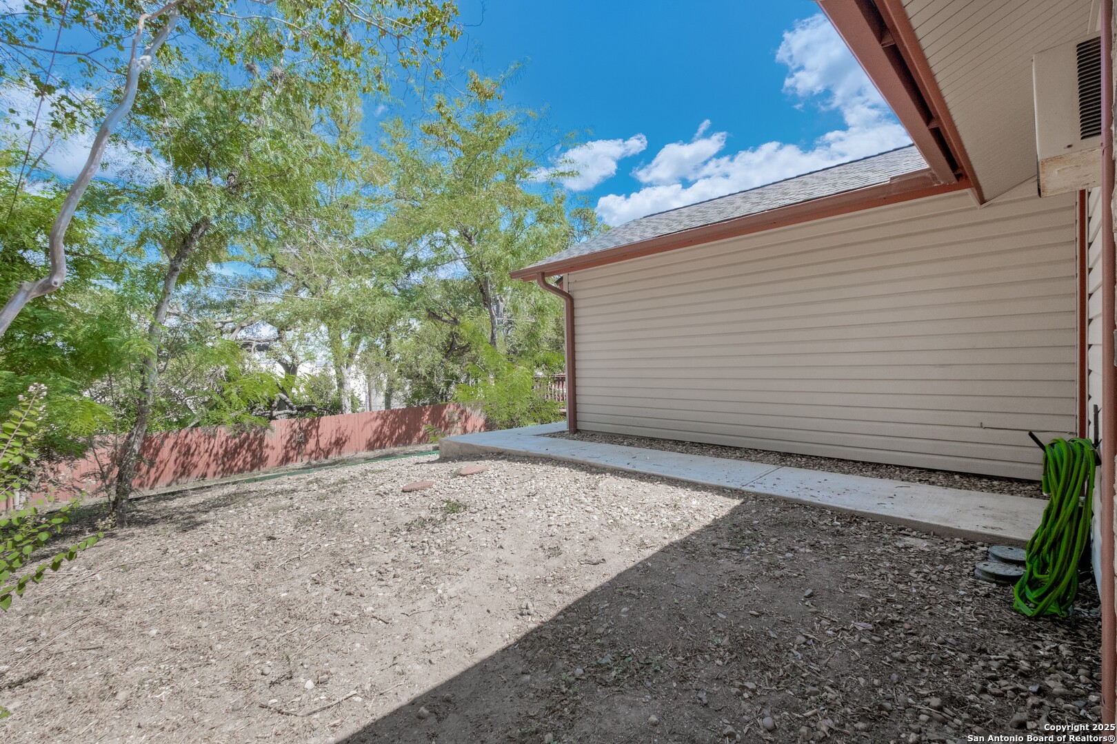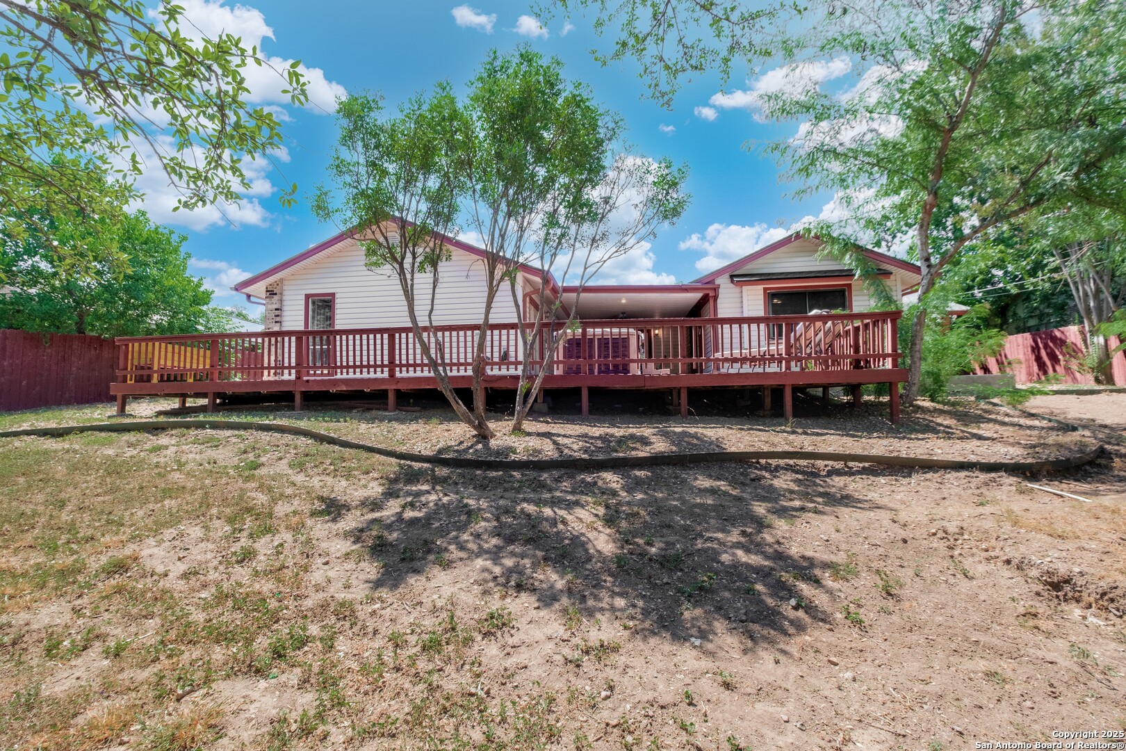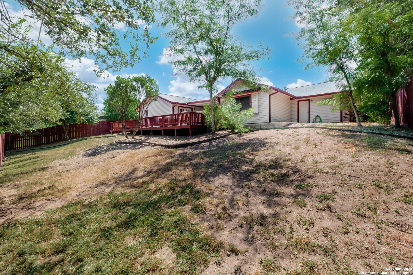 Prime Location! Just minutes from The Forum at Olympia Parkway and Triangle Shopping Center, this vacant 1-story, 4-bedroom, 2-bath home offers exceptional convenience to major retailers including Target, Best Buy, TJ Maxx, Costco, Ulta, Michaels, and more. Situated on a 0.24-acre lot and offering 1,836 sq ft of living space, the beautiful home features an open floor plan with high ceilings, wood flooring throughout, and two living areas that create comfortable spaces for both gathering and relaxing. The living areas offer access to the patio, adding to the home's indoor-outdoor flow. The dining area connects to the updated kitchen, completed in 2020, with granite counters and abundant cabinetry. The primary bedroom is located on the rear side of the home for privacy and features beamed ceilings, a two-door closet, an ensuite bath with a walk-in shower and single vanity, and access to the patio. Three additional spacious bedrooms complete the layout. The attached oversized two-car garage with double doors provides convenience, while the covered slab patio and extended wooden deck overlook a large fenced backyard ideal for entertaining. Additional highlights include a new roof in 2024, AC system replaced in 2021, sprinkler system in the front yard, a hot tub on the back deck that remains with the property, and all appliances including washer and dryer conveying with the sale. This home is vacant, move-in ready, and perfectly positioned in a beautiful neighborhood with unbeatable access to shopping, dining, commuter routes, and Randolph Air Force Base.