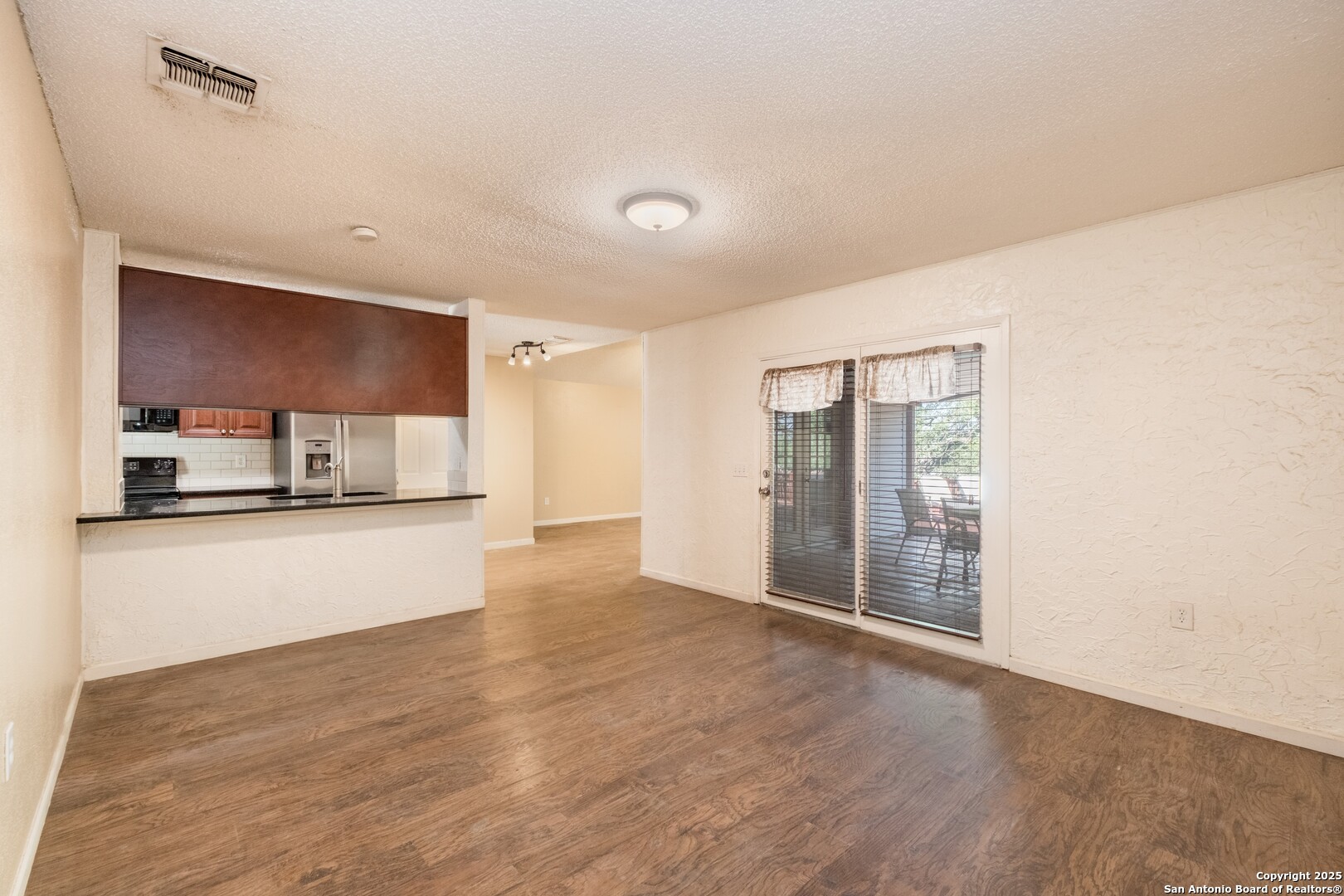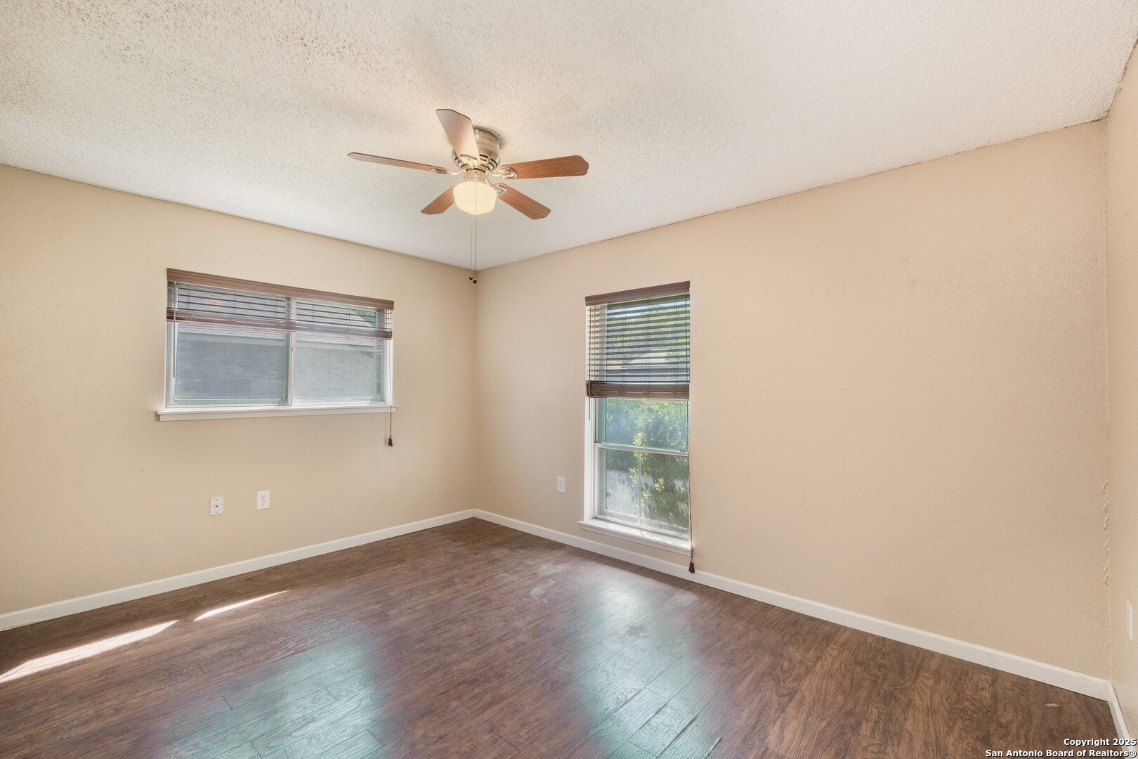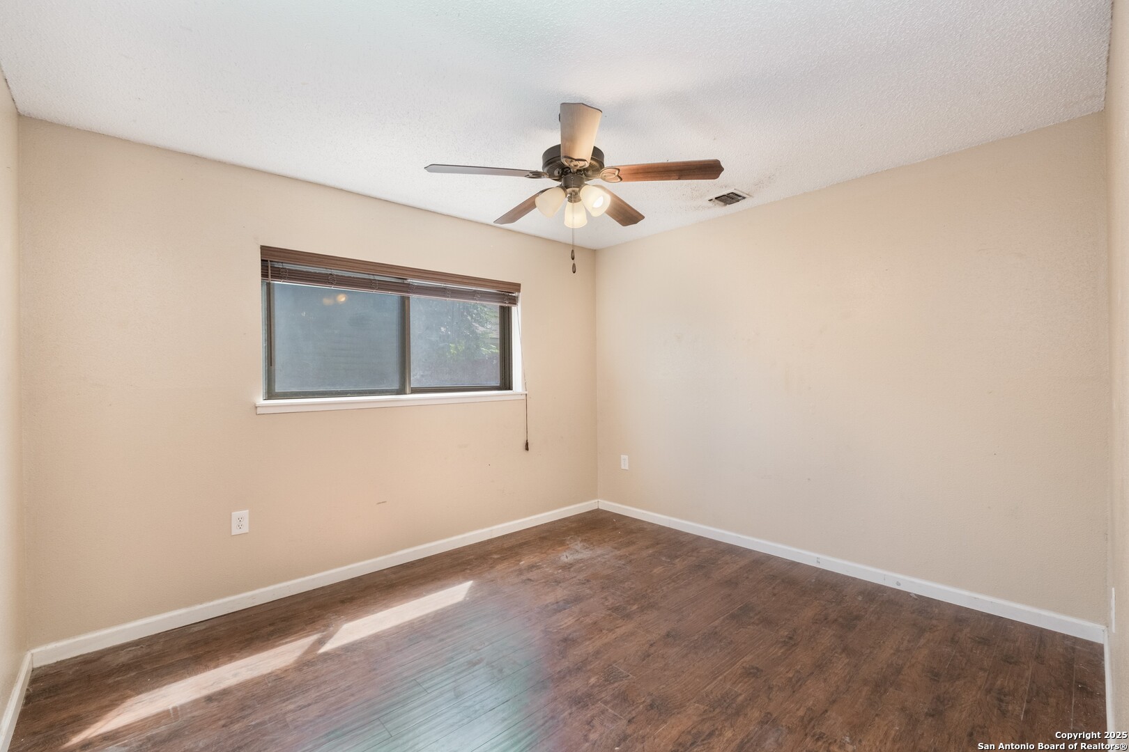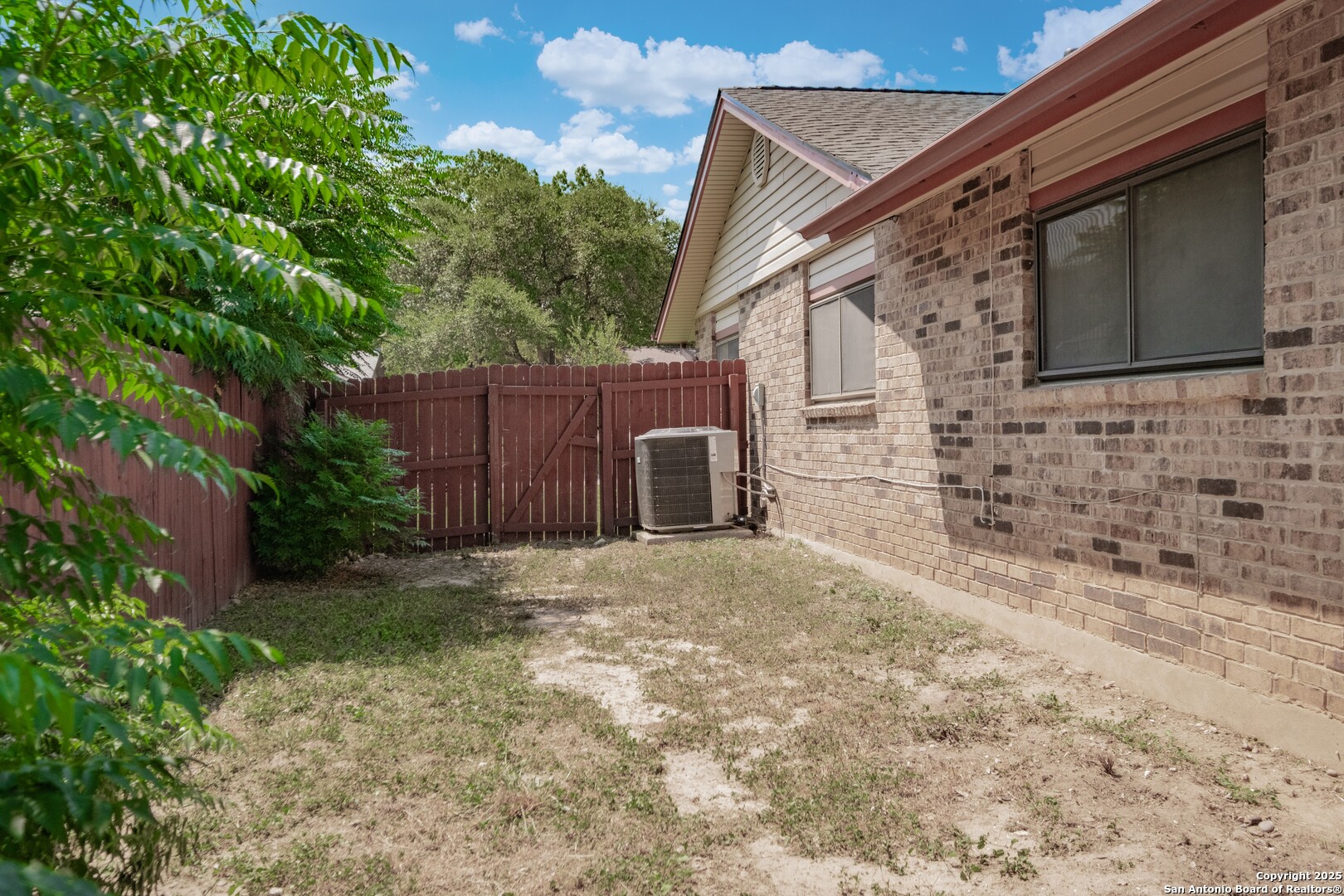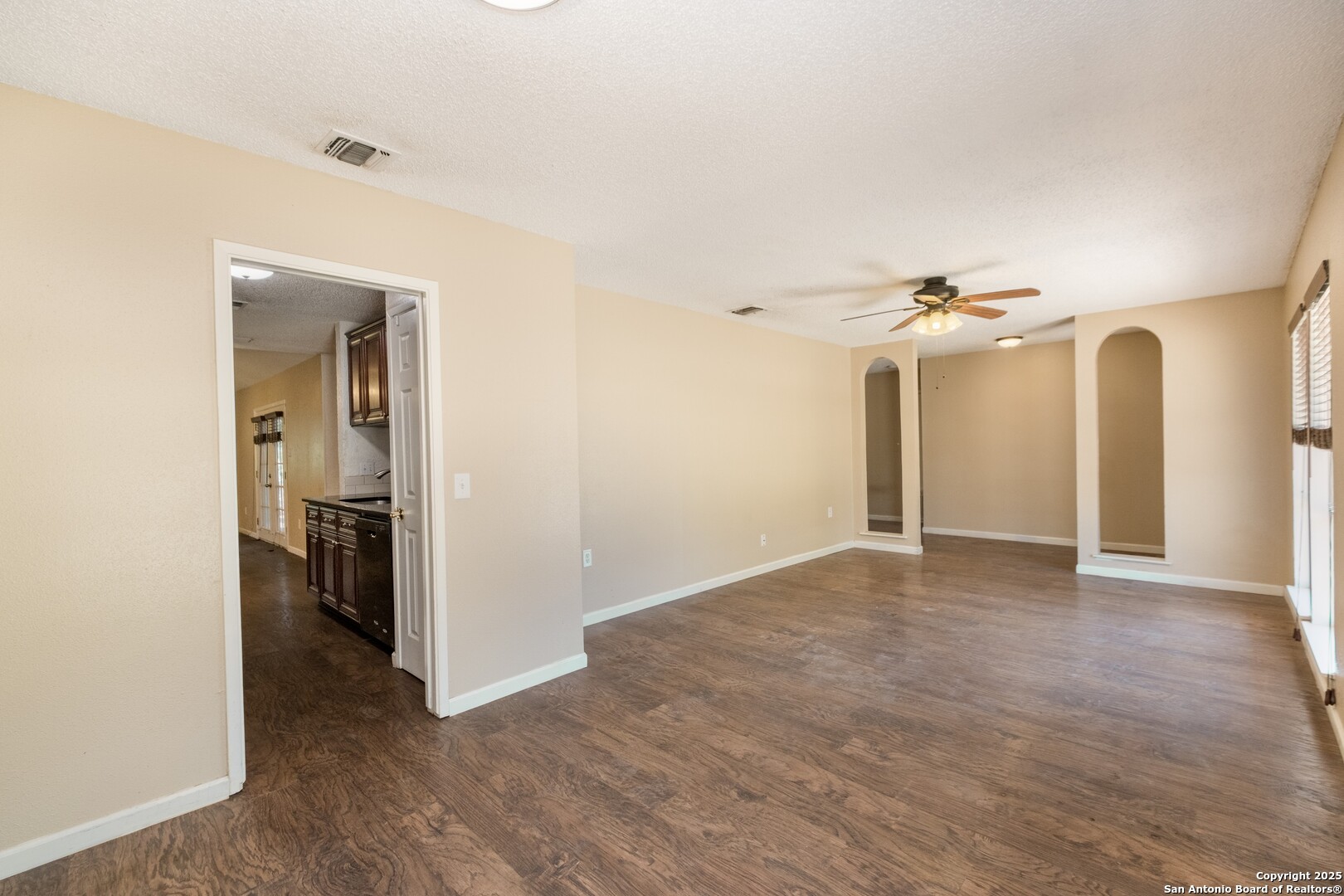 Prime Location! Just minutes from The Forum at Olympia Parkway and Triangle Shopping Center, this vacant 1-story, 4-bedroom, 2-bath home offers exceptional convenience to major retailers including Target, Best Buy, TJ Maxx, Costco, Ulta, Michaels, and more. Situated on a 0.24-acre lot and offering 1,836 sq ft of living space, the beautiful home features an open floor plan with high ceilings, wood flooring throughout, and two living areas that create comfortable spaces for both gathering and relaxing. The living areas offer access to the patio, adding to the home's indoor-outdoor flow. The dining area connects to the updated kitchen, completed in 2020, with granite counters and abundant cabinetry. The primary bedroom is located on the rear side of the home for privacy and features beamed ceilings, a two-door closet, an ensuite bath with a walk-in shower and single vanity, and access to the patio. Three additional spacious bedrooms complete the layout. The attached oversized two-car garage with double doors provides convenience, while the covered slab patio and extended wooden deck overlook a large fenced backyard ideal for entertaining. Additional highlights include a new roof in 2024, AC system replaced in 2021, sprinkler system in the front yard, a hot tub on the back deck that remains with the property, and all appliances including washer and dryer conveying with the sale. This home is vacant, move-in ready, and perfectly positioned in a beautiful neighborhood with unbeatable access to shopping, dining, commuter routes, and Randolph Air Force Base.