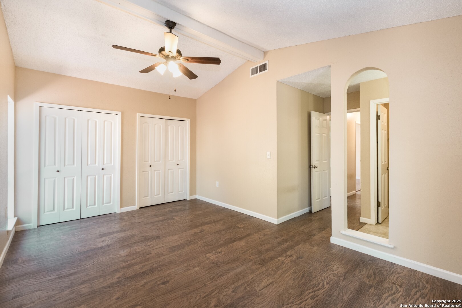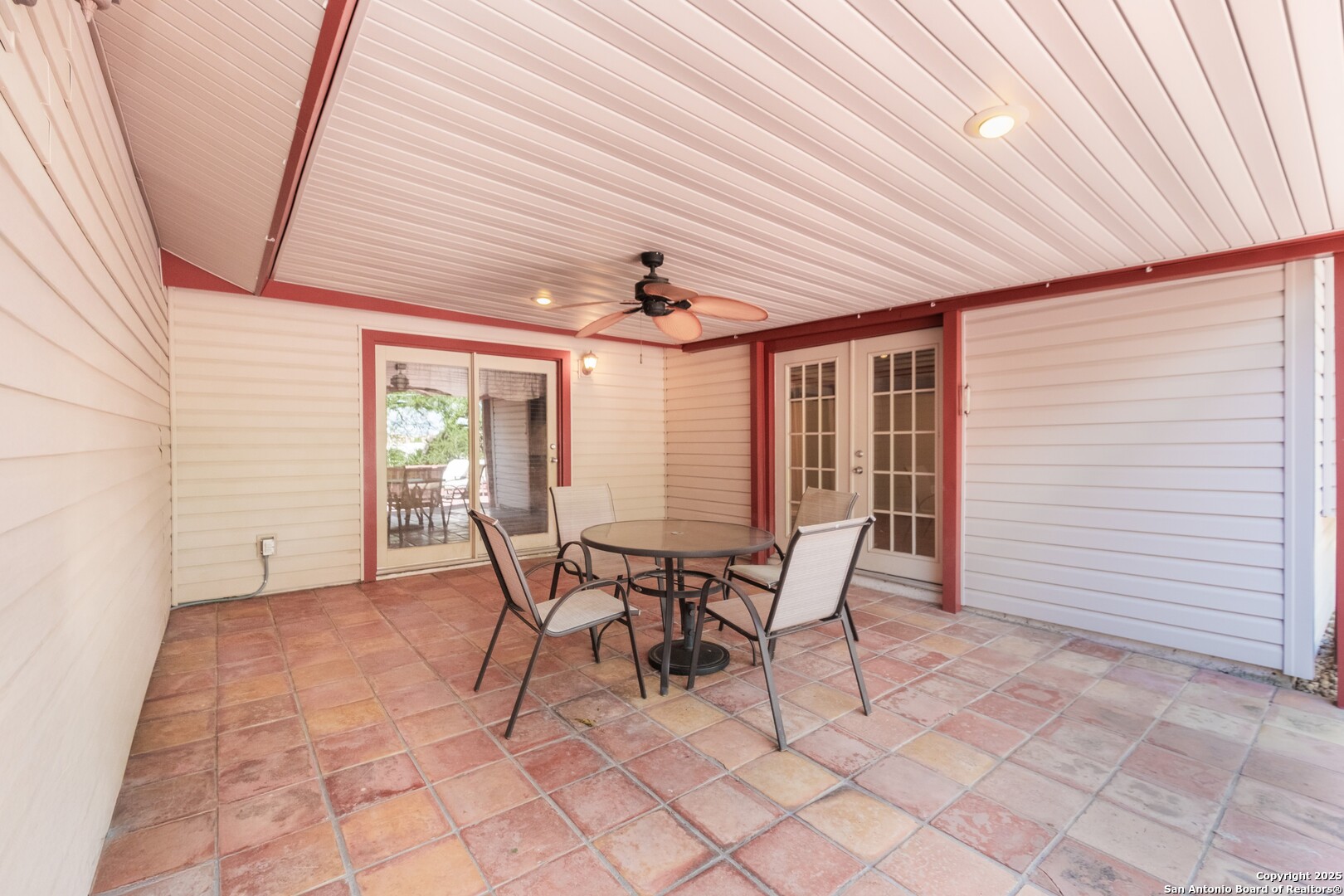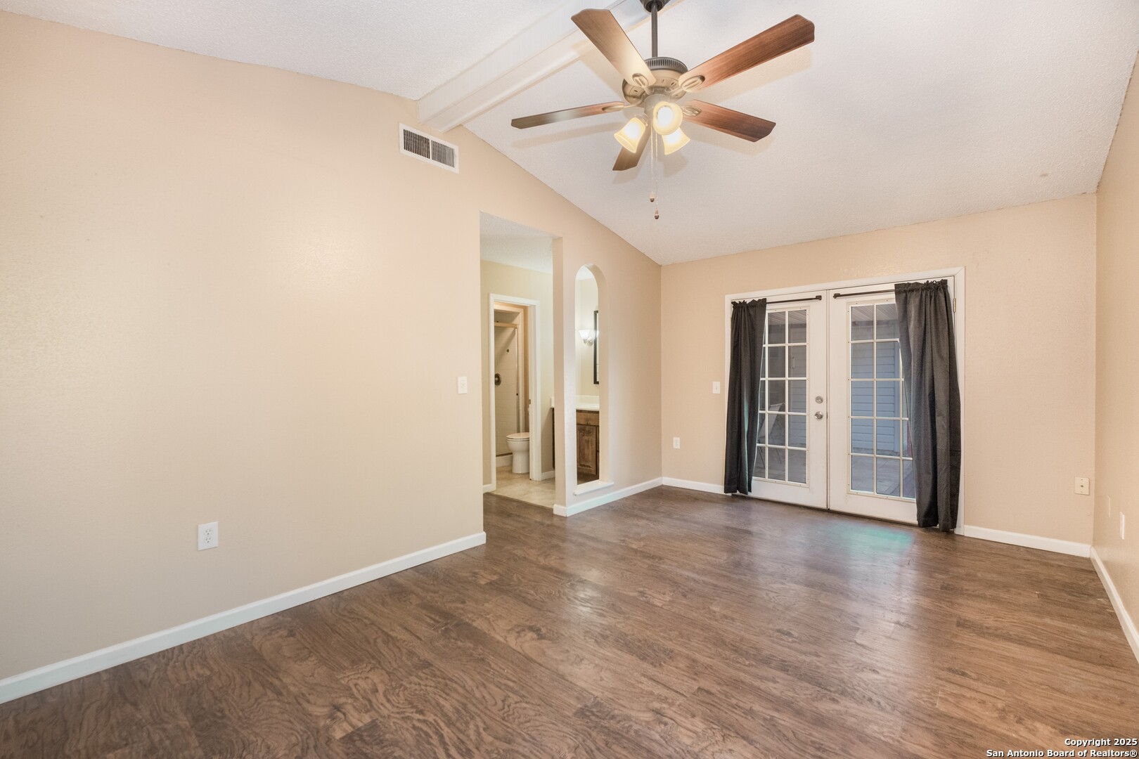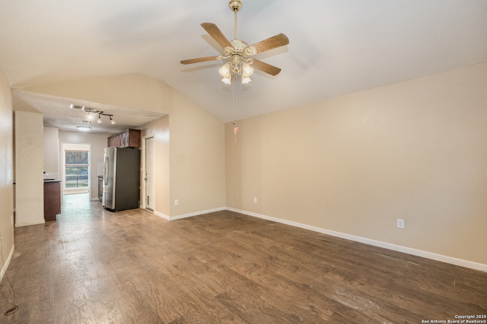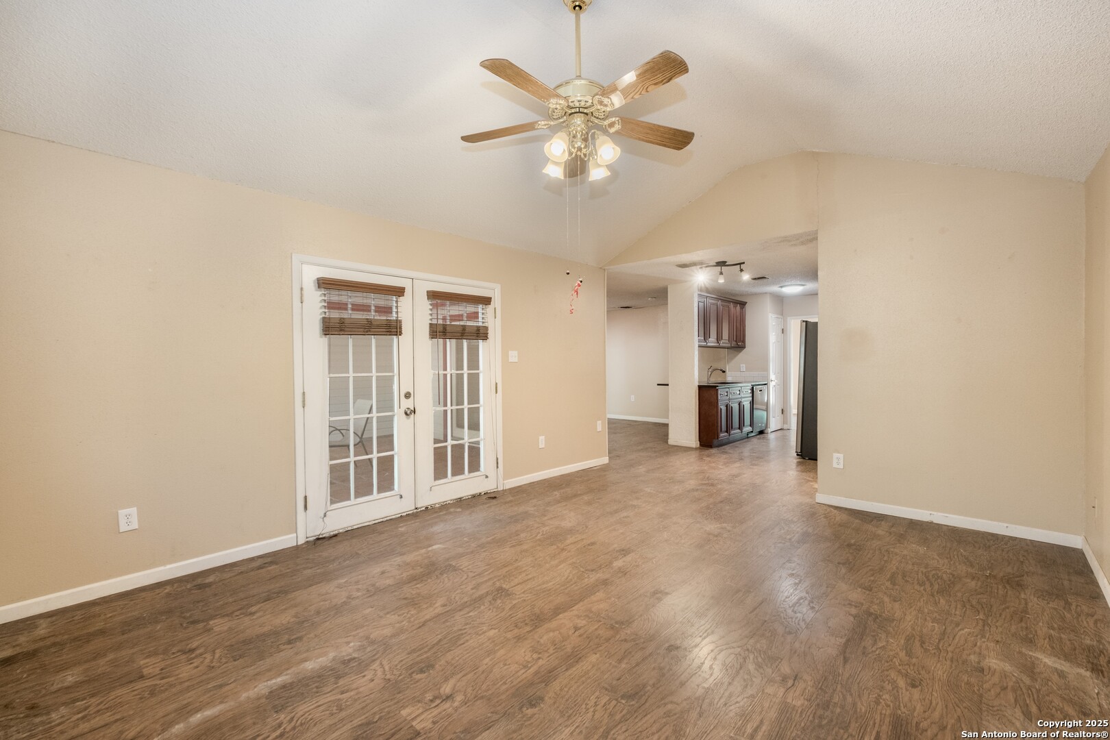 Prime Location! Just minutes from The Forum at Olympia Parkway and Triangle Shopping Center, this vacant 1-story, 4-bedroom, 2-bath home offers exceptional convenience to major retailers including Target, Best Buy, TJ Maxx, Costco, Ulta, Michaels, and more. Situated on a 0.24-acre lot and offering 1,836 sq ft of living space, the beautiful home features an open floor plan with high ceilings, wood flooring throughout, and two living areas that create comfortable spaces for both gathering and relaxing. The living areas offer access to the patio, adding to the home's indoor-outdoor flow. The dining area connects to the updated kitchen, completed in 2020, with granite counters and abundant cabinetry. The primary bedroom is located on the rear side of the home for privacy and features beamed ceilings, a two-door closet, an ensuite bath with a walk-in shower and single vanity, and access to the patio. Three additional spacious bedrooms complete the layout. The attached oversized two-car garage with double doors provides convenience, while the covered slab patio and extended wooden deck overlook a large fenced backyard ideal for entertaining. Additional highlights include a new roof in 2024, AC system replaced in 2021, sprinkler system in the front yard, a hot tub on the back deck that remains with the property, and all appliances including washer and dryer conveying with the sale. This home is vacant, move-in ready, and perfectly positioned in a beautiful neighborhood with unbeatable access to shopping, dining, commuter routes, and Randolph Air Force Base.