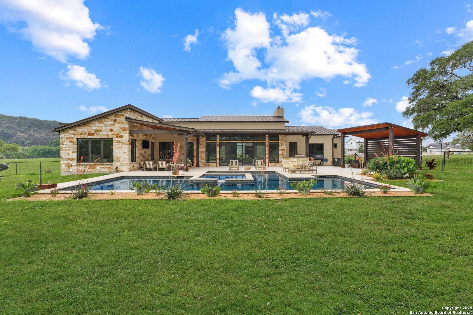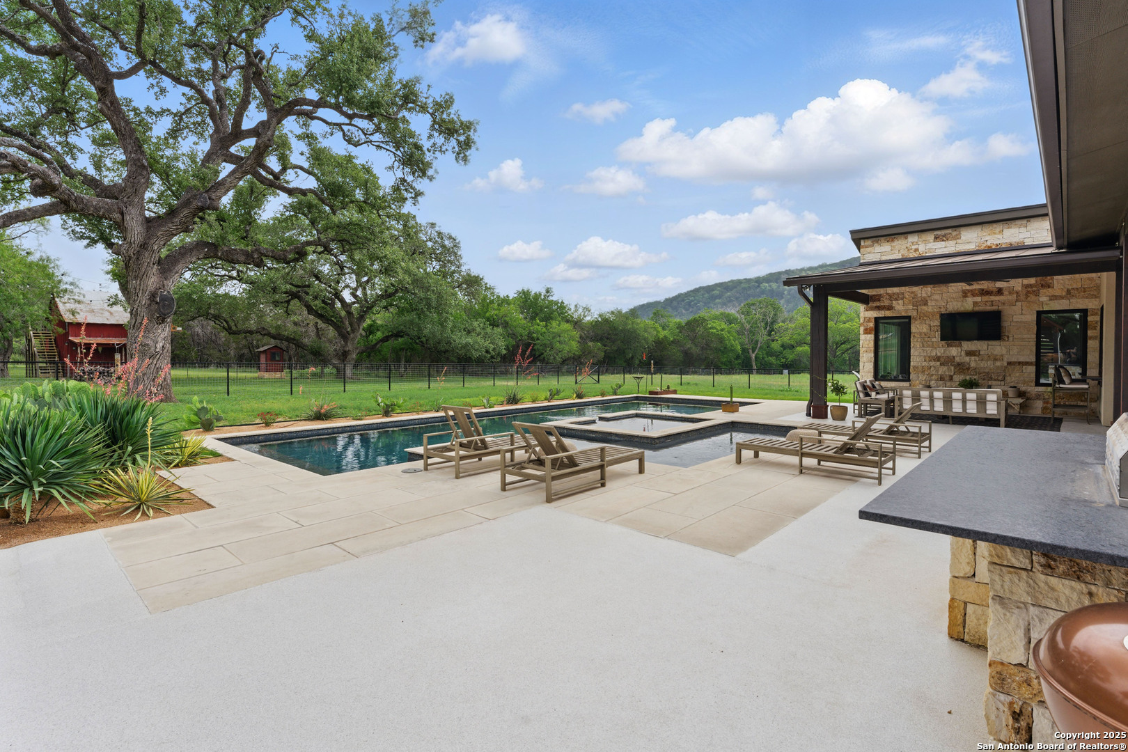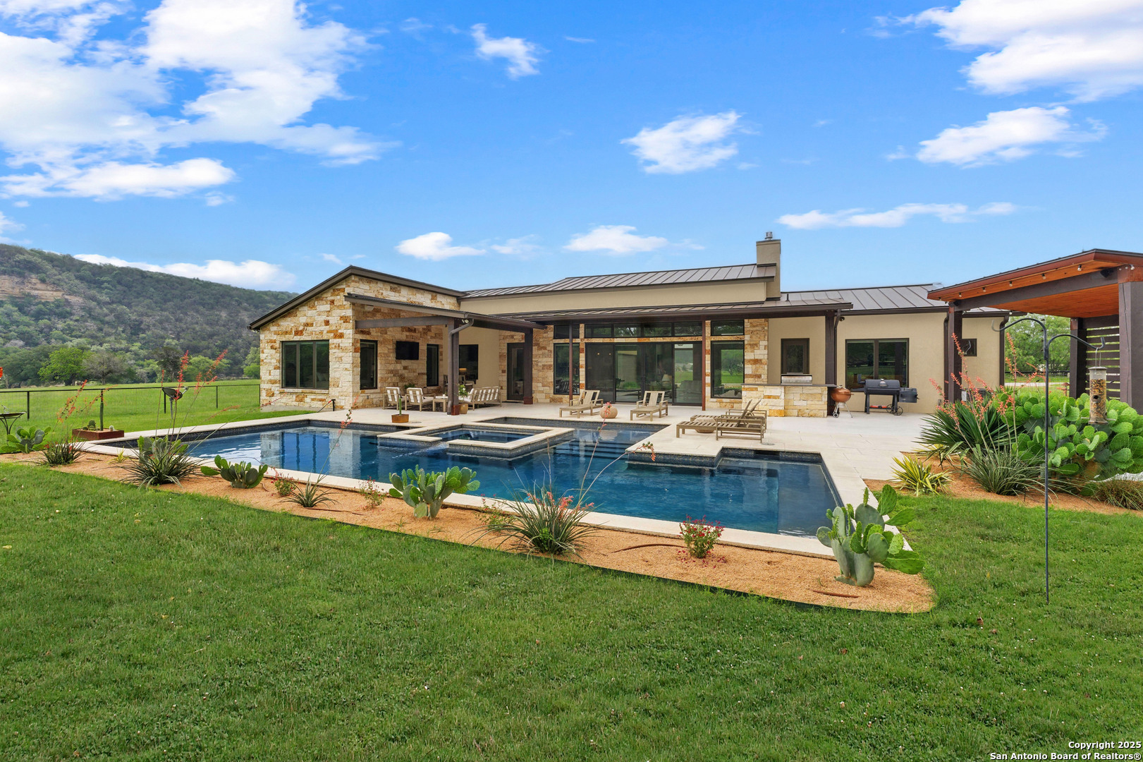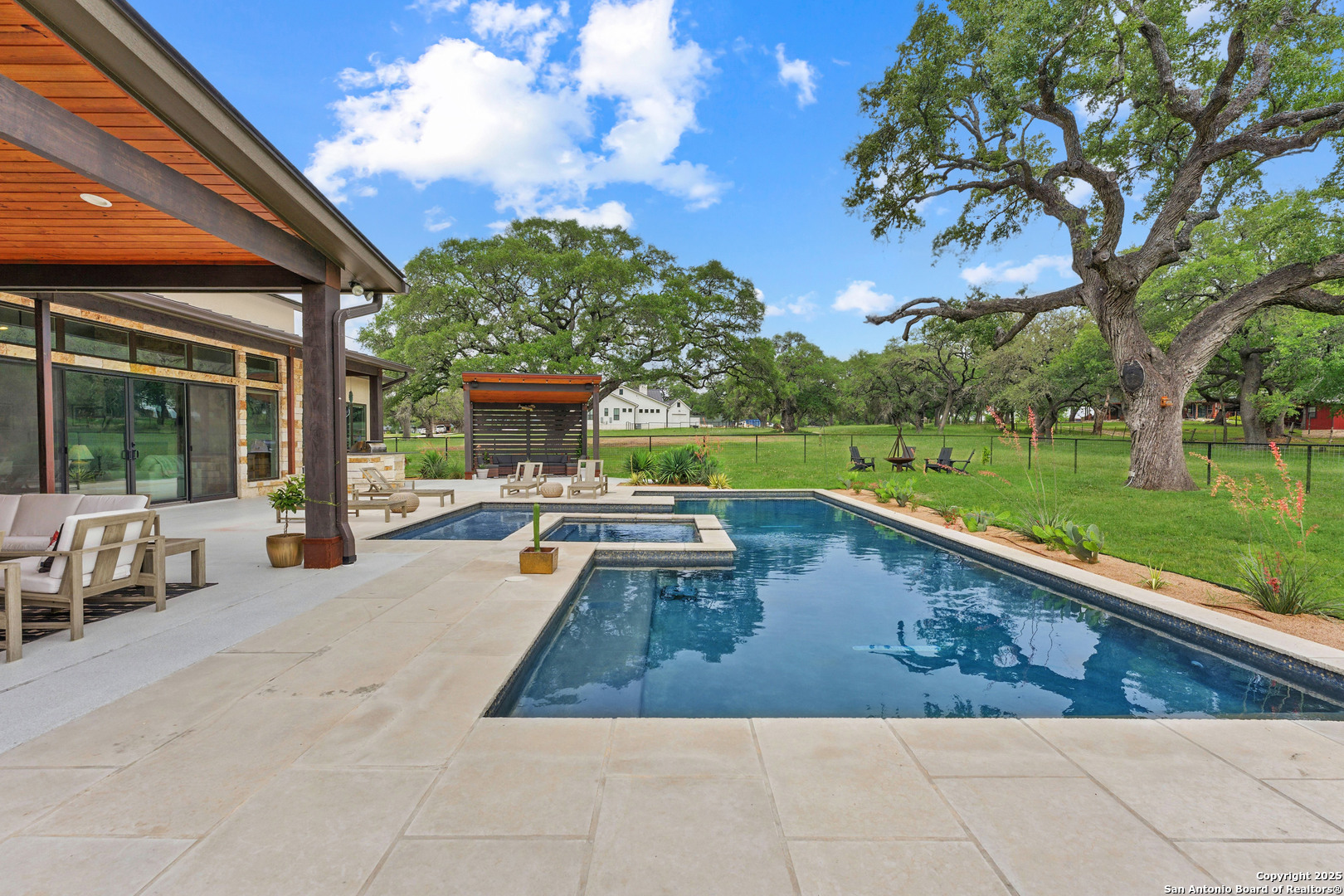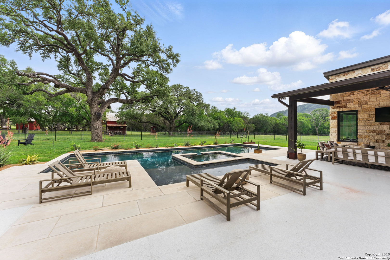 Exceptional Custom-Built Hill Country Home in Oxbow on the Guadalupe! Welcome to this one-of-a-kind custom-built 3-bedroom, 3.5-bathroom hill country home, nestled in the prestigious gated community of Oxbow on the Guadalupe in Canyon Lake, just outside New Braunfels. This stunning residence offers the perfect blend of rustic elegance and modern luxury, with exceptional attention to detail throughout. As you approach the home, you're greeted by elegant gas lanterns and a grand wrought iron door, setting the tone for the remarkable craftsmanship inside. Step through the entryway and into a spacious living area where luxury features abound. The open-concept design boasts a stone fireplace with a custom-made mantle, creating a warm and inviting focal point. High ceilings adorned with solid cedar beams add a touch of grandeur, while the Anderson sliding double glass doors flood the space with natural light and offer breathtaking views of the surrounding hill country. The living room seamlessly flows into the gourmet kitchen and outdoor living areas, creating an ideal space for both entertaining and relaxation. The chef-inspired kitchen is a true highlight, featuring sleek quartz countertops, a large island with abundant storage, and top-of-the-line appliances including a Wolfe gas cooktop, double ovens, a spacious fridge, and a wine fridge-perfect for preparing gourmet meals and entertaining with ease. The luxurious primary suite offers a serene retreat with a spa-like bathroom, complete with a soaking garden tub, a walk-in shower, quartz countertops, double vanity, and his-and-hers closets, providing ample space and functionality for everyday comfort. Plus, the conveniently located utility room is easily accessible from the primary suite. Step outside to your own private oasis, featuring an outdoor grilling area perfect for summer BBQ's, an expansive swimming pool with a heated jacuzzi for year-round enjoyment, and multiple inviting seating areas. A spacious covered patio with cozy window seating effortlessly opens to the chef's kitchen, creating a seamless flow for both casual meals and grand gatherings. For sun lovers, the stunning pergola offers the perfect spot for basking in the warmth, while the fire pit area provides a peaceful retreat under the stars-ideal for evening cocktails and intimate conversations. Whether you're enjoying a quiet evening by the fire or hosting a lively gathering, this home is designed to make every moment unforgettable. With its stunning craftsmanship, luxurious amenities, and breathtaking views, this hill country gem is a true sanctuary. Experience the perfect balance of style, comfort, and natural beauty in this extraordinary property.