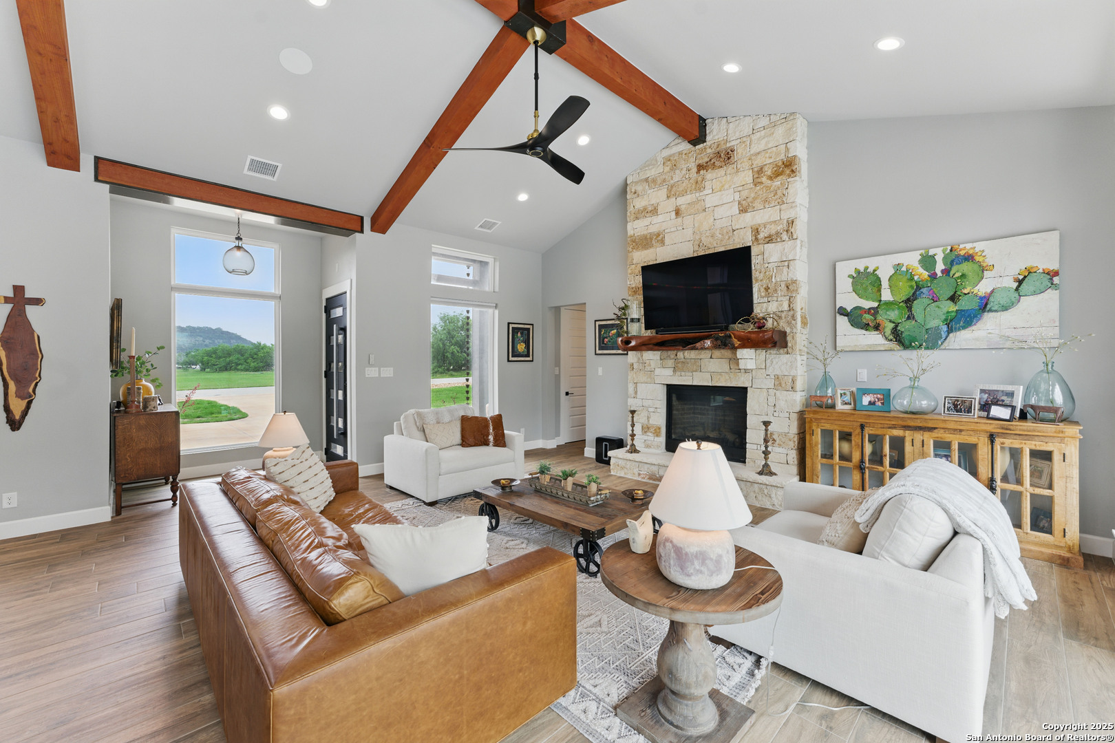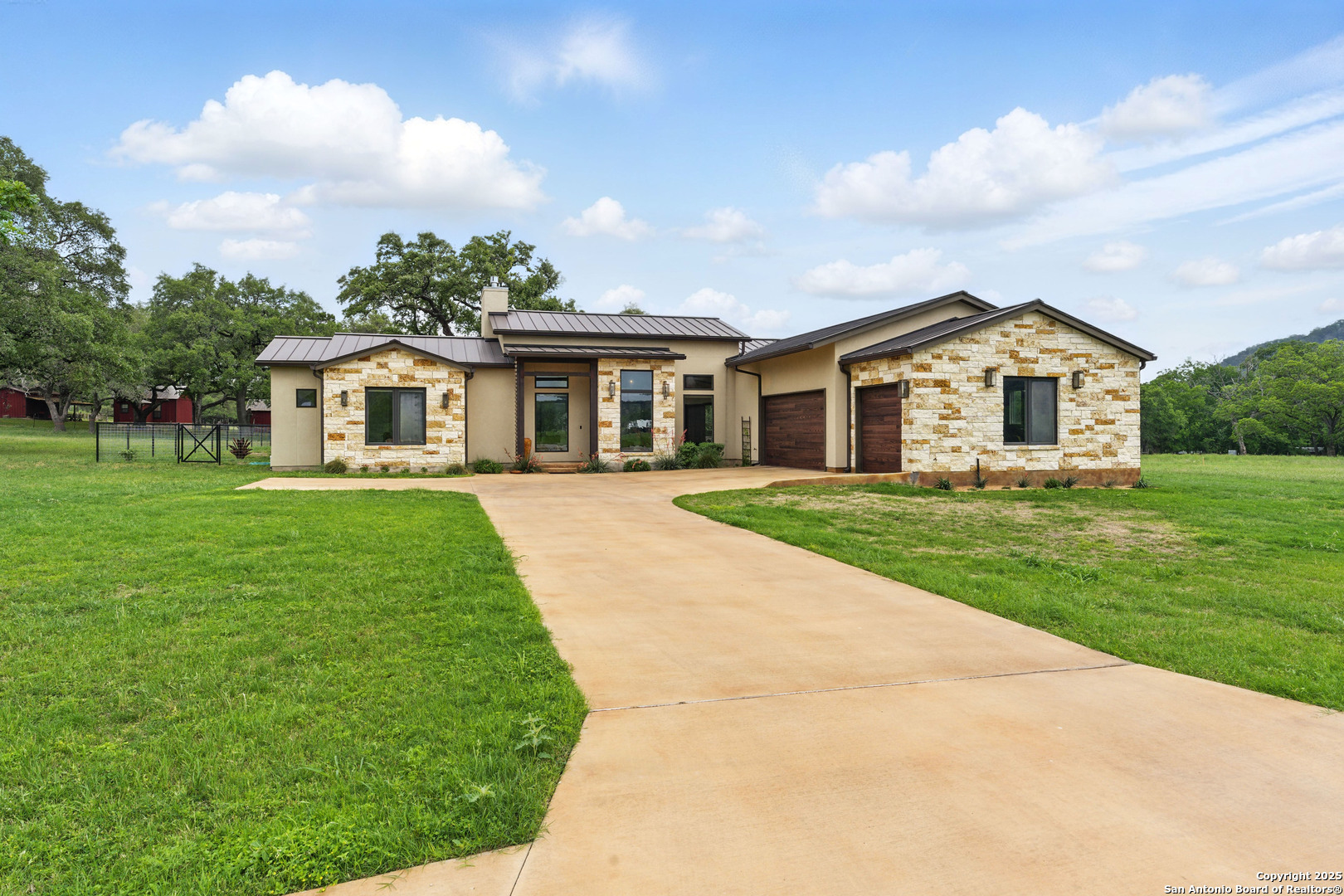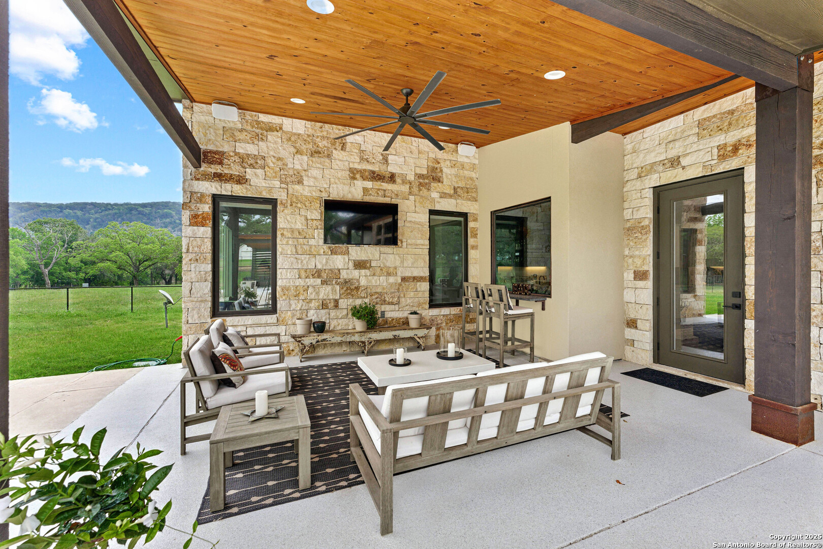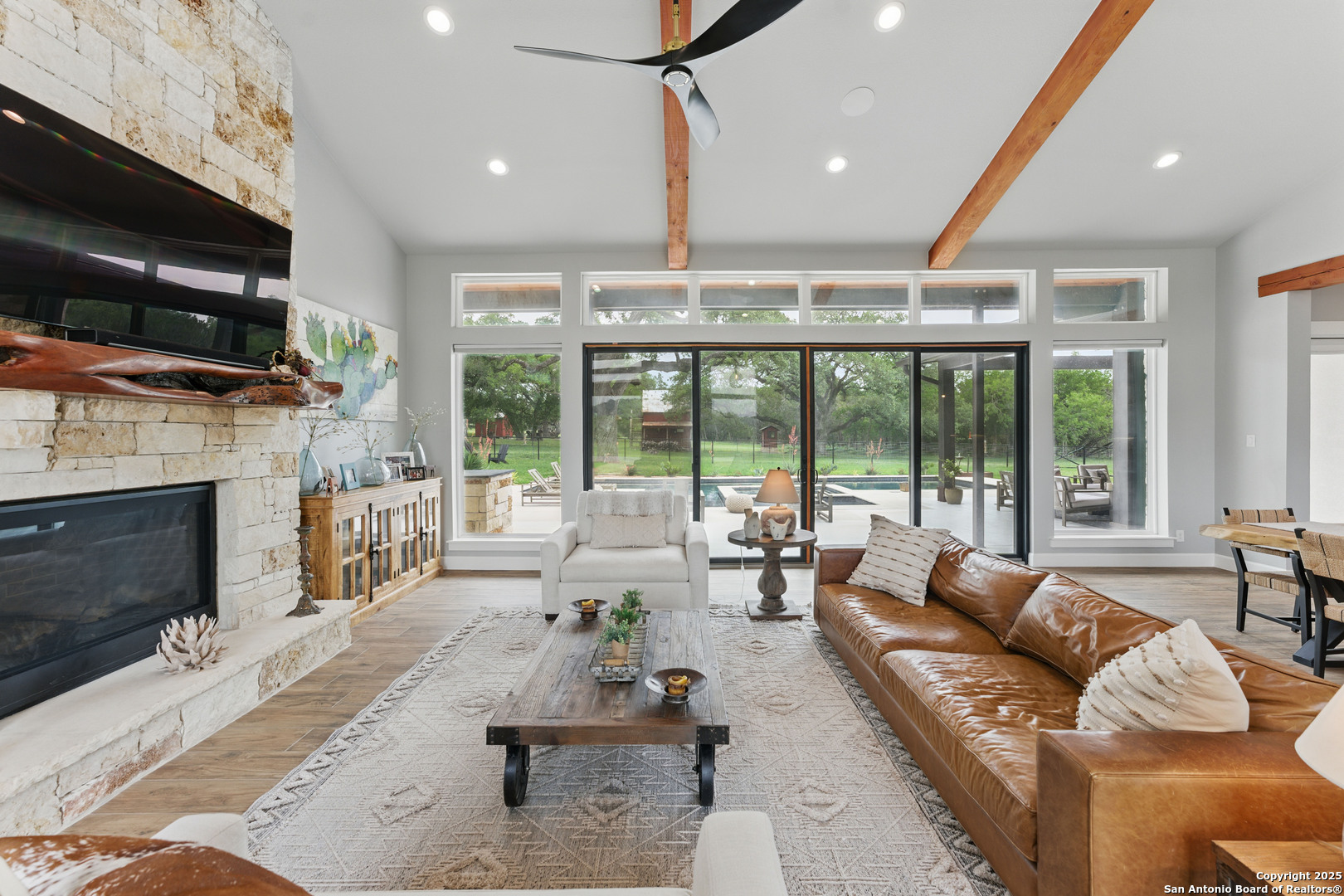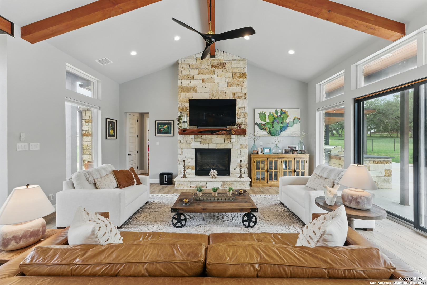 Exceptional Custom-Built Hill Country Home in Oxbow on the Guadalupe! Welcome to this one-of-a-kind custom-built 3-bedroom, 3.5-bathroom hill country home, nestled in the prestigious gated community of Oxbow on the Guadalupe in Canyon Lake, just outside New Braunfels. This stunning residence offers the perfect blend of rustic elegance and modern luxury, with exceptional attention to detail throughout. As you approach the home, you're greeted by elegant gas lanterns and a grand wrought iron door, setting the tone for the remarkable craftsmanship inside. Step through the entryway and into a spacious living area where luxury features abound. The open-concept design boasts a stone fireplace with a custom-made mantle, creating a warm and inviting focal point. High ceilings adorned with solid cedar beams add a touch of grandeur, while the Anderson sliding double glass doors flood the space with natural light and offer breathtaking views of the surrounding hill country. The living room seamlessly flows into the gourmet kitchen and outdoor living areas, creating an ideal space for both entertaining and relaxation. The chef-inspired kitchen is a true highlight, featuring sleek quartz countertops, a large island with abundant storage, and top-of-the-line appliances including a Wolfe gas cooktop, double ovens, a spacious fridge, and a wine fridge-perfect for preparing gourmet meals and entertaining with ease. The luxurious primary suite offers a serene retreat with a spa-like bathroom, complete with a soaking garden tub, a walk-in shower, quartz countertops, double vanity, and his-and-hers closets, providing ample space and functionality for everyday comfort. Plus, the conveniently located utility room is easily accessible from the primary suite. Step outside to your own private oasis, featuring an outdoor grilling area perfect for summer BBQ's, an expansive swimming pool with a heated jacuzzi for year-round enjoyment, and multiple inviting seating areas. A spacious covered patio with cozy window seating effortlessly opens to the chef's kitchen, creating a seamless flow for both casual meals and grand gatherings. For sun lovers, the stunning pergola offers the perfect spot for basking in the warmth, while the fire pit area provides a peaceful retreat under the stars-ideal for evening cocktails and intimate conversations. Whether you're enjoying a quiet evening by the fire or hosting a lively gathering, this home is designed to make every moment unforgettable. With its stunning craftsmanship, luxurious amenities, and breathtaking views, this hill country gem is a true sanctuary. Experience the perfect balance of style, comfort, and natural beauty in this extraordinary property.