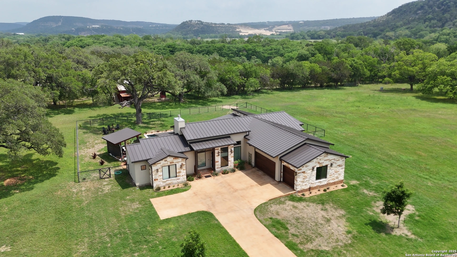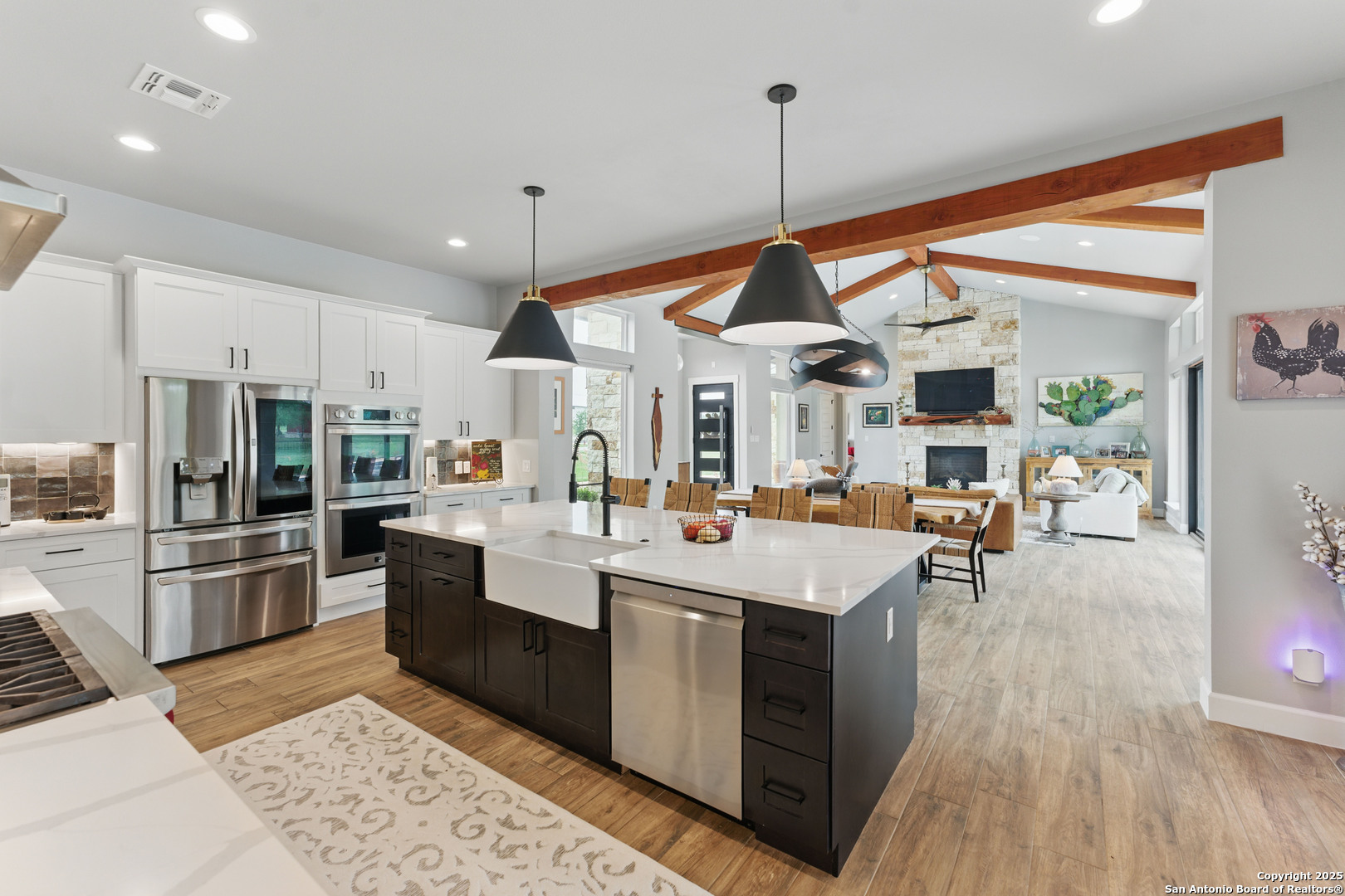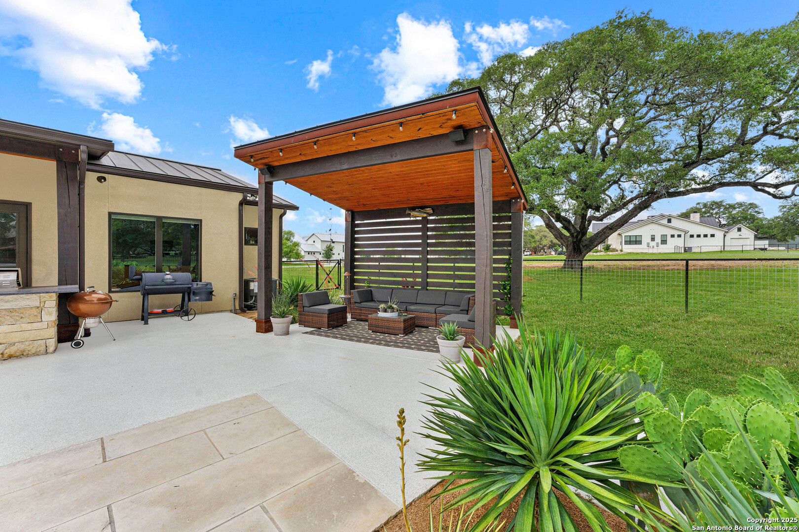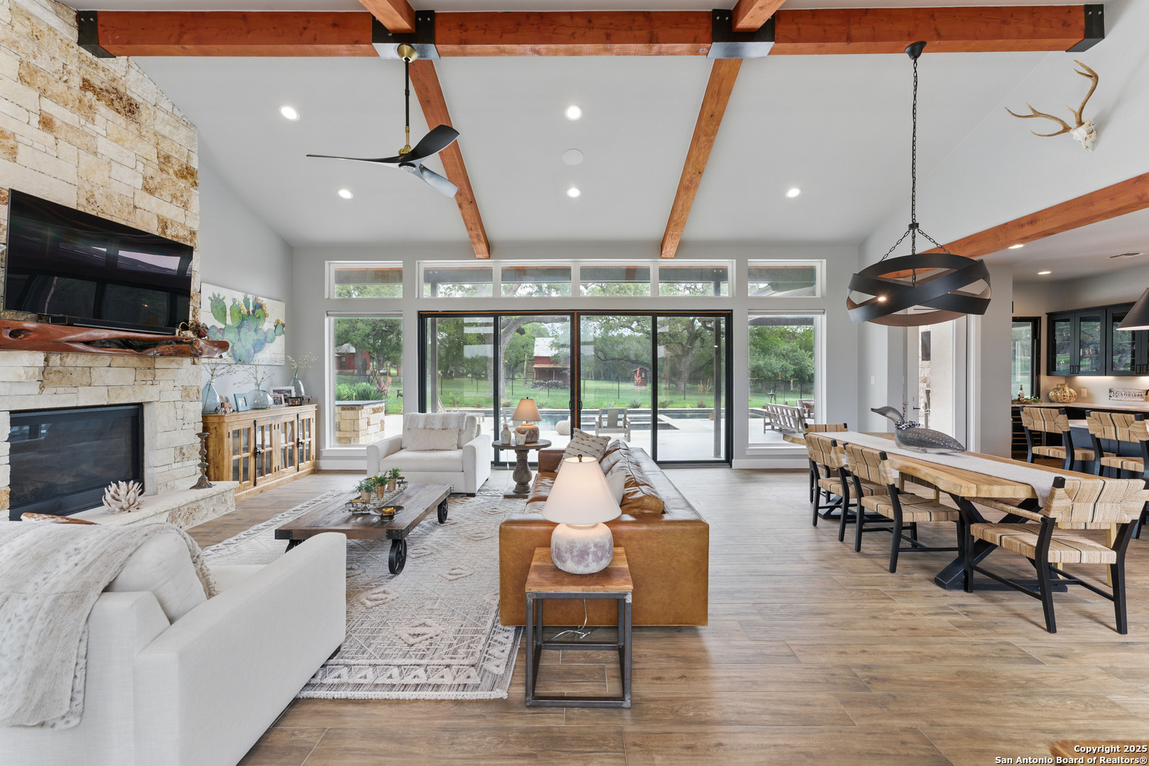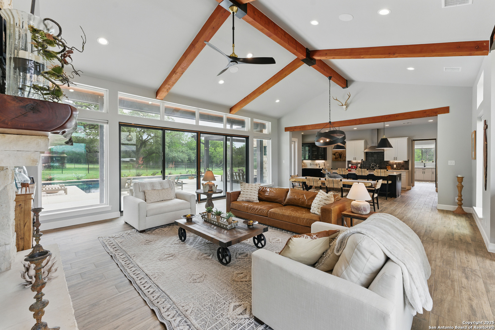 Exceptional Custom-Built Hill Country Home in Oxbow on the Guadalupe! Welcome to this one-of-a-kind custom-built 3-bedroom, 3.5-bathroom hill country home, nestled in the prestigious gated community of Oxbow on the Guadalupe in Canyon Lake, just outside New Braunfels. This stunning residence offers the perfect blend of rustic elegance and modern luxury, with exceptional attention to detail throughout. As you approach the home, you're greeted by elegant gas lanterns and a grand wrought iron door, setting the tone for the remarkable craftsmanship inside. Step through the entryway and into a spacious living area where luxury features abound. The open-concept design boasts a stone fireplace with a custom-made mantle, creating a warm and inviting focal point. High ceilings adorned with solid cedar beams add a touch of grandeur, while the Anderson sliding double glass doors flood the space with natural light and offer breathtaking views of the surrounding hill country. The living room seamlessly flows into the gourmet kitchen and outdoor living areas, creating an ideal space for both entertaining and relaxation. The chef-inspired kitchen is a true highlight, featuring sleek quartz countertops, a large island with abundant storage, and top-of-the-line appliances including a Wolfe gas cooktop, double ovens, a spacious fridge, and a wine fridge-perfect for preparing gourmet meals and entertaining with ease. The luxurious primary suite offers a serene retreat with a spa-like bathroom, complete with a soaking garden tub, a walk-in shower, quartz countertops, double vanity, and his-and-hers closets, providing ample space and functionality for everyday comfort. Plus, the conveniently located utility room is easily accessible from the primary suite. Step outside to your own private oasis, featuring an outdoor grilling area perfect for summer BBQ's, an expansive swimming pool with a heated jacuzzi for year-round enjoyment, and multiple inviting seating areas. A spacious covered patio with cozy window seating effortlessly opens to the chef's kitchen, creating a seamless flow for both casual meals and grand gatherings. For sun lovers, the stunning pergola offers the perfect spot for basking in the warmth, while the fire pit area provides a peaceful retreat under the stars-ideal for evening cocktails and intimate conversations. Whether you're enjoying a quiet evening by the fire or hosting a lively gathering, this home is designed to make every moment unforgettable. With its stunning craftsmanship, luxurious amenities, and breathtaking views, this hill country gem is a true sanctuary. Experience the perfect balance of style, comfort, and natural beauty in this extraordinary property.