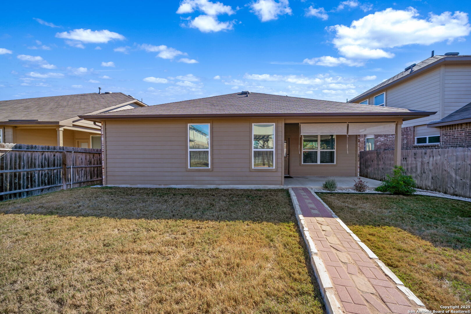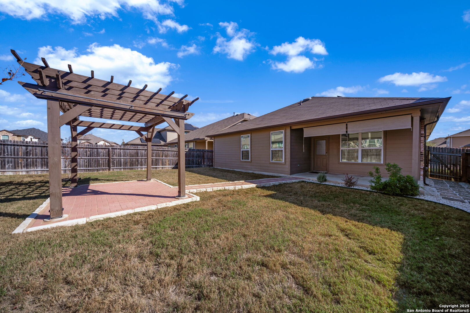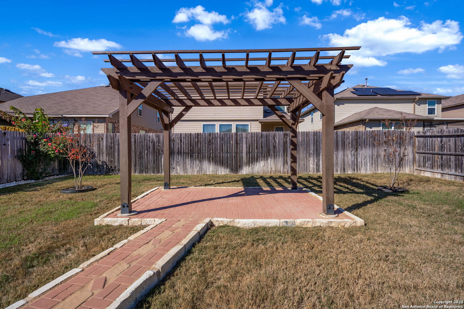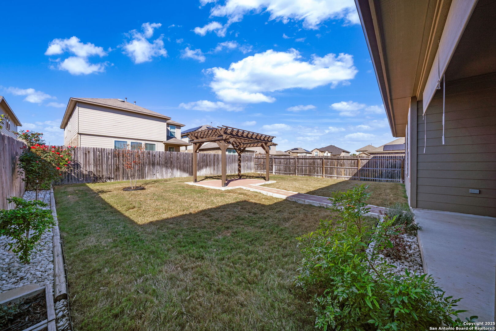 This single story 4 bedroom, 2 bathroom home features an open concept layout that seamlessly connects the living, dining, and kitchen areas. The spacious eat in kitchen offers granite countertops, a large island, abundant storage, and a bright breakfast area perfect for everyday meals. The primary bedroom is privately situated off the living room and includes two large windows that fill the space with natural light, along with a generous walk in closet with built ins and a well appointed primary bathroom with a soaking tub and separate shower. Cozy secondary bedrooms and a large secondary bathroom provide comfort and flexibility for family or guests. Step outside to a large covered patio with a pergola overlooking the backyard, along with solar panels that convey for added efficiency. Located in a great area with access to desirable amenities, this home combines comfort, convenience, and thoughtful design throughout.