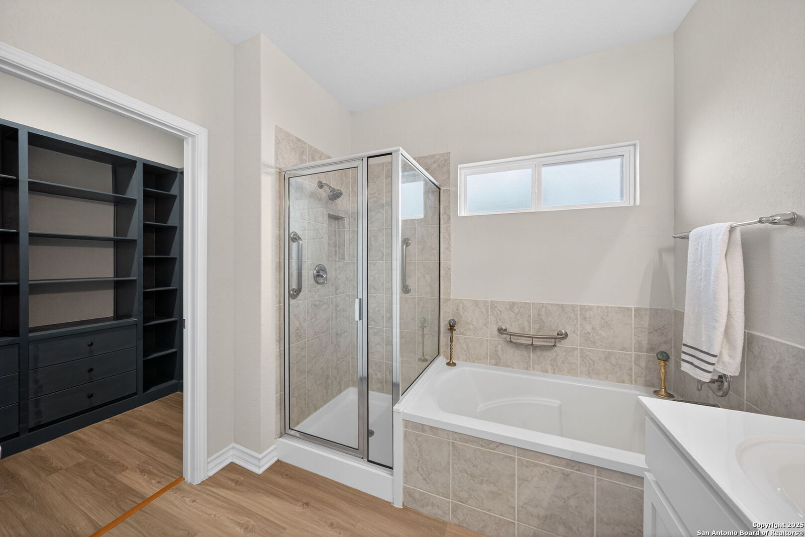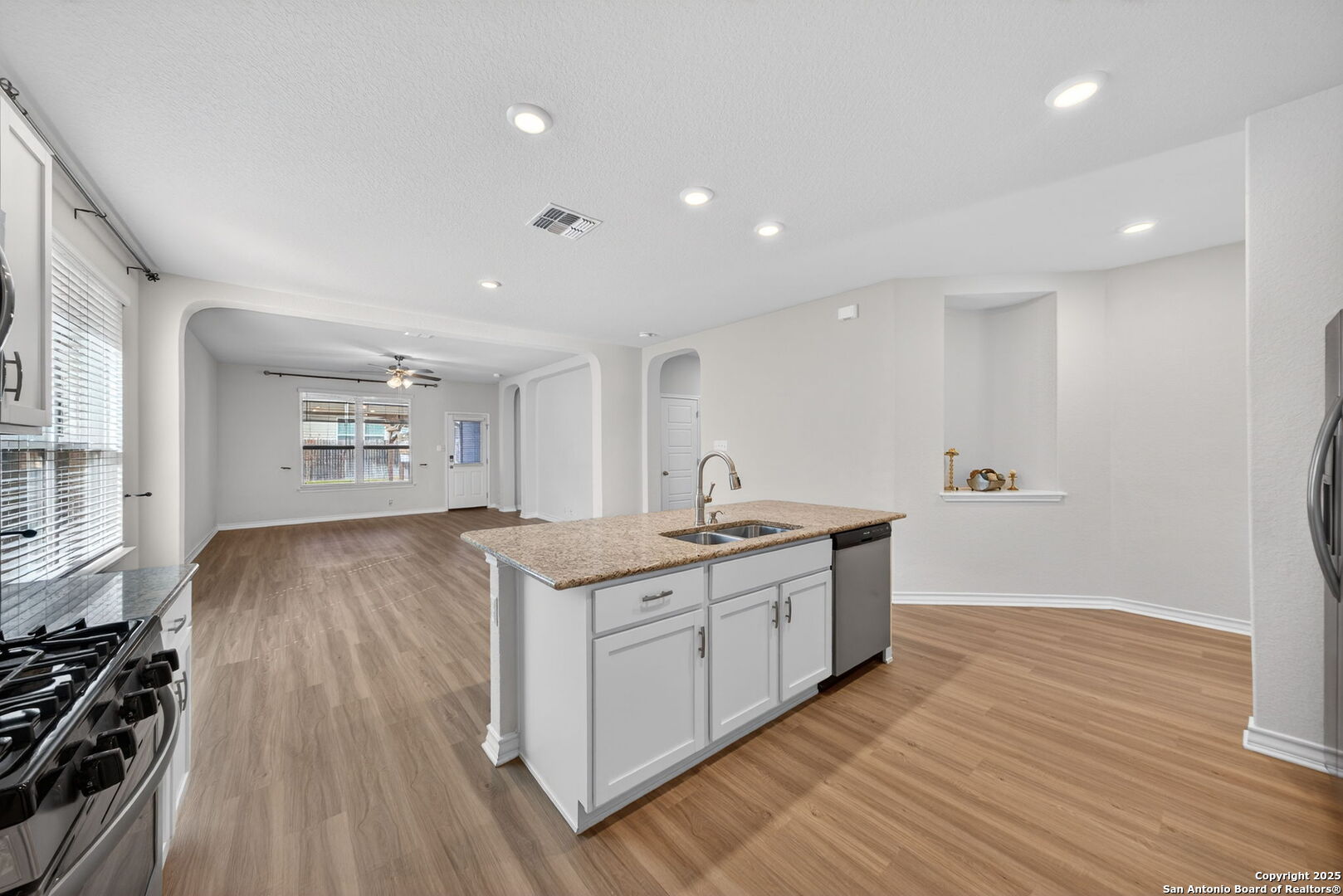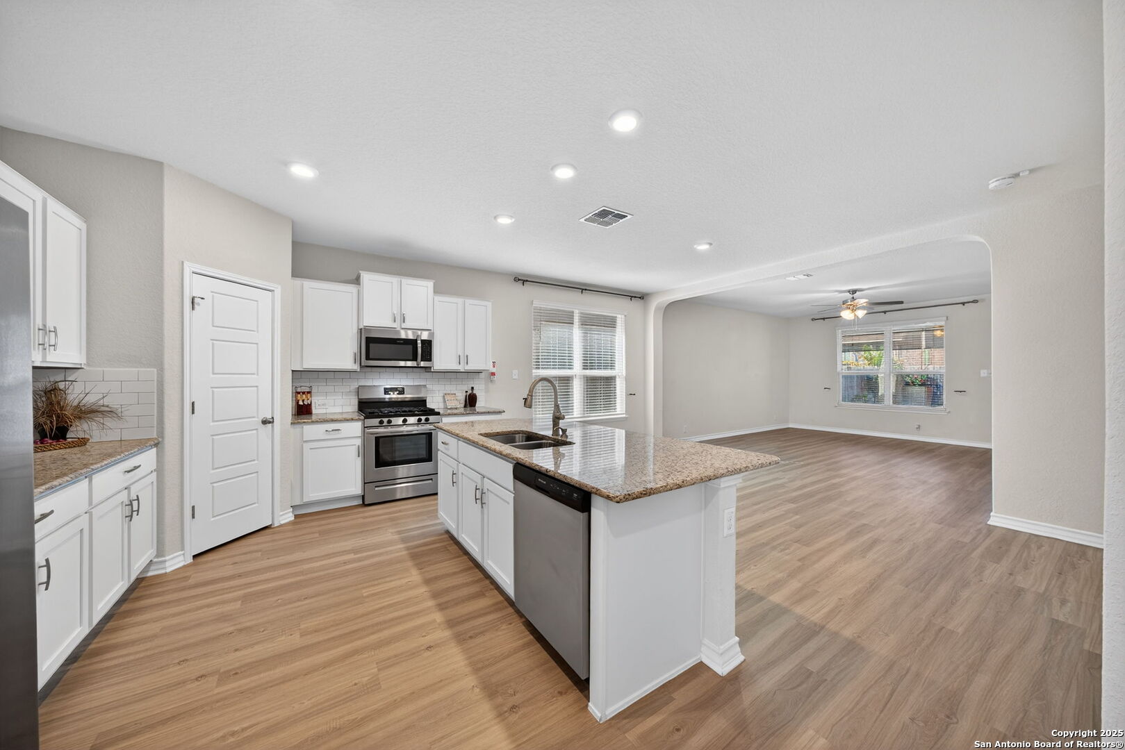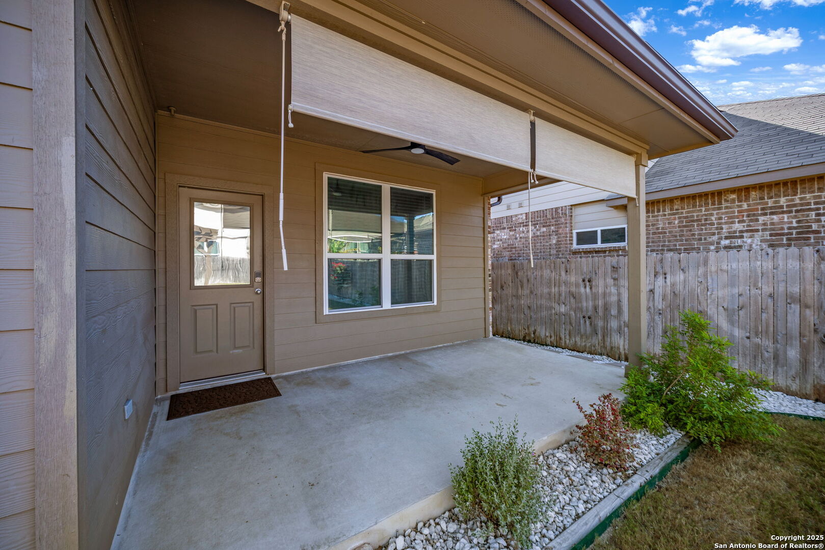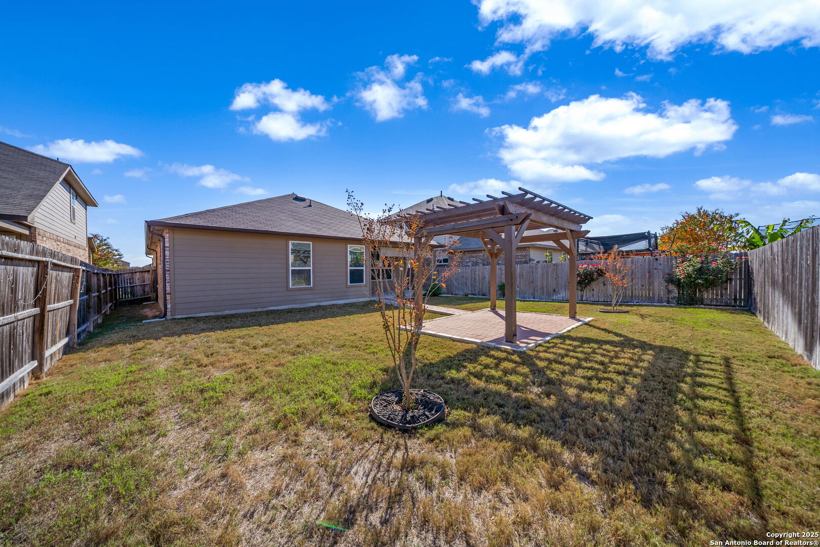 This single story 4 bedroom, 2 bathroom home features an open concept layout that seamlessly connects the living, dining, and kitchen areas. The spacious eat in kitchen offers granite countertops, a large island, abundant storage, and a bright breakfast area perfect for everyday meals. The primary bedroom is privately situated off the living room and includes two large windows that fill the space with natural light, along with a generous walk in closet with built ins and a well appointed primary bathroom with a soaking tub and separate shower. Cozy secondary bedrooms and a large secondary bathroom provide comfort and flexibility for family or guests. Step outside to a large covered patio with a pergola overlooking the backyard, along with solar panels that convey for added efficiency. Located in a great area with access to desirable amenities, this home combines comfort, convenience, and thoughtful design throughout.