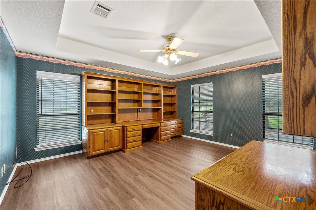 Welcome to Woodway's serene cul-de-sac, where this elegant five-bedroom, three-bath home blends privacy with stunning water views. The living room captivates with wooden beams and a cozy wood-burning fireplace, ideal for family/friend gatherings. The kitchen combines functionality and style, featuring granite countertops, custom cabinets with pull-outs and spice racks, and a central island. Recessed lighting showcases these exquisite details. The primary bathroom offers a spa-like experience with a heat warmer upon existing the shower, sky light, garden tub, and a water softener enhancing comfort, along with his-and-her walk-in closets. Spacious four additional bedrooms, 14x15 bedroom works as a perfect office, includes built-in bookshelves and desks for professional or academic needs. The versatile loft area with skylights includes a built-in entertainment center, while the walk-in attic includes a flex room providing tranquil space for play or meditation. Outdoors, enjoy a brick exterior, large shade trees, sprinkler system, an inviting in-ground pool with a slide and diving board, gazebo with an outdoor sink. If you wish to have a hot tub the connections are already in place. A 24x13 workshop attached to the three-car carport is perfect for hobbyists and craftspeople. Storage room for pool supplies and a separate space for garden preparation.