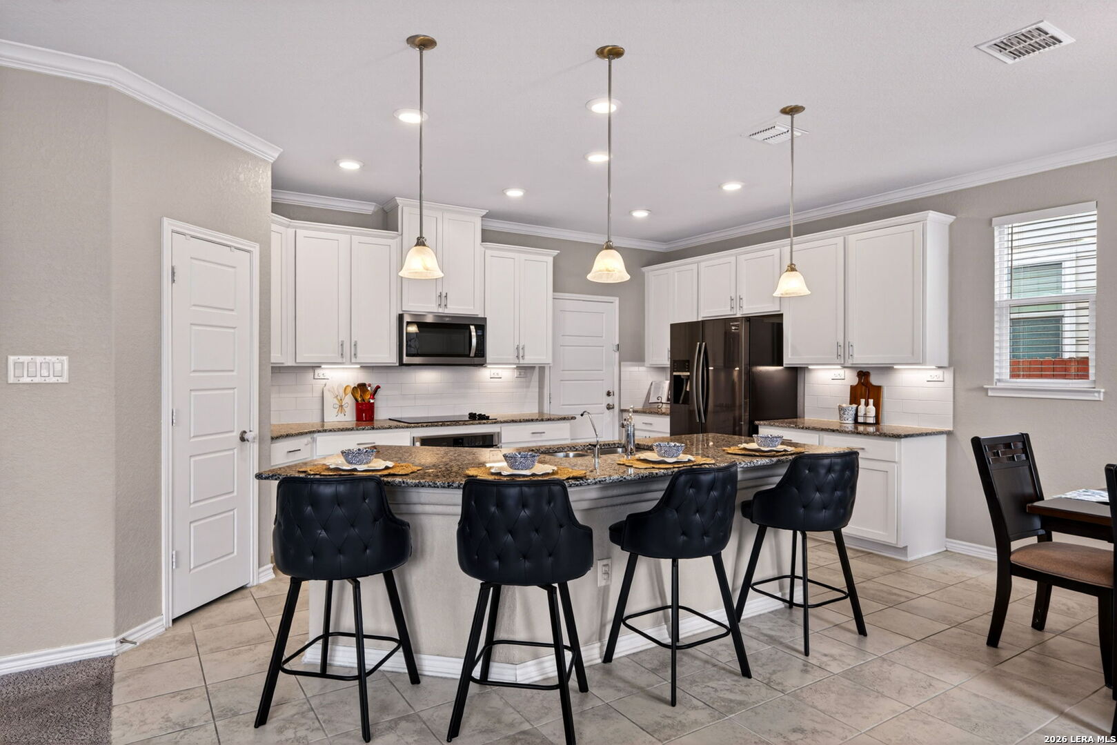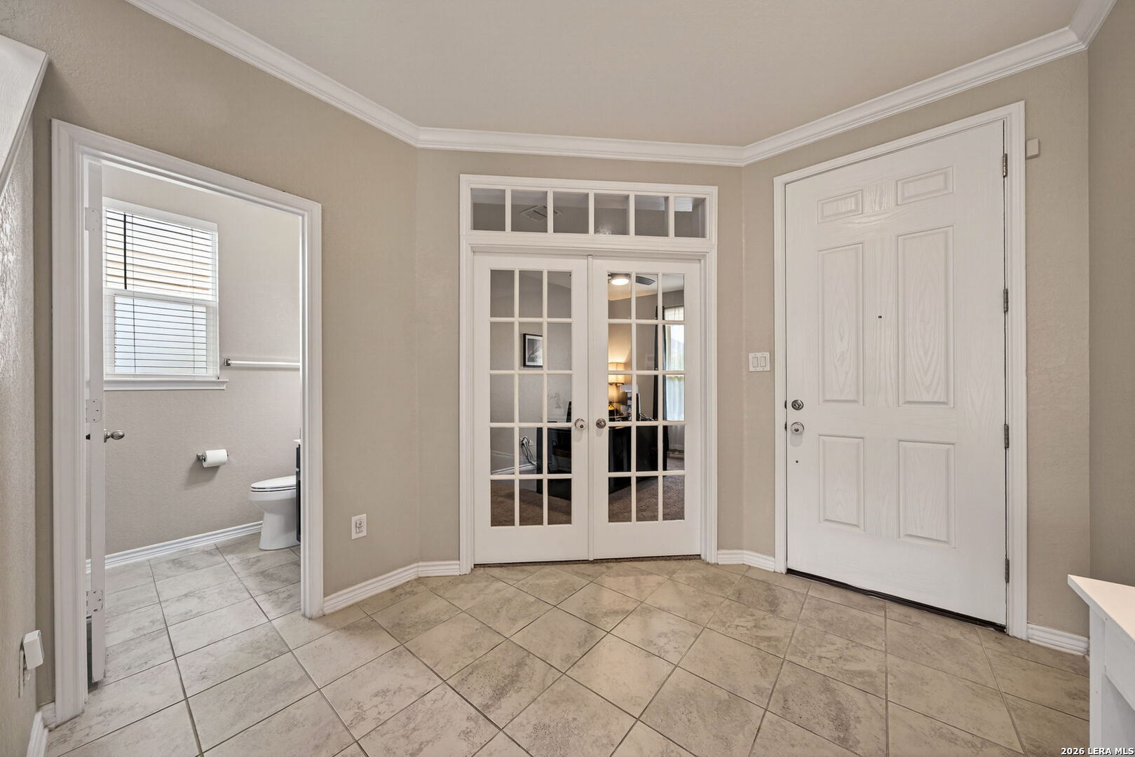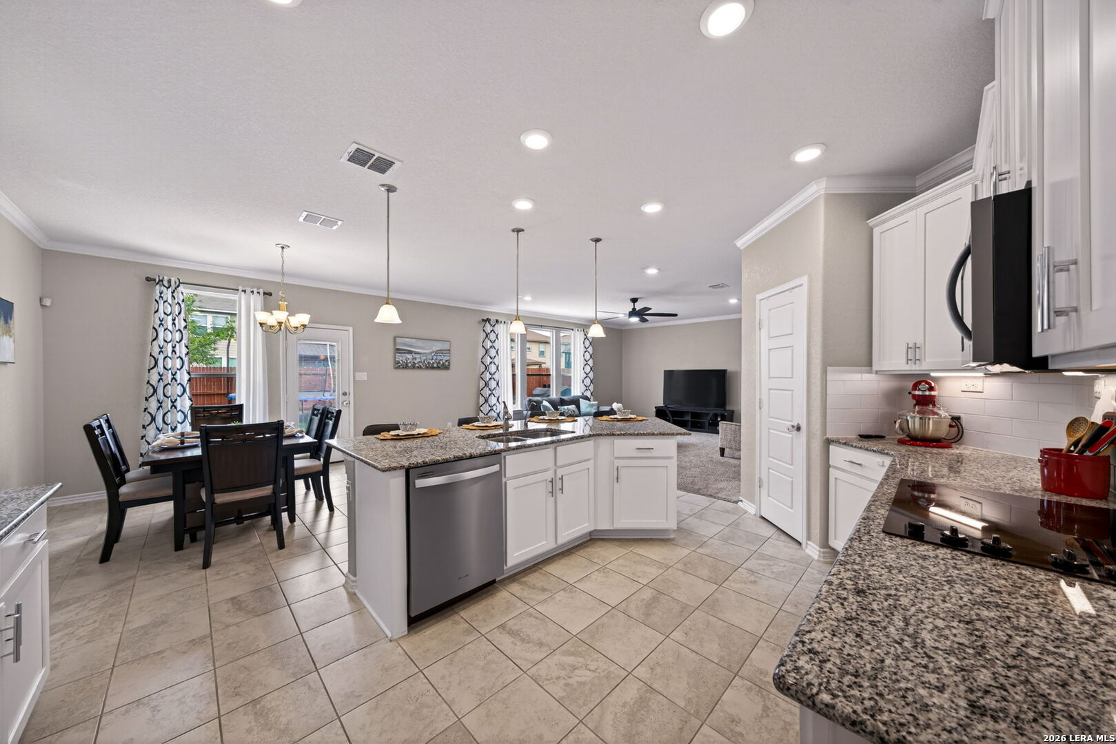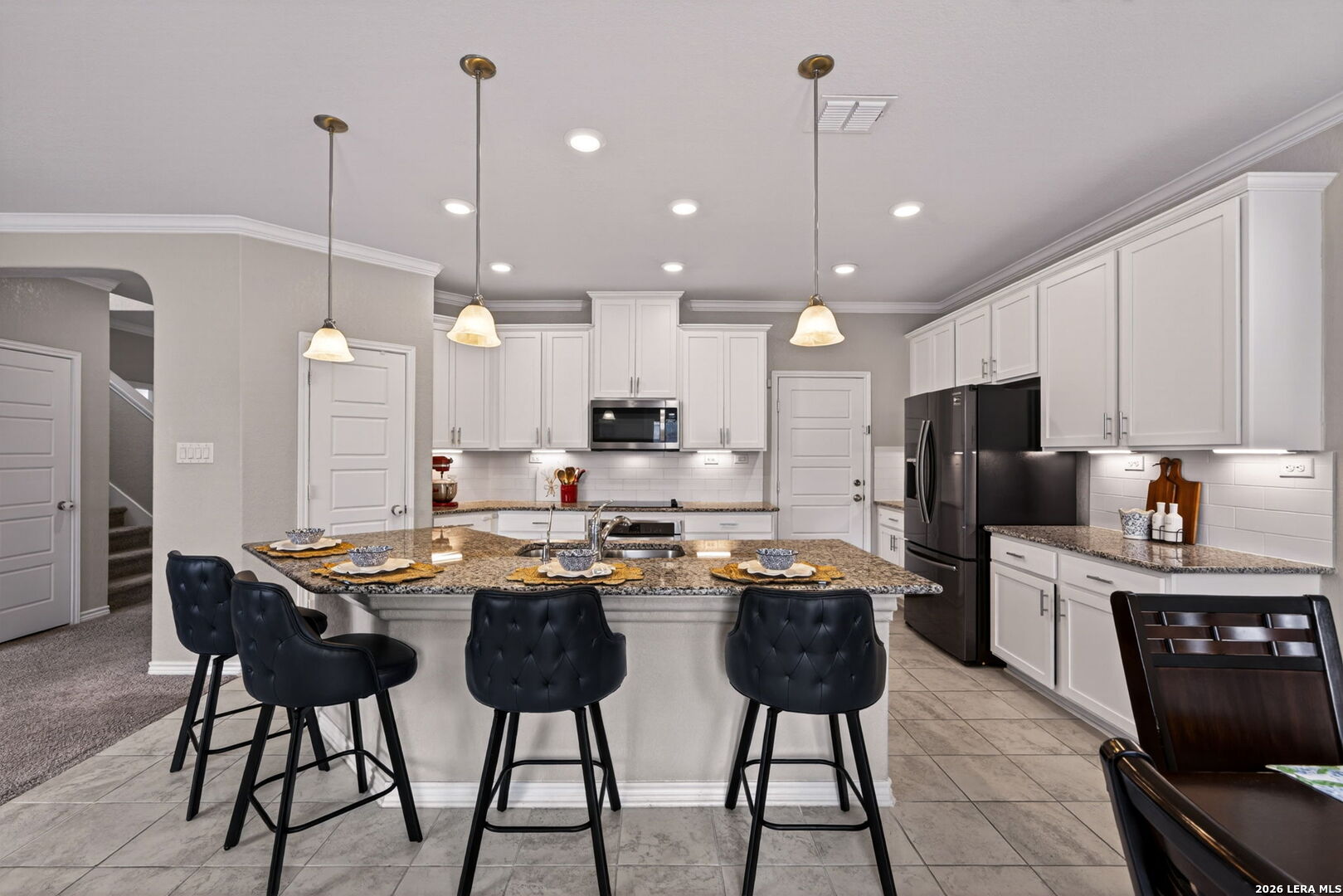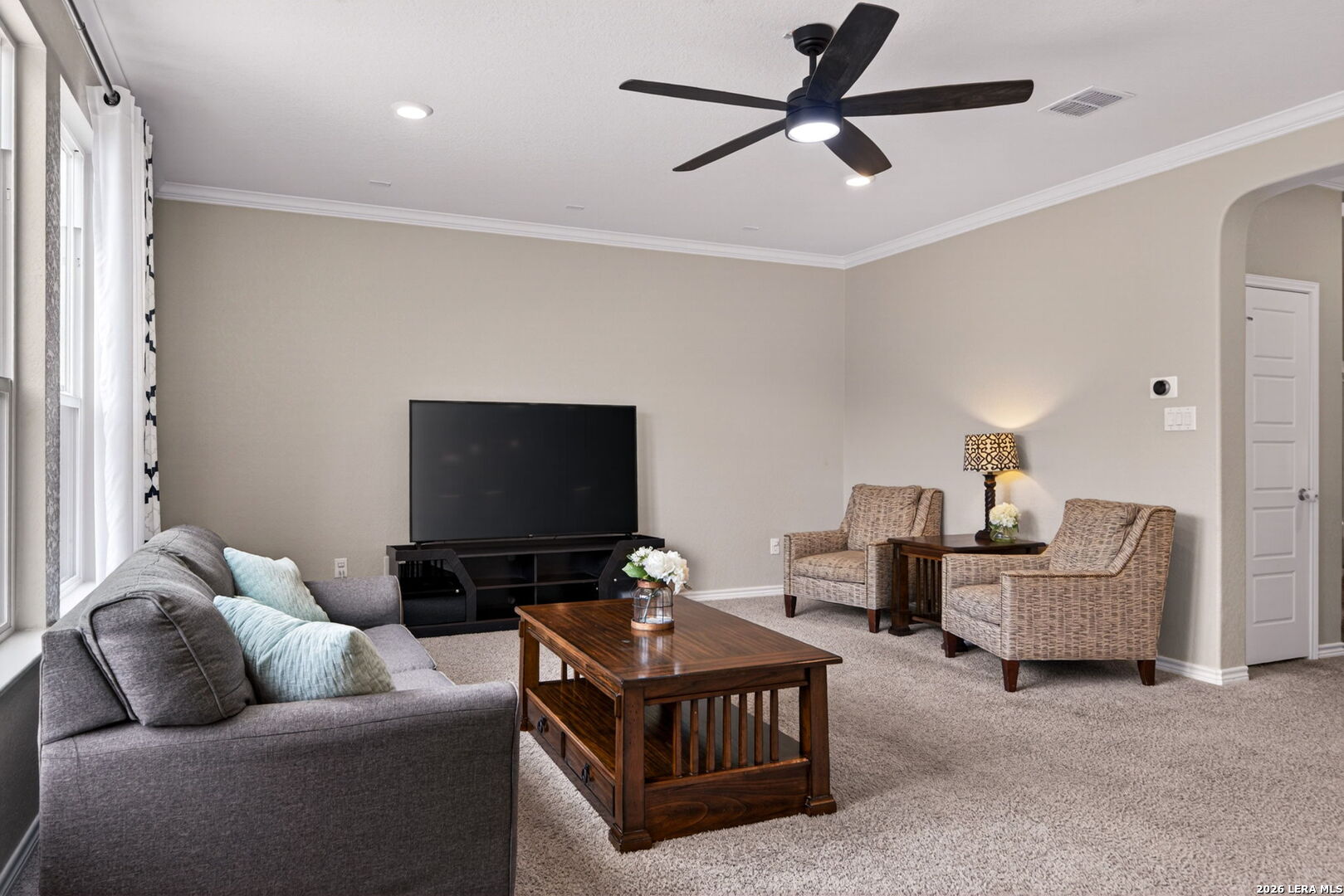 Tucked away on a cul-de-sac in the heart Cross Creek, this beautiful three-bedroom, two-and-a-half-bath home immediately catches your eye with its standout curb appeal. Decorative siding, stone and brick accents, manicured garden beds, and a welcoming covered front porch create a warm first impression before you even step inside. Inside, the home opens up into bright, thoughtfully designed living spaces. Crown molding carries through the entry, living, dining, and kitchen areas, adding an elevated touch throughout the main floor. Just off the entry, a spacious study with glass French doors offers a flexible space that could easily serve as a home office, playroom, workout room, or creative studio. The main living area is designed for everyday connection. The living room, dining space, and kitchen flow naturally together, so you can prep dinner at the island while still chatting with guests in the living room or keeping an eye on kids finishing homework nearby. The corner kitchen is a standout with granite countertops, white cabinetry with decorative molding, and an oversized island with breakfast bar seating that quickly becomes everyone's favorite place everyone gathers. All three bedrooms are located upstairs, creating a clear separation between the entertaining spaces below and the private living areas above. The primary suite offers plenty of room to unwind, complete with a large walk-in closet and a beautifully finished bathroom featuring an oversized tiled shower and dual vanities. One of those small details that makes everyday life easier is the upstairs laundry room. With all of the bedrooms on the second floor, laundry stays right where it belongs instead of hauling baskets up and down the stairs.The second floor also includes two well-appointed secondary bedrooms, another full bathroom, and a versatile loft that works beautifully as a second living space, media room, or play area. Out back, the extended patio overlooks a spacious yard with raised garden beds and plenty of room to enjoy evenings outside. A quick commute to shopping, dining, and major employers, this home places everyday conveniences right around the corner!
