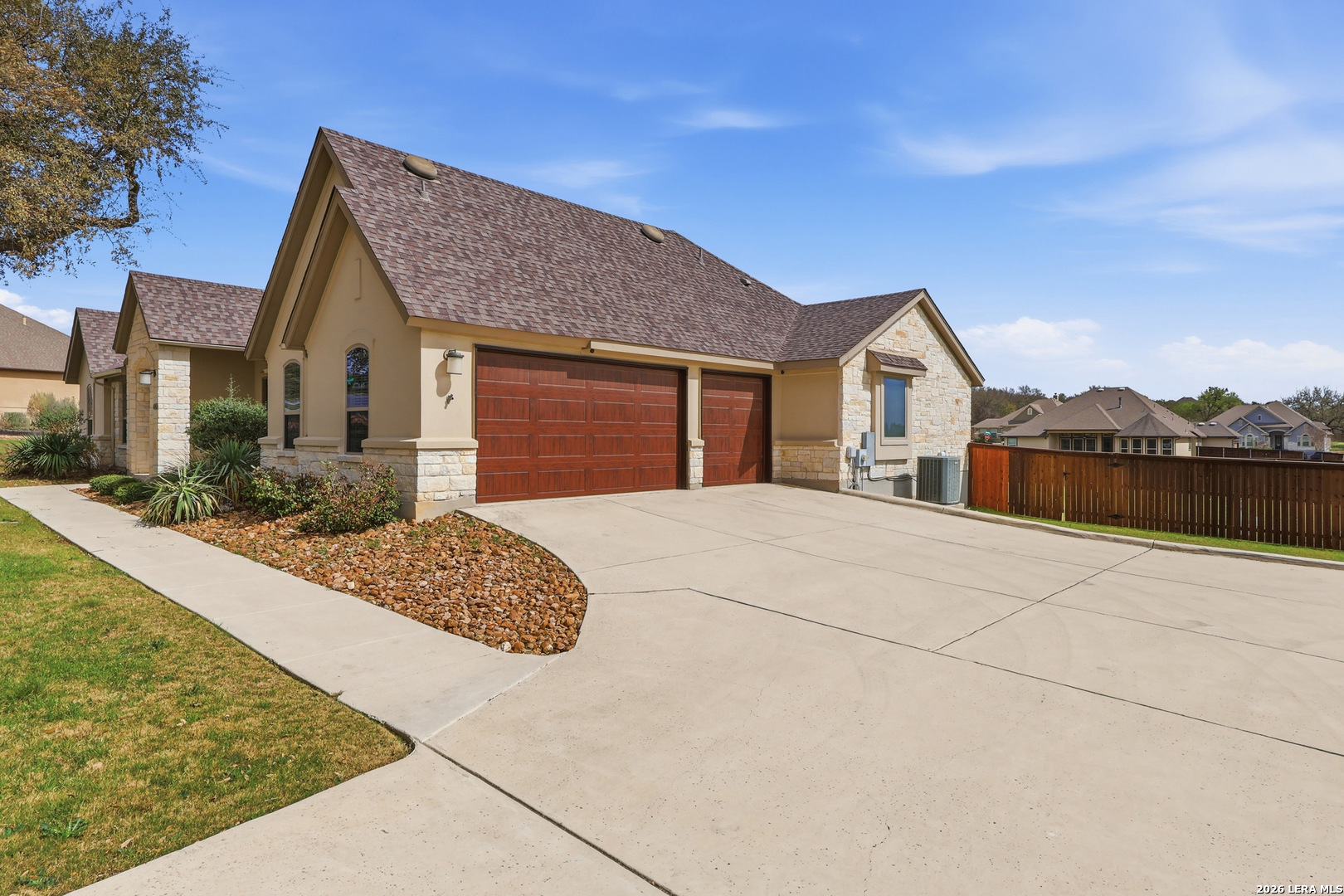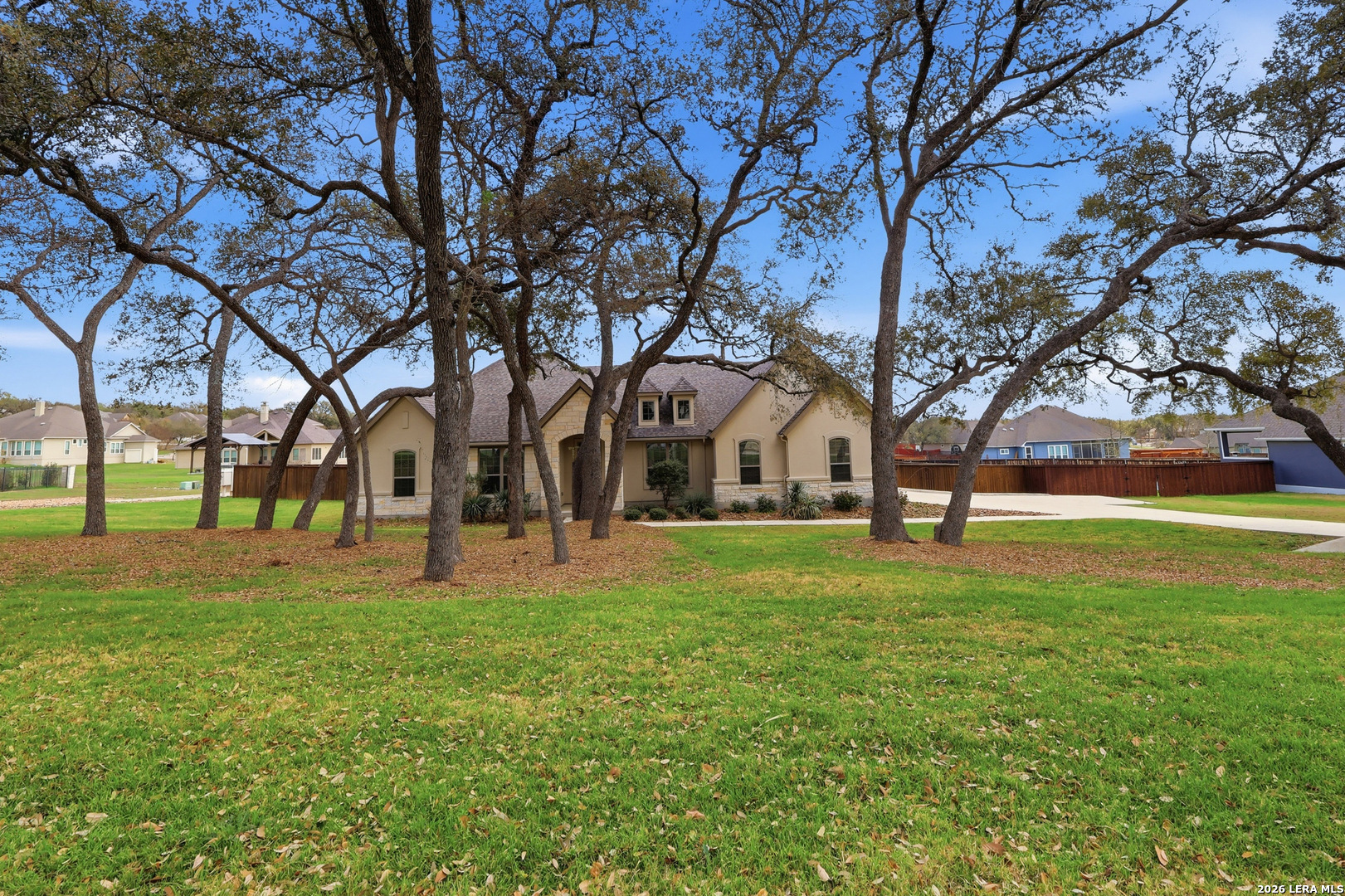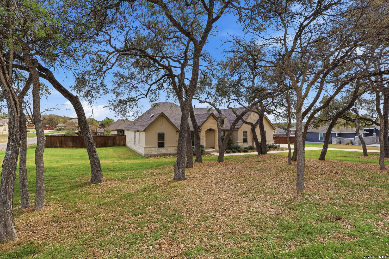 Set beneath a canopy of native oaks on a prime corner lot in The Woods of Garden Ridge, this is the kind of home that feels welcoming before you ever step inside. The approach - quiet and graceful, and the sense is that life here moves at a more comfortable pace. Natural light fills the living spaces, wood floors add warmth, and the thoughtful single-story -no interior steps- layout offers both openness and privacy. The kitchen is designed for everyday function and finished with luxury details: custom cabinetry, silestone countertops, upgraded stainless steel appliances, a gas cooktop, and dual ovens ready for holidays, dinner parties, or slow Sundays at home. The split floor plan gives everyone room to breathe, with four bedrooms, formal dining, and an oversized game room that can become whatever this season of life calls for-movie nights, a playroom, a second living area, or a tucked-away workspace. The primary suite is a retreat of its own, with tray ceilings, crown molding, and a bath designed for unwinding at the end of the day. But the real magic may be outside.The covered outdoor living creates a true extension of the home, complete with travertine floors, a rock fireplace, and tongue-and-groove ceilings. The space overlooks an expansive, level yard that is perfect as it is or ready and waiting for the pool of your dreams.It is easy to picture fall evenings by the fire, weekend gatherings with friends, and quiet mornings with coffee in hand.