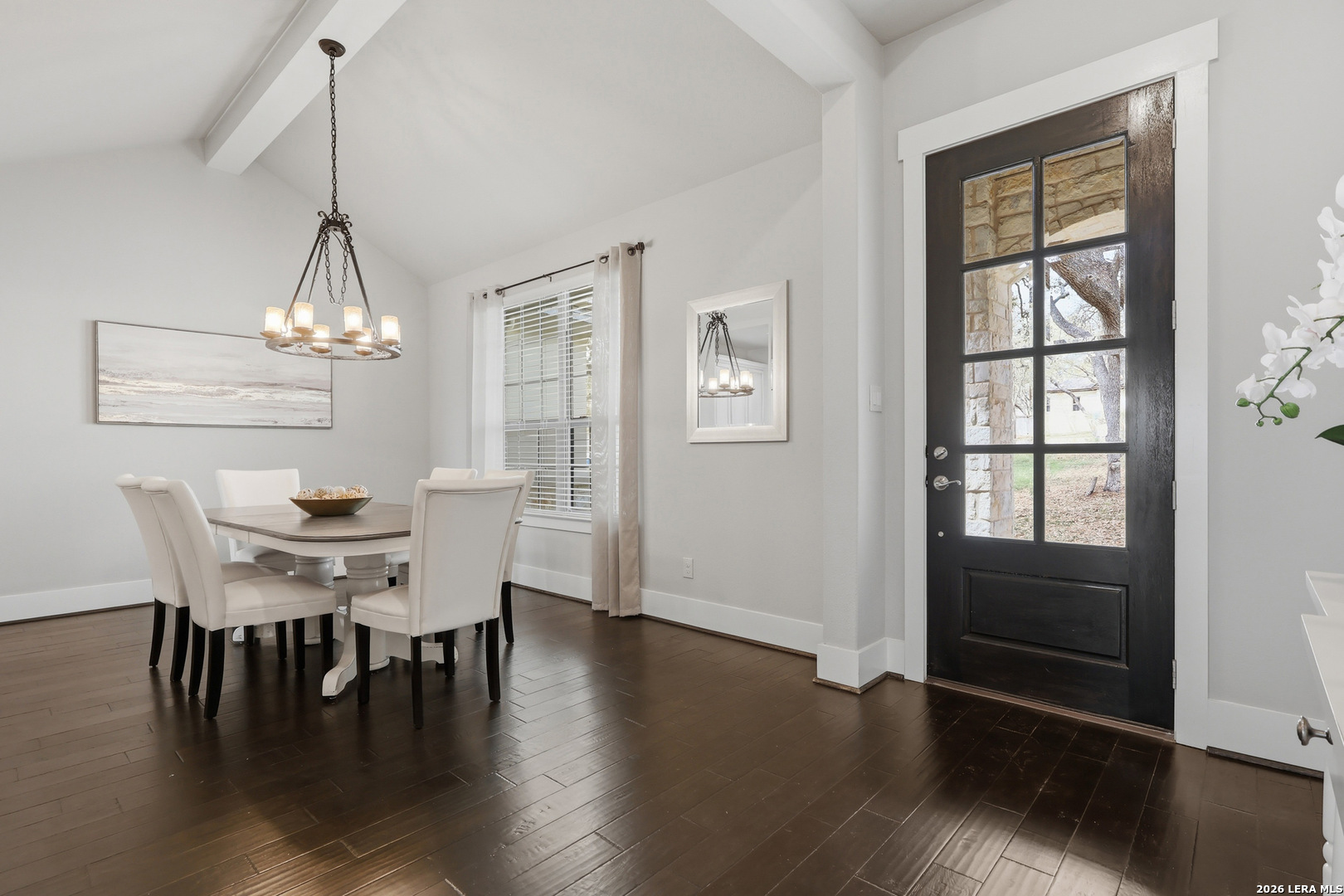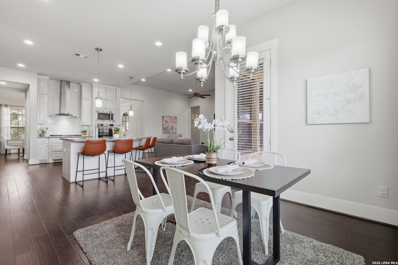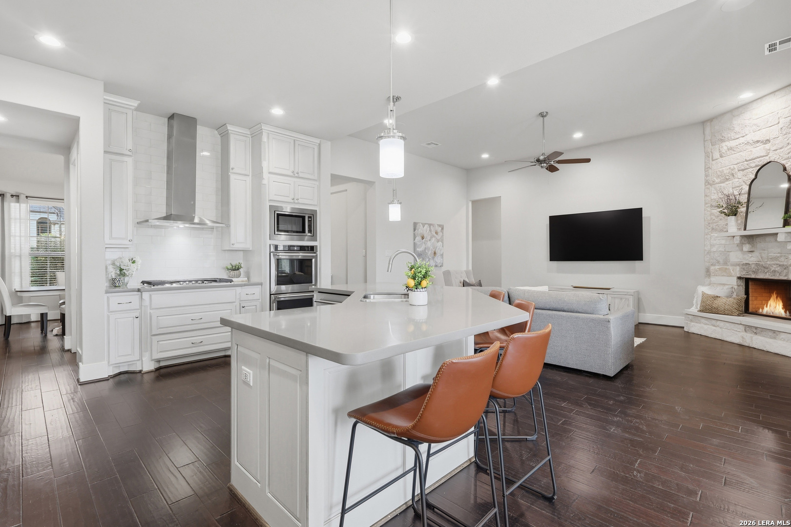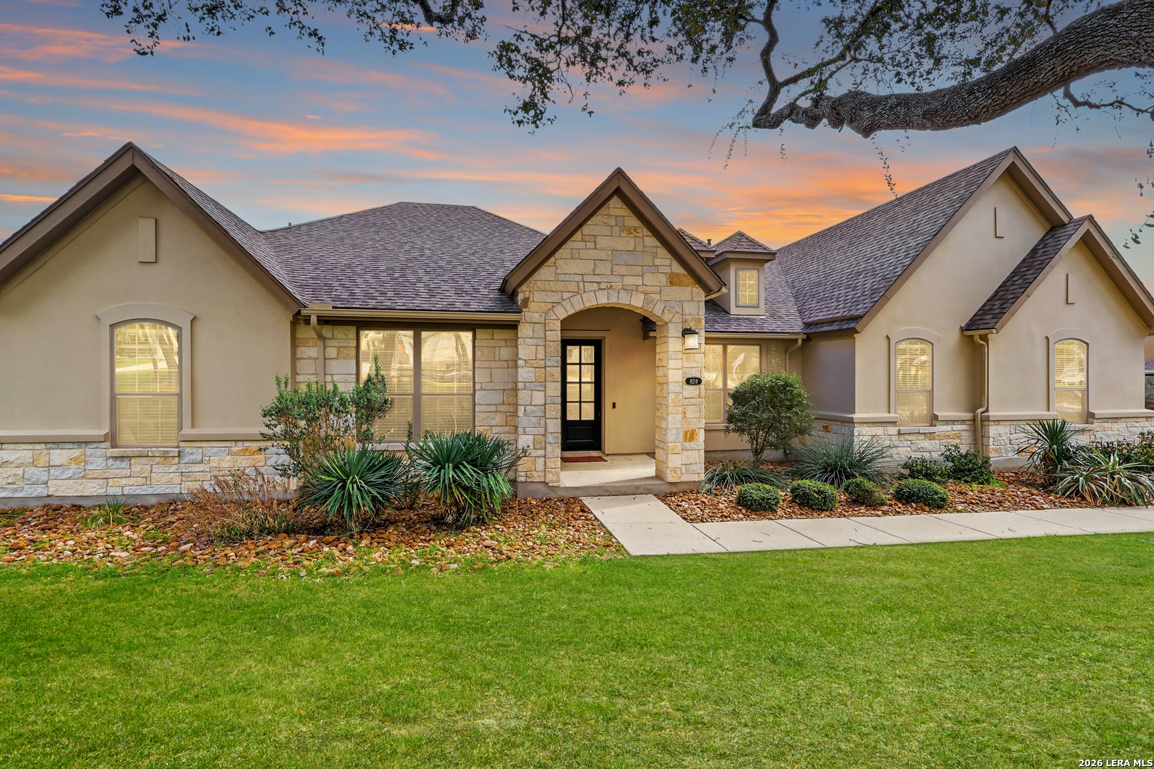 Set beneath a canopy of native oaks on a prime corner lot in The Woods of Garden Ridge, this is the kind of home that feels welcoming before you ever step inside. The approach - quiet and graceful, and the sense is that life here moves at a more comfortable pace. Natural light fills the living spaces, wood floors add warmth, and the thoughtful single-story -no interior steps- layout offers both openness and privacy. The kitchen is designed for everyday function and finished with luxury details: custom cabinetry, silestone countertops, upgraded stainless steel appliances, a gas cooktop, and dual ovens ready for holidays, dinner parties, or slow Sundays at home. The split floor plan gives everyone room to breathe, with four bedrooms, formal dining, and an oversized game room that can become whatever this season of life calls for-movie nights, a playroom, a second living area, or a tucked-away workspace. The primary suite is a retreat of its own, with tray ceilings, crown molding, and a bath designed for unwinding at the end of the day. But the real magic may be outside.The covered outdoor living creates a true extension of the home, complete with travertine floors, a rock fireplace, and tongue-and-groove ceilings. The space overlooks an expansive, level yard that is perfect as it is or ready and waiting for the pool of your dreams.It is easy to picture fall evenings by the fire, weekend gatherings with friends, and quiet mornings with coffee in hand.