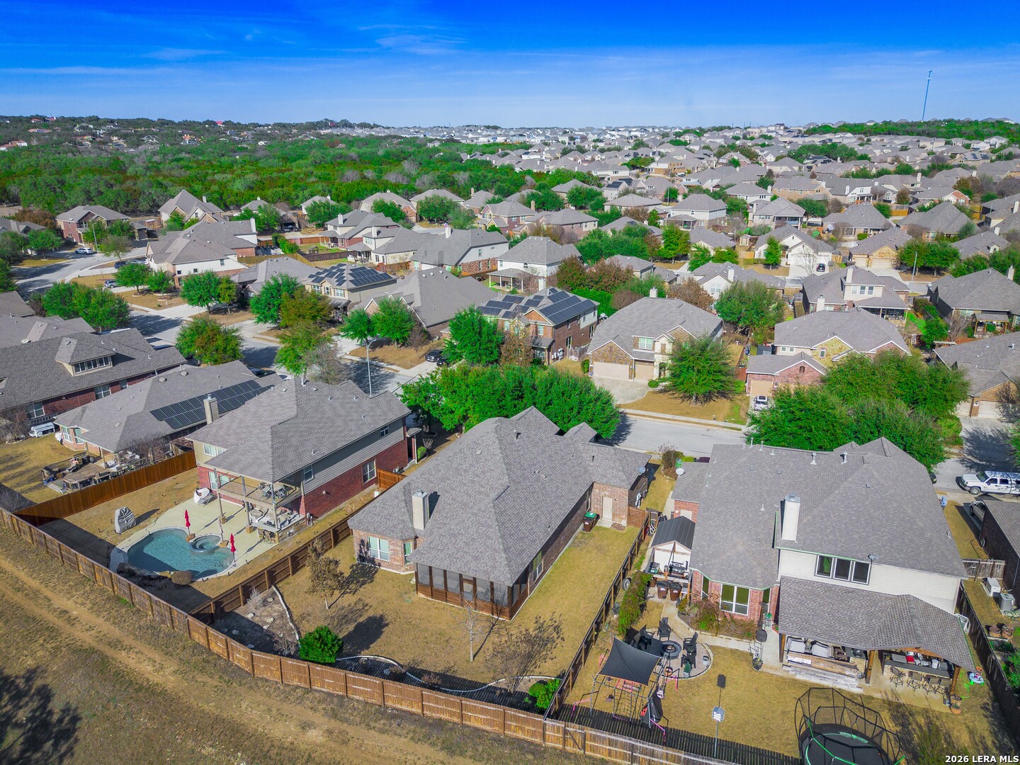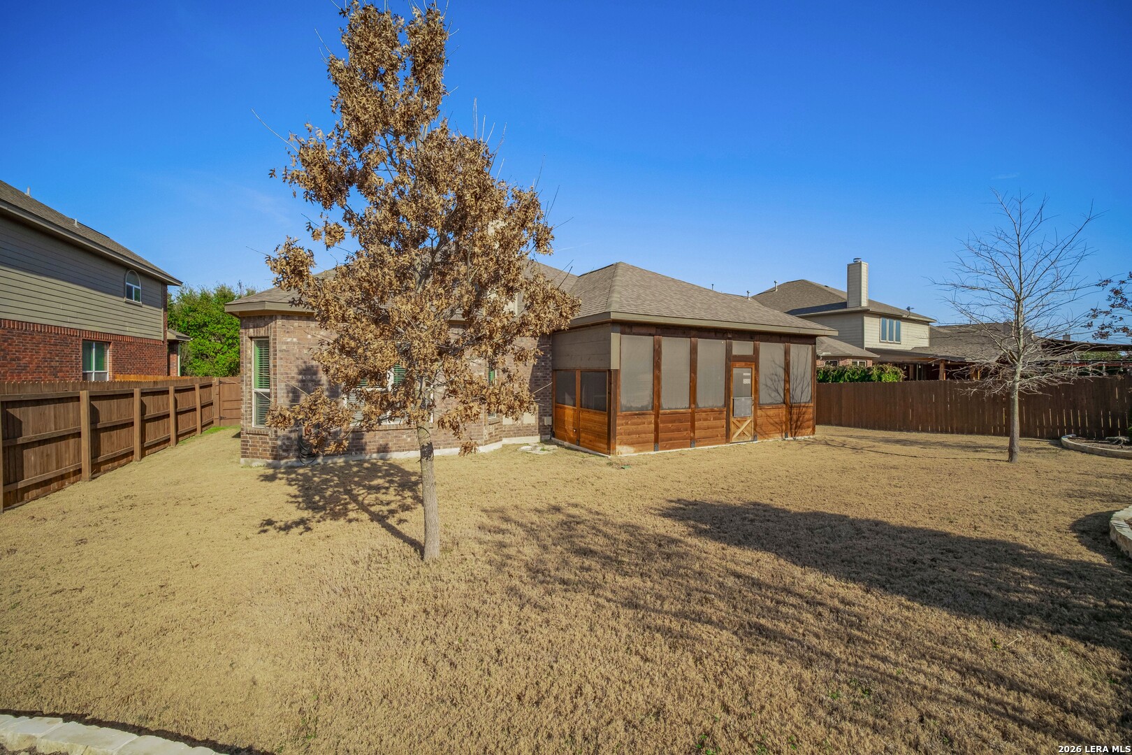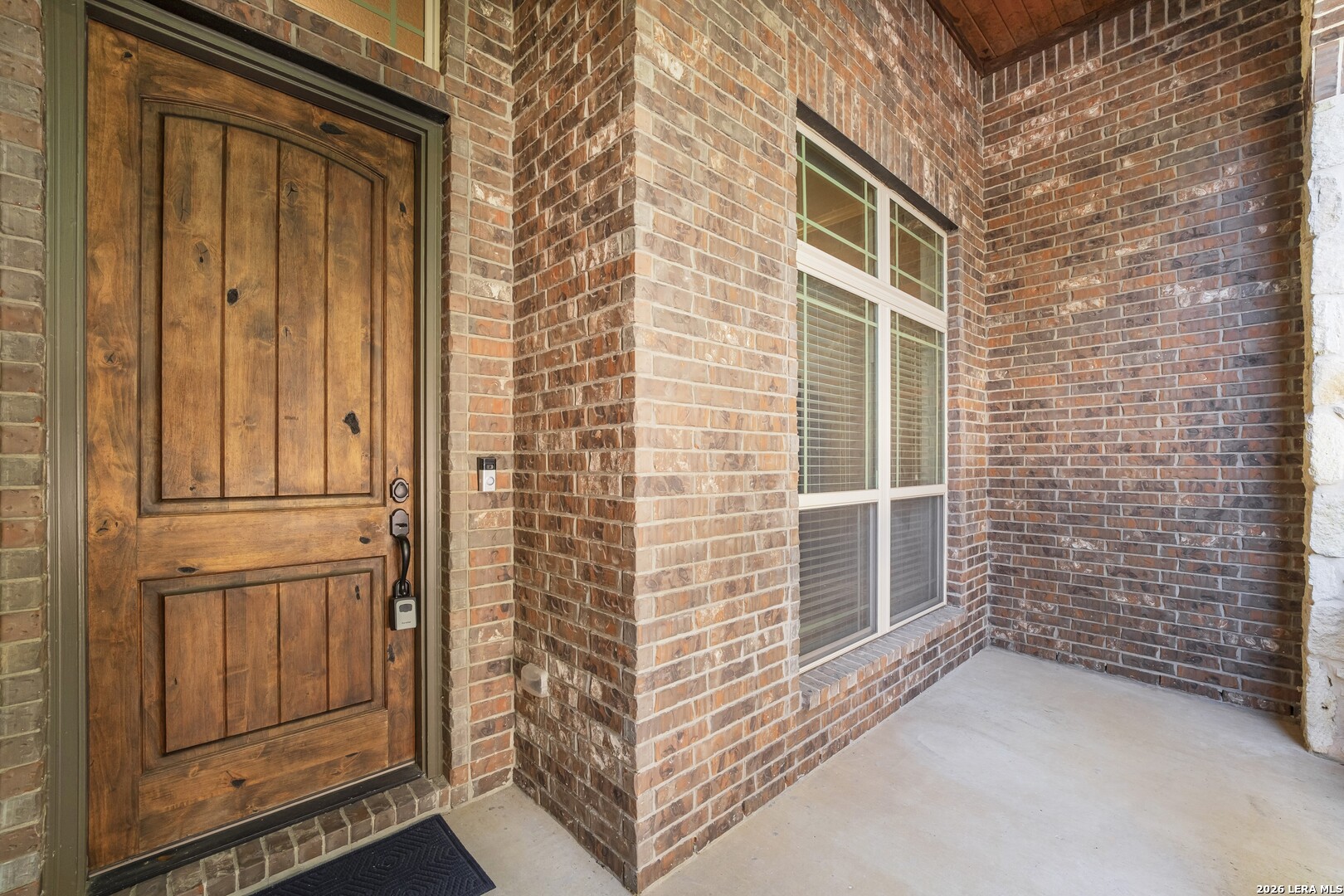 This immaculate, beautifully designed one-story home is located in the gated Sablechase community of Boerne and offers a thoughtfully planned 2,720 sq ft layout with high ceilings throughout, quality finishes, and exceptional privacy. The home features 4 bedrooms, a dedicated office, and 2 full bathrooms, along with an attached oversized double-door 3-car garage. A covered front porch welcomes you into the entry foyer, where a private office sits just off the entrance, ideal for work or study. The home opens into expansive central living spaces, including a formal dining room and a spacious living room highlighted by solid handscraped bamboo flooring, exposed wood-beamed ceilings, architectural archways, and a striking limestone fireplace that creates a timeless Hill Country aesthetic. The island kitchen flows seamlessly into the living and breakfast areas and is well equipped with granite countertops, gas cooking, and ample cabinetry, along with a pantry/laundry. The breakfast nook provides direct access to the enclosed screened patio, complete with a ceiling fan and solar shades, making it ideal for relaxing or entertaining year-round. The primary suite is privately located at the rear of the home and features a high ceiling, a spacious walk-in closet, and an ensuite bath with separate vanities, a garden tub, and a walk-in shower. Three secondary bedrooms are positioned separately, offering excellent functionality for family or guests. Additional features include tilt-and-slide double-hung windows, white wooden blinds, ample storage throughout, a Lennox air conditioning system with Nest thermostat, and a water softener. The spacious, wooden-fenced backyard offers privacy with no direct rear neighbors and greenbelt backing, a rare find in the area. Sablechase HOA provides premier amenities, including a pool, sports courts, playground, BBQ areas, and a clubhouse.