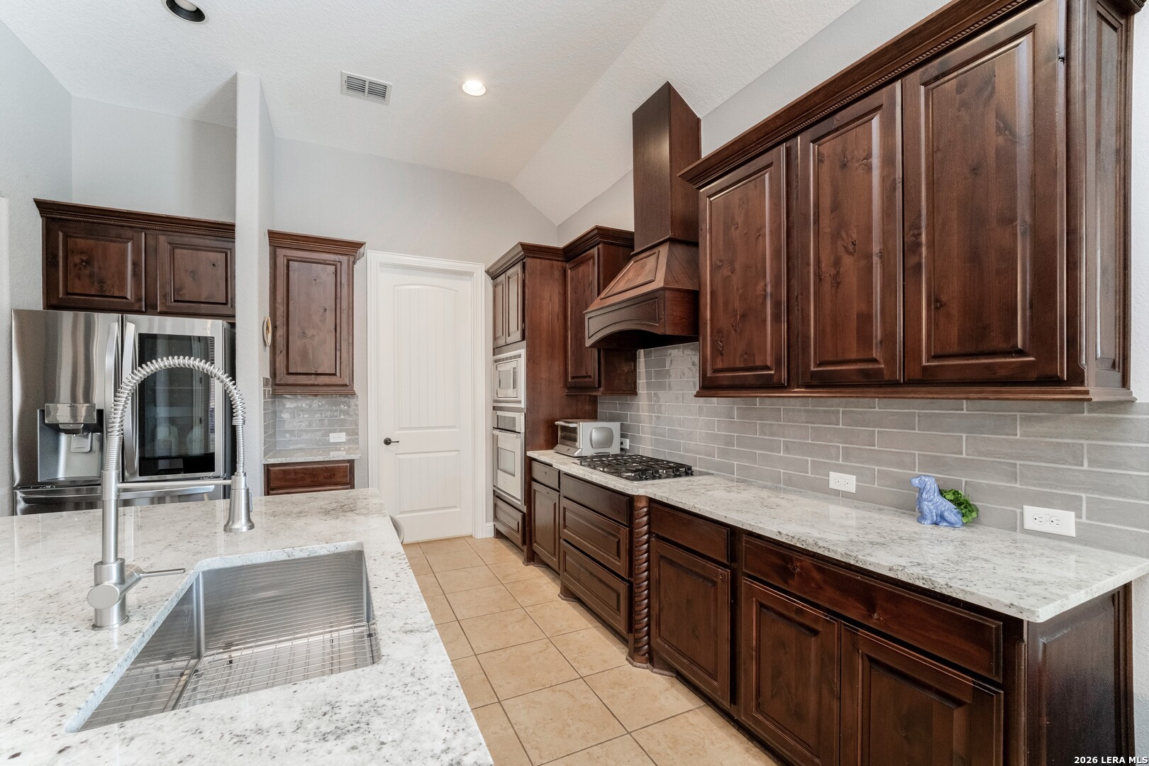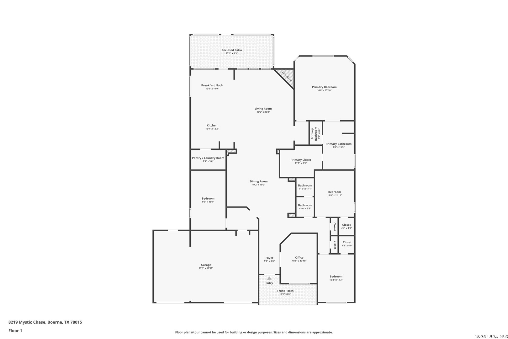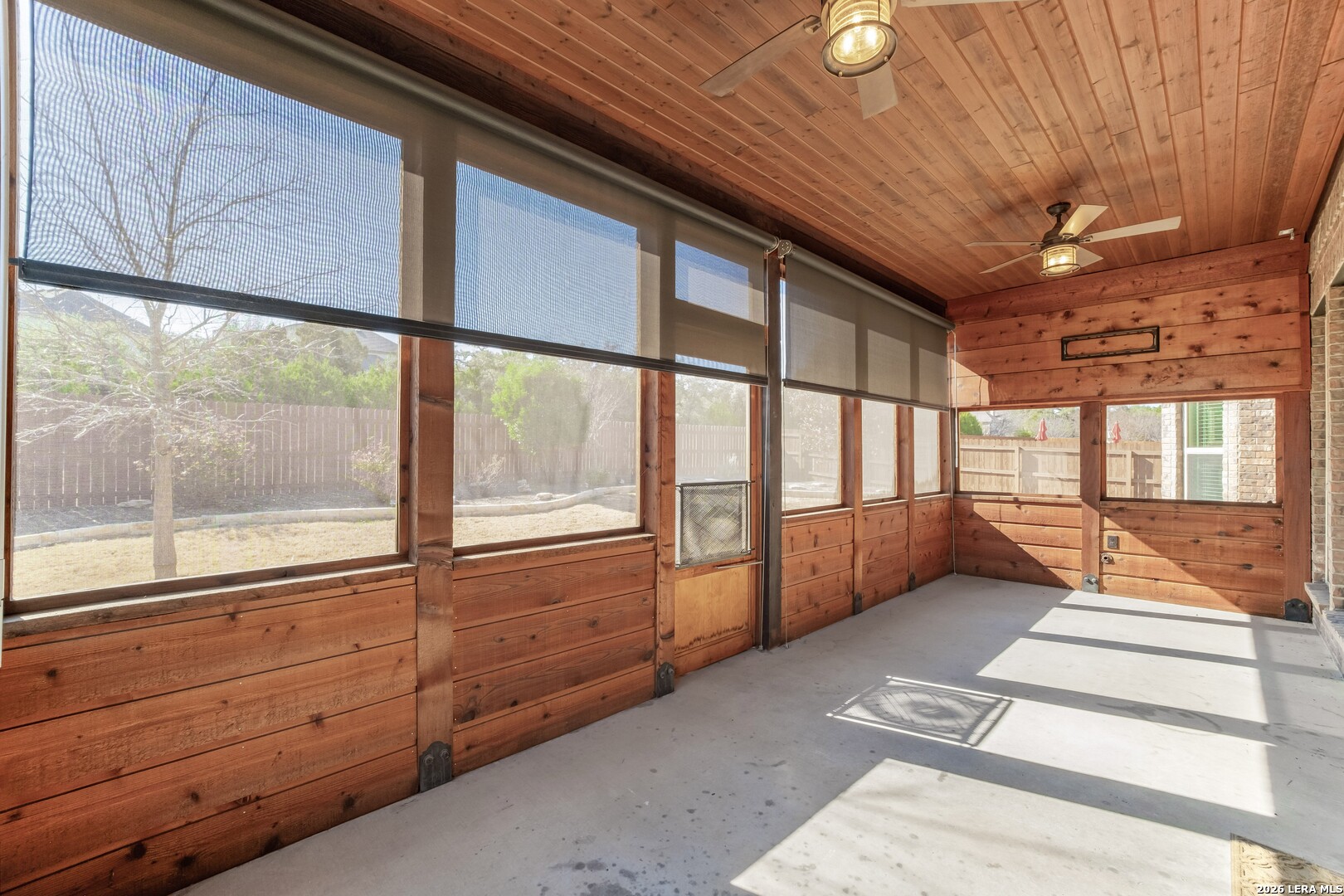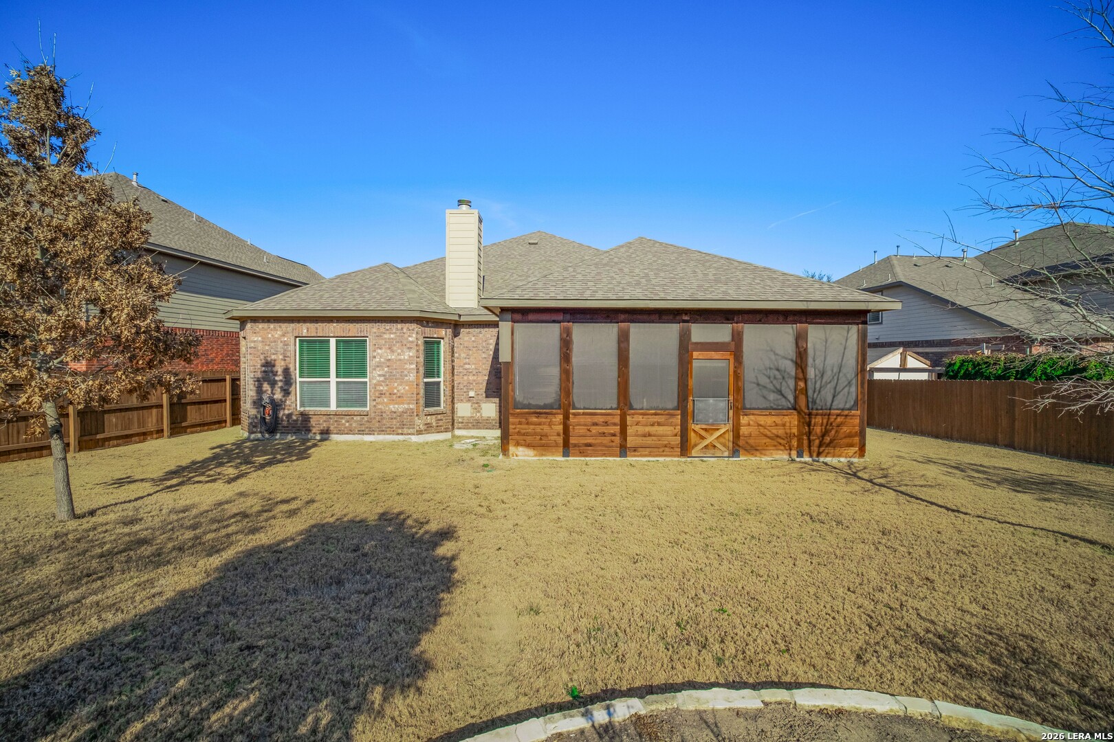 This immaculate, beautifully designed one-story home is located in the gated Sablechase community of Boerne and offers a thoughtfully planned 2,720 sq ft layout with high ceilings throughout, quality finishes, and exceptional privacy. The home features 4 bedrooms, a dedicated office, and 2 full bathrooms, along with an attached oversized double-door 3-car garage. A covered front porch welcomes you into the entry foyer, where a private office sits just off the entrance, ideal for work or study. The home opens into expansive central living spaces, including a formal dining room and a spacious living room highlighted by solid handscraped bamboo flooring, exposed wood-beamed ceilings, architectural archways, and a striking limestone fireplace that creates a timeless Hill Country aesthetic. The island kitchen flows seamlessly into the living and breakfast areas and is well equipped with granite countertops, gas cooking, and ample cabinetry, along with a pantry/laundry. The breakfast nook provides direct access to the enclosed screened patio, complete with a ceiling fan and solar shades, making it ideal for relaxing or entertaining year-round. The primary suite is privately located at the rear of the home and features a high ceiling, a spacious walk-in closet, and an ensuite bath with separate vanities, a garden tub, and a walk-in shower. Three secondary bedrooms are positioned separately, offering excellent functionality for family or guests. Additional features include tilt-and-slide double-hung windows, white wooden blinds, ample storage throughout, a Lennox air conditioning system with Nest thermostat, and a water softener. The spacious, wooden-fenced backyard offers privacy with no direct rear neighbors and greenbelt backing, a rare find in the area. Sablechase HOA provides premier amenities, including a pool, sports courts, playground, BBQ areas, and a clubhouse.